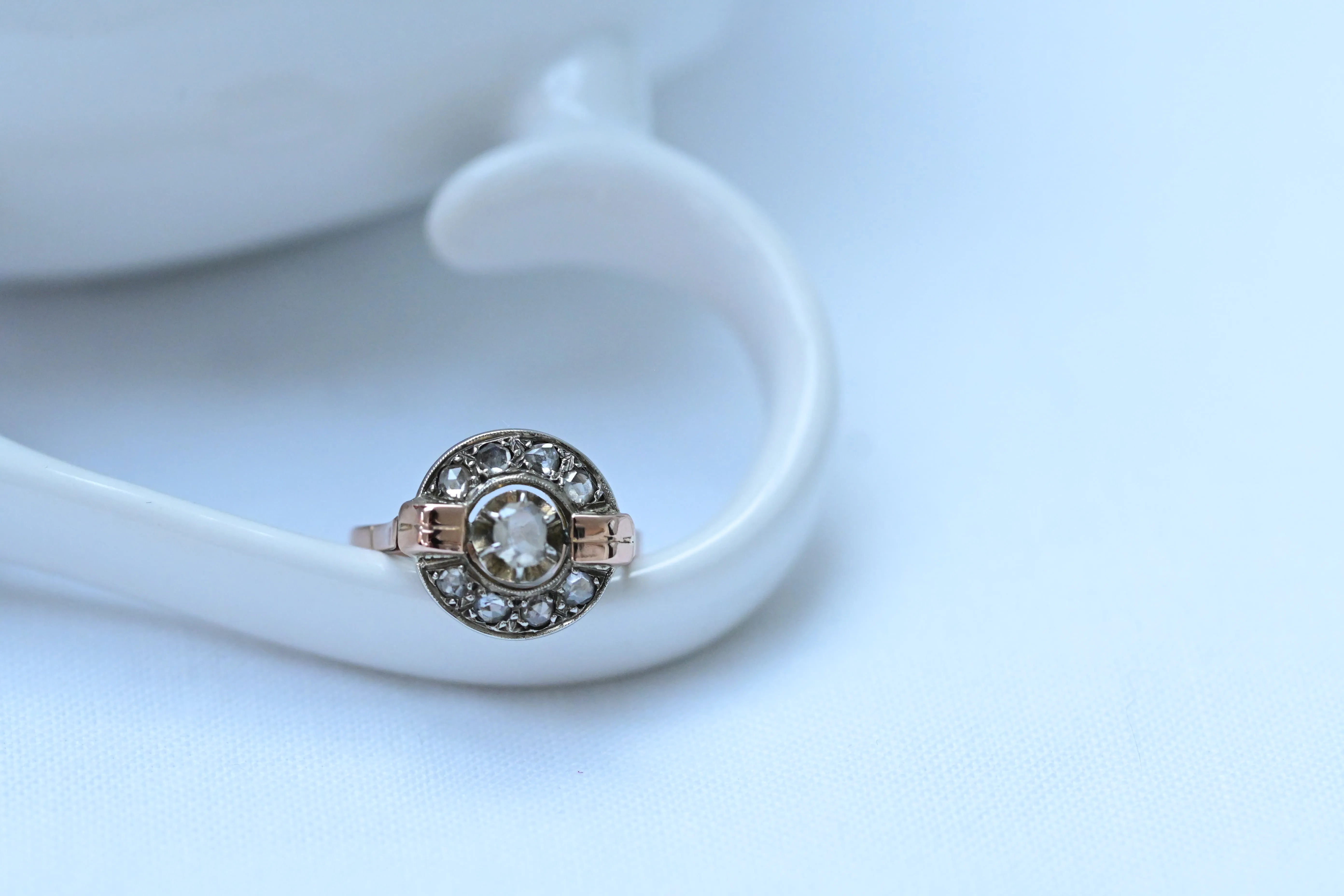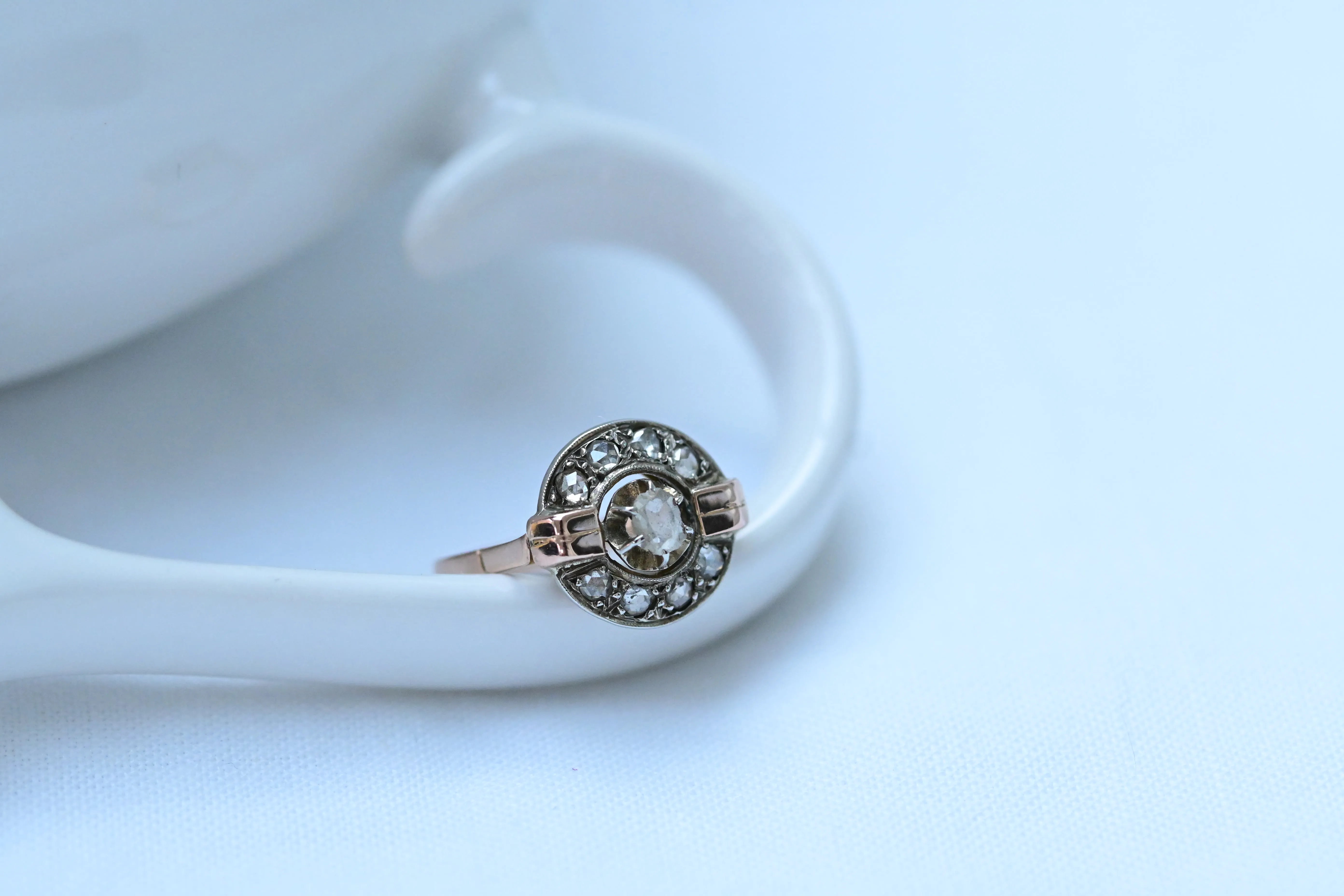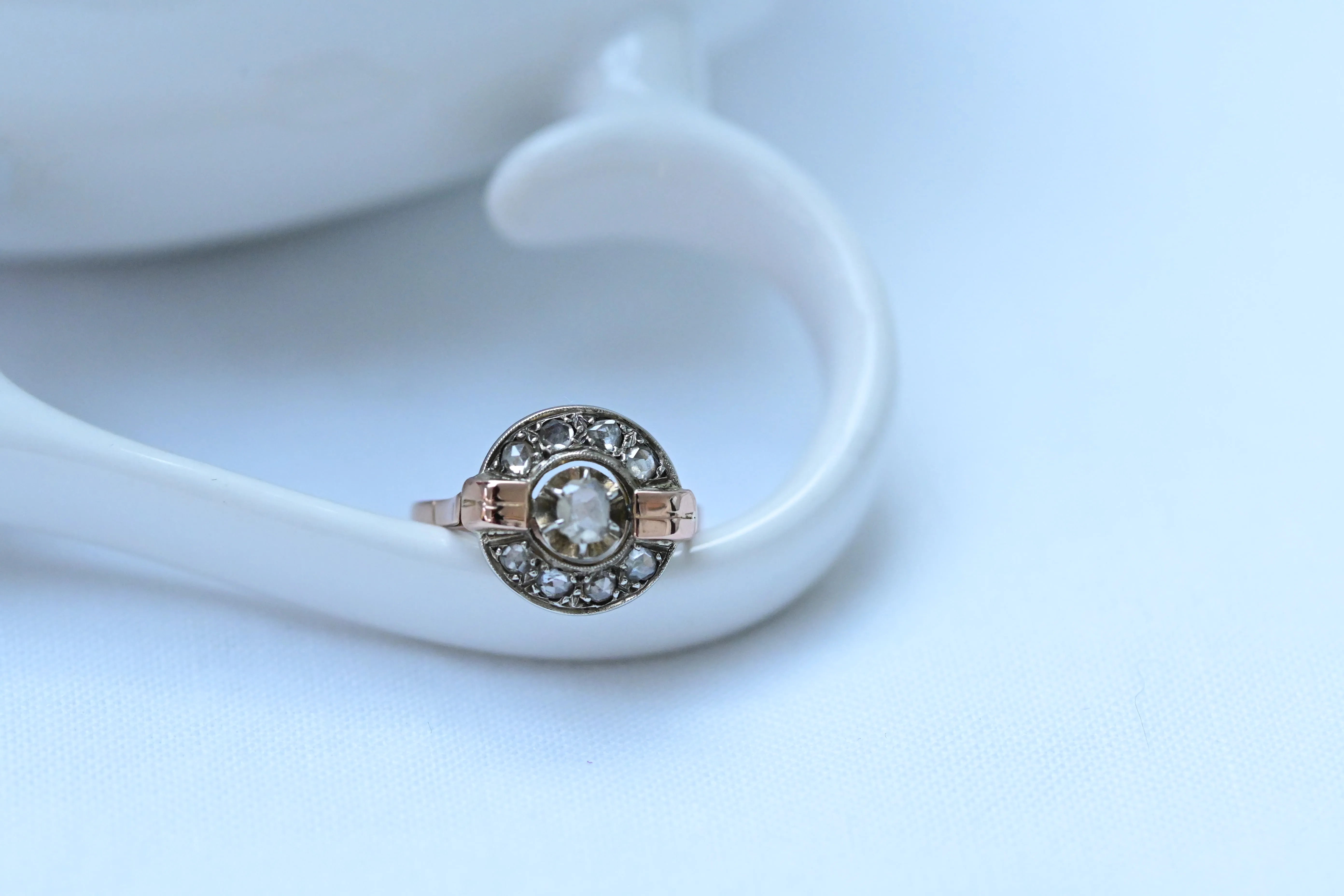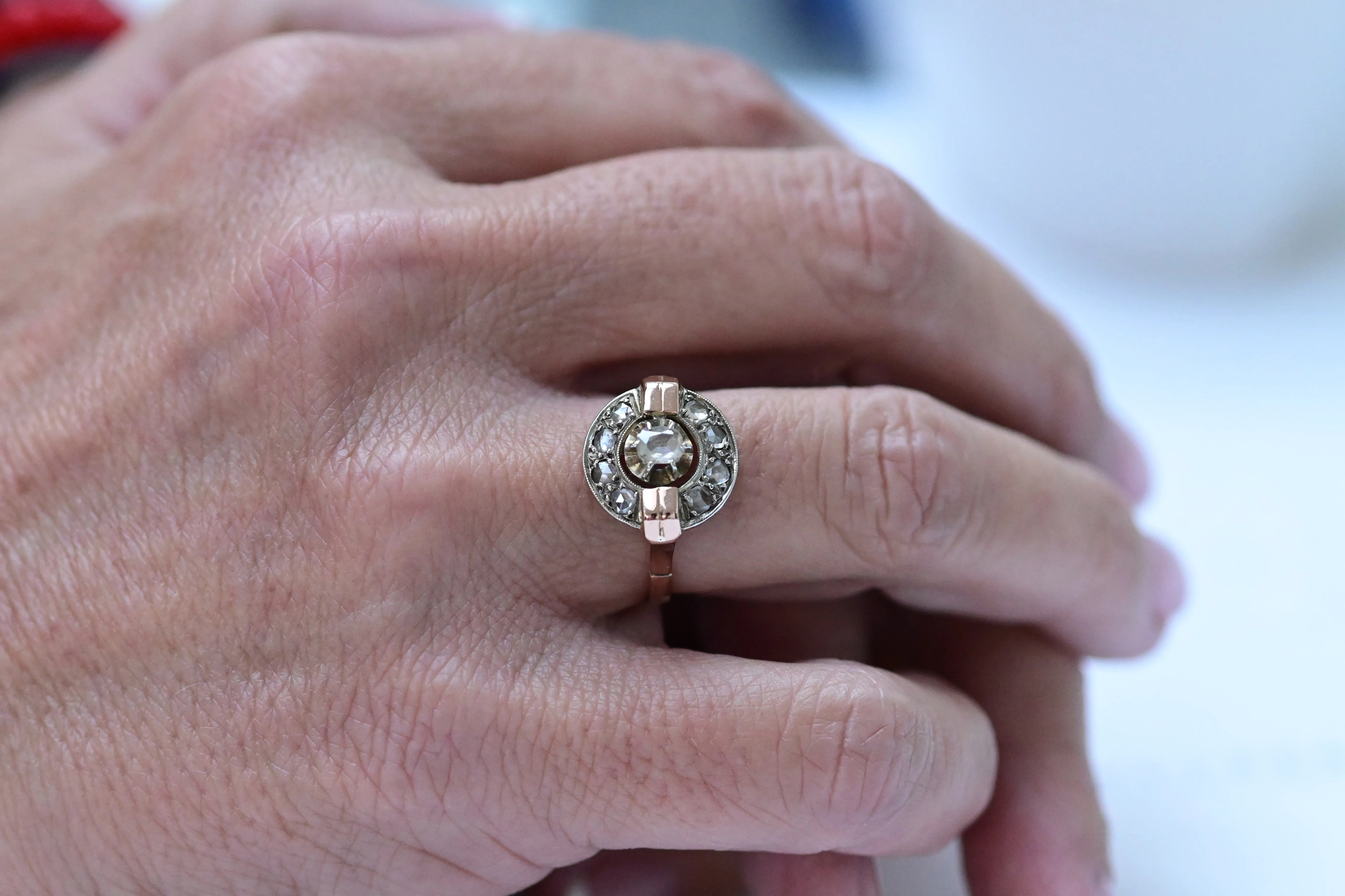Art-Deco-Ring aus 18-karätigem Roségold und Platin mit einem zentralen Diamanten, umgeben von einem Kranz kleinerer Diamanten.