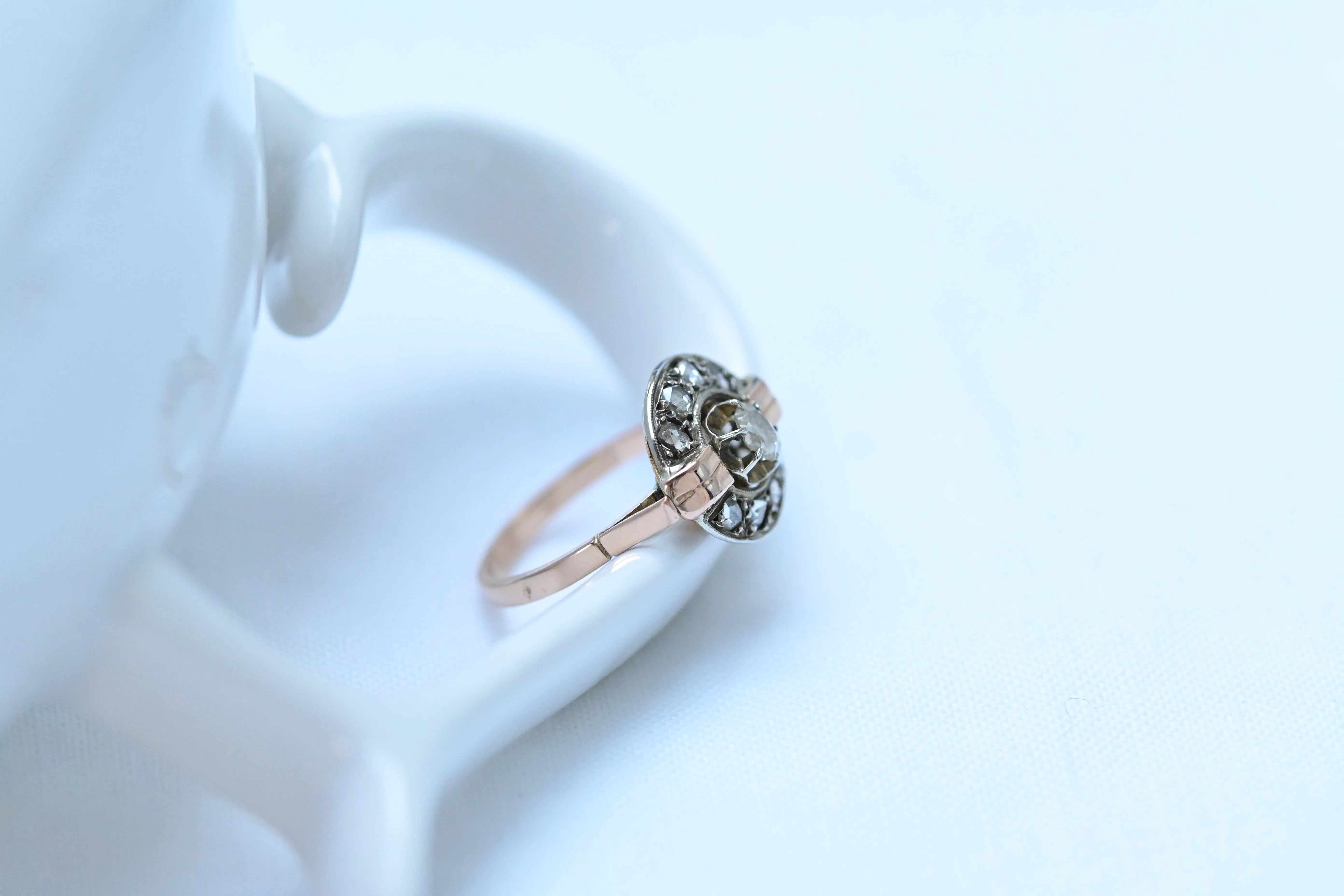 Edelsteine: 1 zentraler Diamant im Ovalschliff und 8 Diamanten im Rosenschliff.