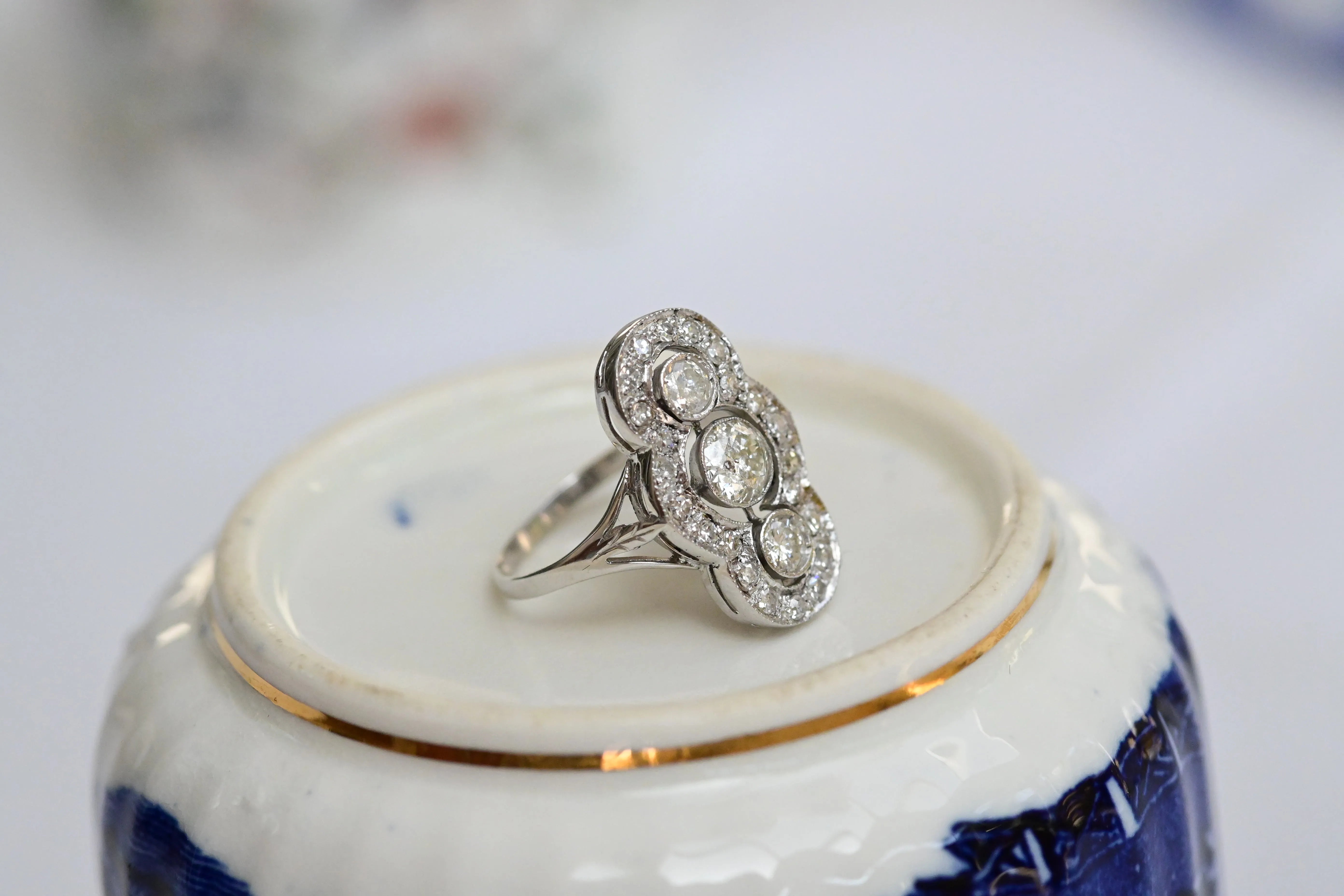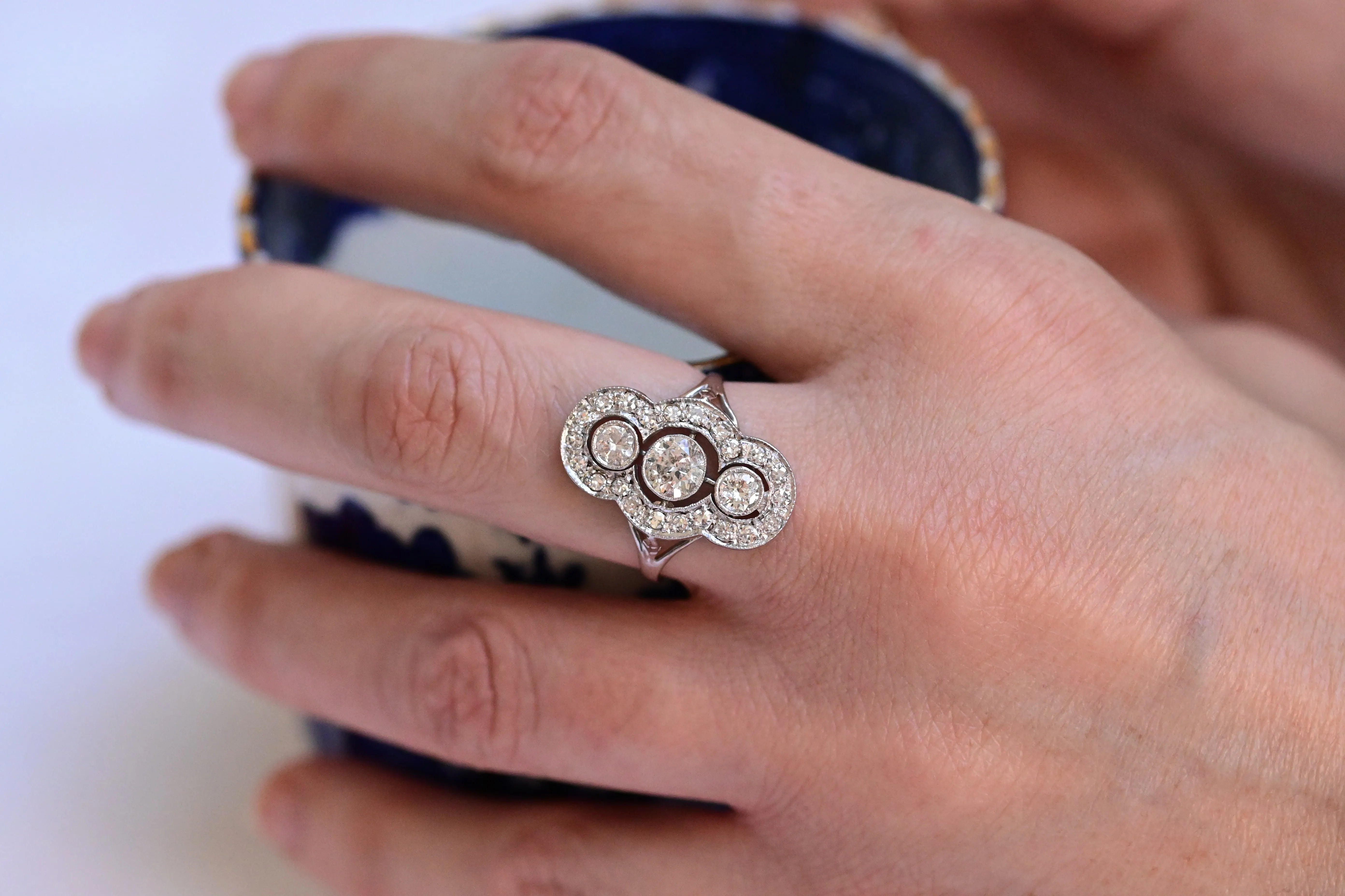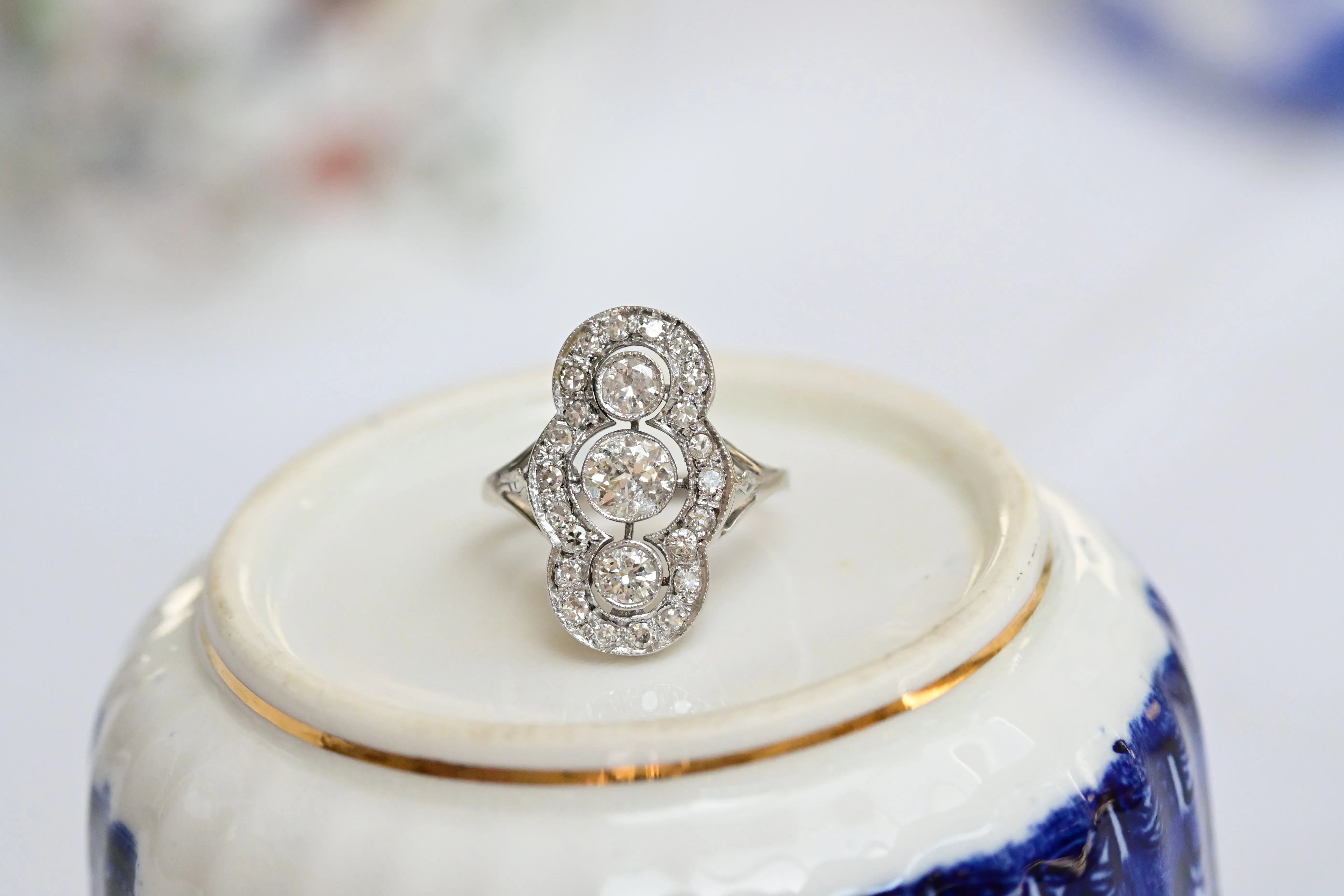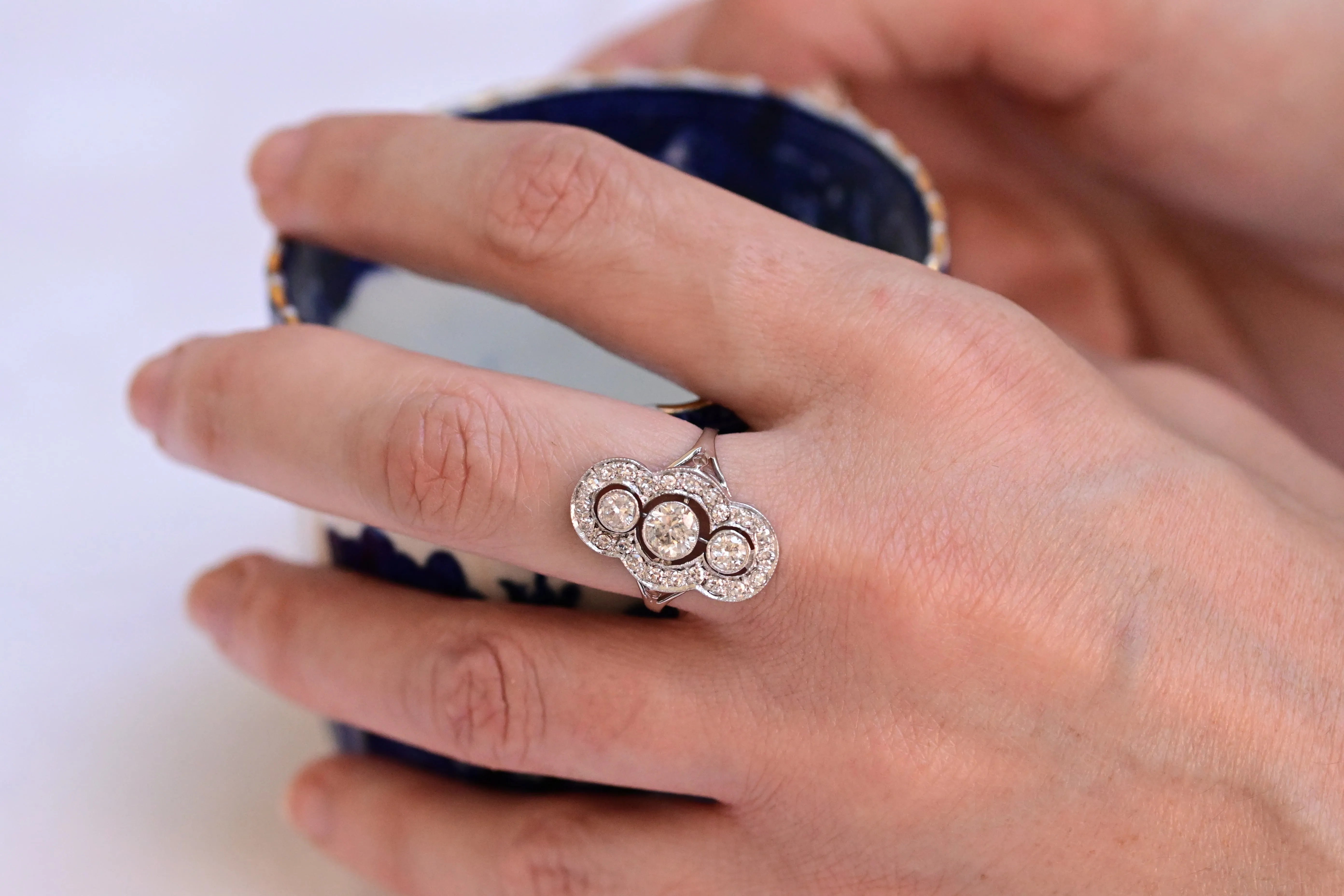 Art-Deco-Ring aus dem frühen 20. Jahrhundert, aus 18 K Weißgold, mit 3 zentralen Diamanten im Alt-Brillantschliff und 22 Diamanten im Alt-Brillantschliff.