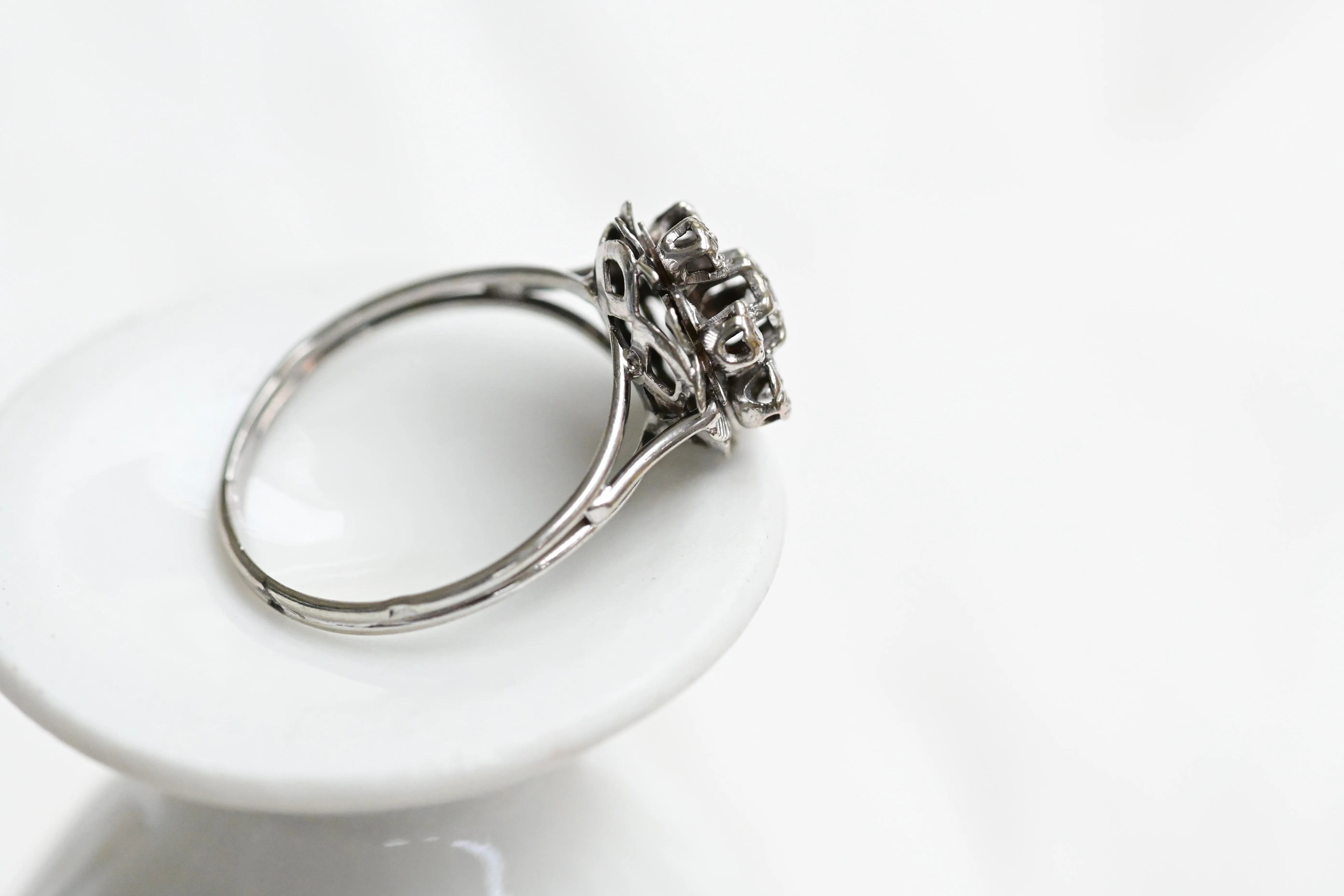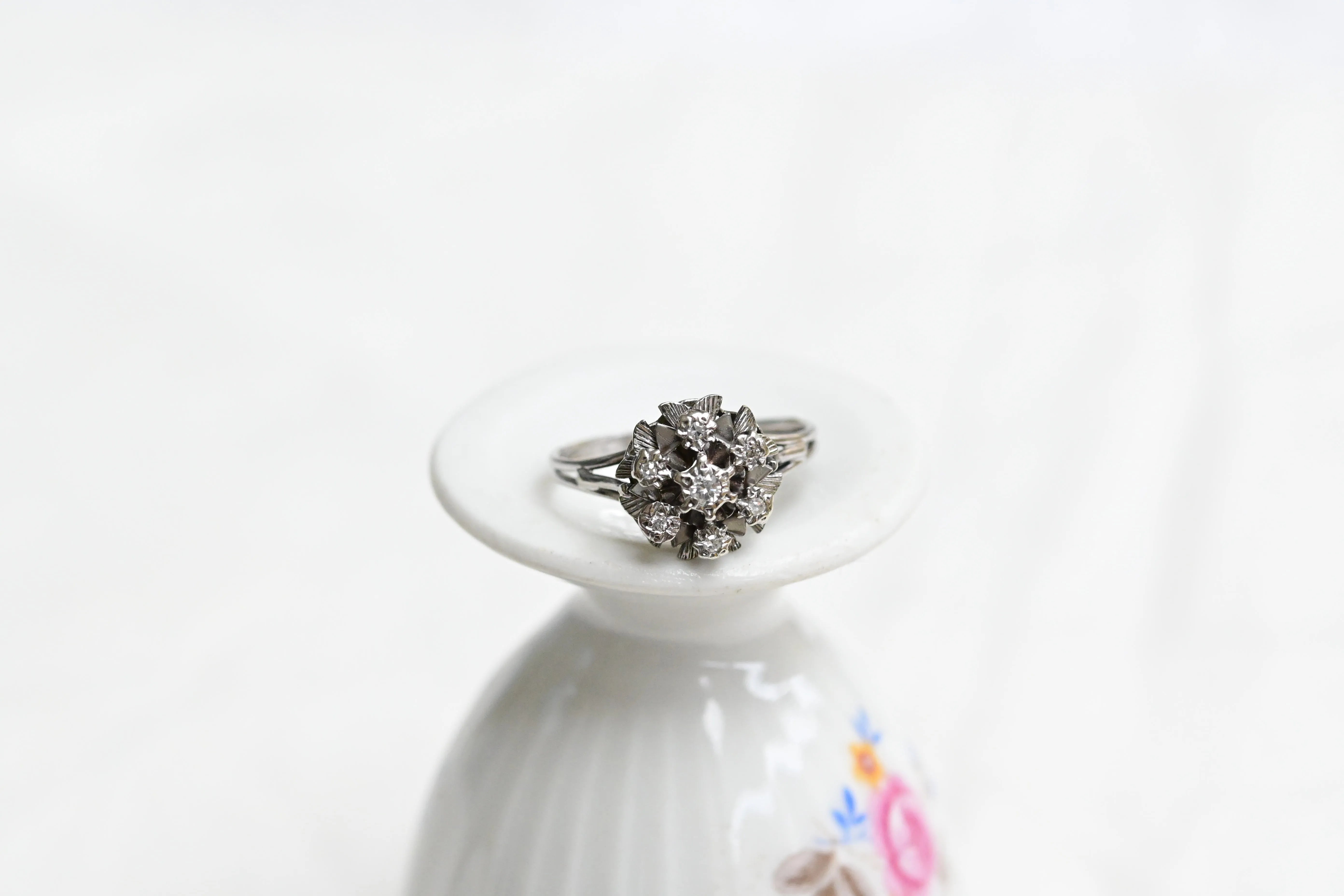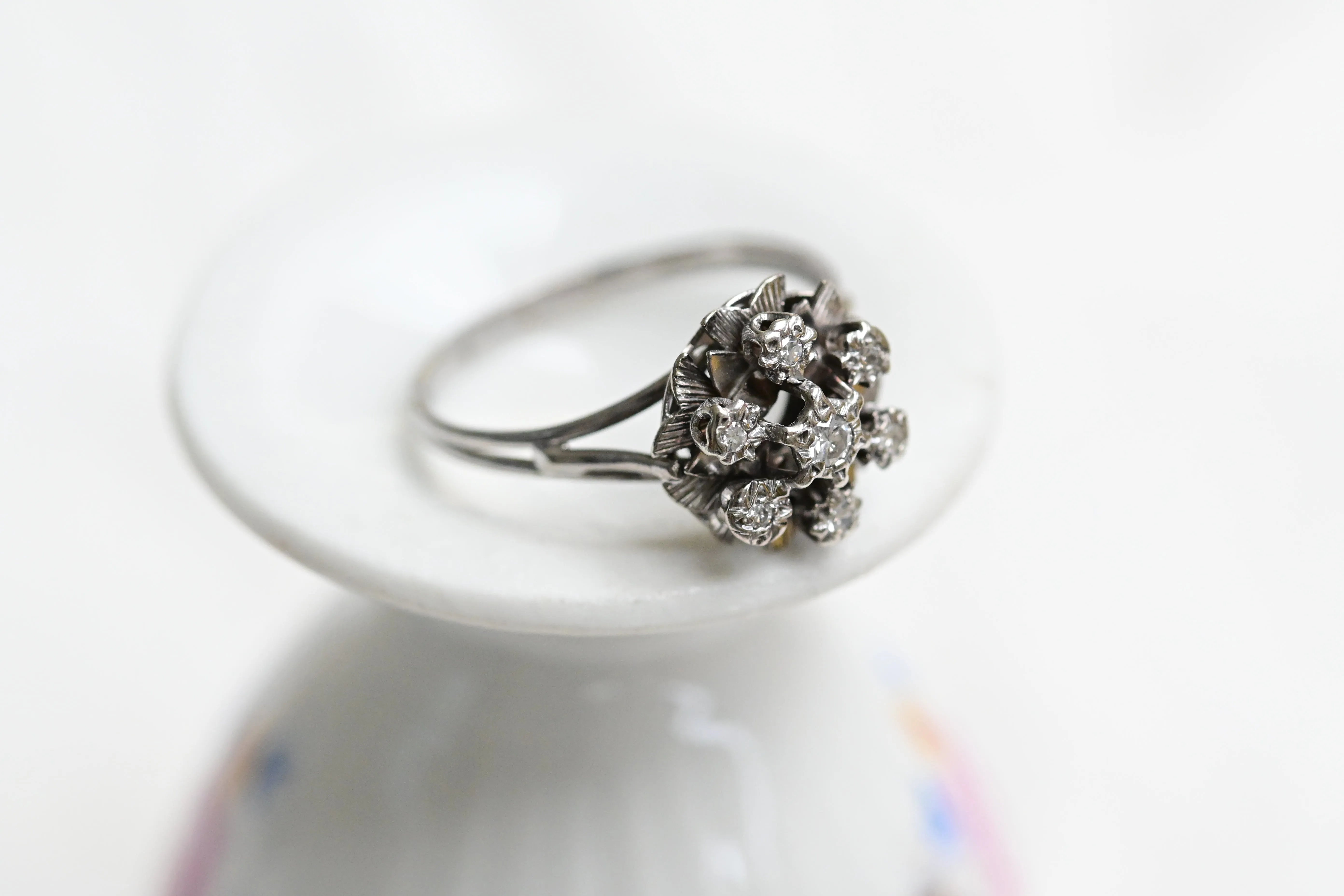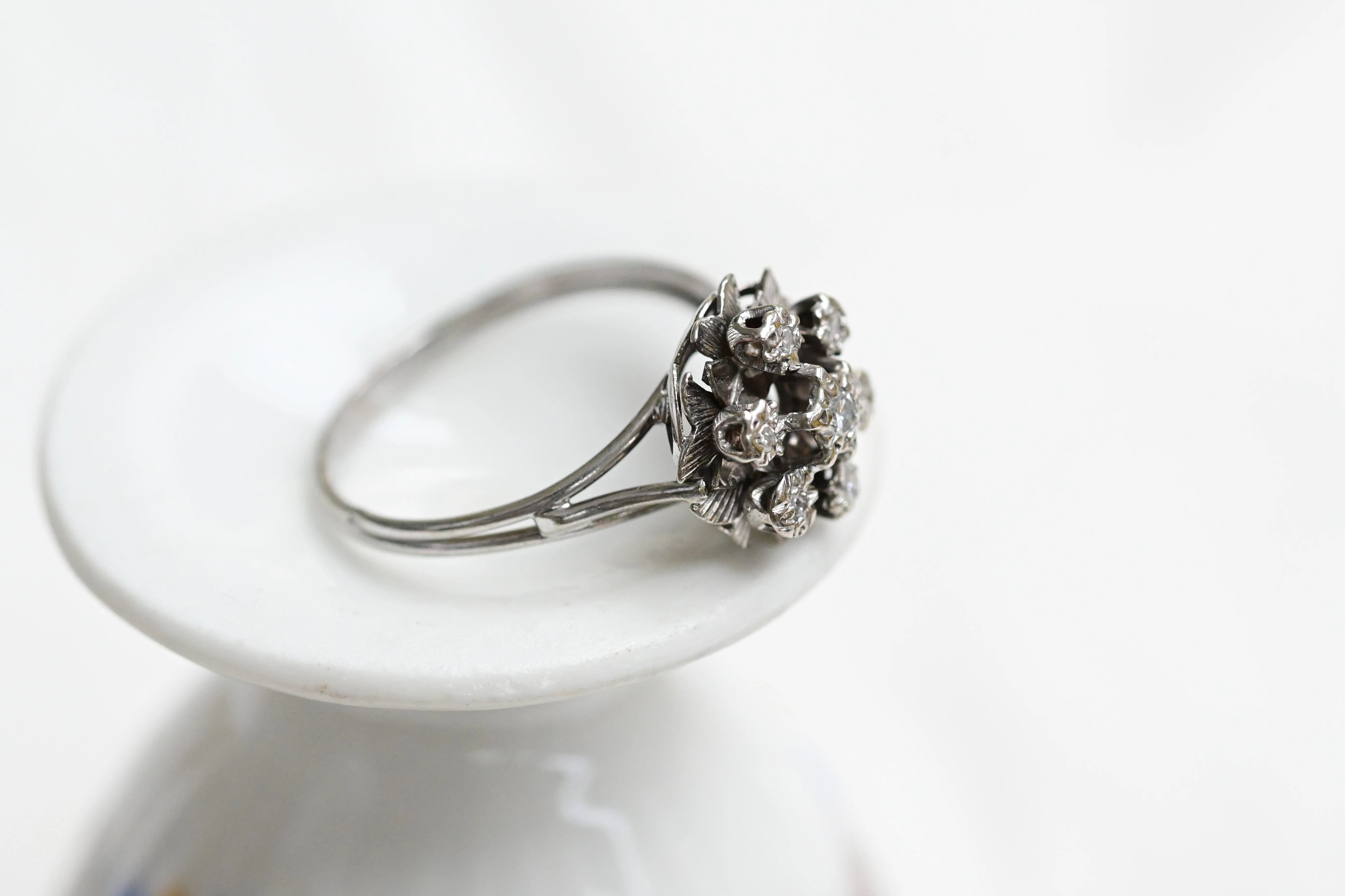 Jugendstilring aus der ersten Hälfte des 20. Jahrhunderts aus 18 K Weißgold mit sieben Diamanten. Mit den typischen organischen Formen des Stils.