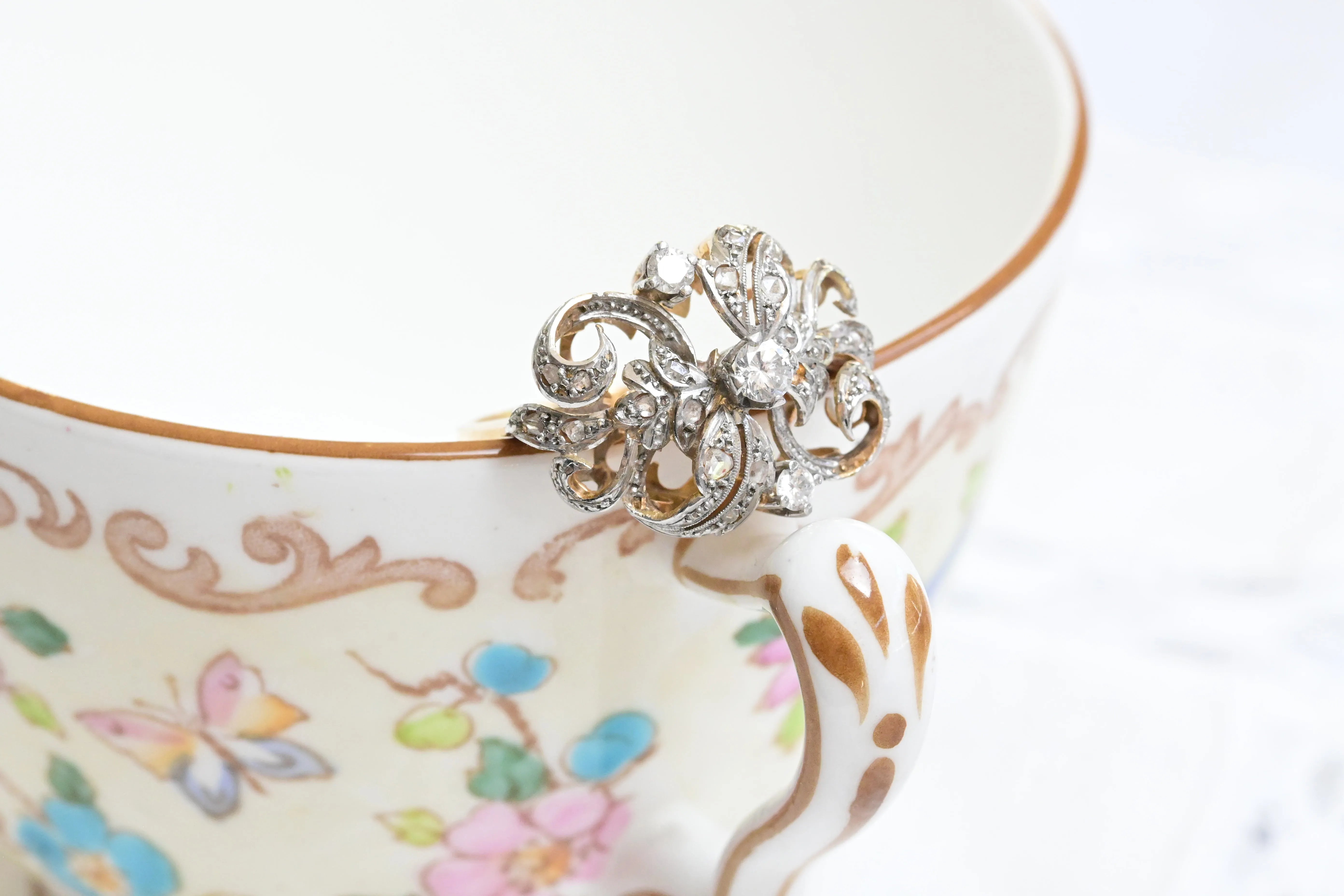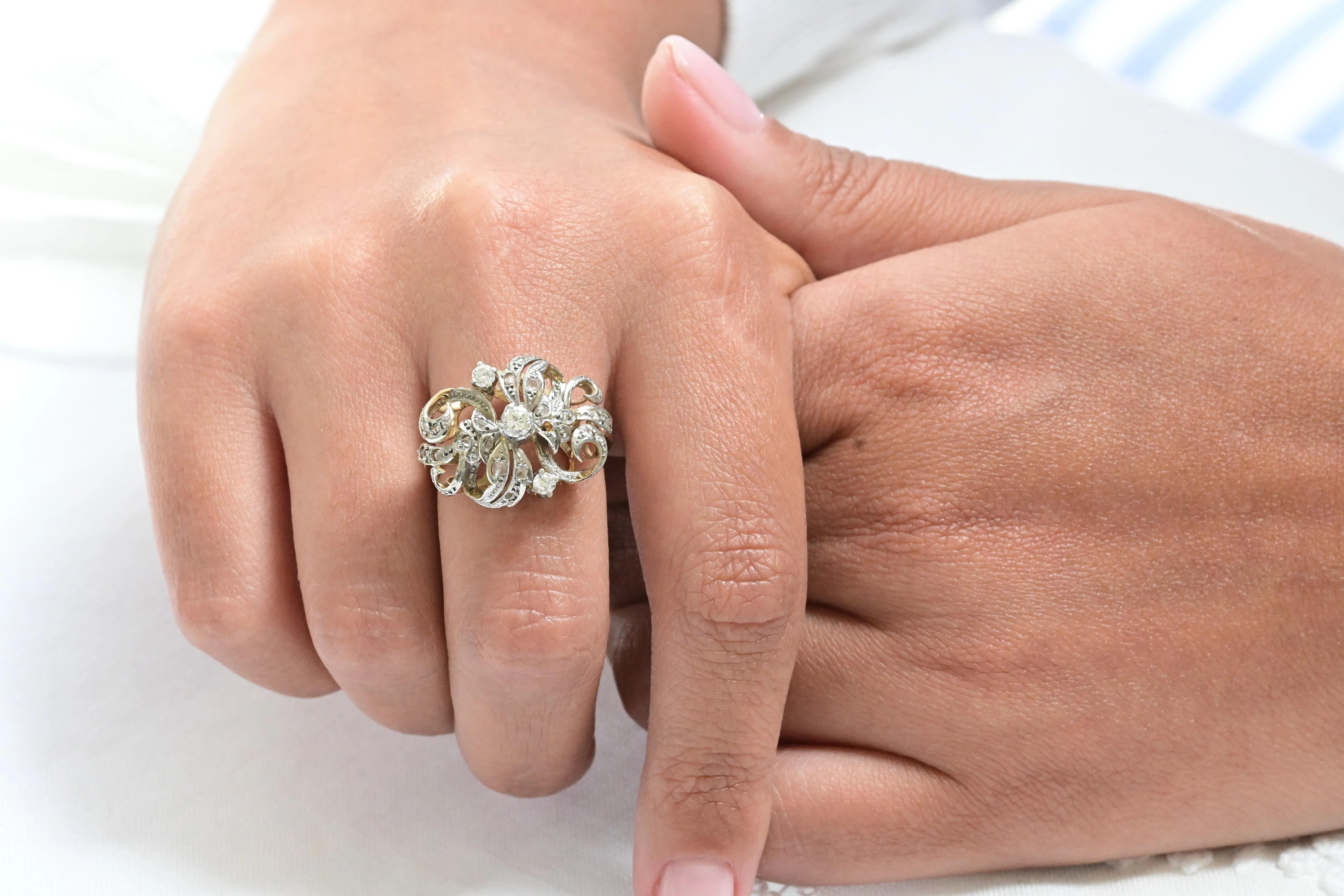 Edelsteine: 1 zentraler runder Diamant im Brillantschliff, 2 Diamanten im Brillantschliff und 20 Diamanten im Rosenschliff.