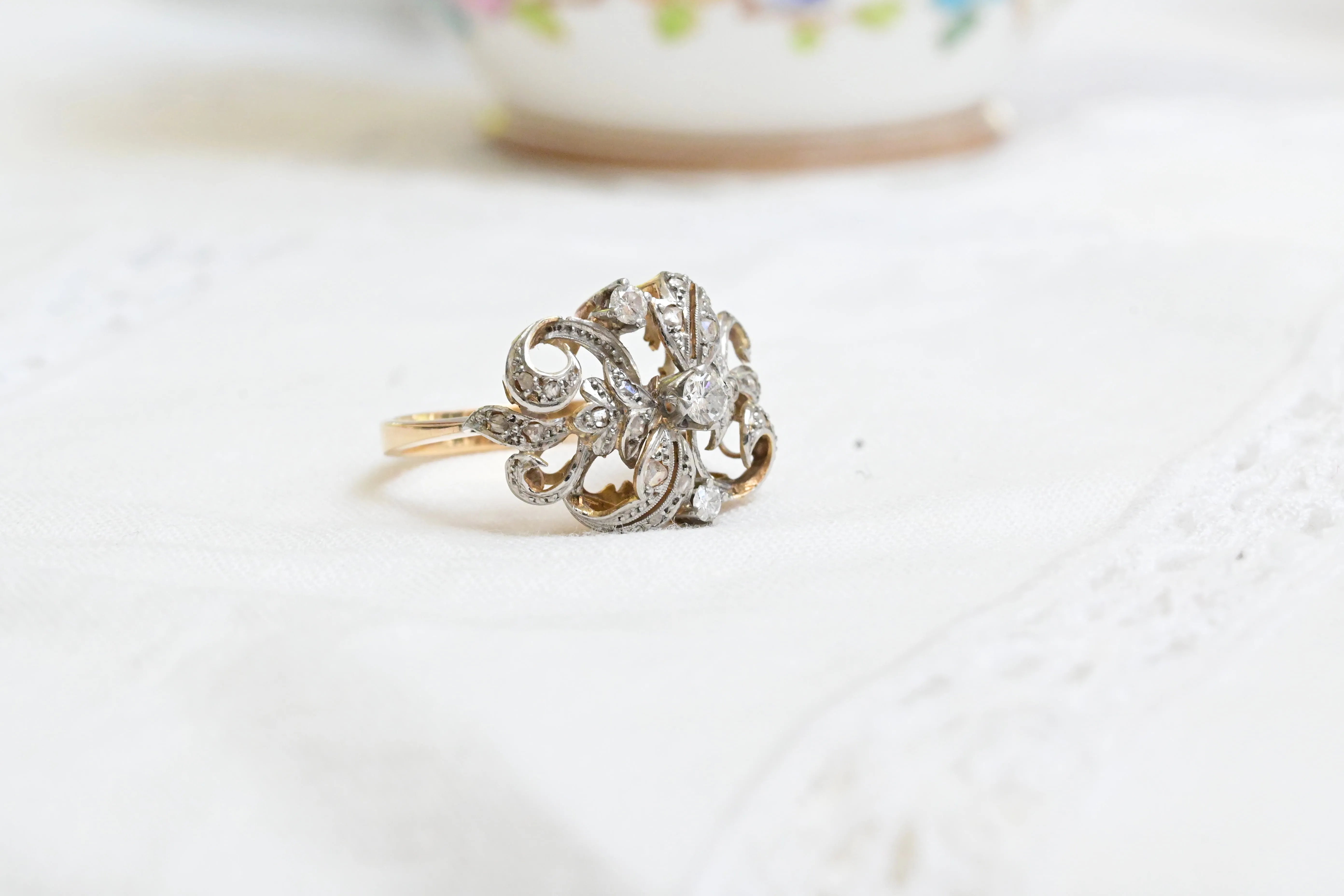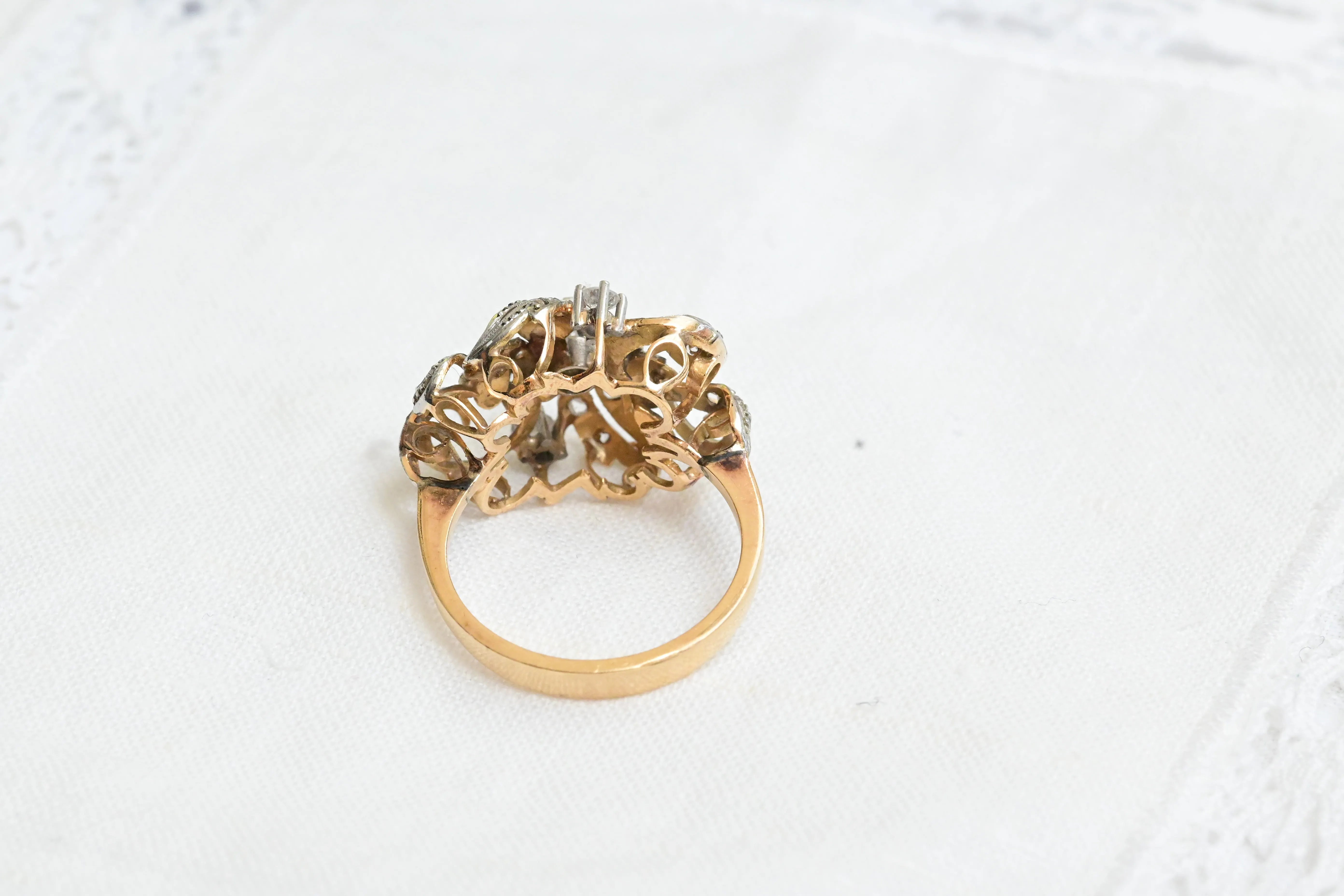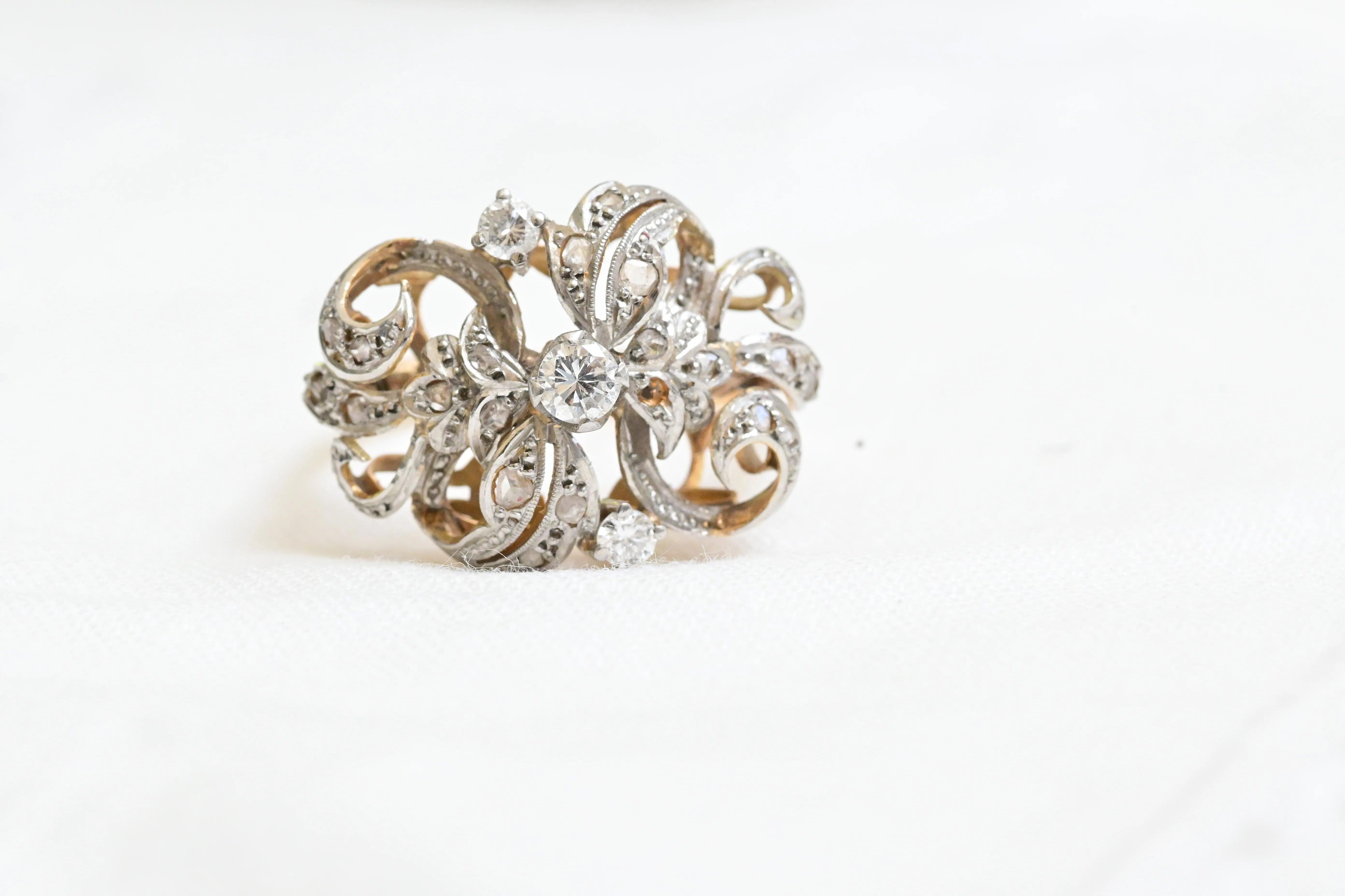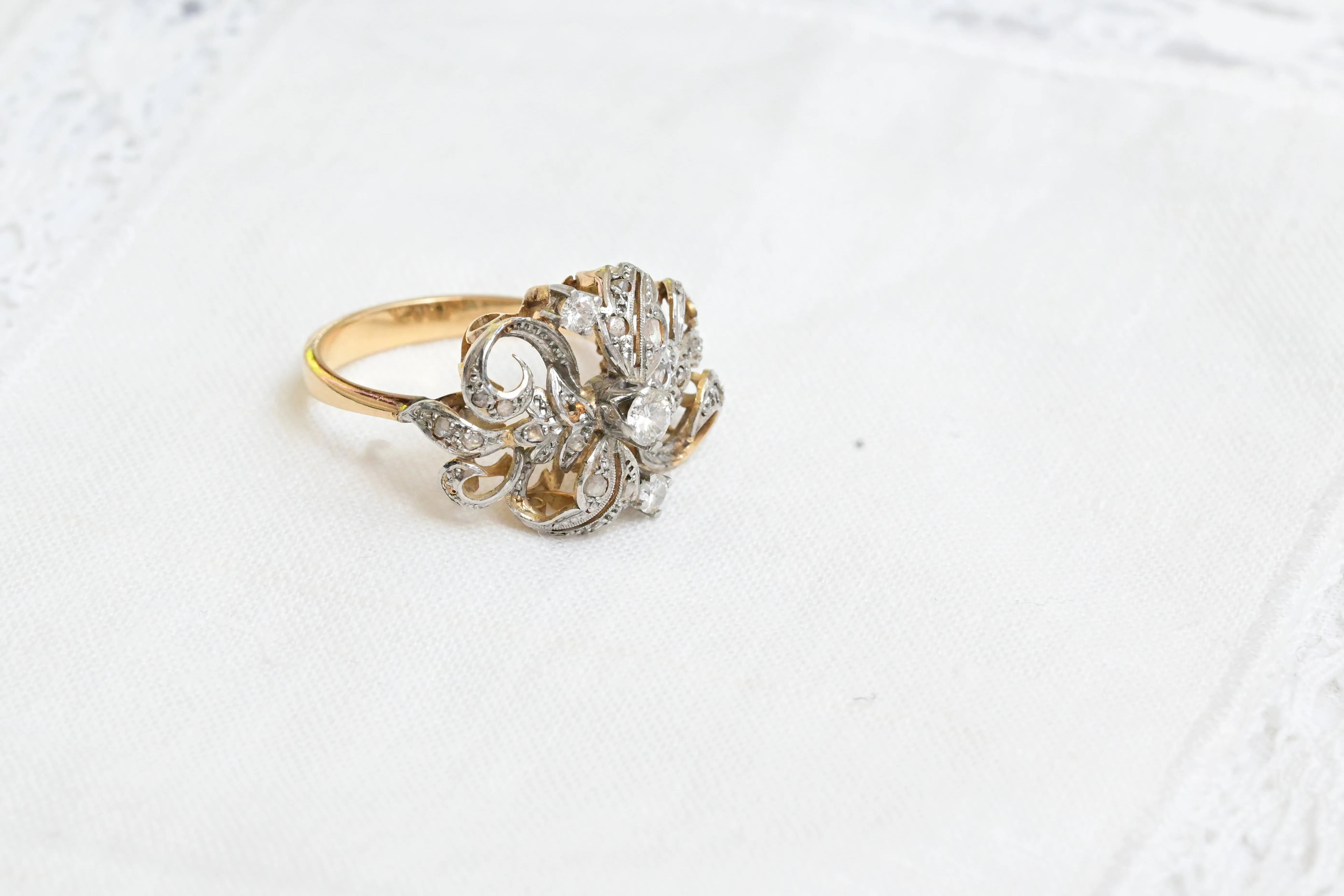 Jugendstilring aus dem frühen 20. Jahrhundert mit einem Design aus 14 K Gelbgold und Platin, verziert mit Diamanten.
