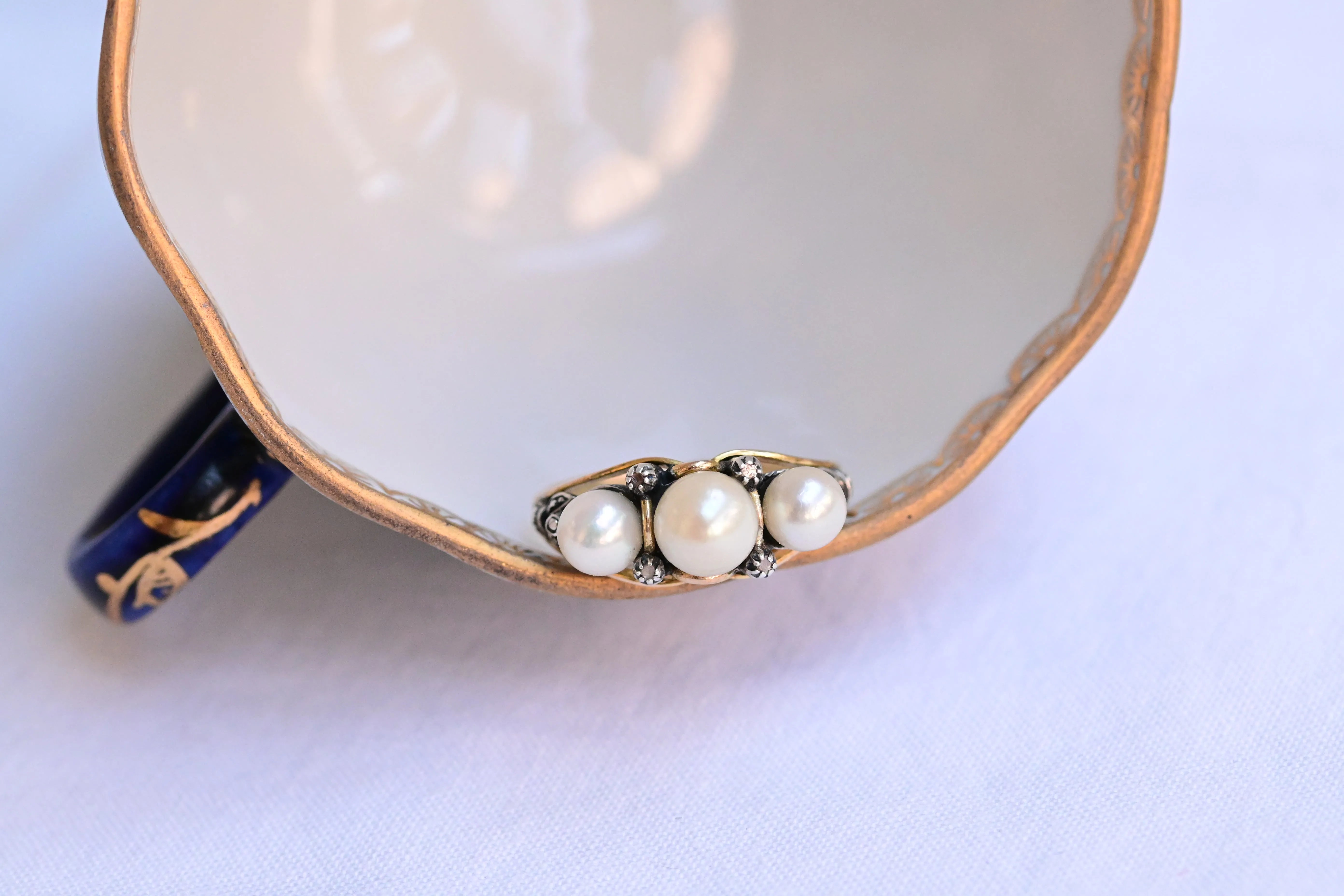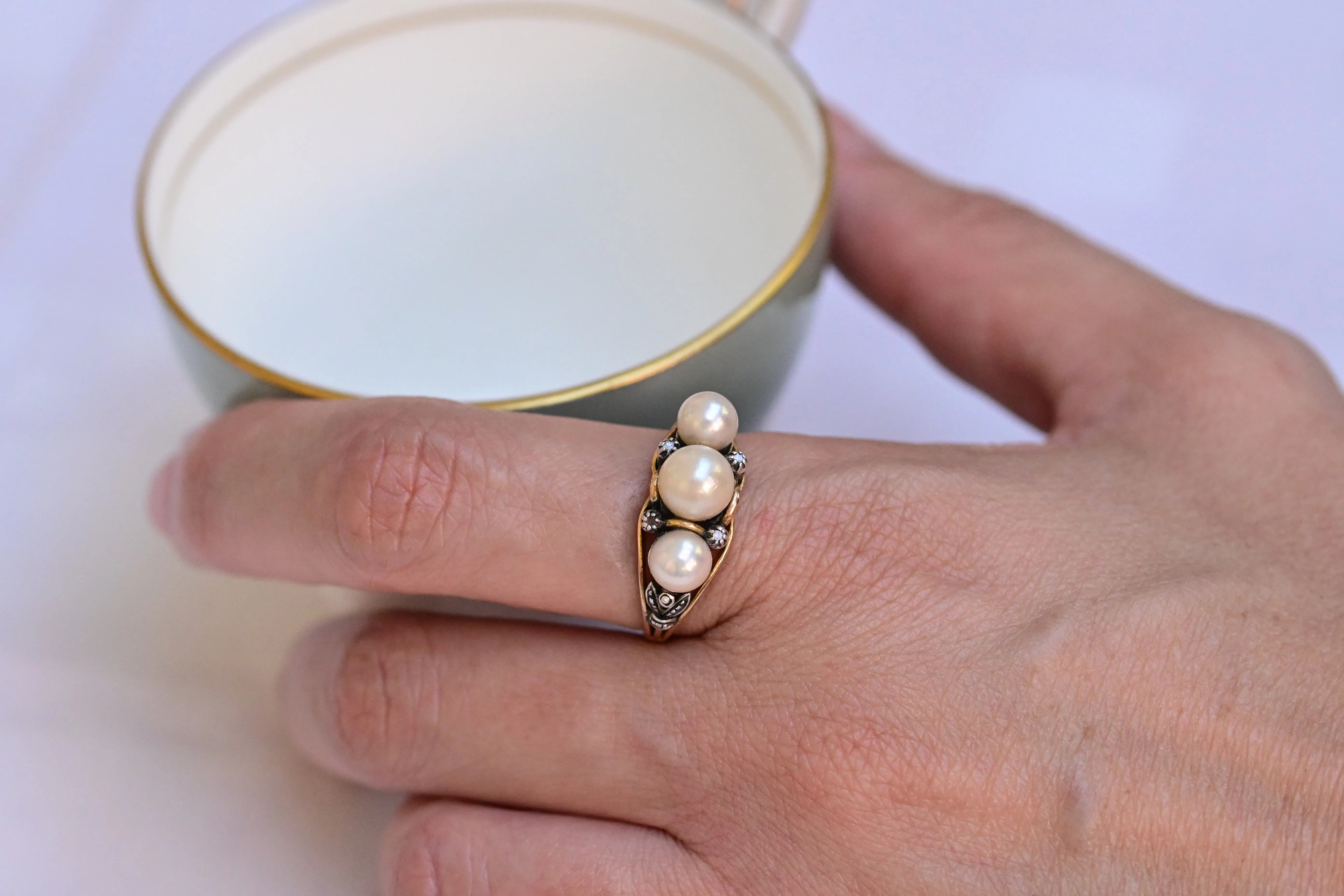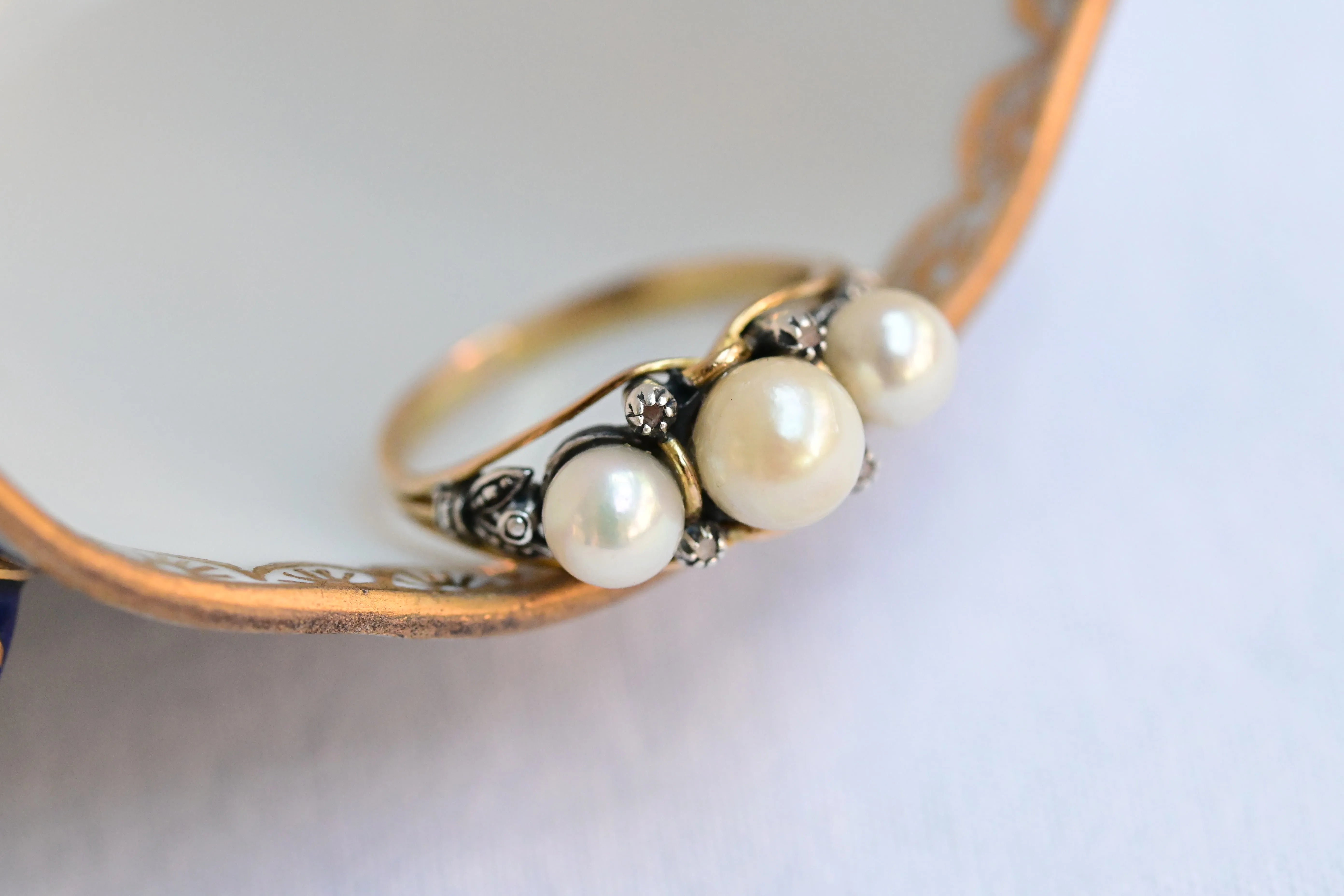 Jugendstilring aus dem ersten Drittel des 20. Jahrhunderts aus 18 Karat Gelbgold und Silber mit einem Satz aus 3 Akoya-Perlen.