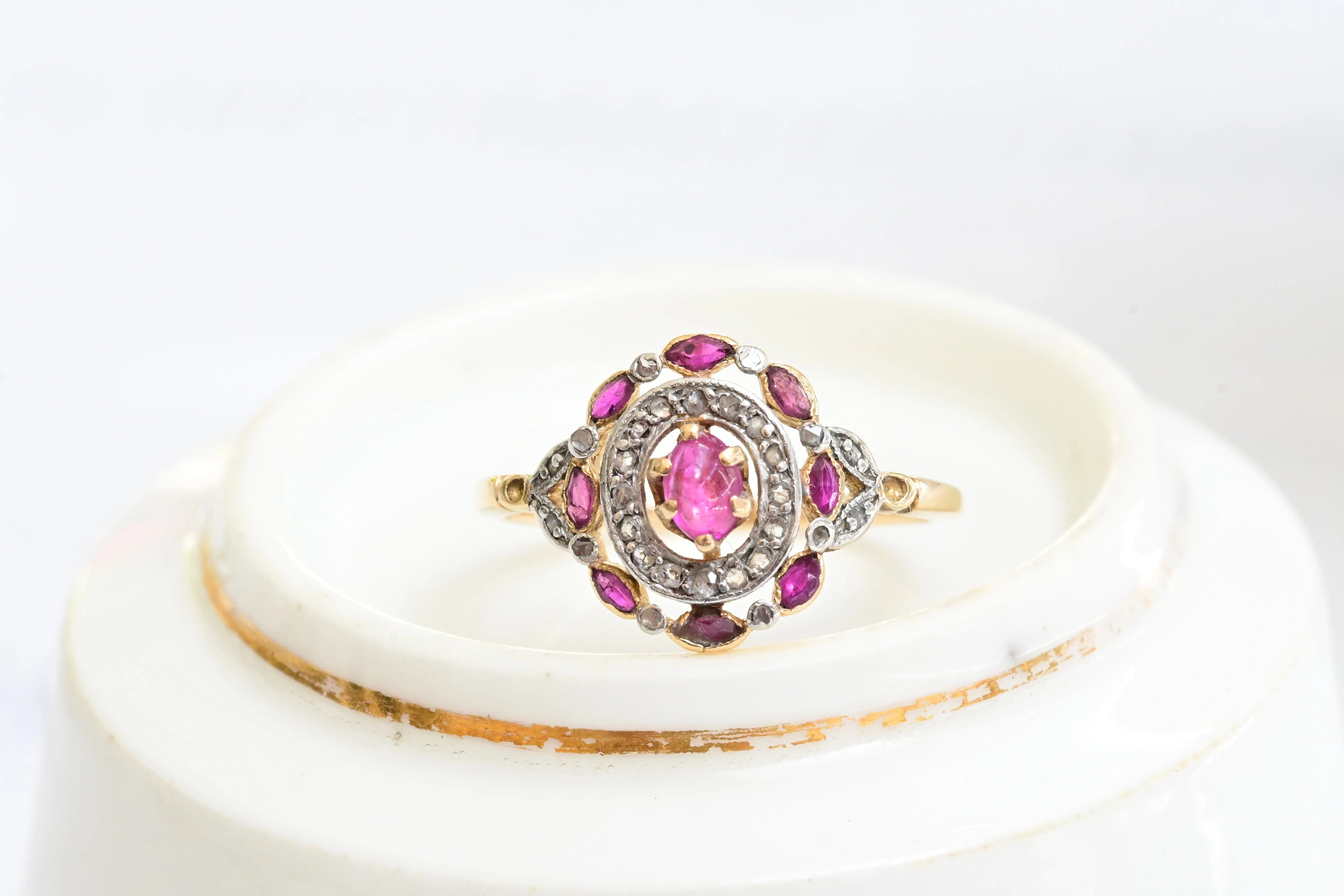 Jugendstilring aus der ersten Hälfte des 20. Jahrhunderts aus 18-karätigem Gelbgold mit einem zentralen ovalen Rubin, umgeben von Diamanten im Rosenschliff und Rubinen im Marquiseschliff, eingefasst in Silber.