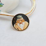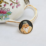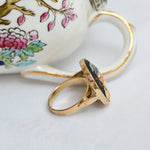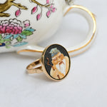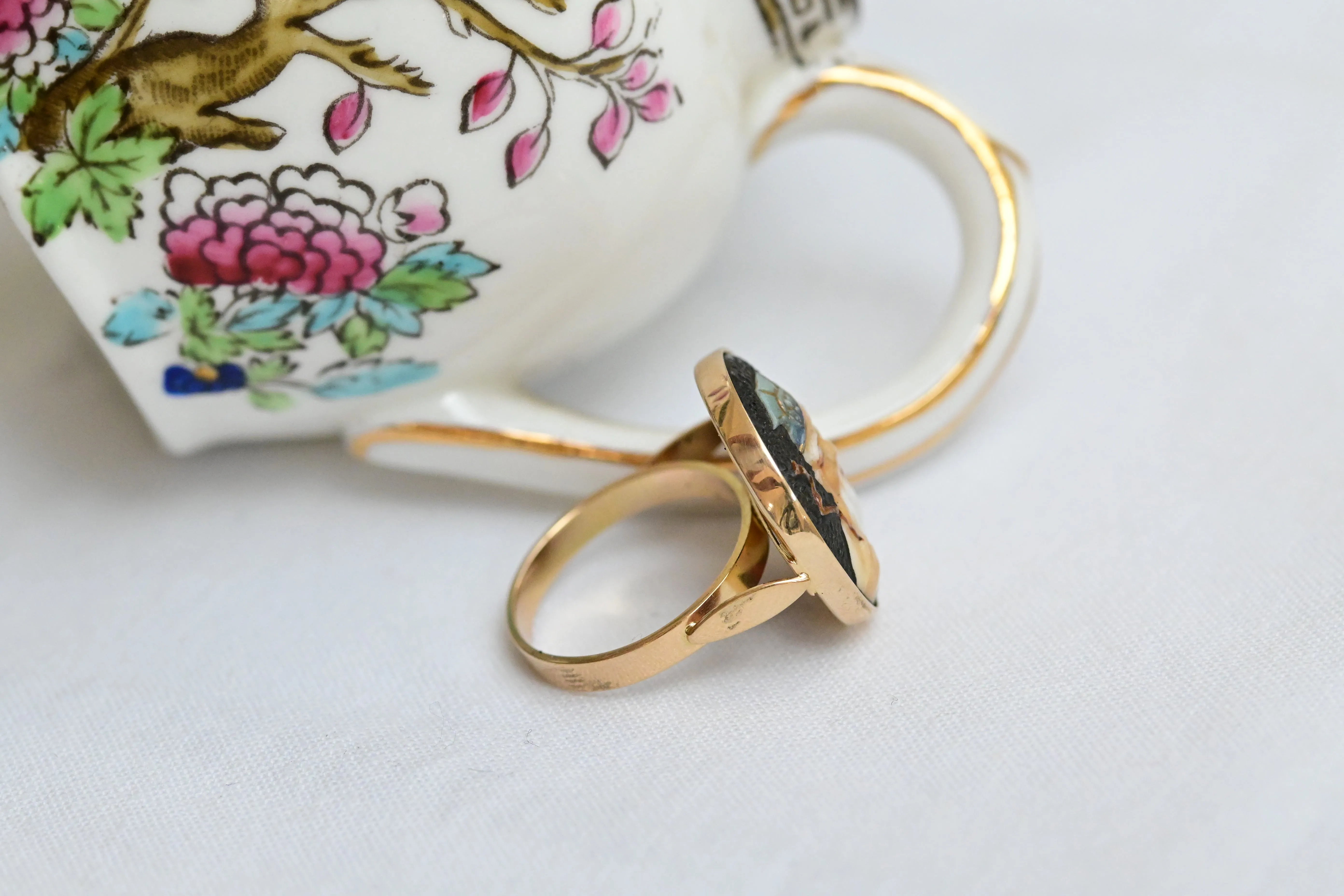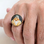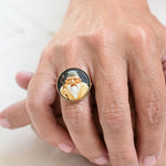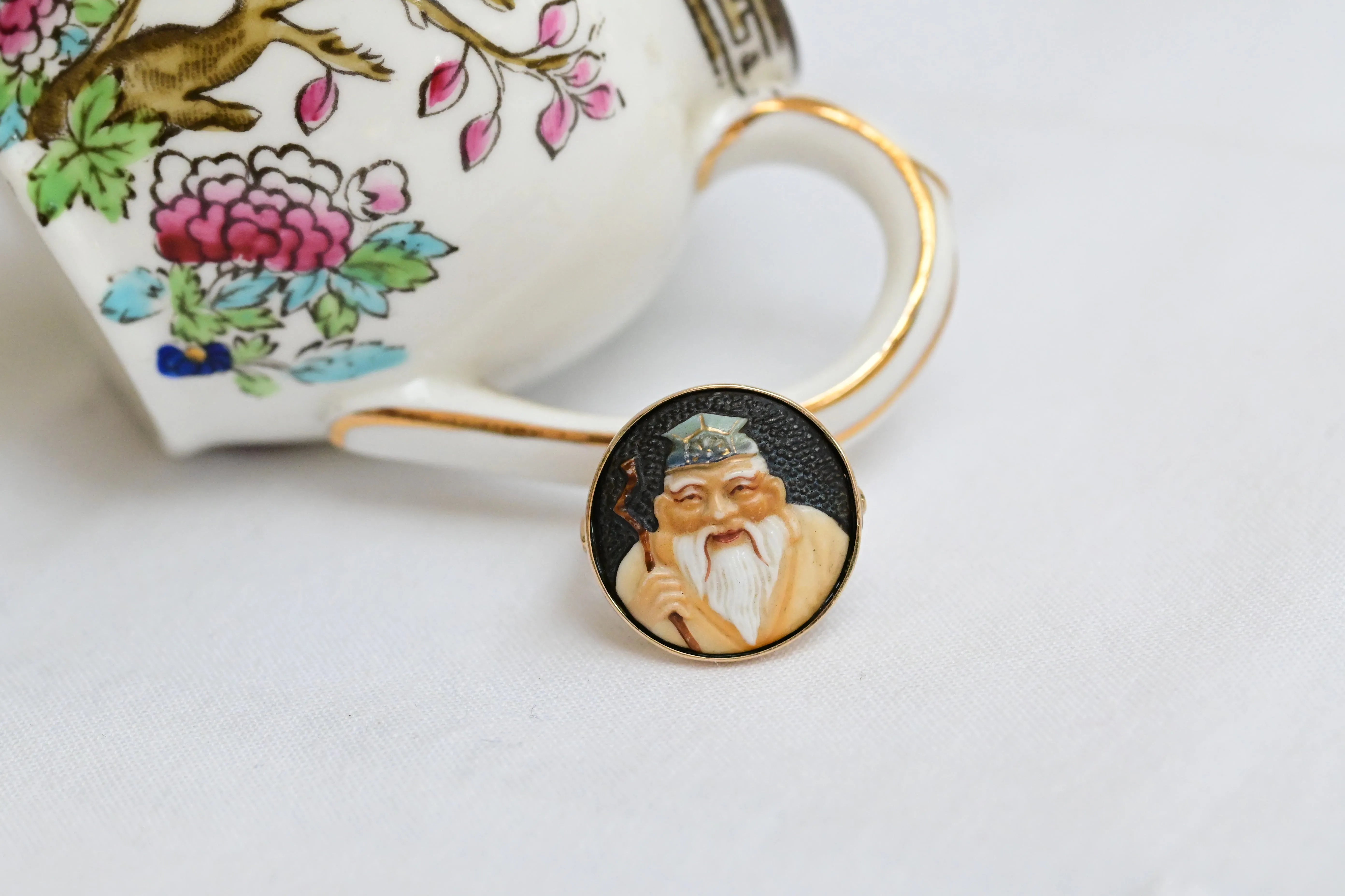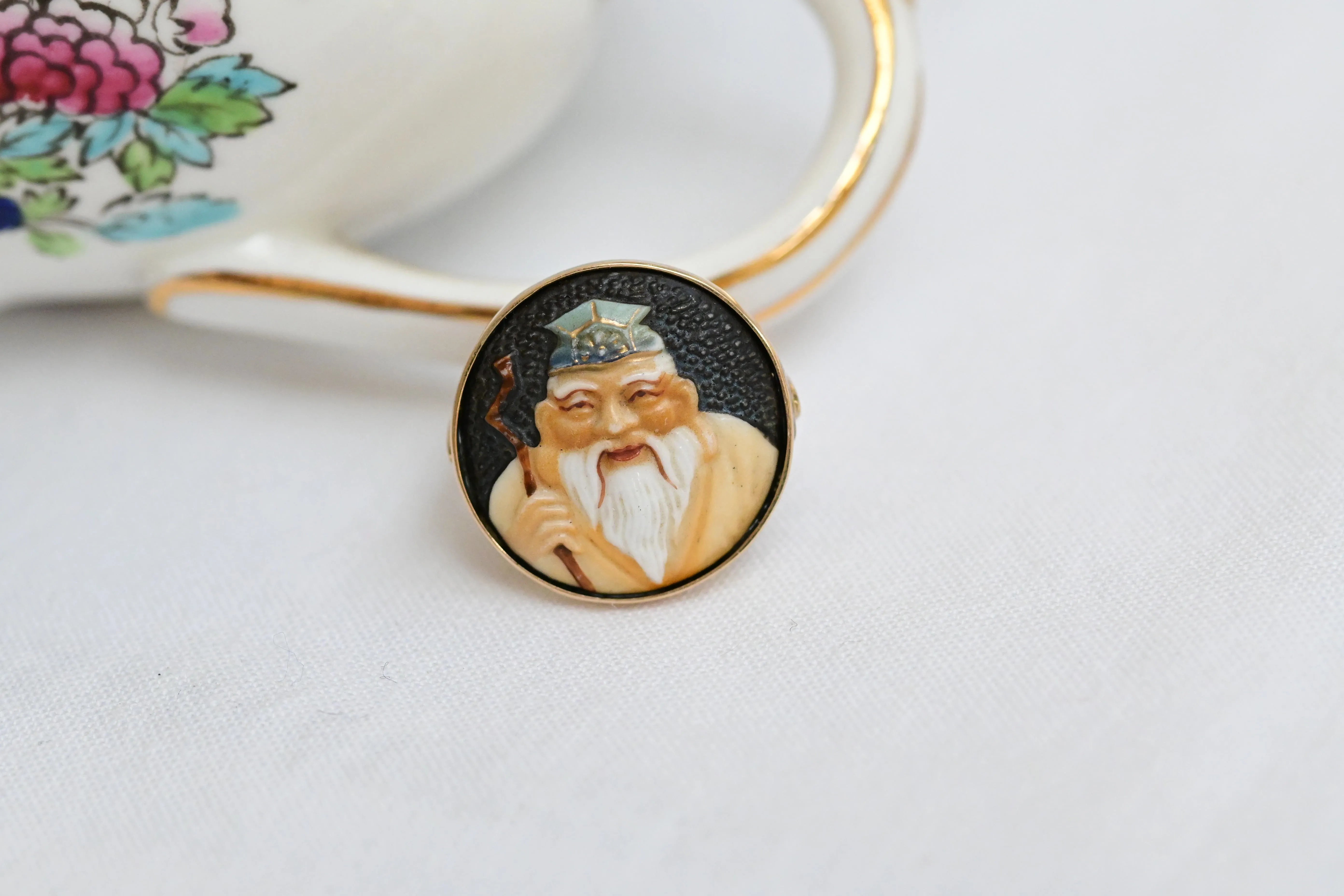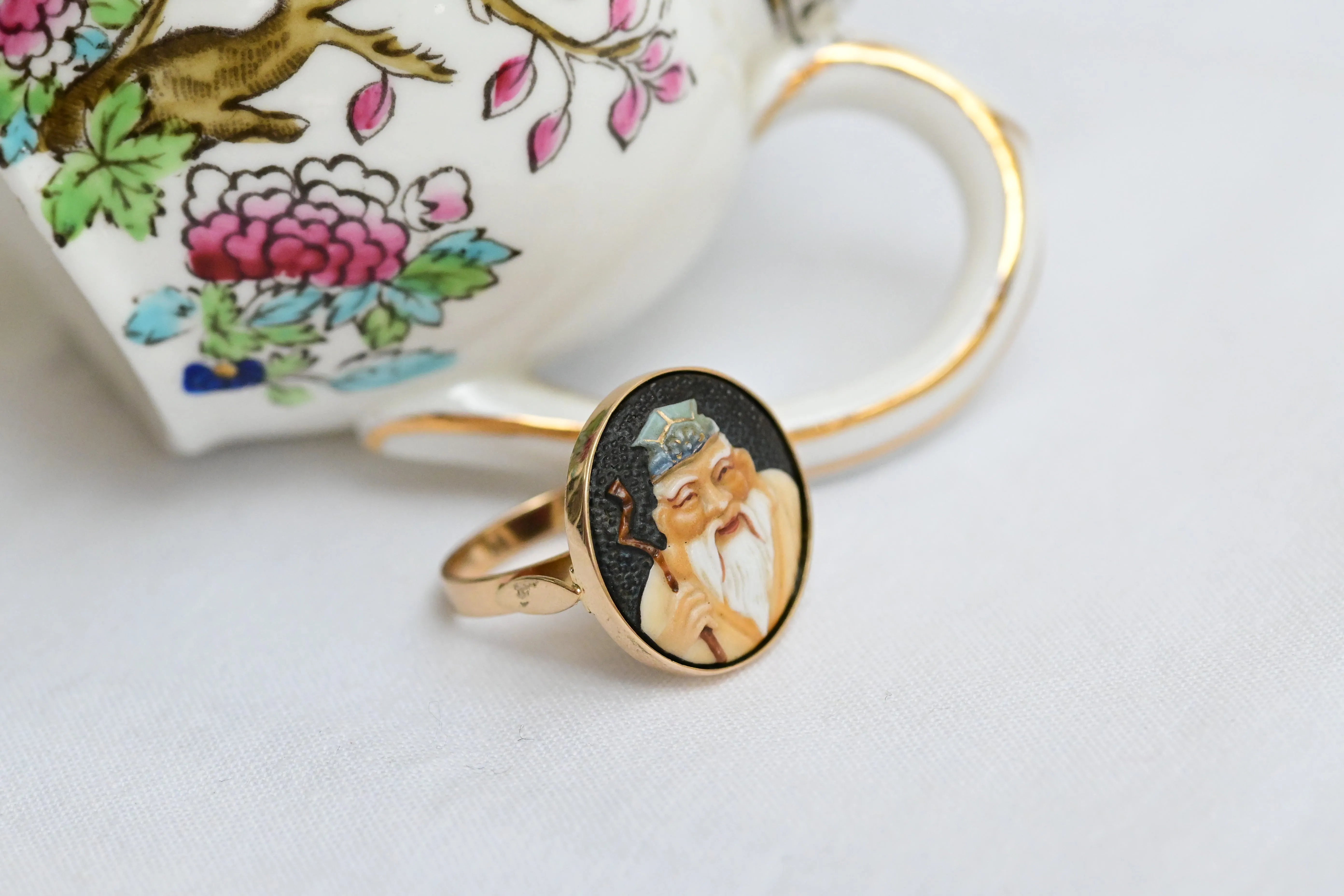 Vintage-Ring aus 18 K Gelbgold mit zentralem Motiv eines asiatischen Mönchs aus Porzellan.