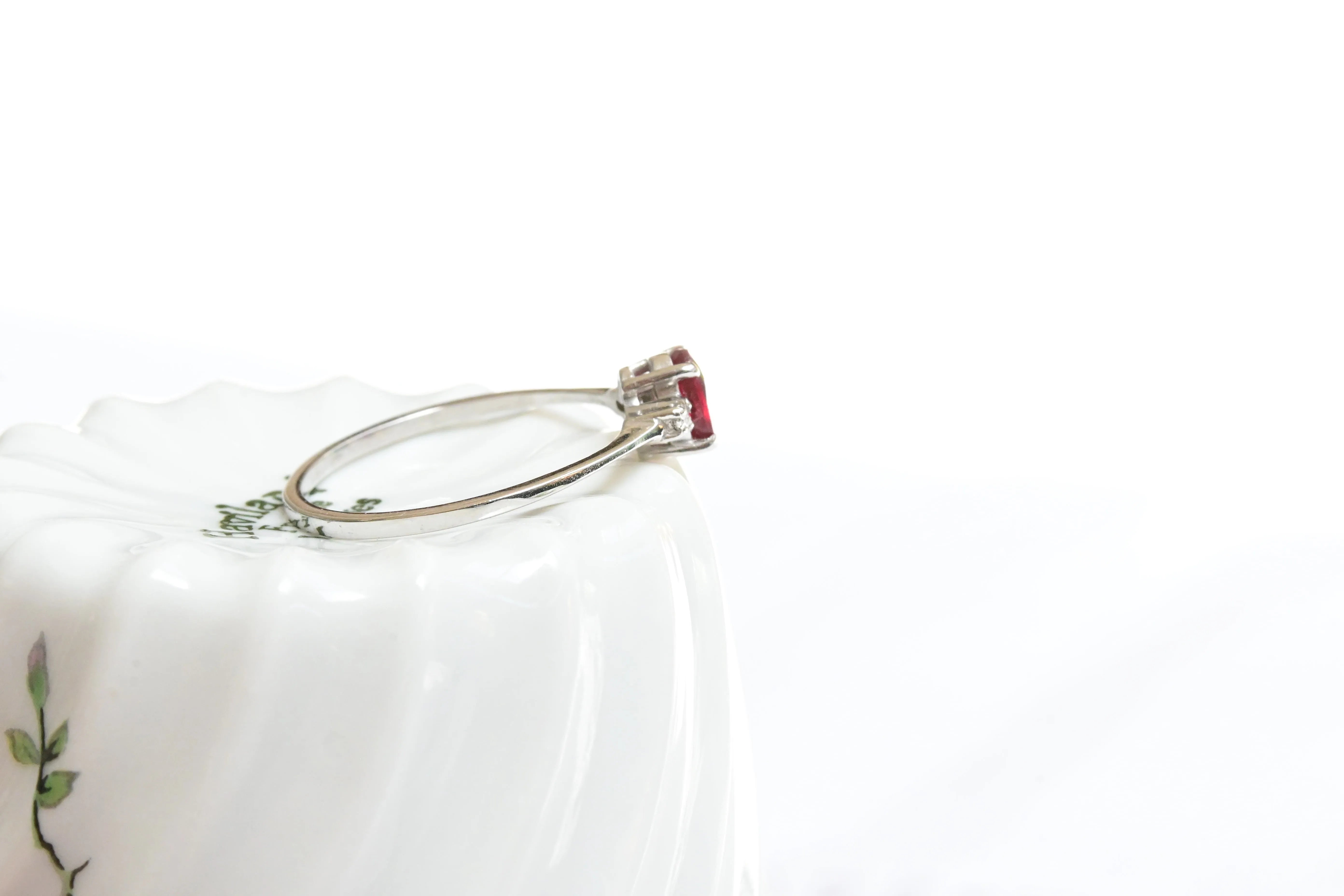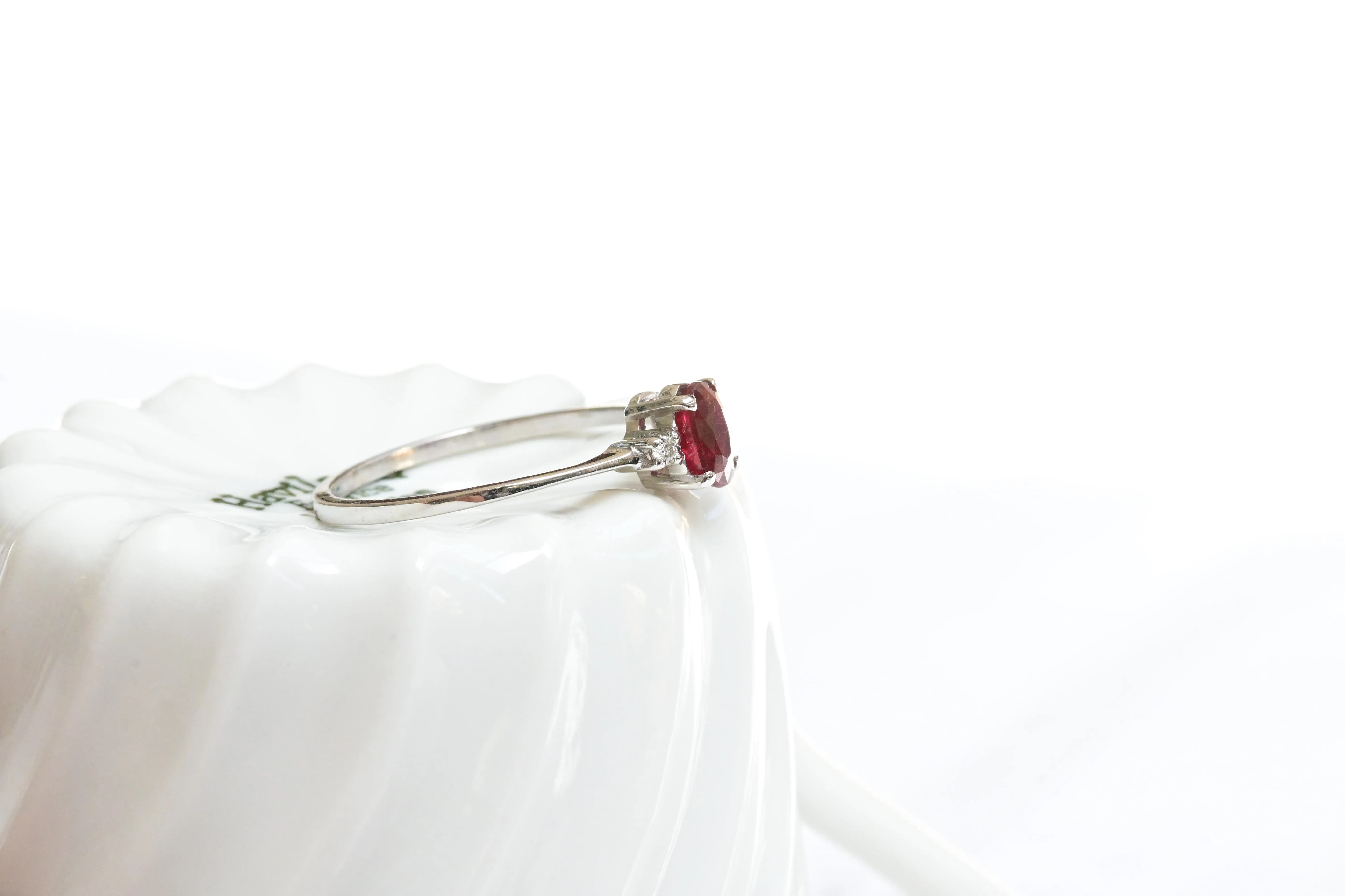 Solitaire ring crafted in 14K white gold, featuring a central oval cut ruby flanked by two round brilliant cut diamonds