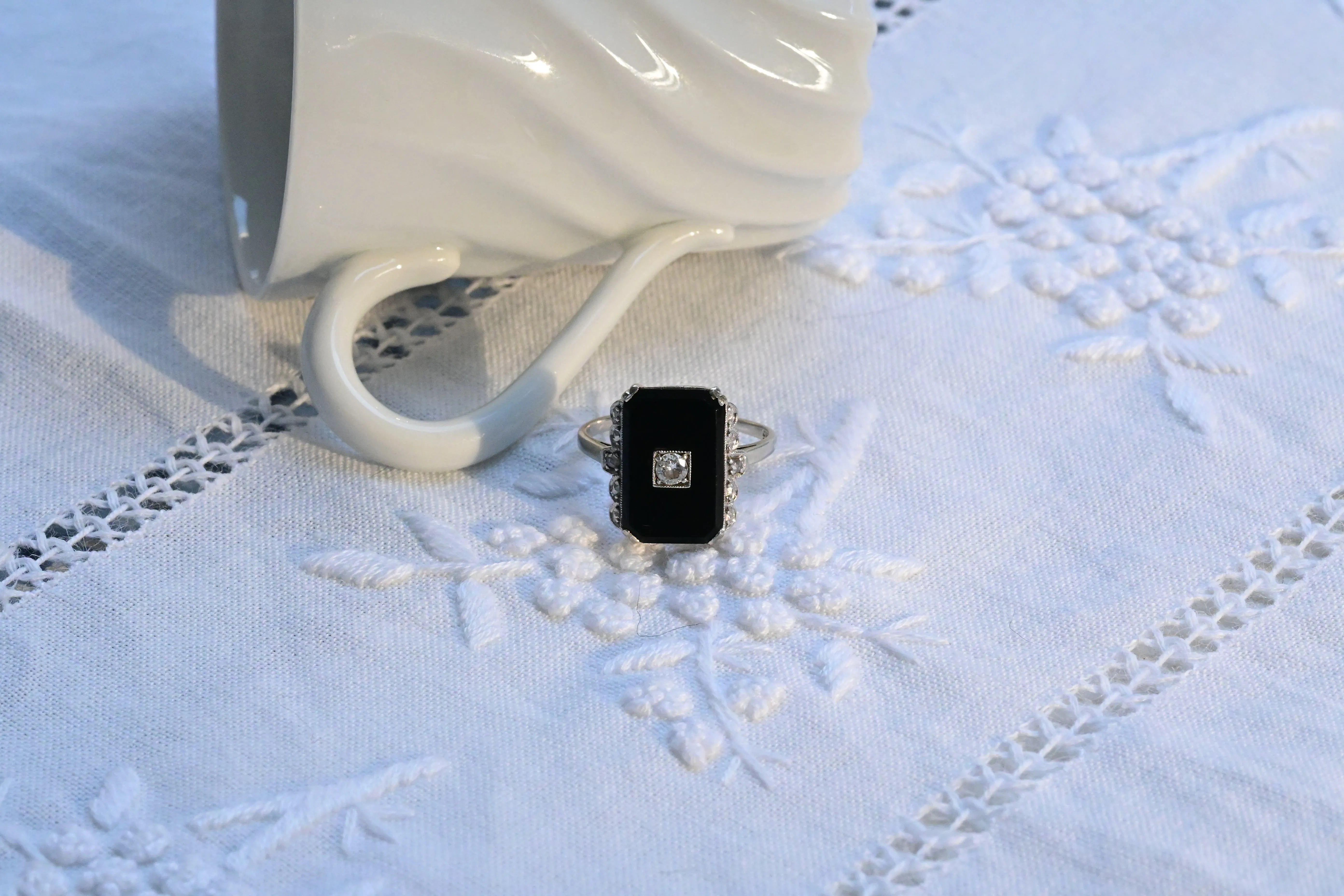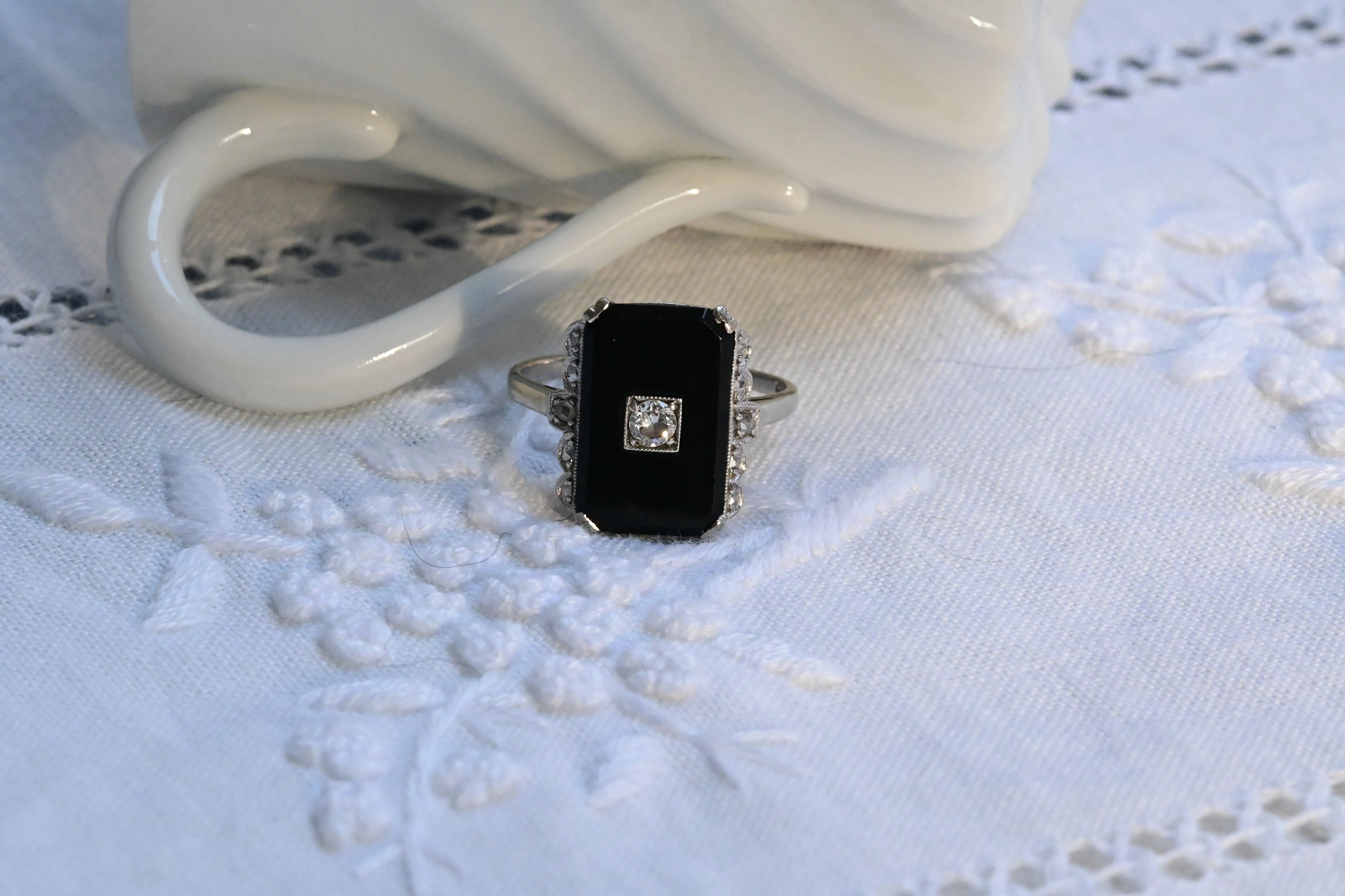 Vintage ring, from the 1930s decade, in 14 K white gold with a central rectangular onyx decorated with a round brilliant cut diamonds and other two rose cut diamonds