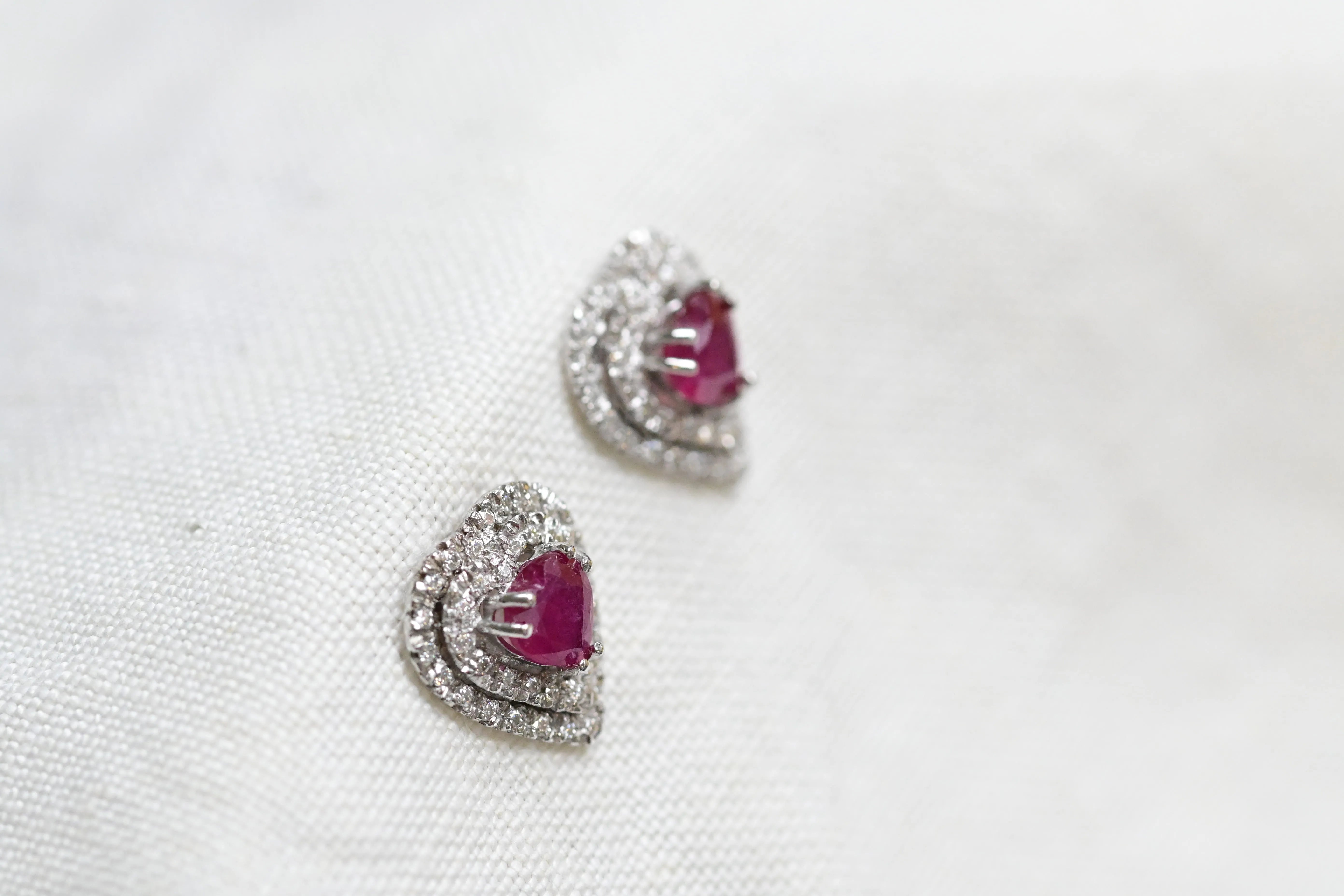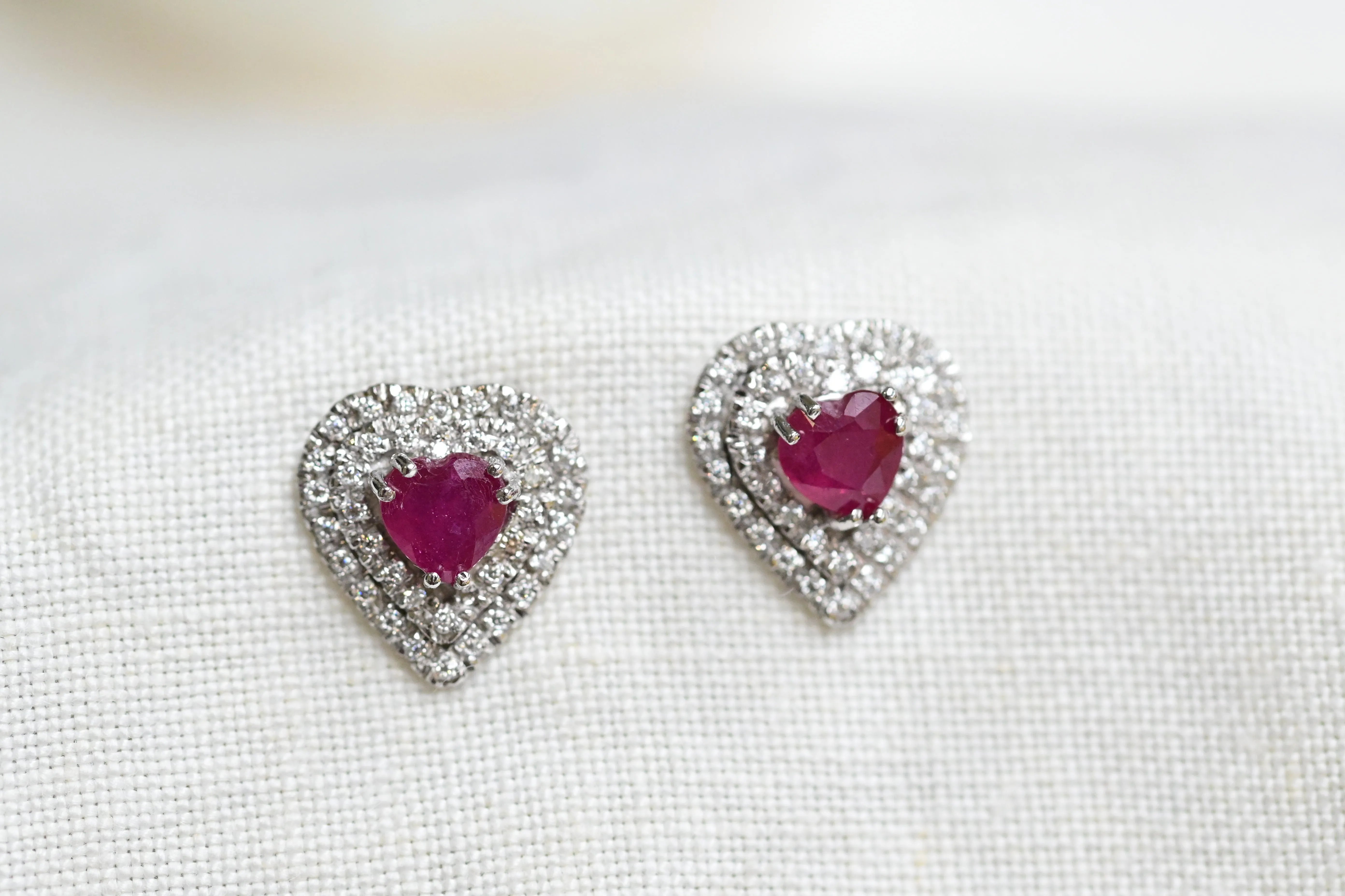 Vintage earrnings crafted in 18 K white gold with a central fancy heart cut rubies and surrounded by two halos with a total of 76 round brilliant cut diamonds