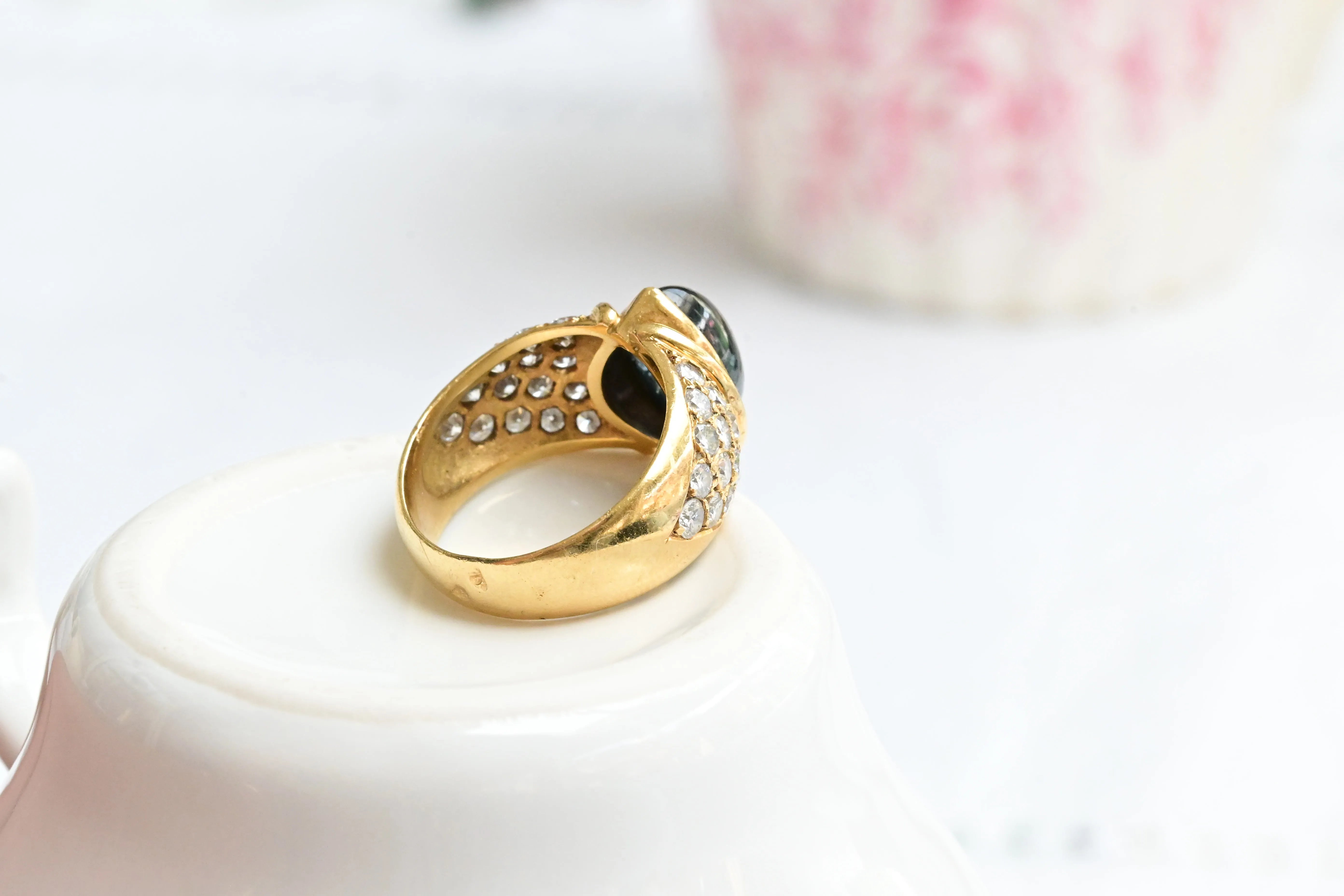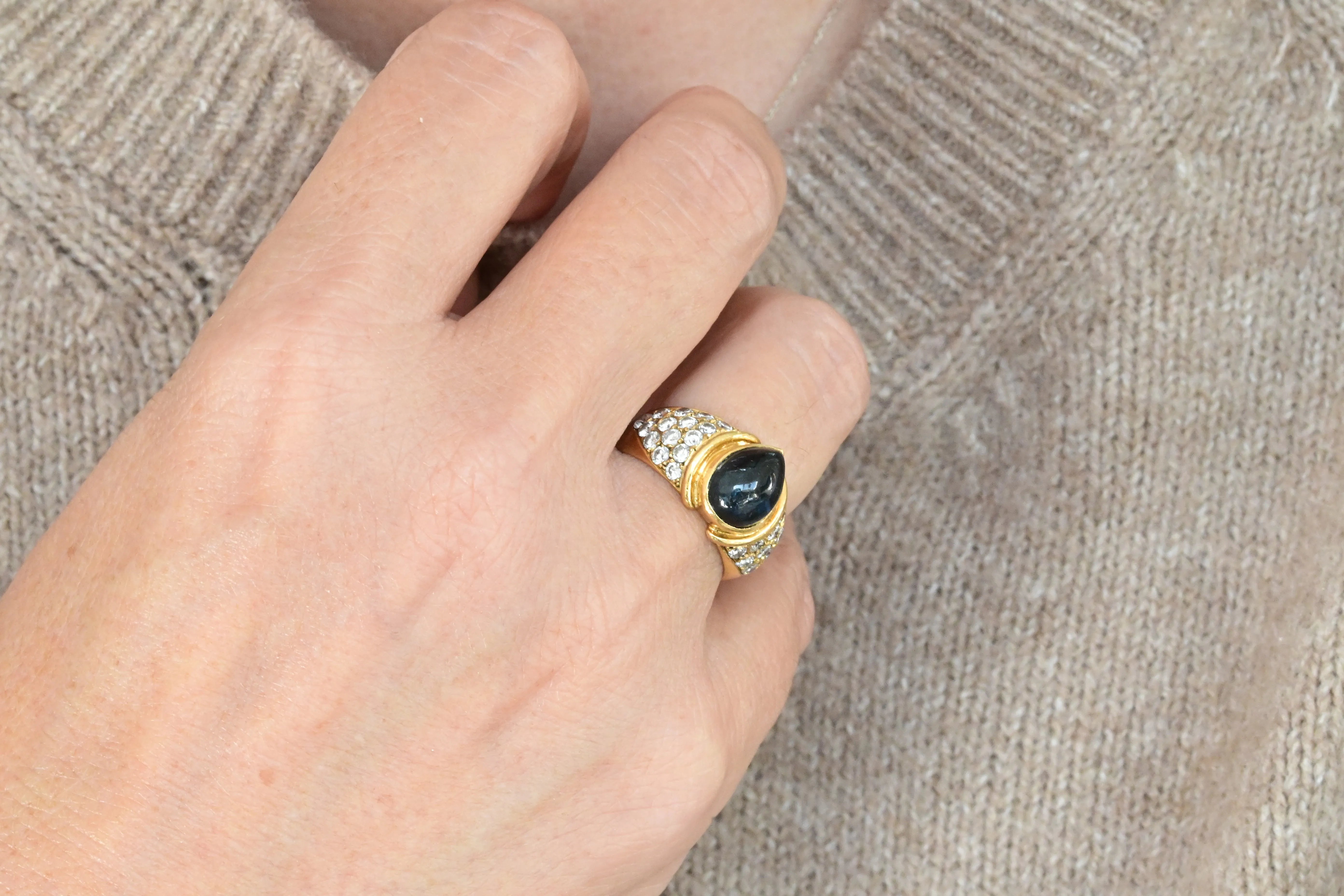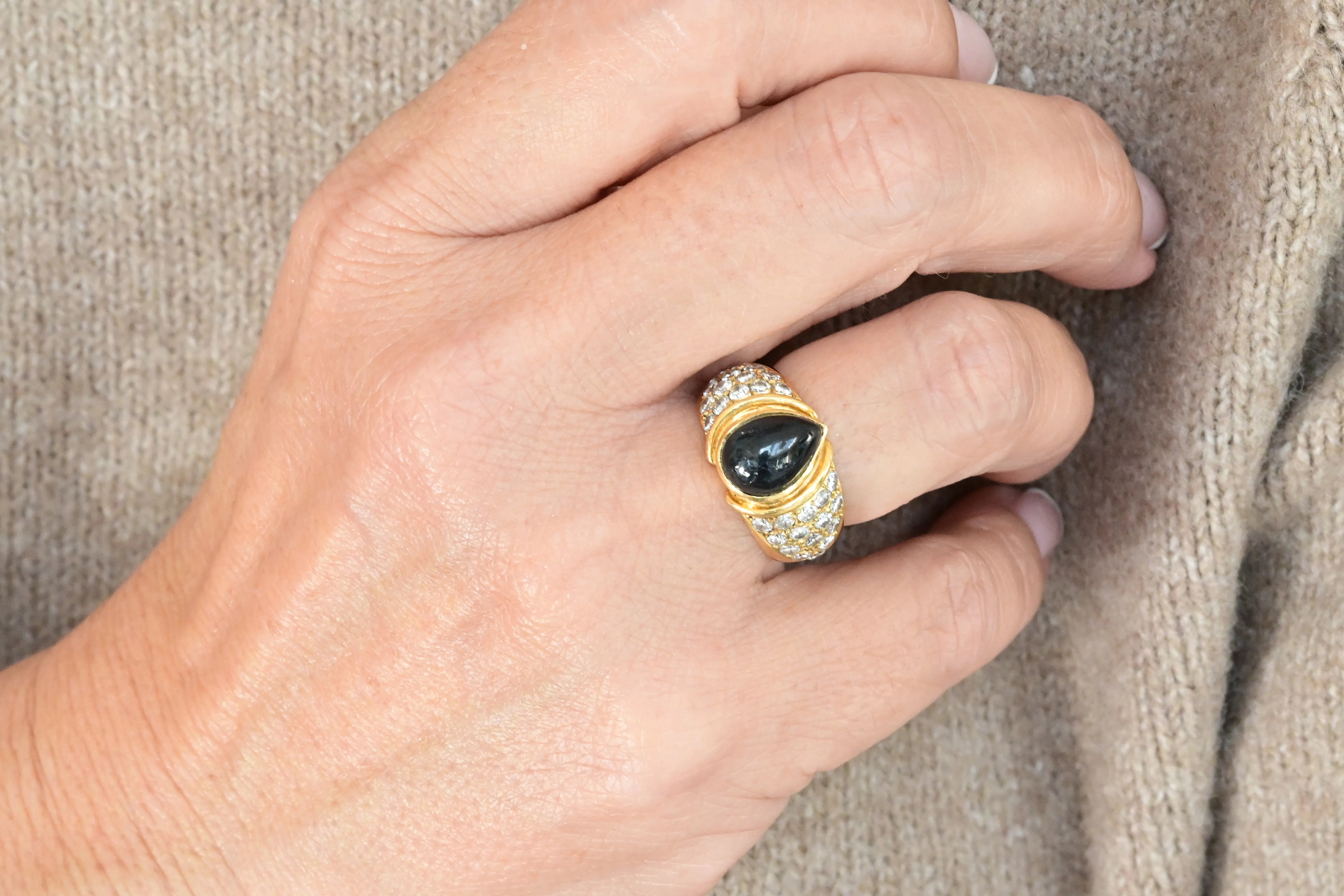 Vintage ring from the 1940s, crafted in 18K yellow gold, featuring a central pear cabochon cut sapphire and adorned with thirty round brilliant cut diamonds
