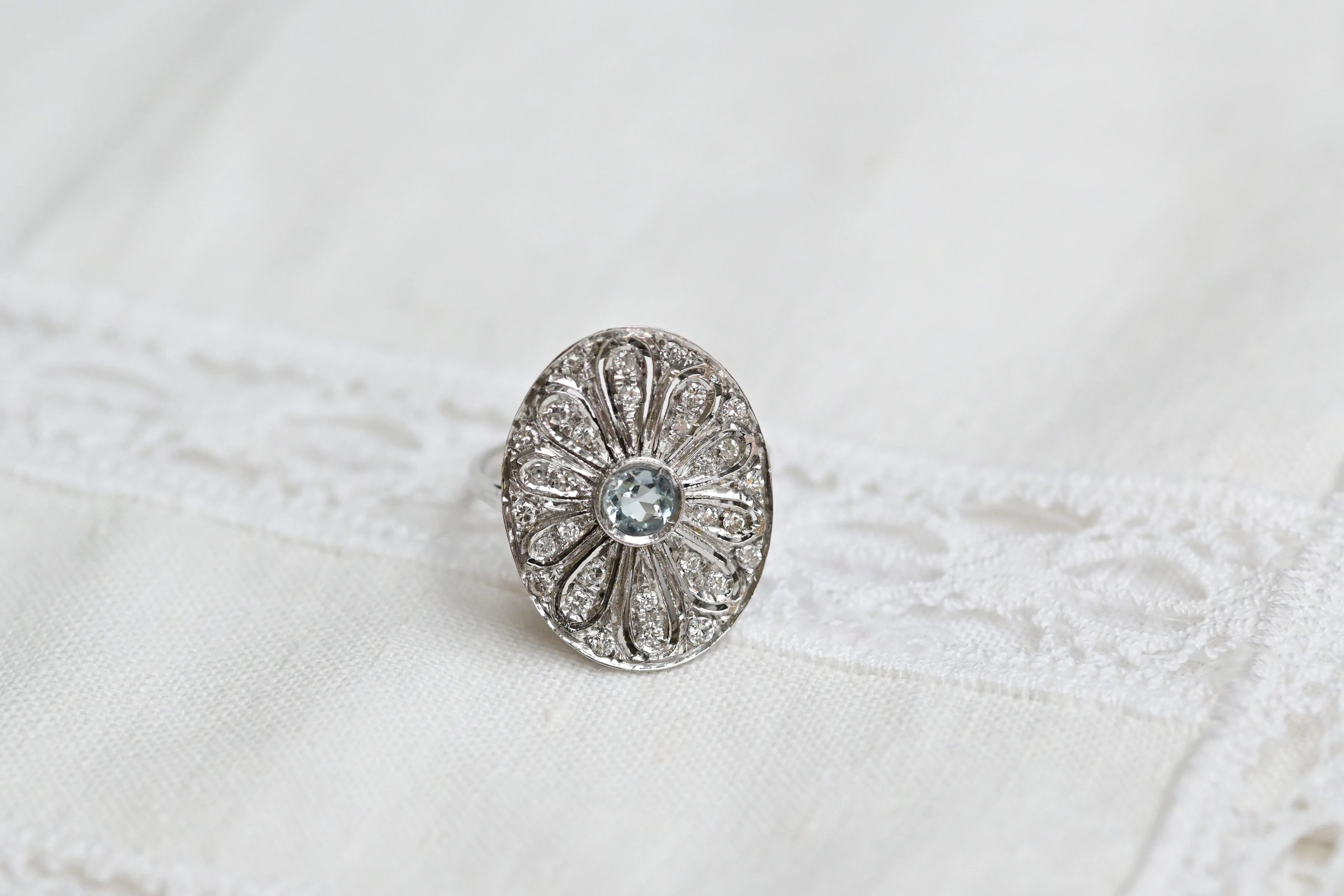 Vintage-Ring aus 18 Karat Weißgold mit einem zentralen Aquamarin im Rundschliff und Diamanten im Huit-Huit-Schliff.