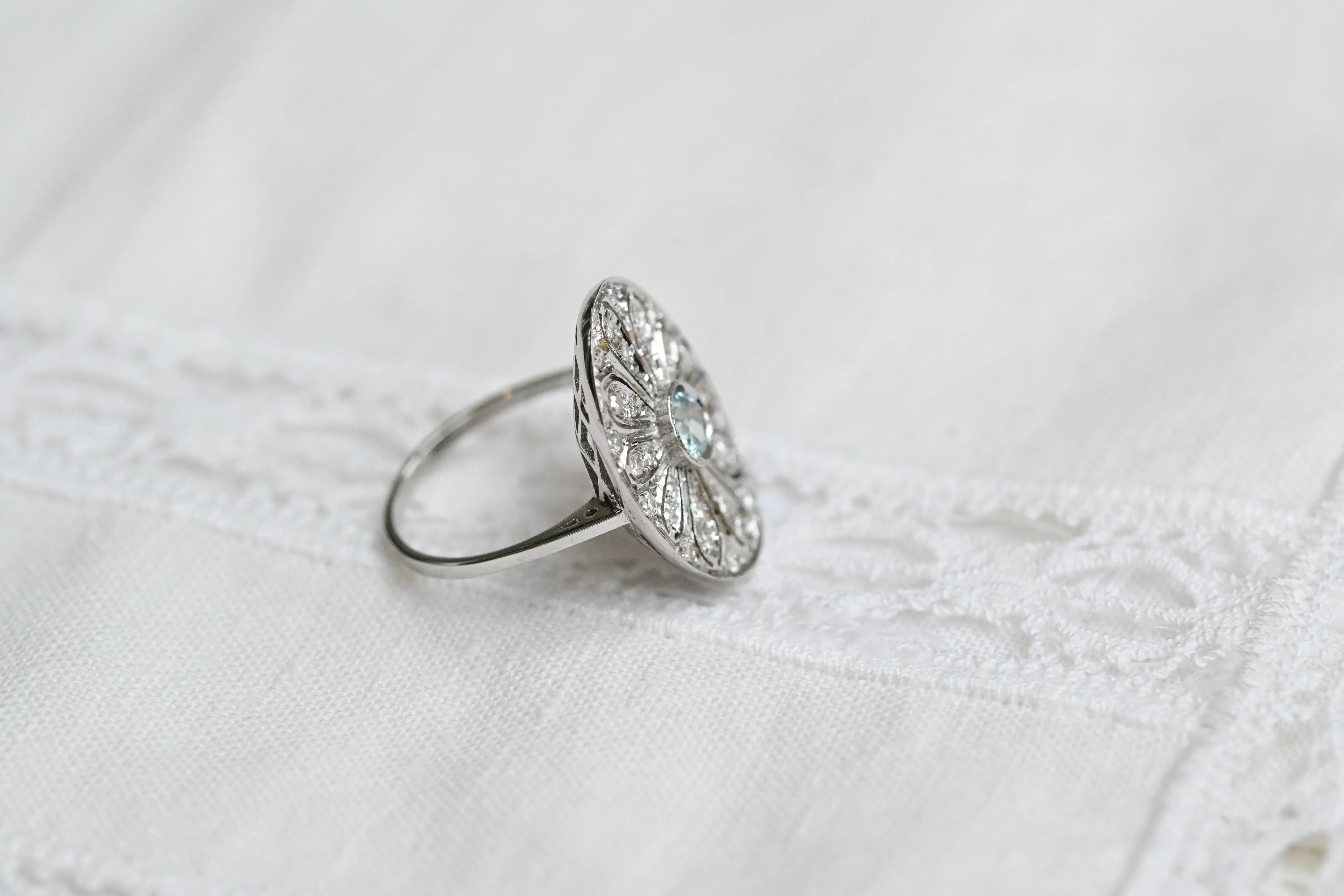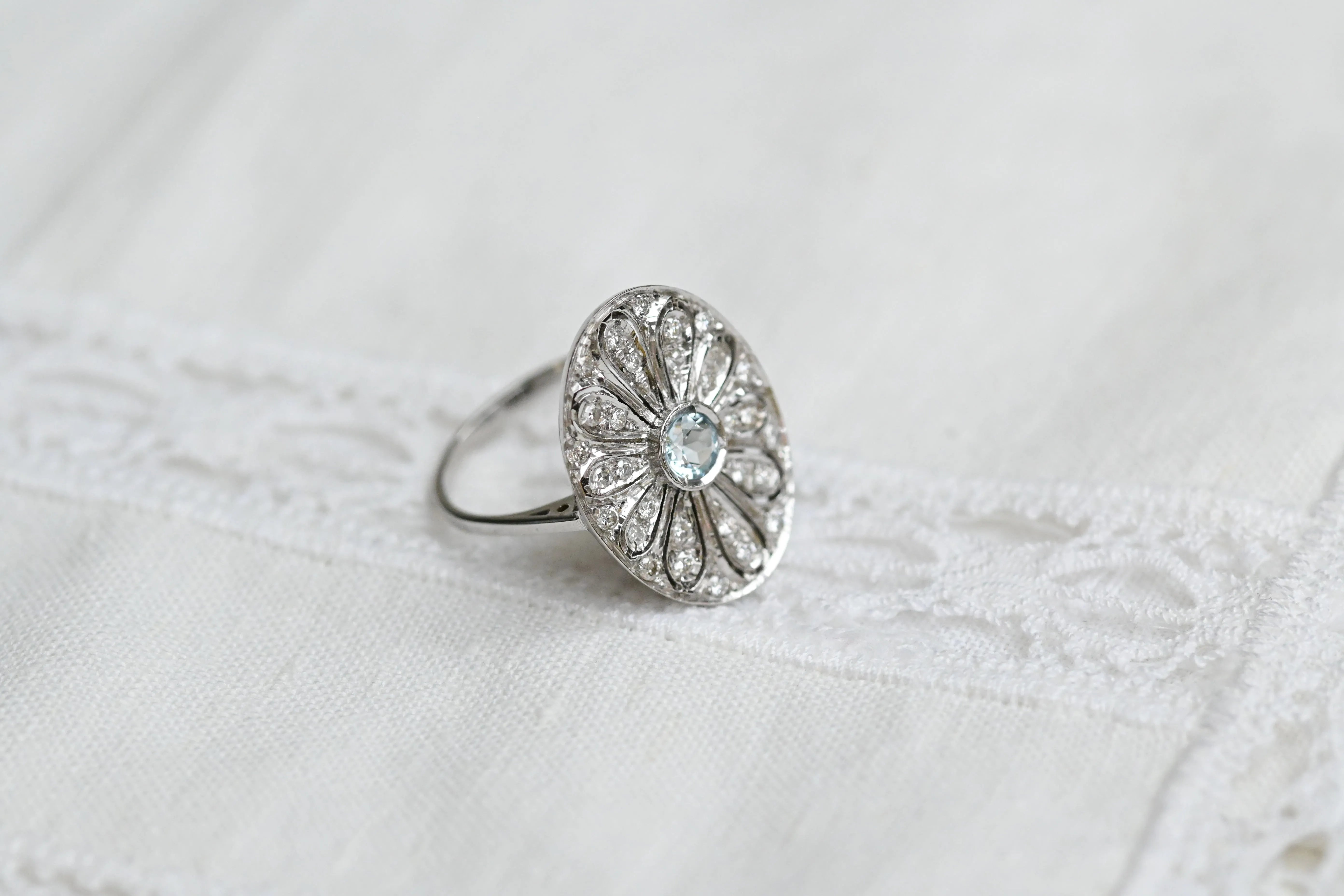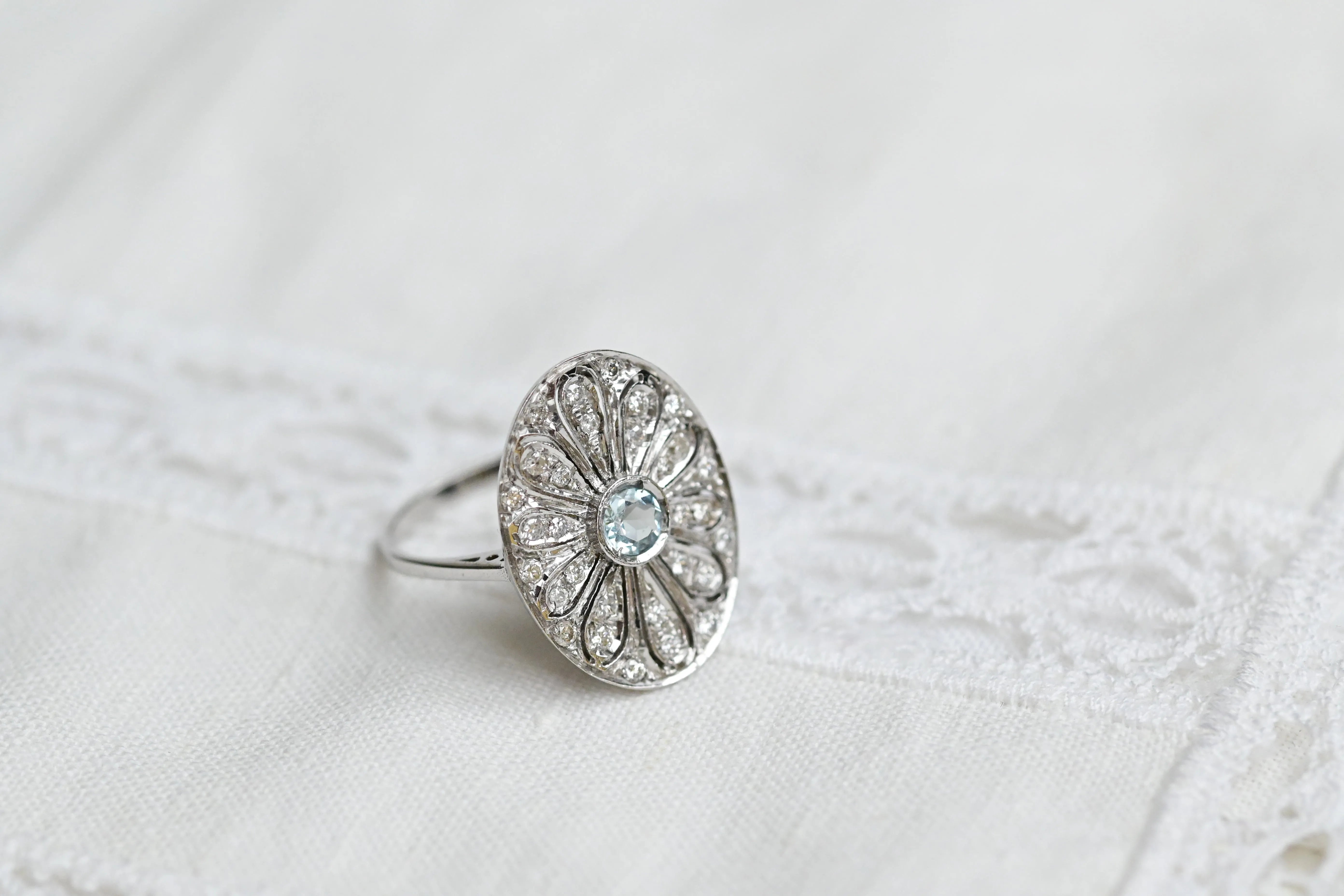 Edelsteine: 1 zentraler Aquamarin im Rundschliff und Diamanten im Huit-Huit-Schliff.