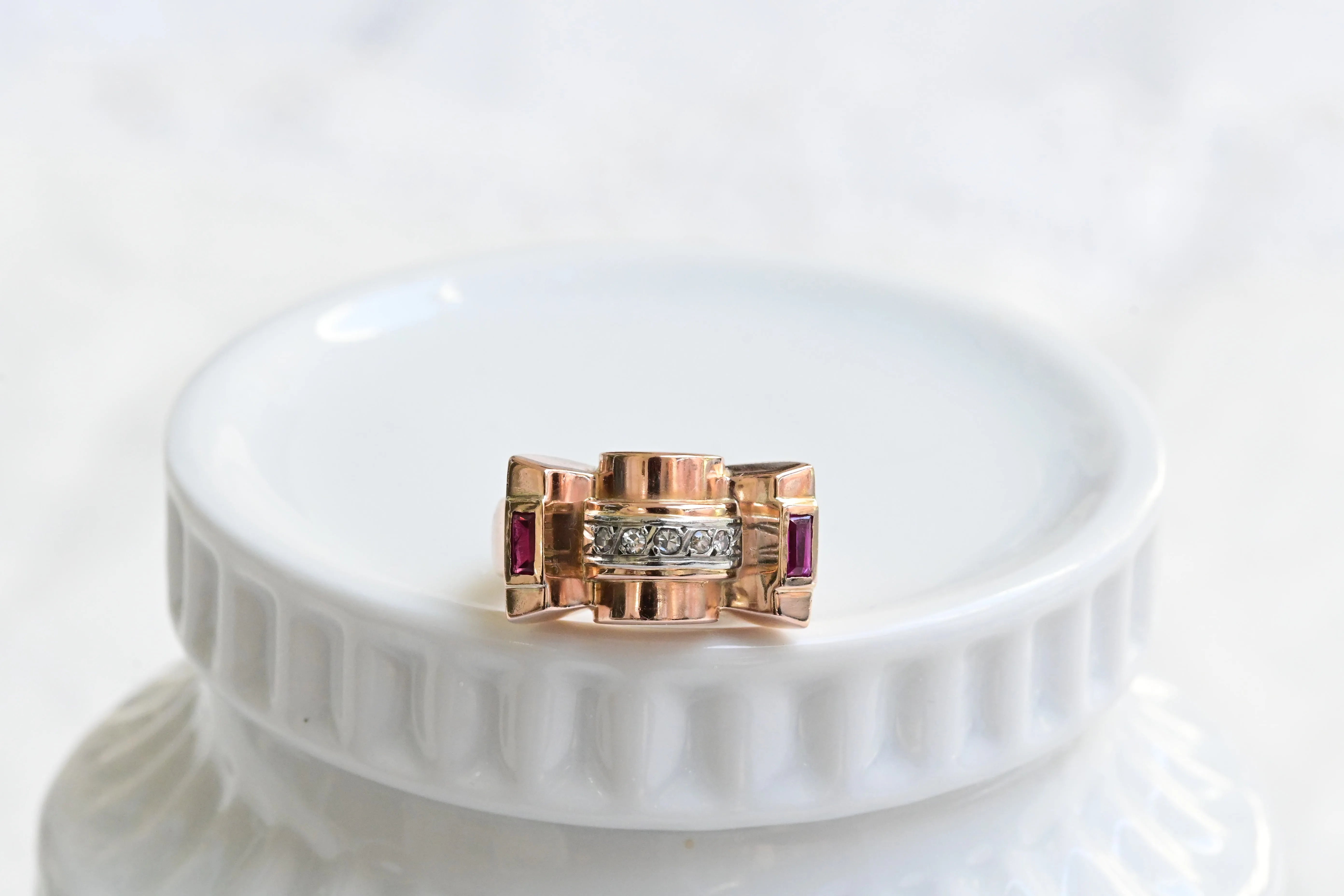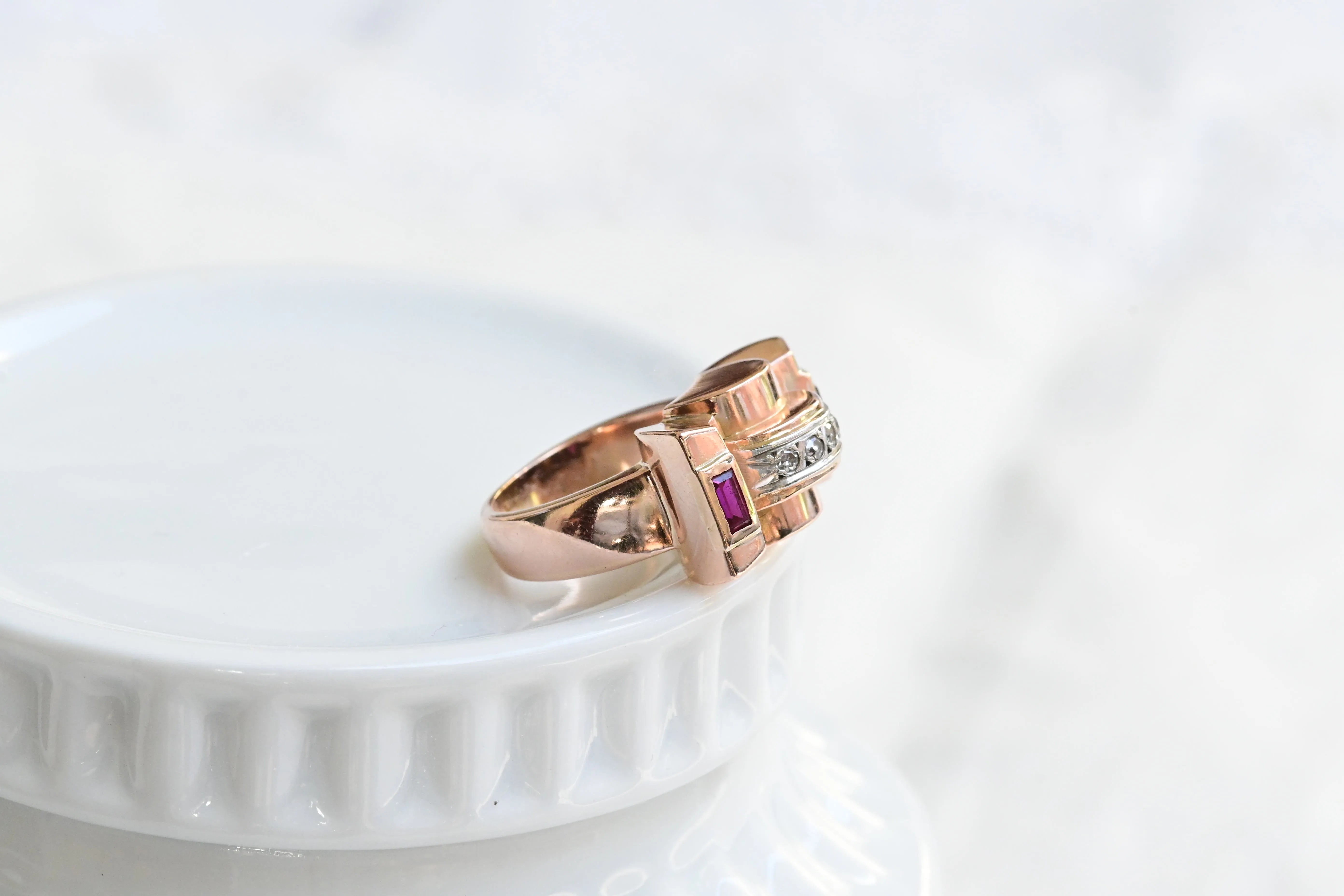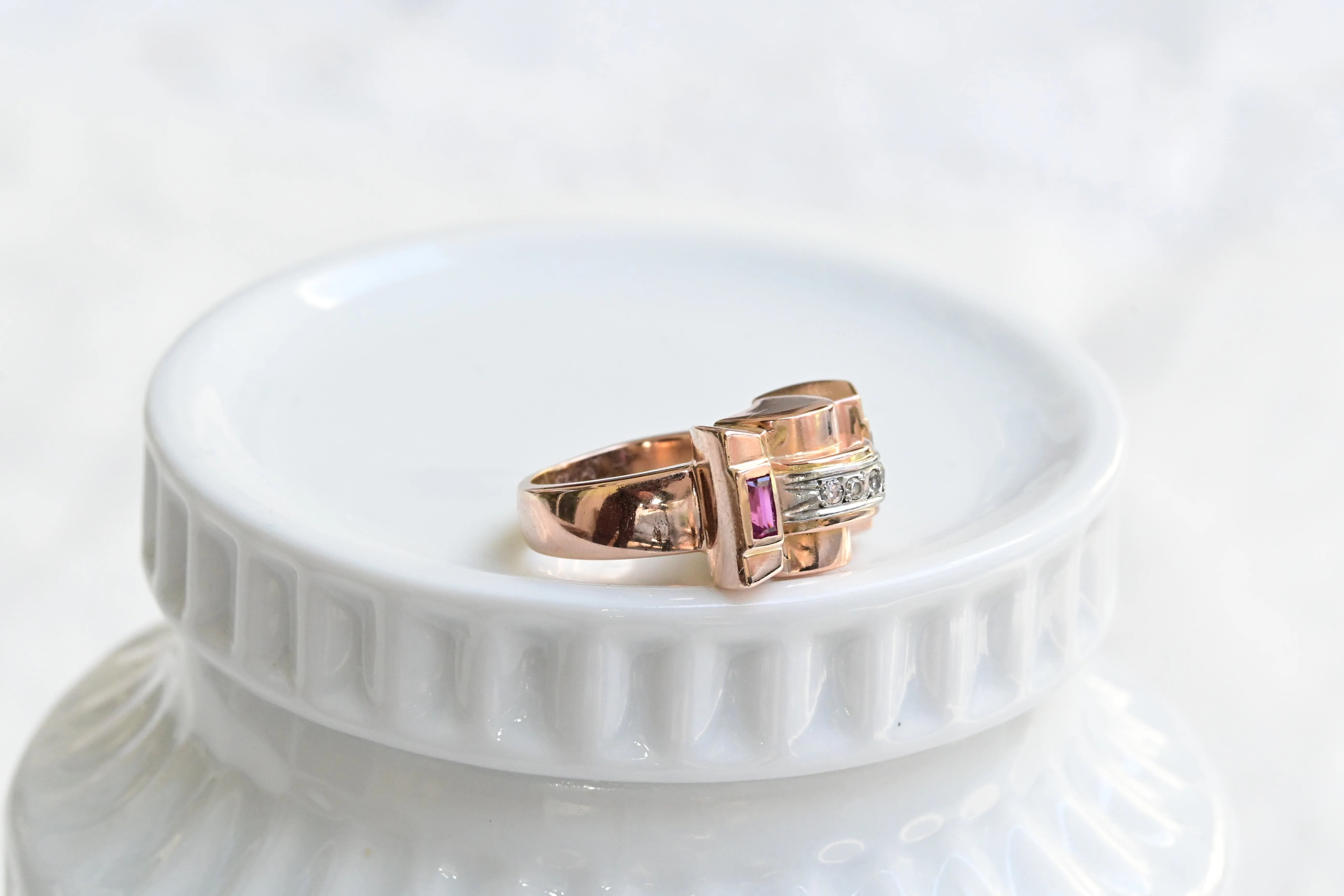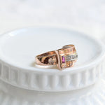 Vintage ring crafted in 14 K rose gold featuring five central round brilliant cut diamonds and two side baguette cut pink sapphires