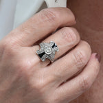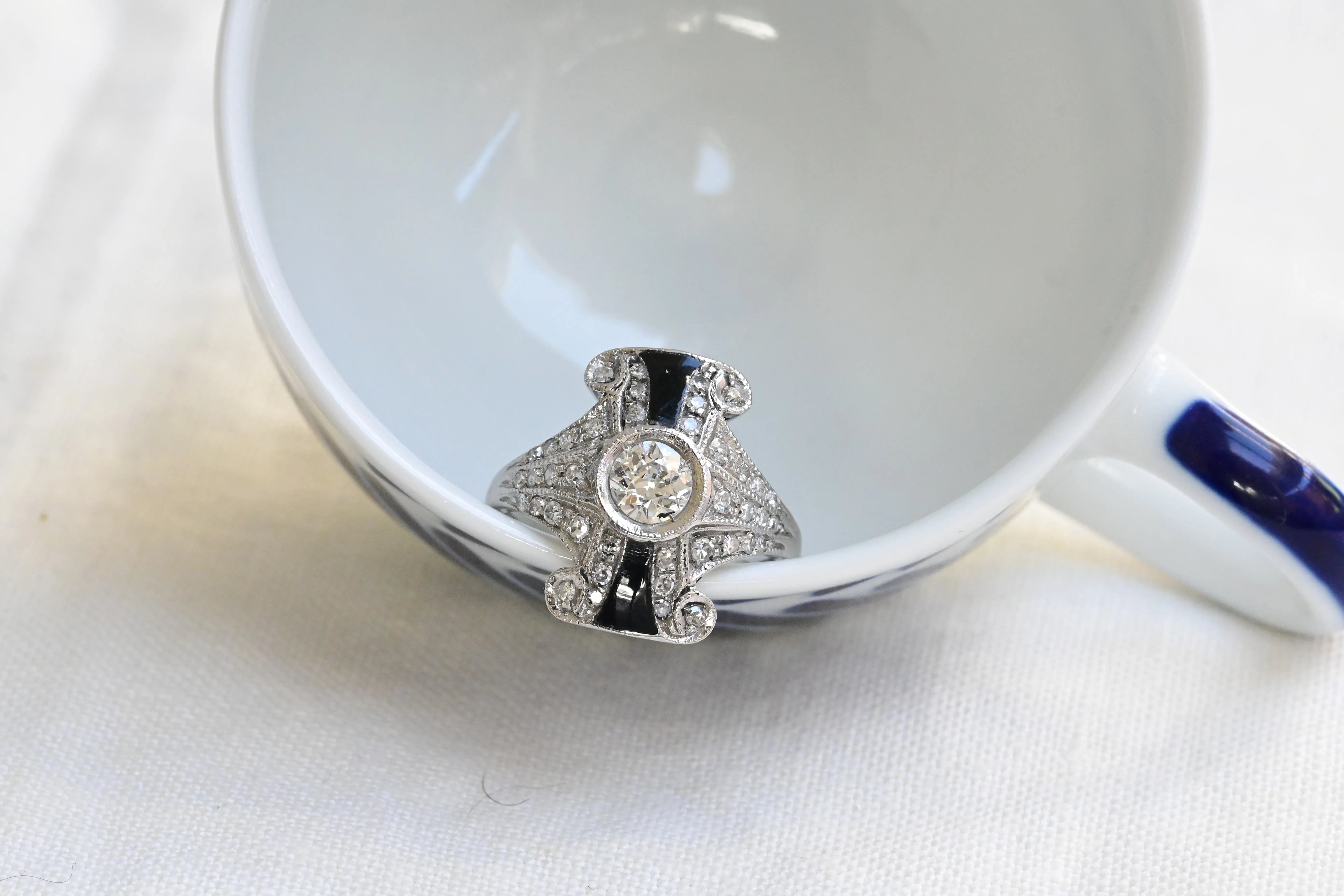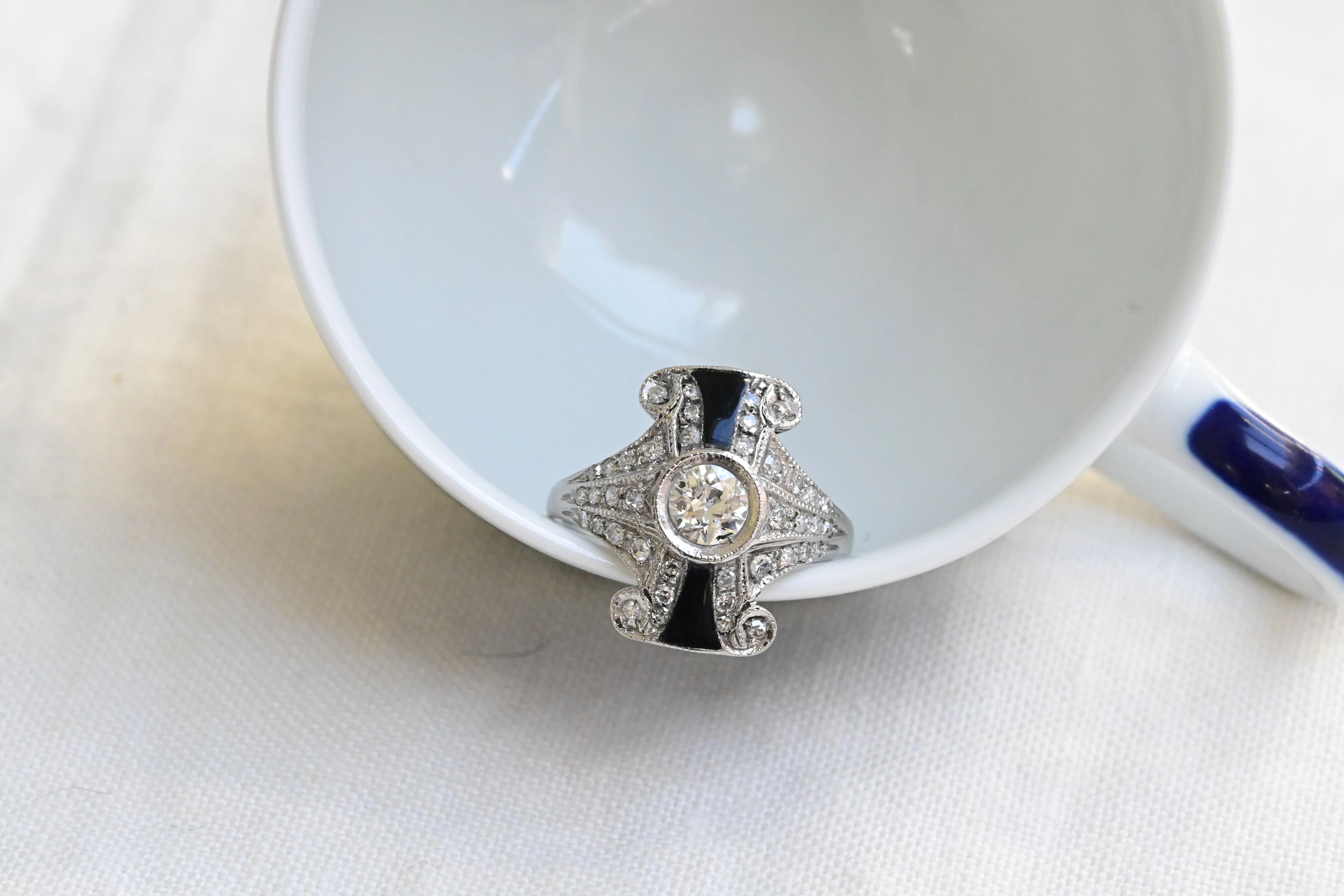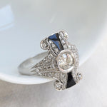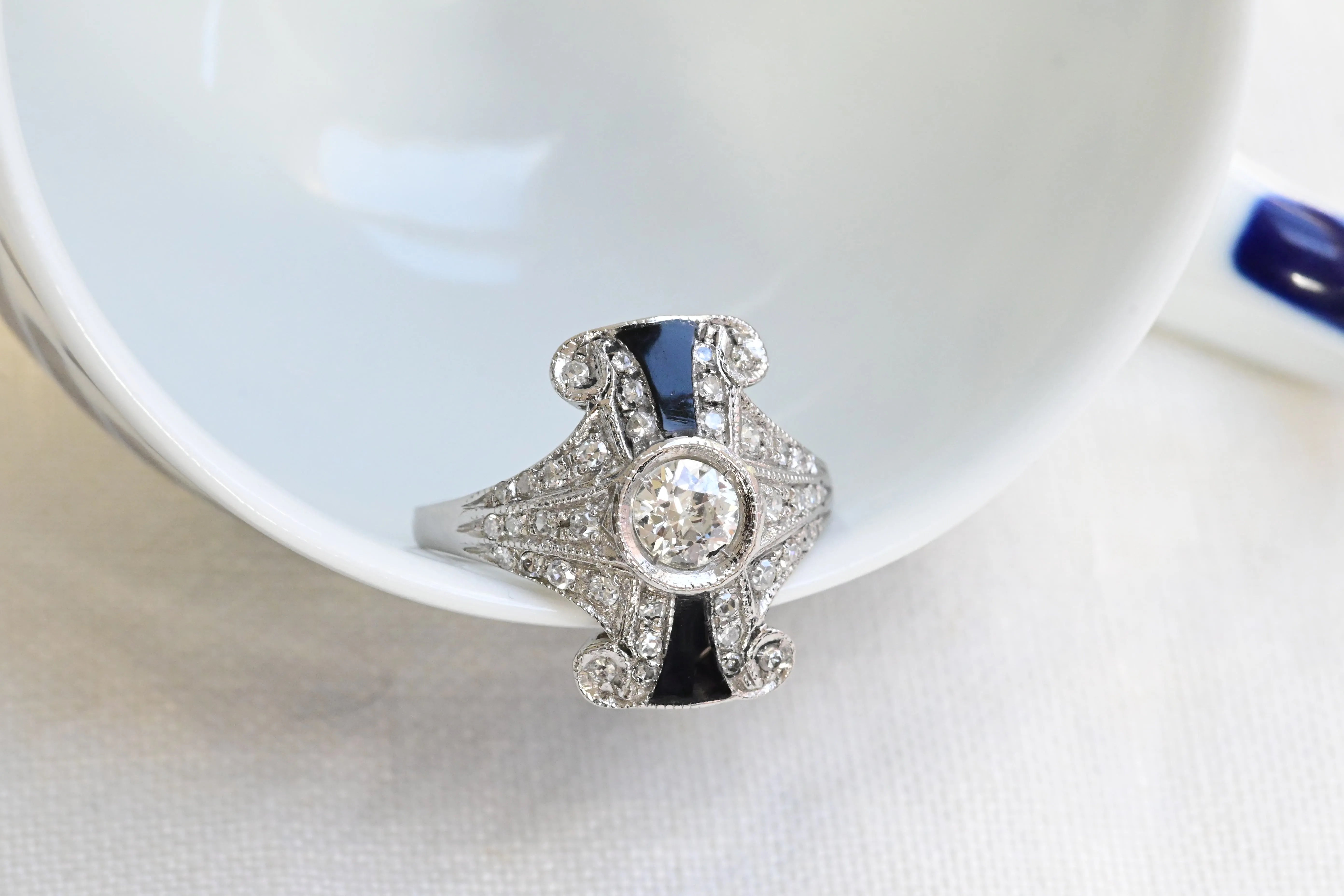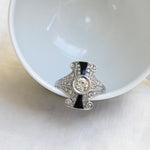 Vintage ring crafted in platinum, featuring a central old European cut diamond, framed by two onyx accents and enhanced by forty round brilliant cut diamondsset to highlight its elegant geometric style