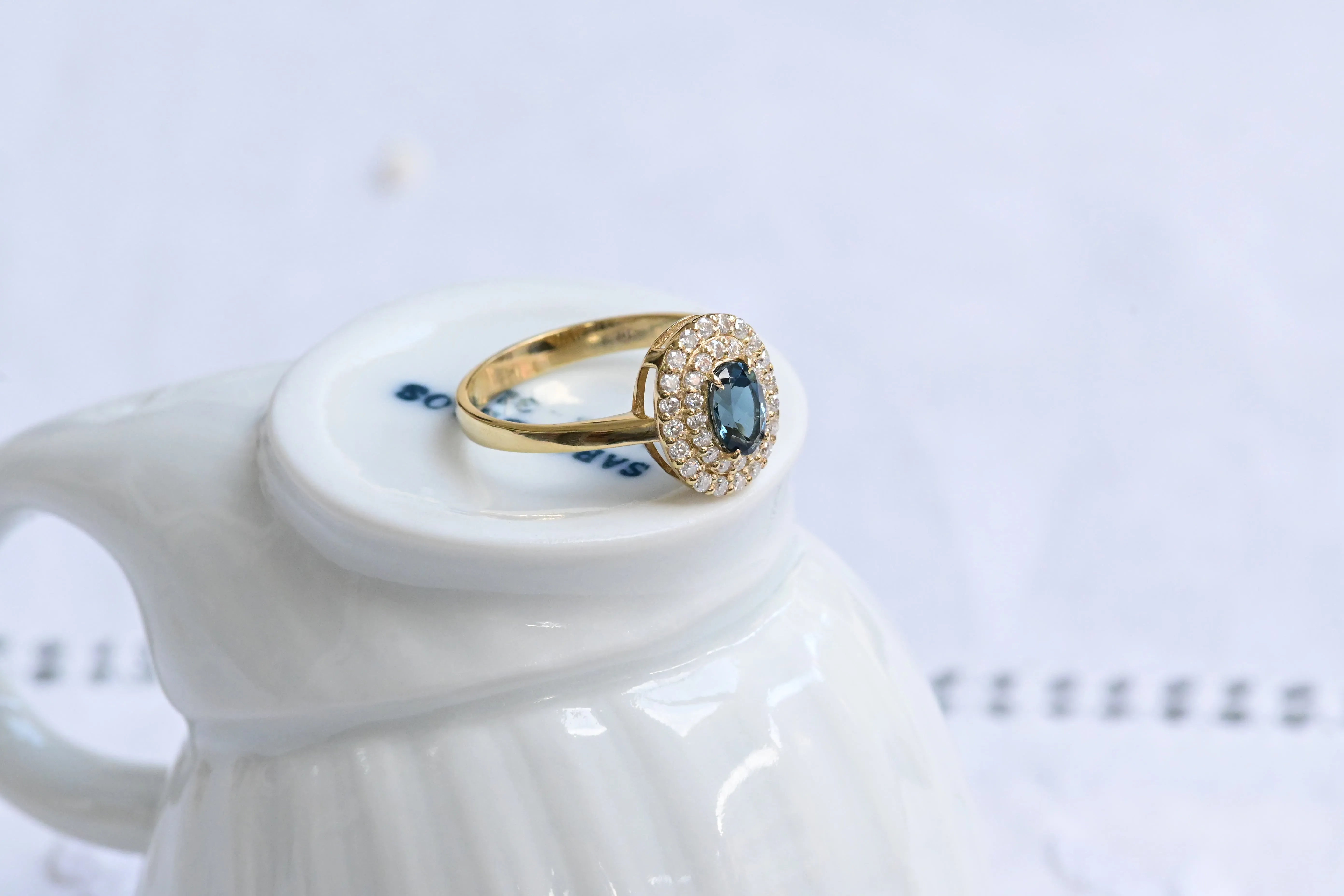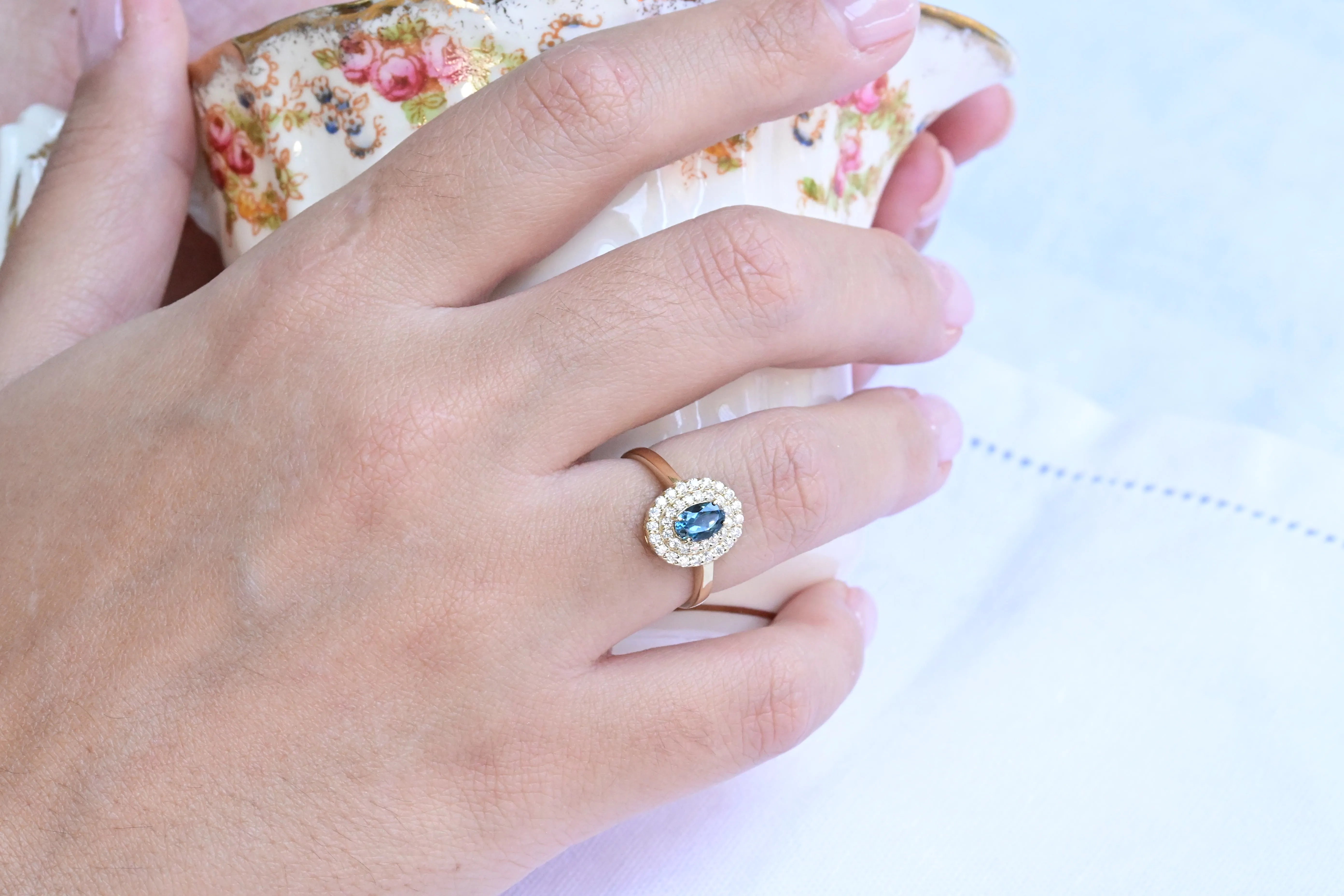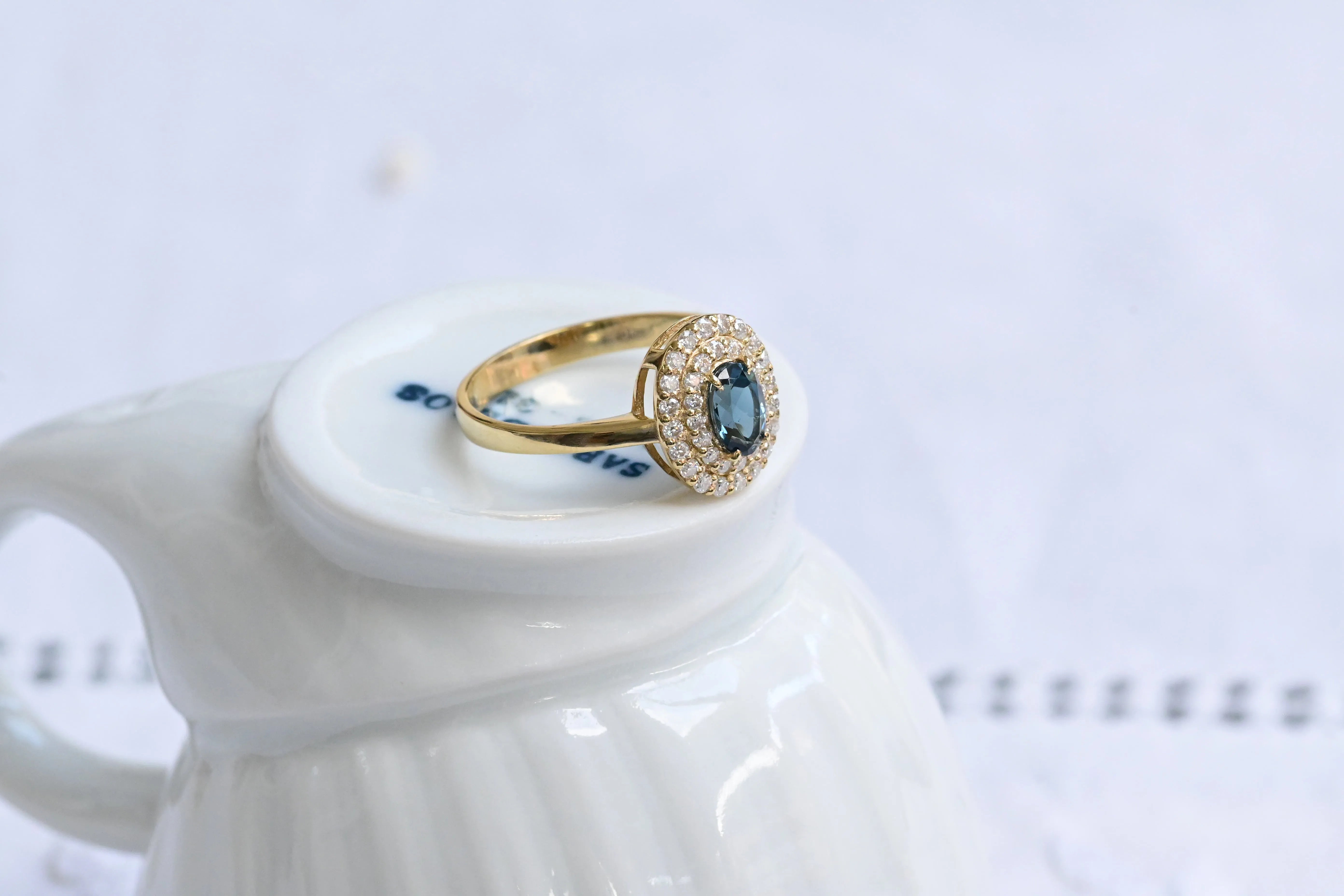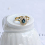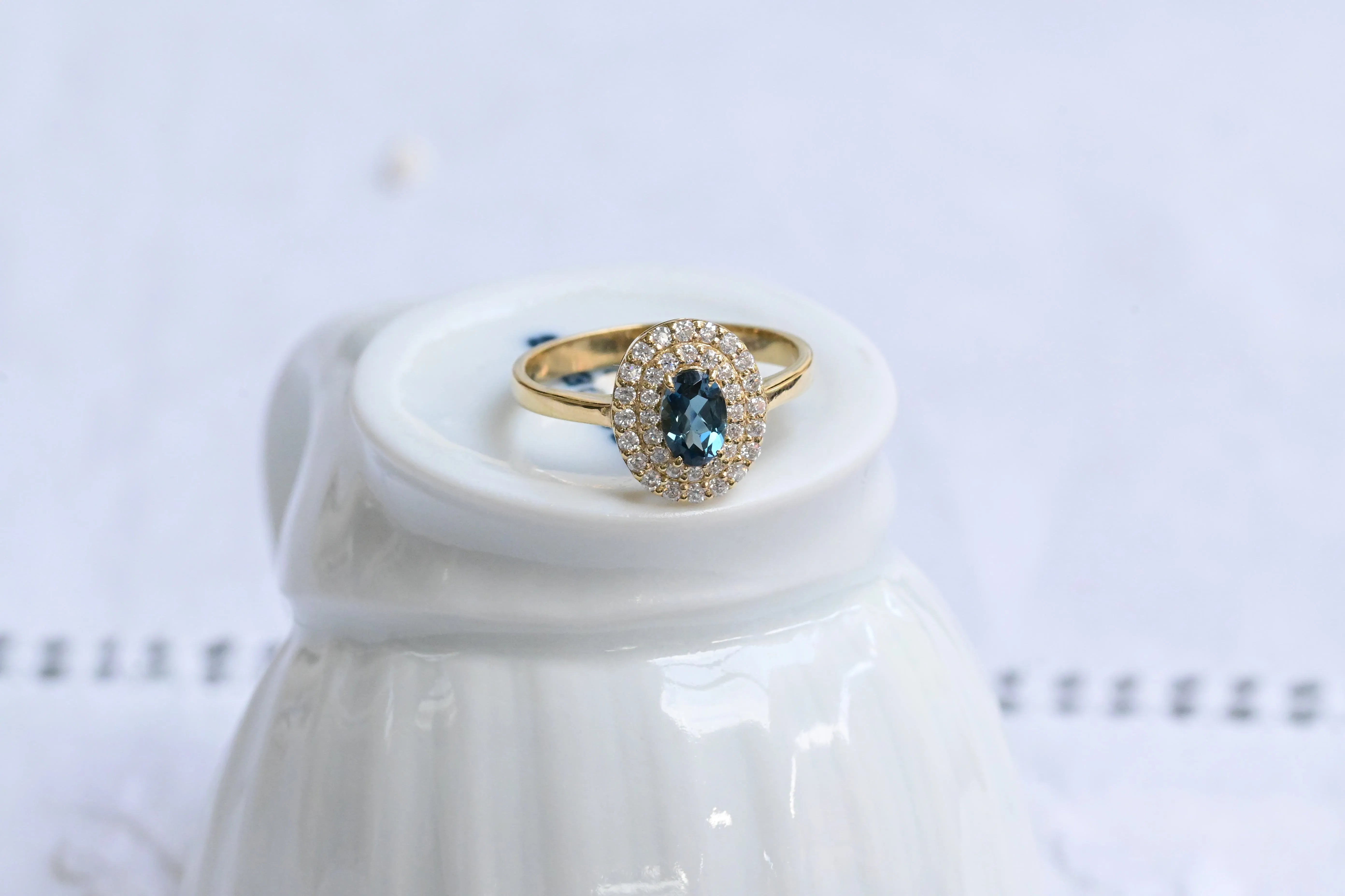 Vintage ring, crafted in 14 K yellow gold with a central oval cut blue topaz and surrounded by two halos with a total of thirty six round brilliant cut diamonds