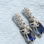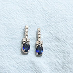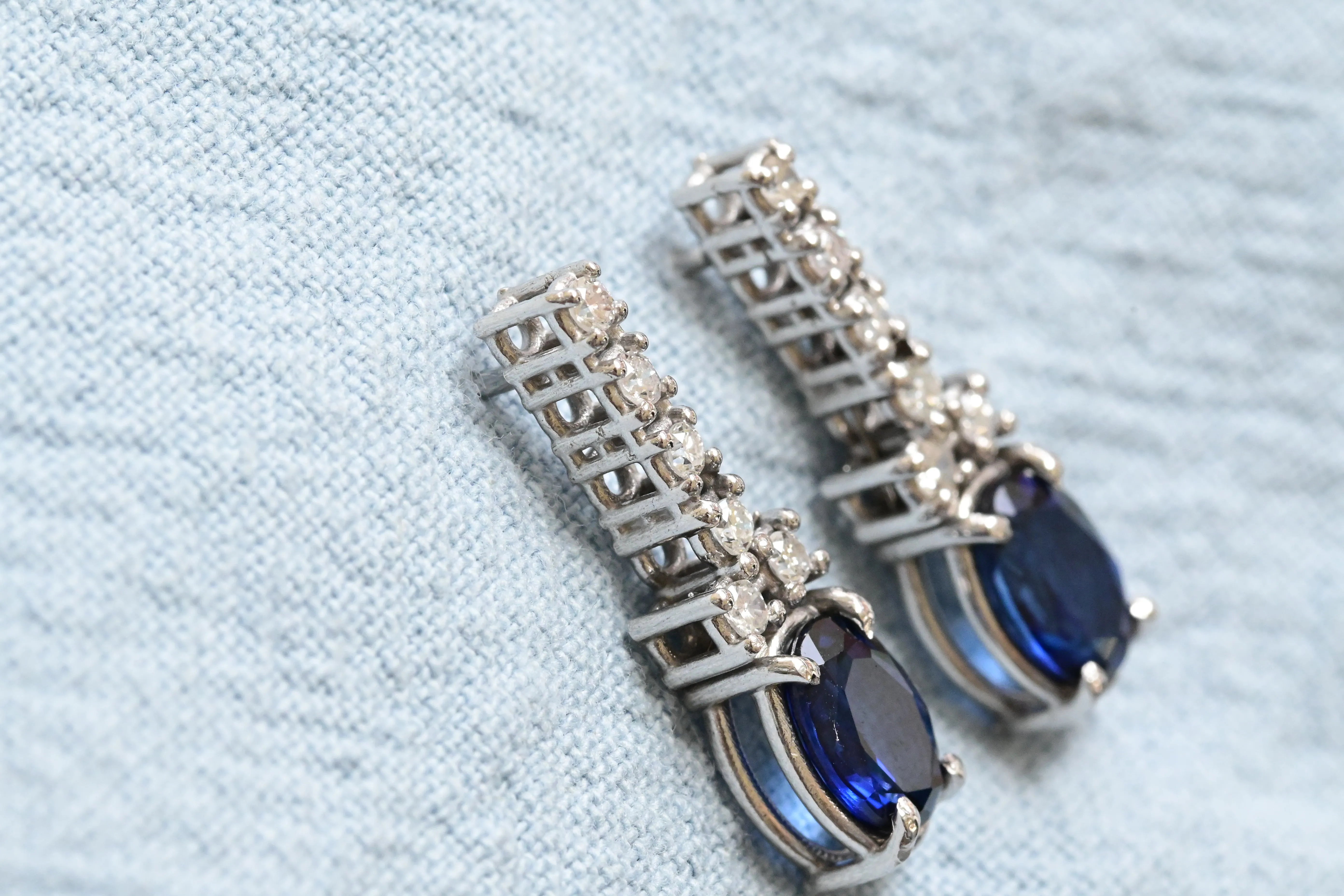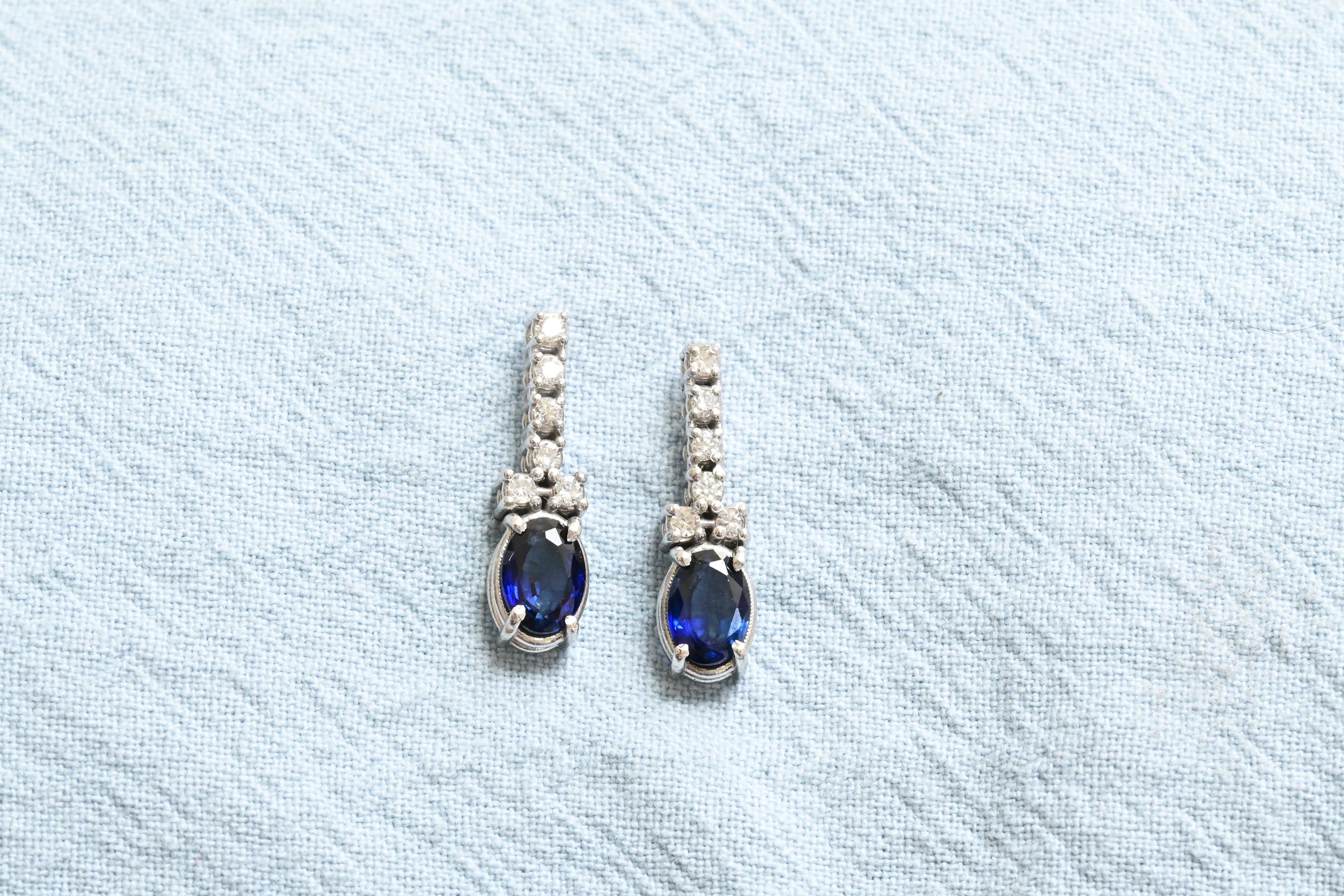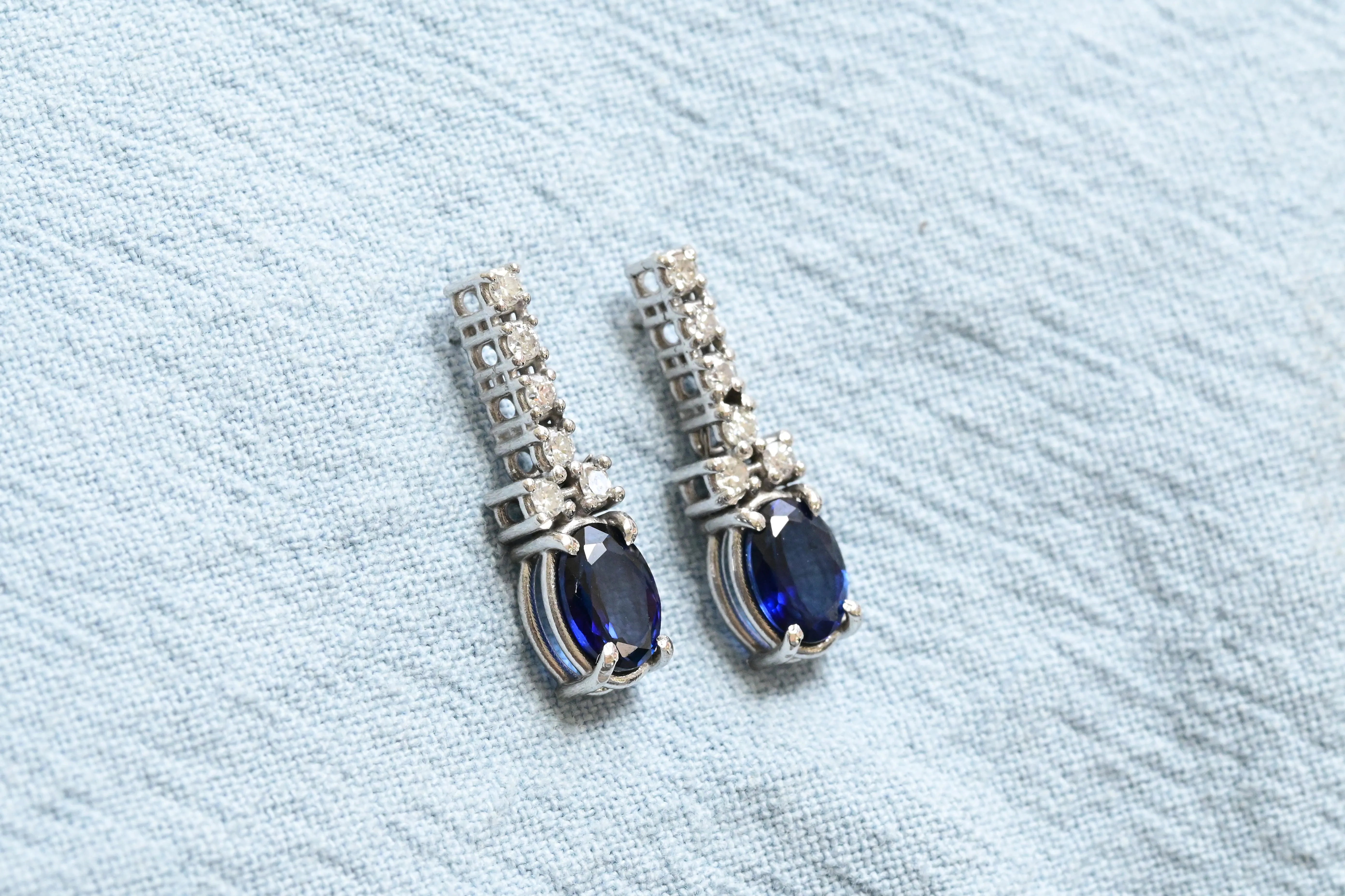 Boucles d'oreilles vintage, en or blanc 14 carats avec un saphir taille ovale central et 12 diamants taille brillant ronds.
