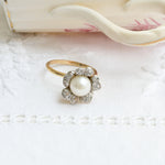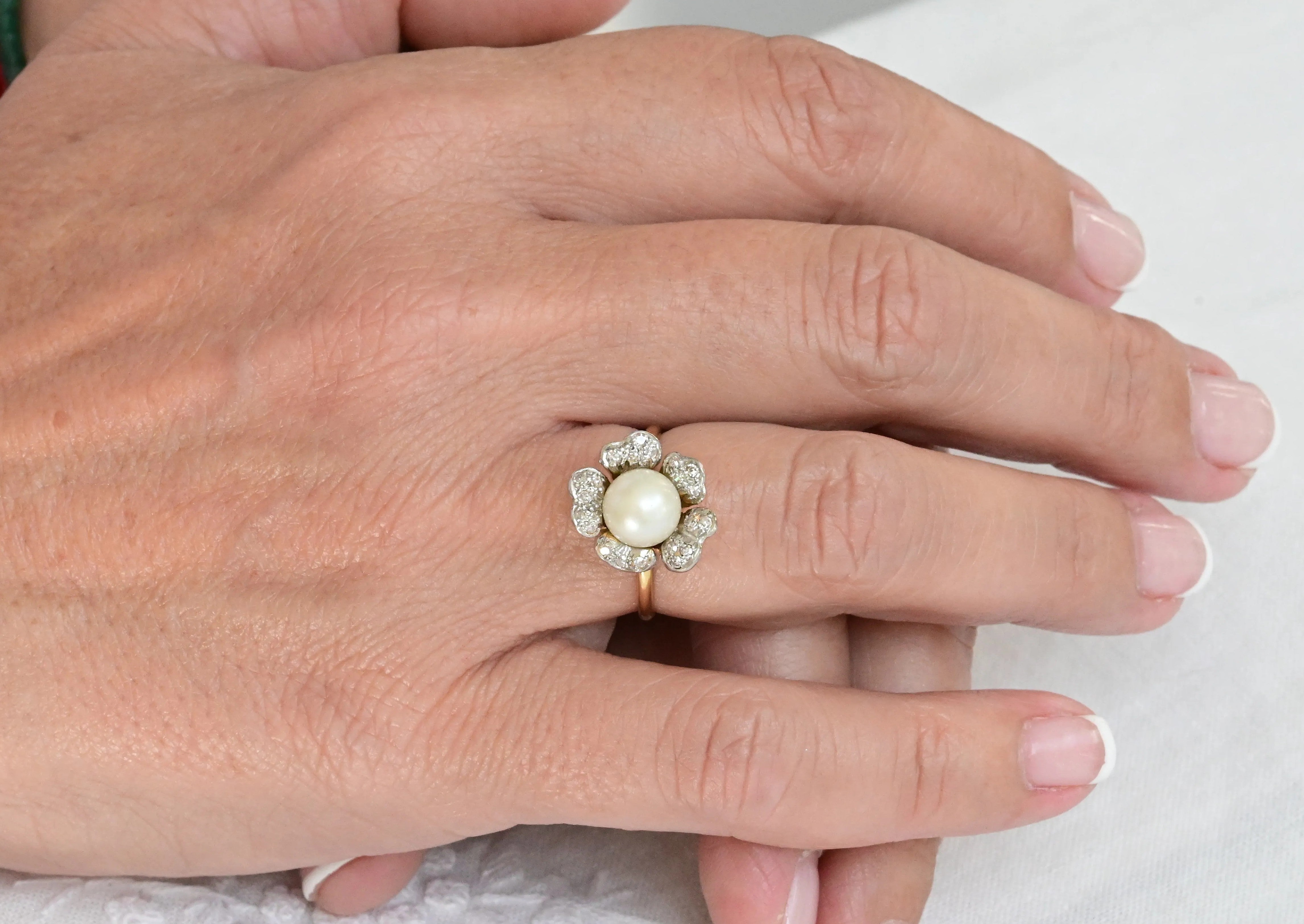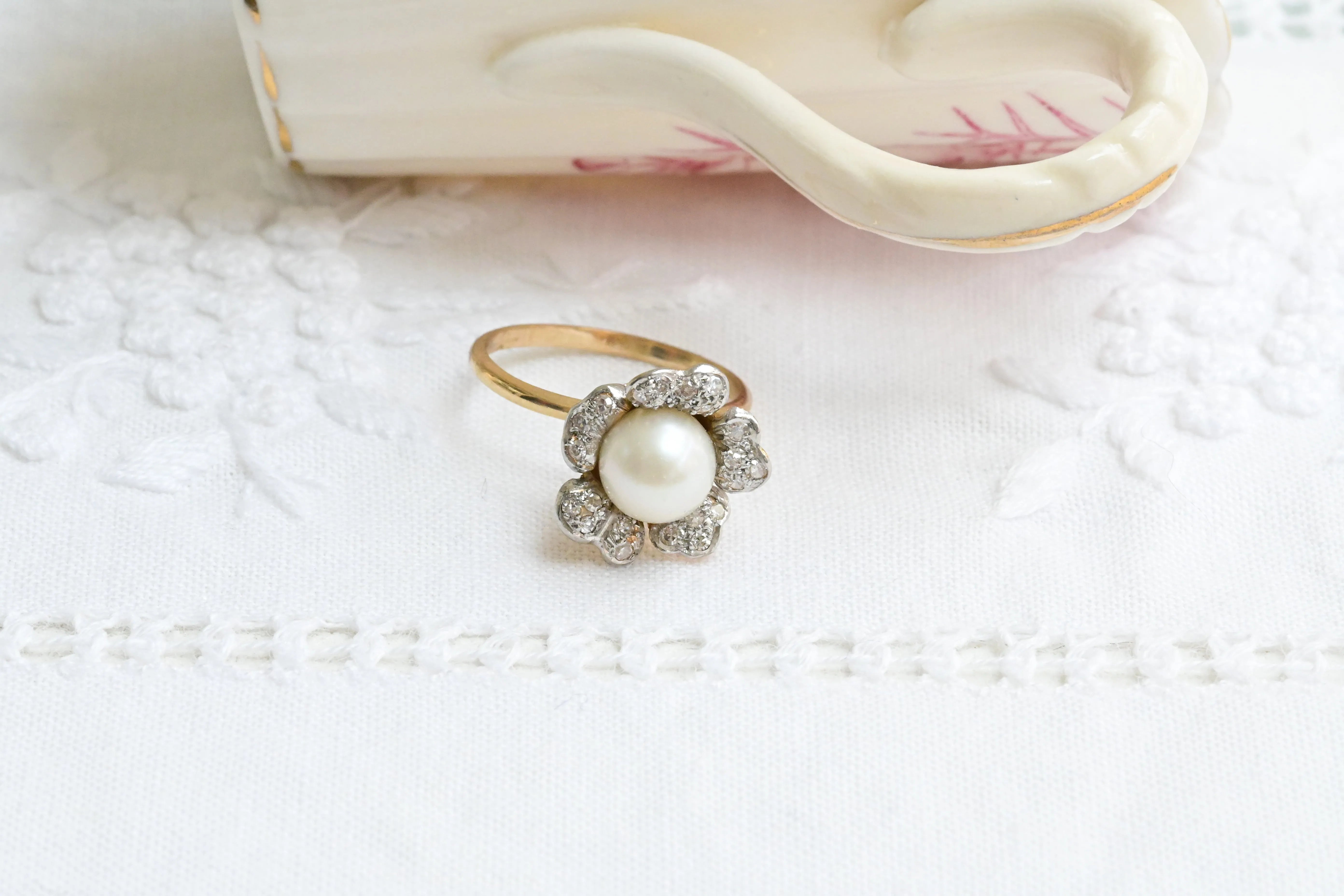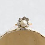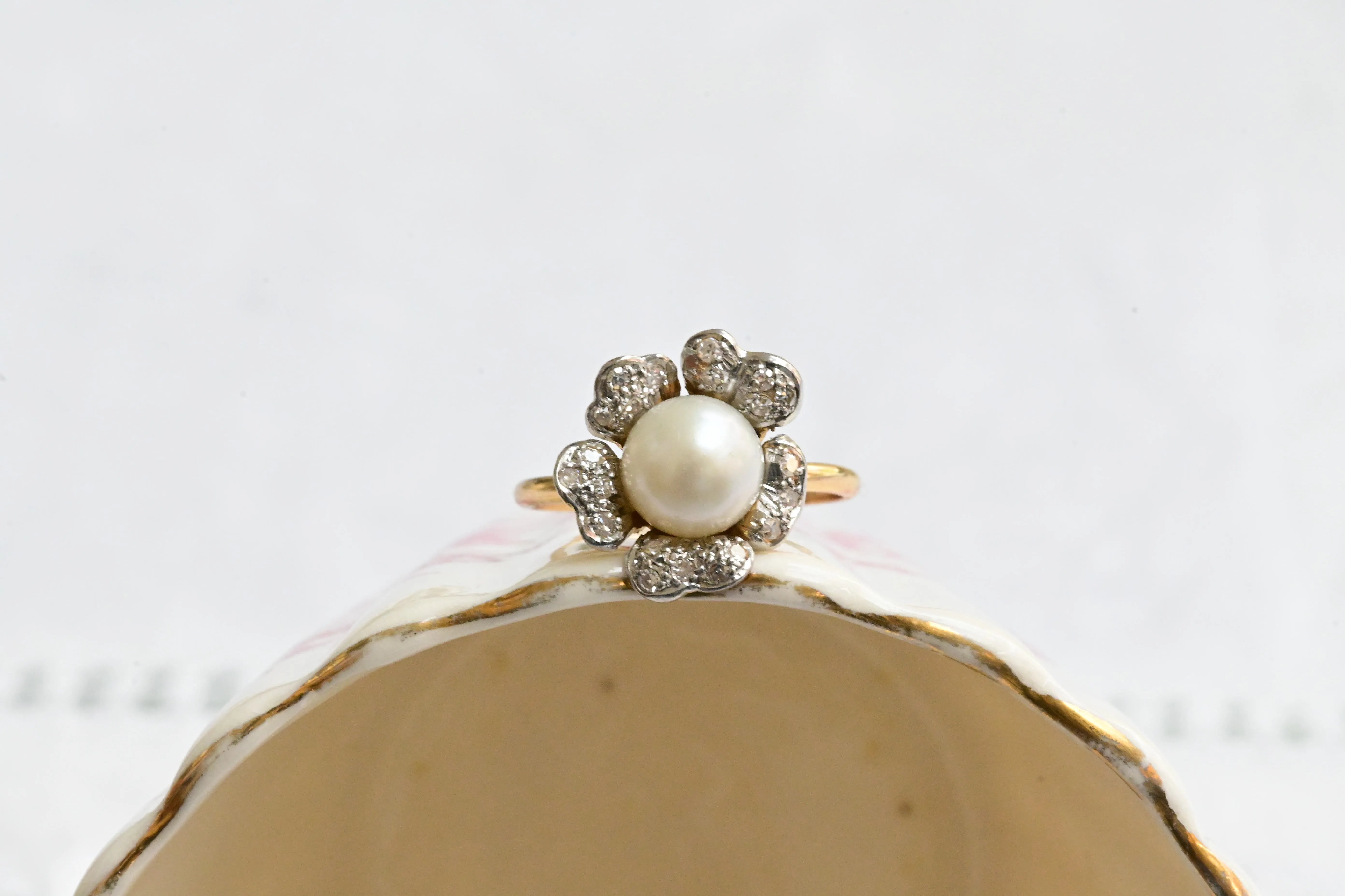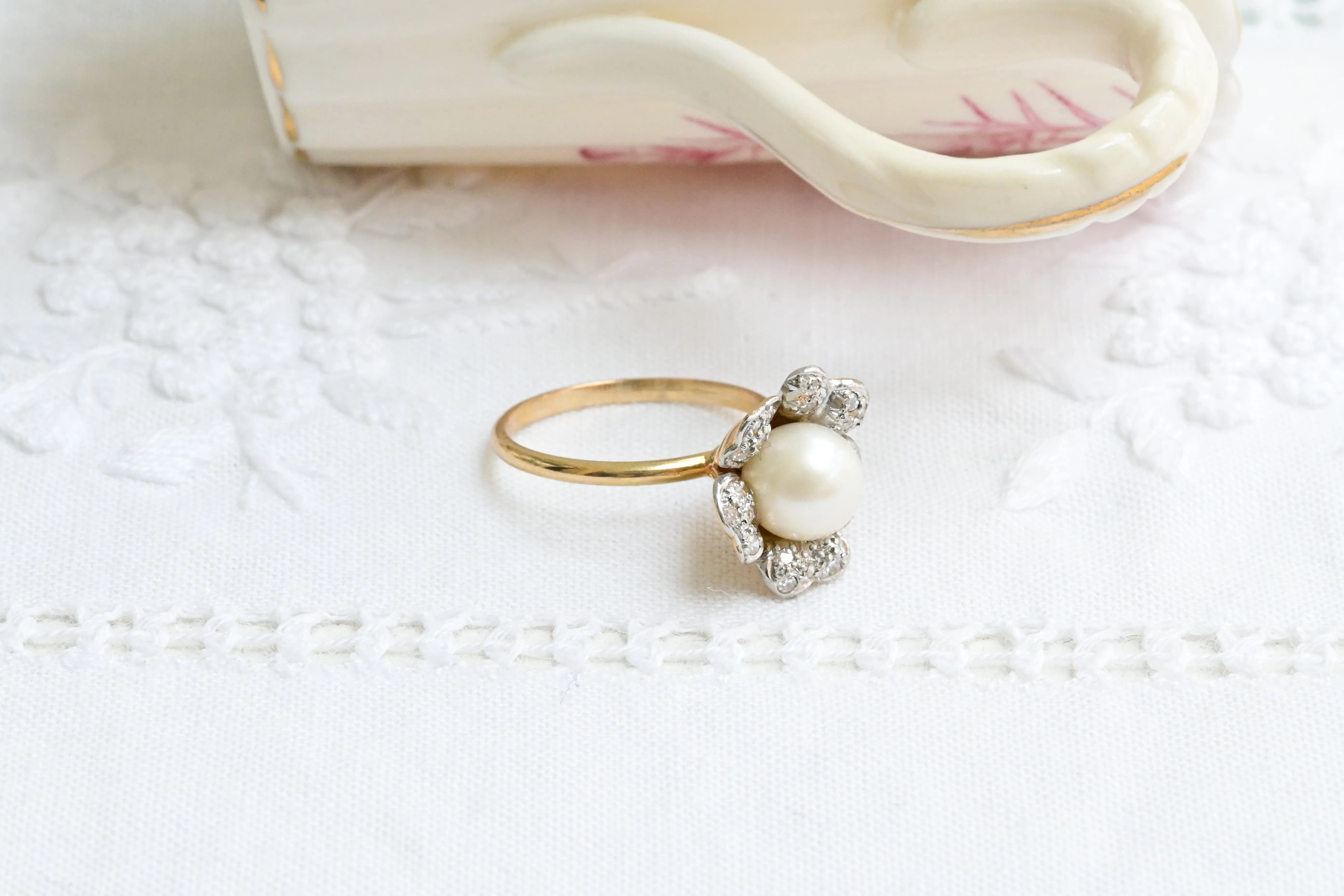 Antique ring from the beginning of the 20th century, crafted in 18 K yellow with a central saltwater pearl and five petals featuring 25 single brilliant cut diamonds.