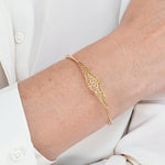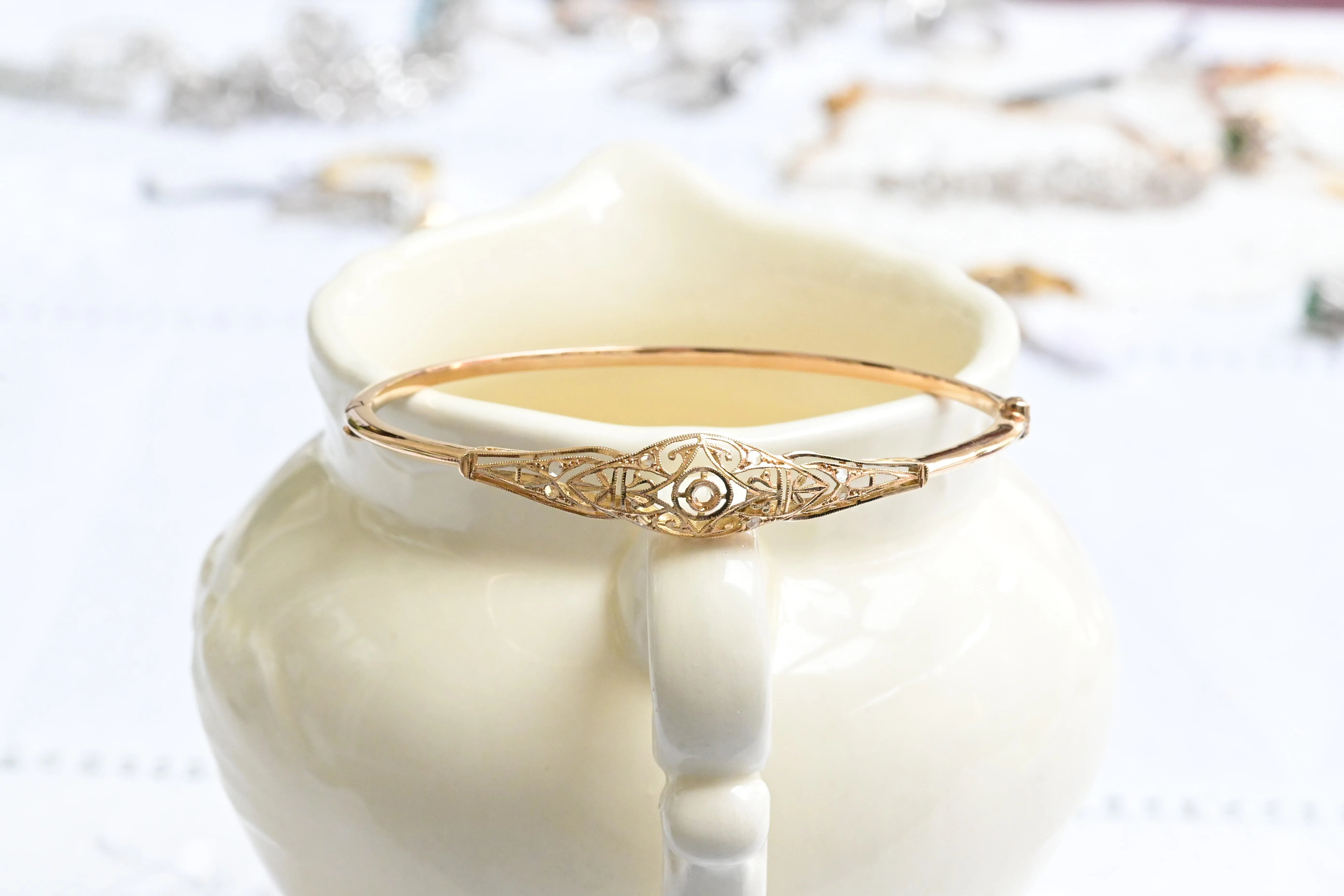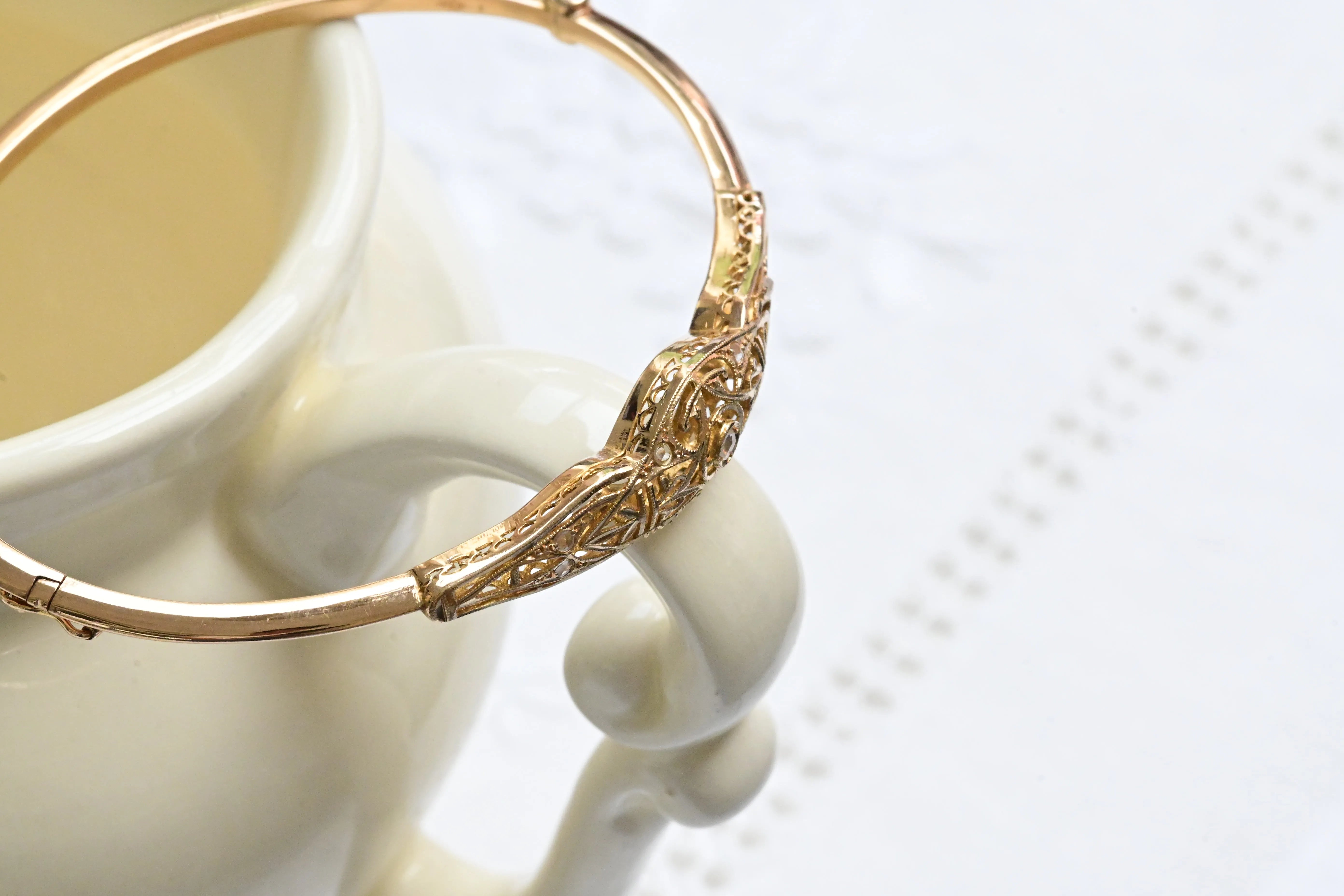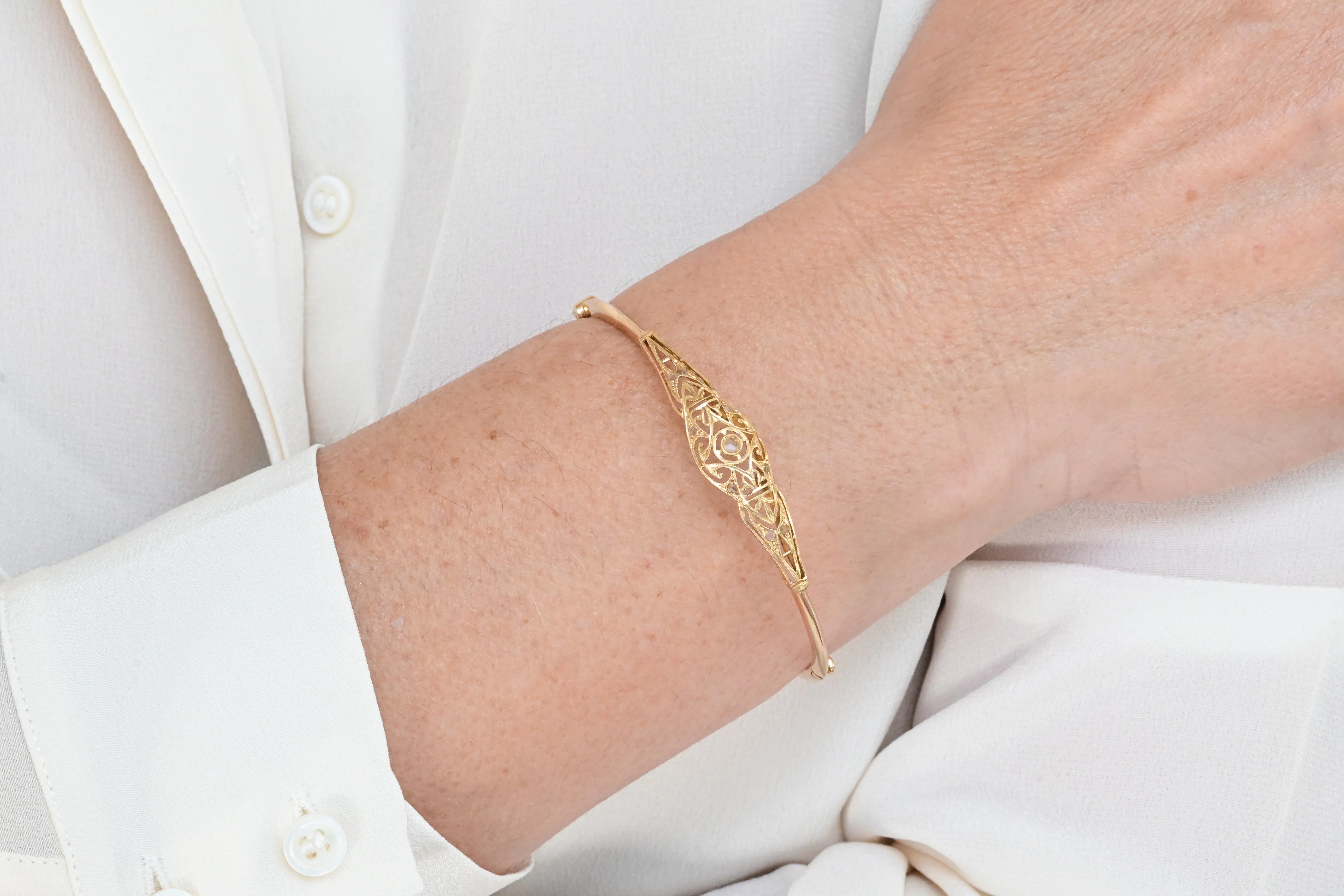 Art deco bangle bracelet, from the early 20th century in 18 K yellow gold featuring a geometric design typical from the era with nine rose cut sapphires.