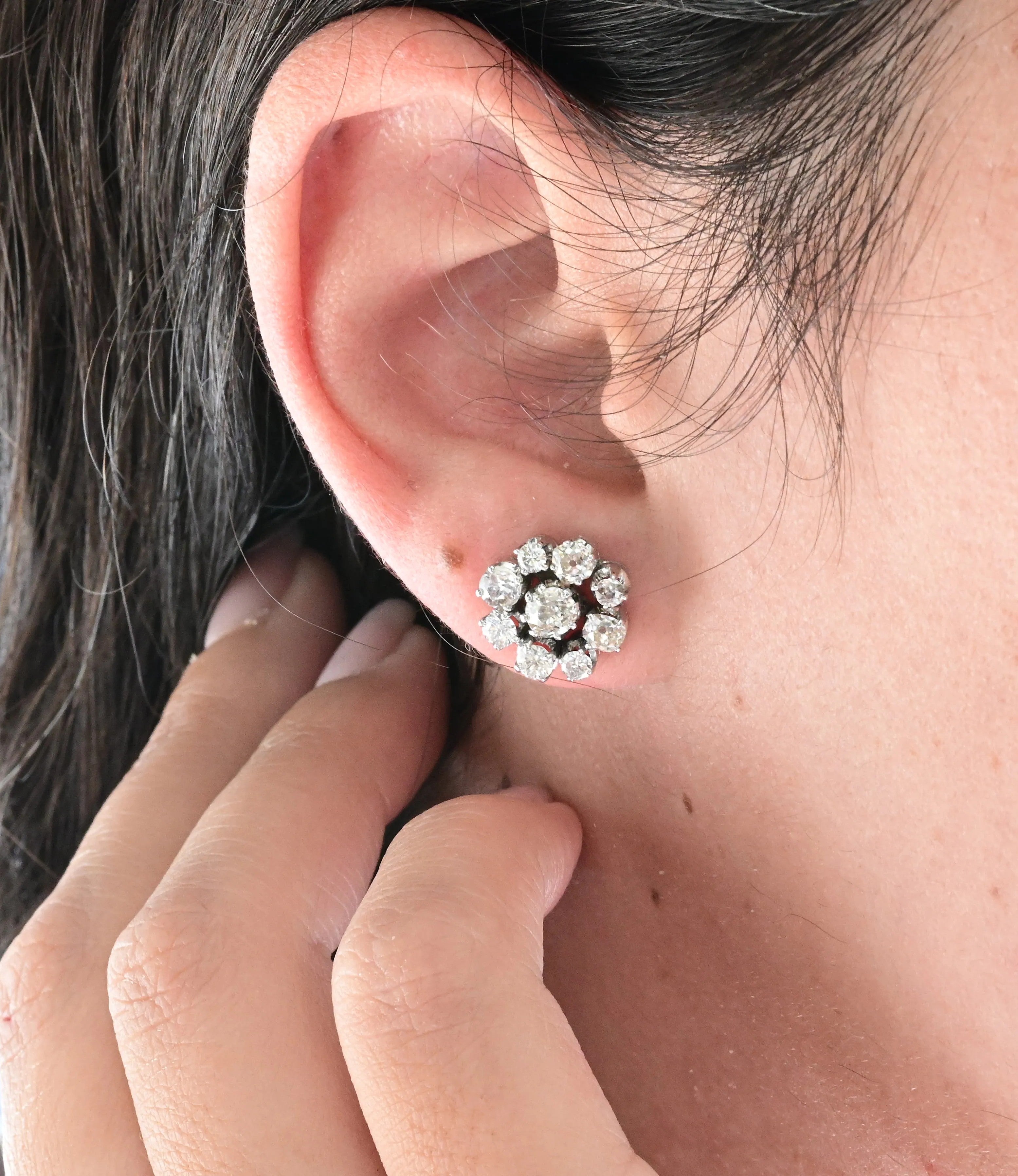 Gemstones: 2 central old european cut diamonds surrounded by 16 old european cut earrings.