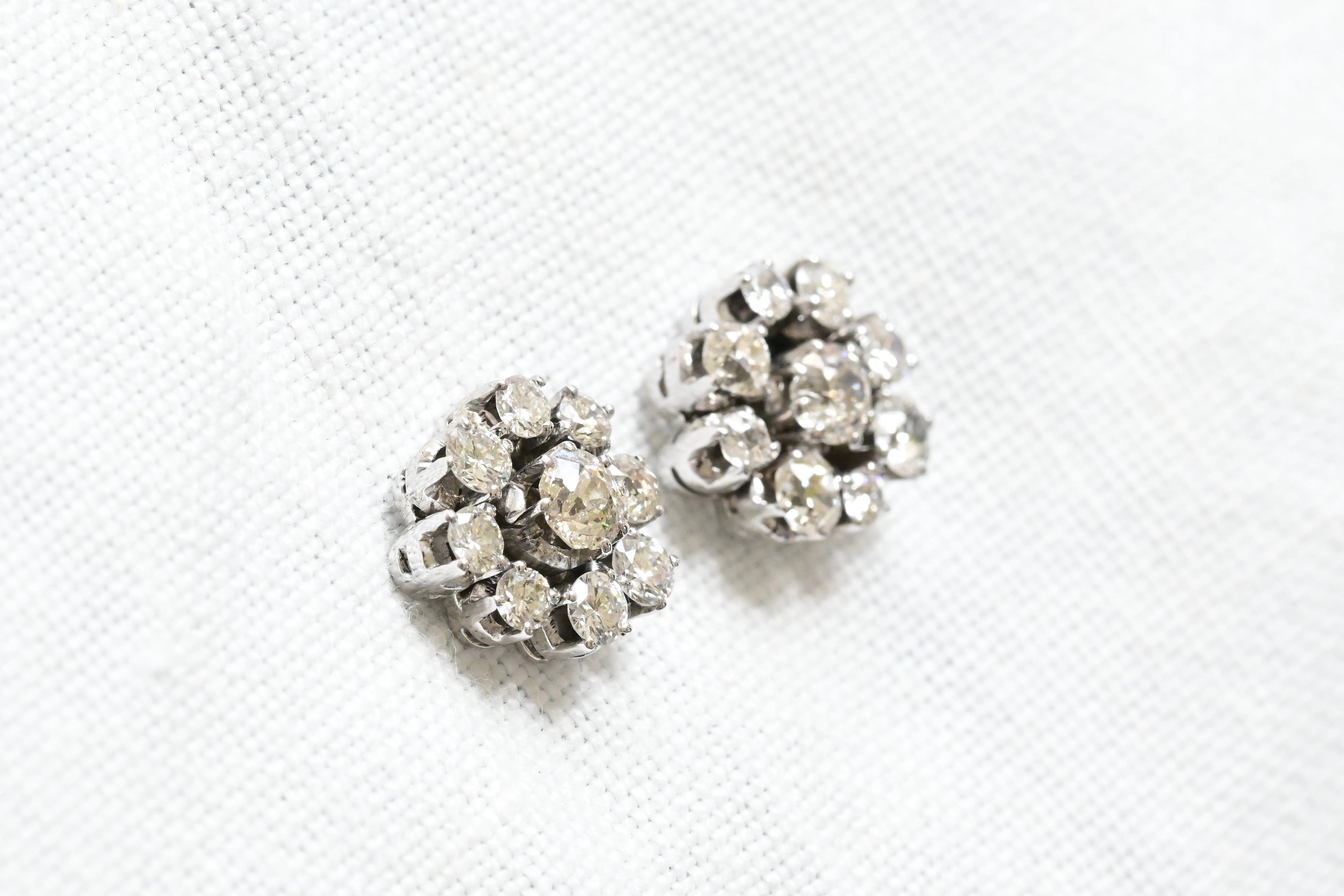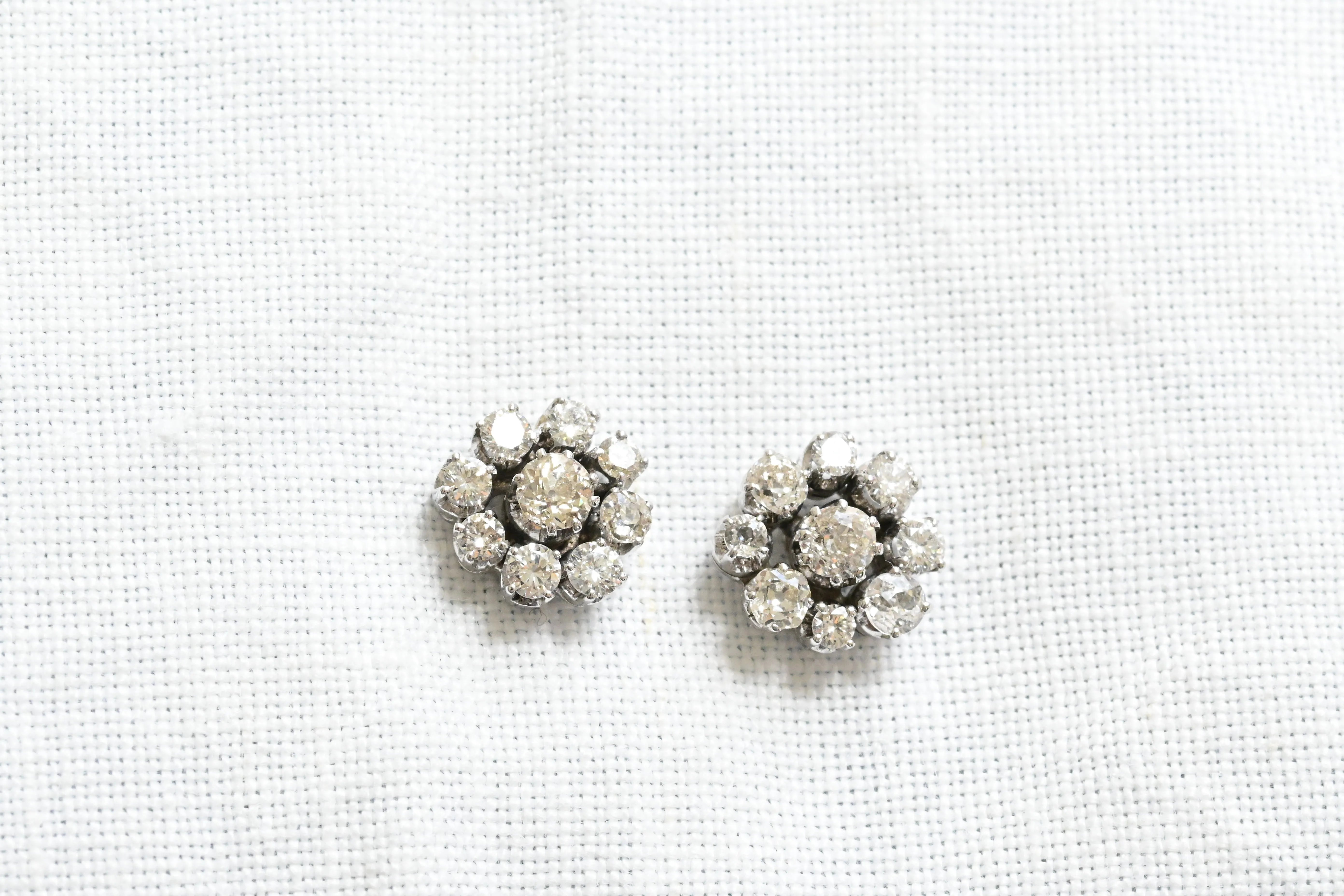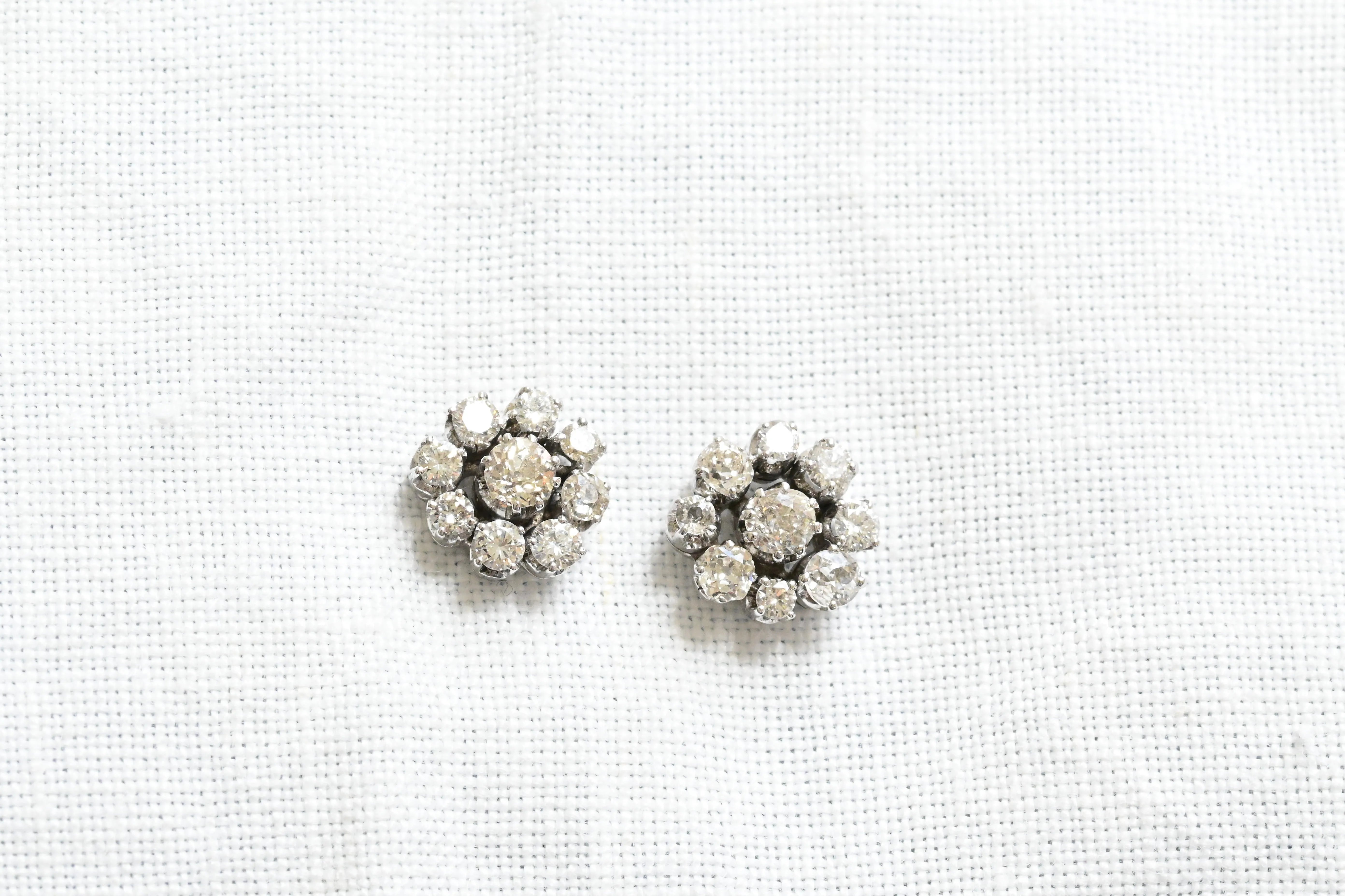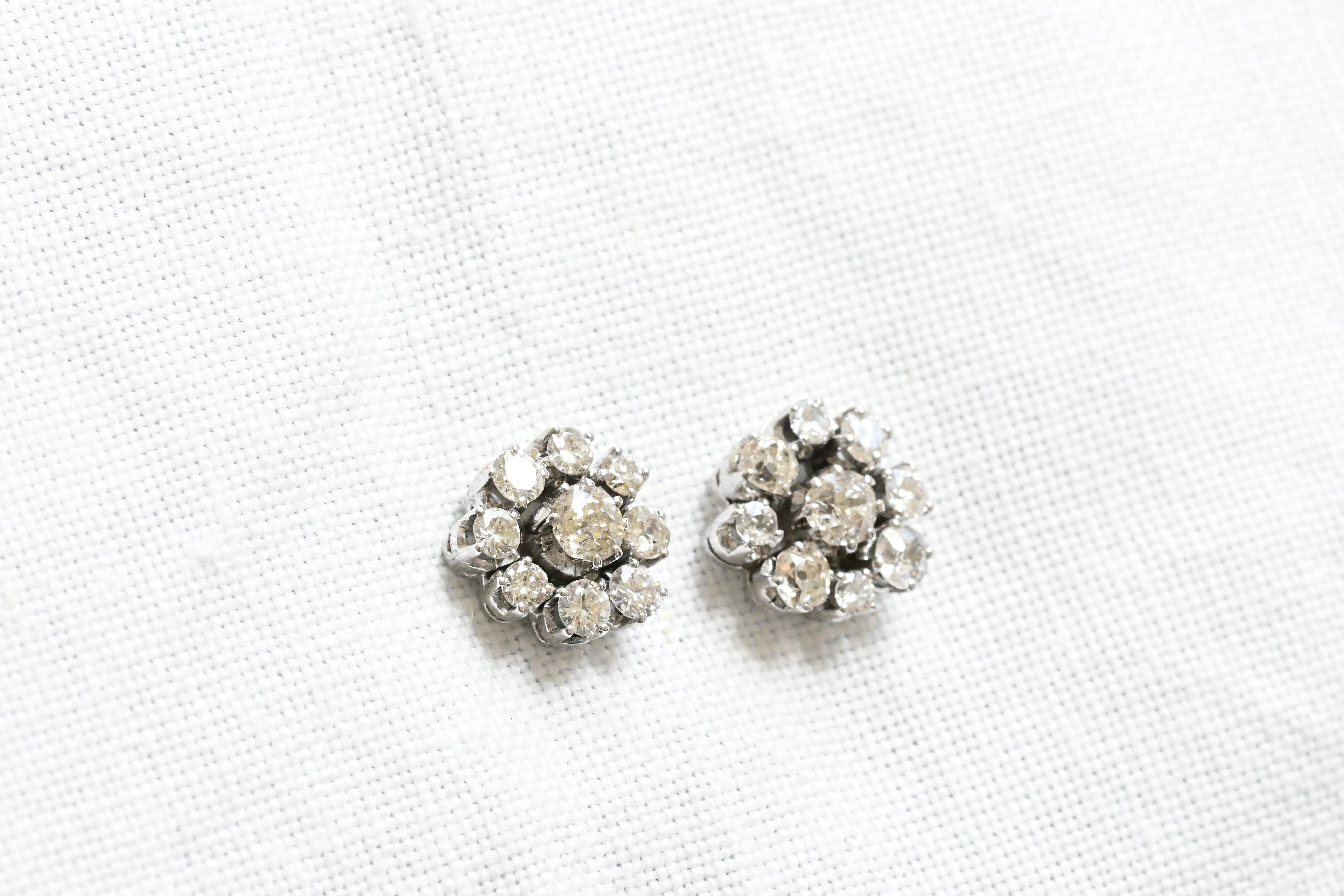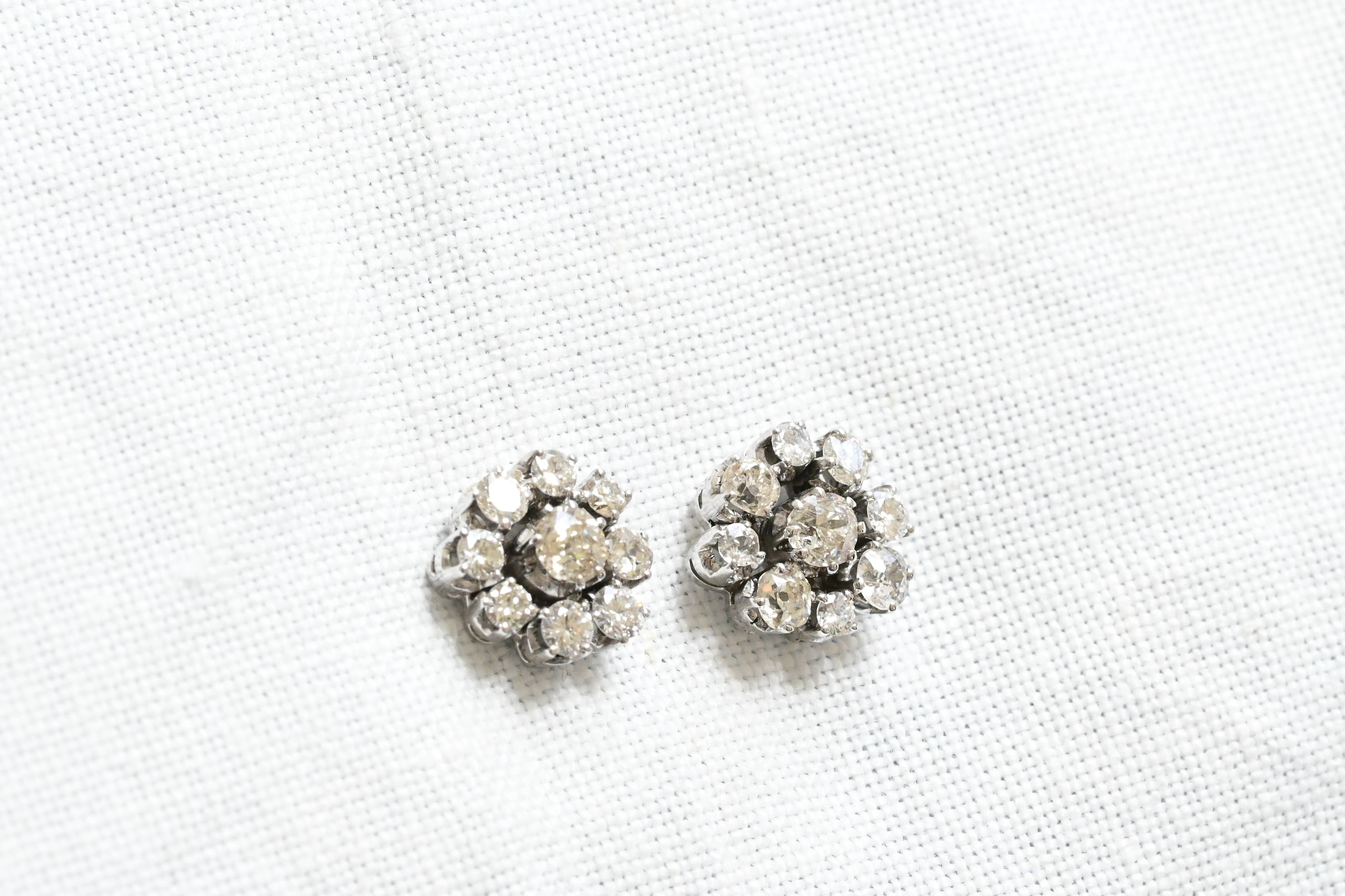 Art Deco earrings from the first third of the 20th century, crafted in 18K white gold, featuring a central old European cut diamond surrounded by a halo of eight old European cut diamonds, forming a daisy motif