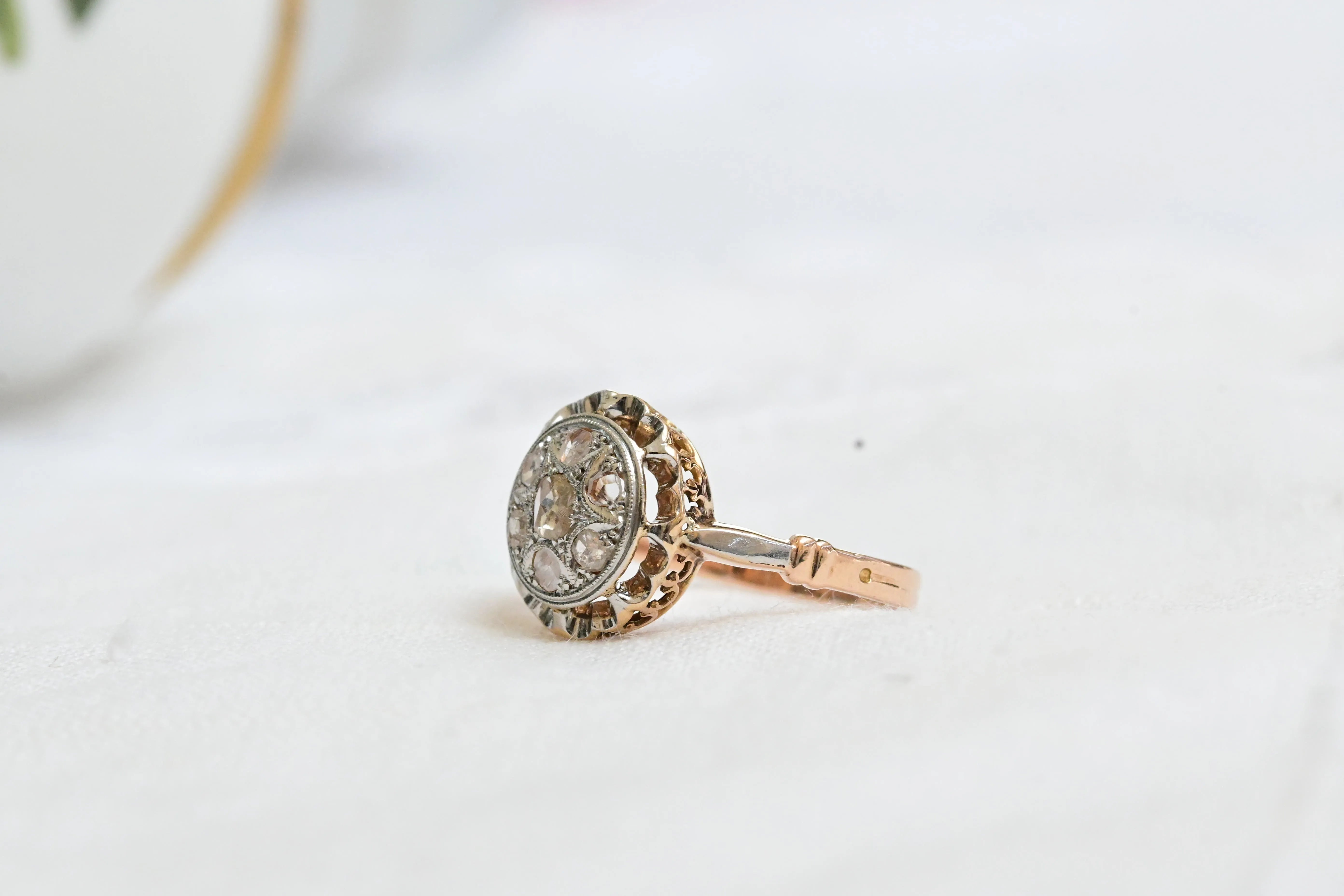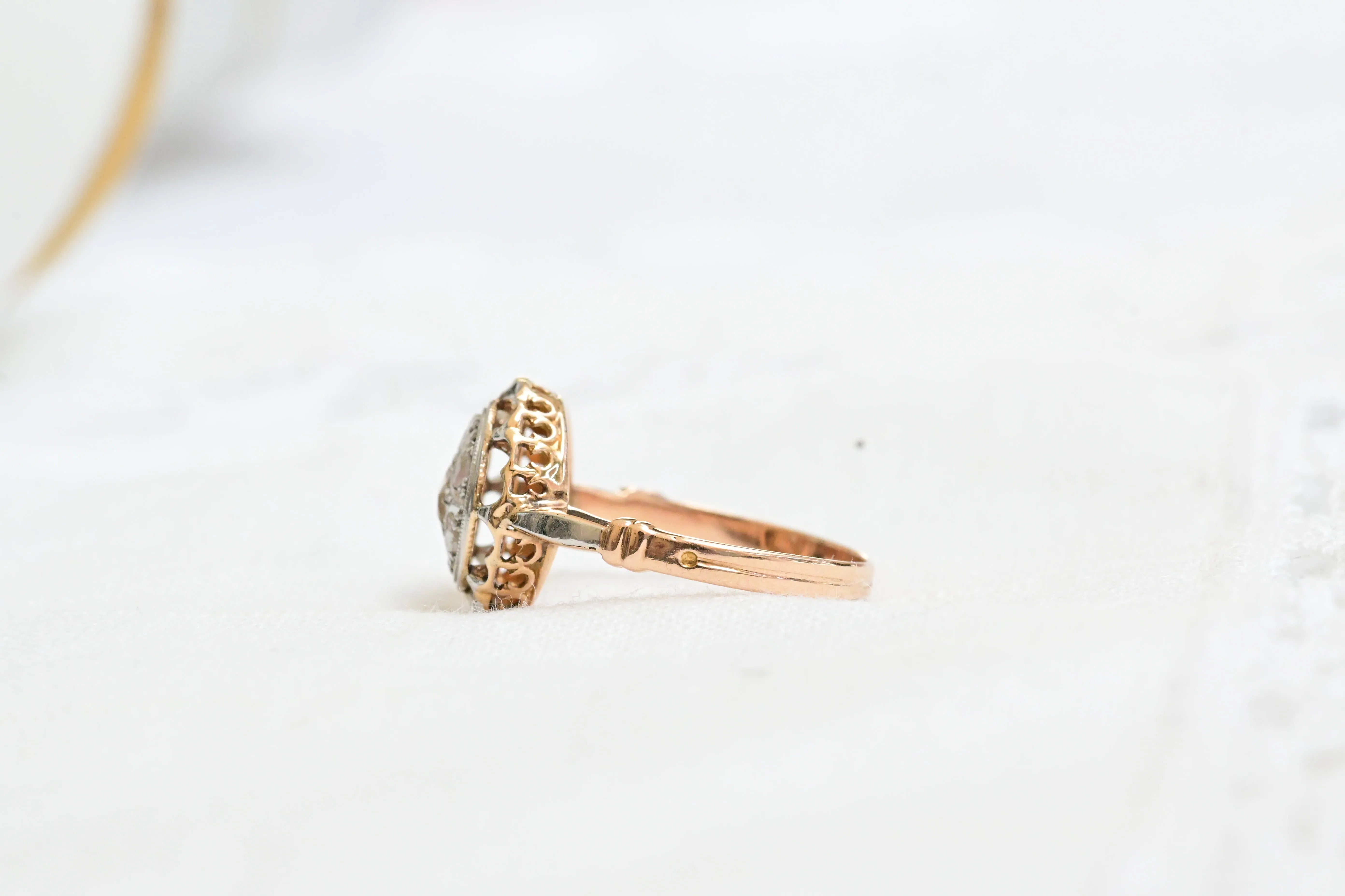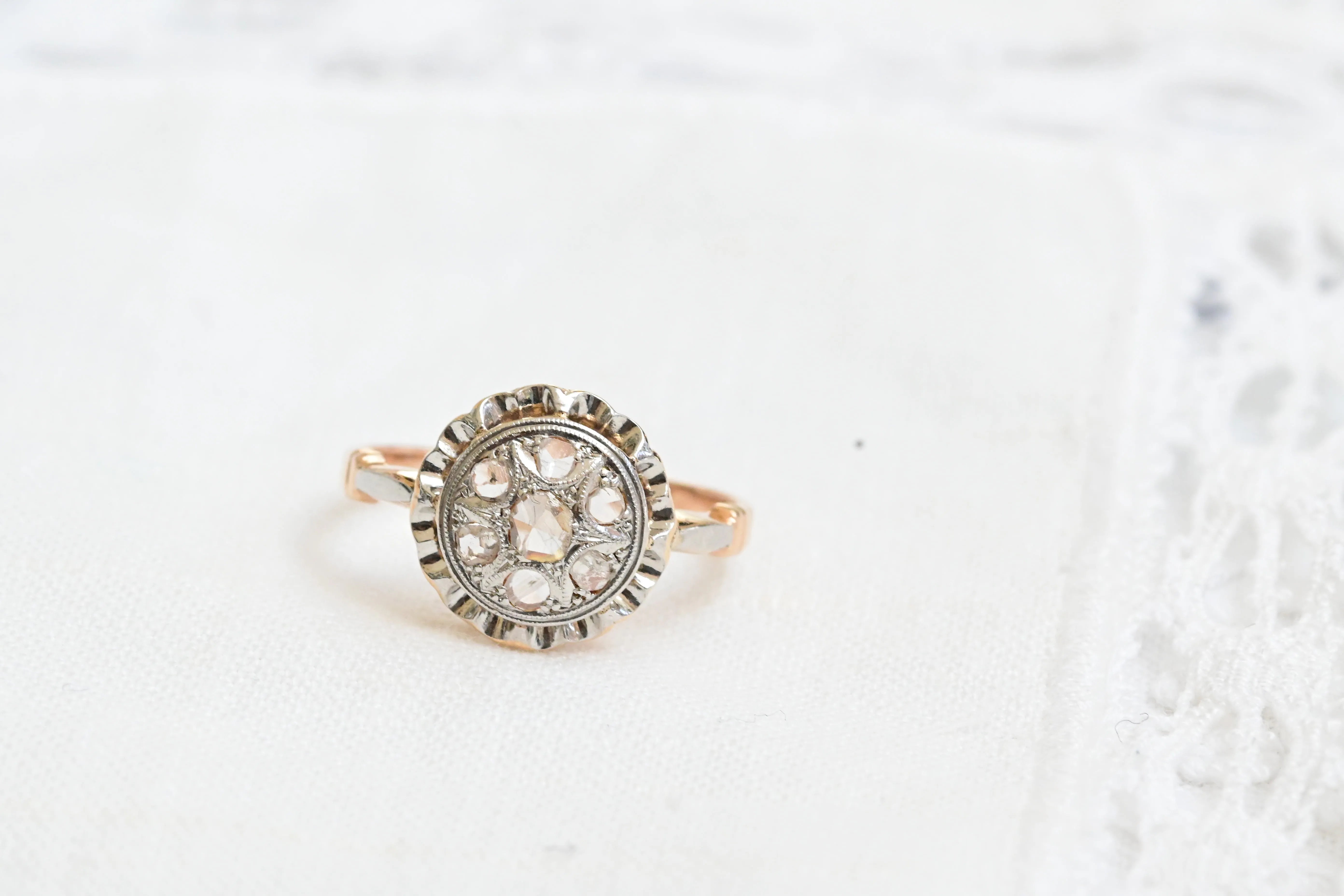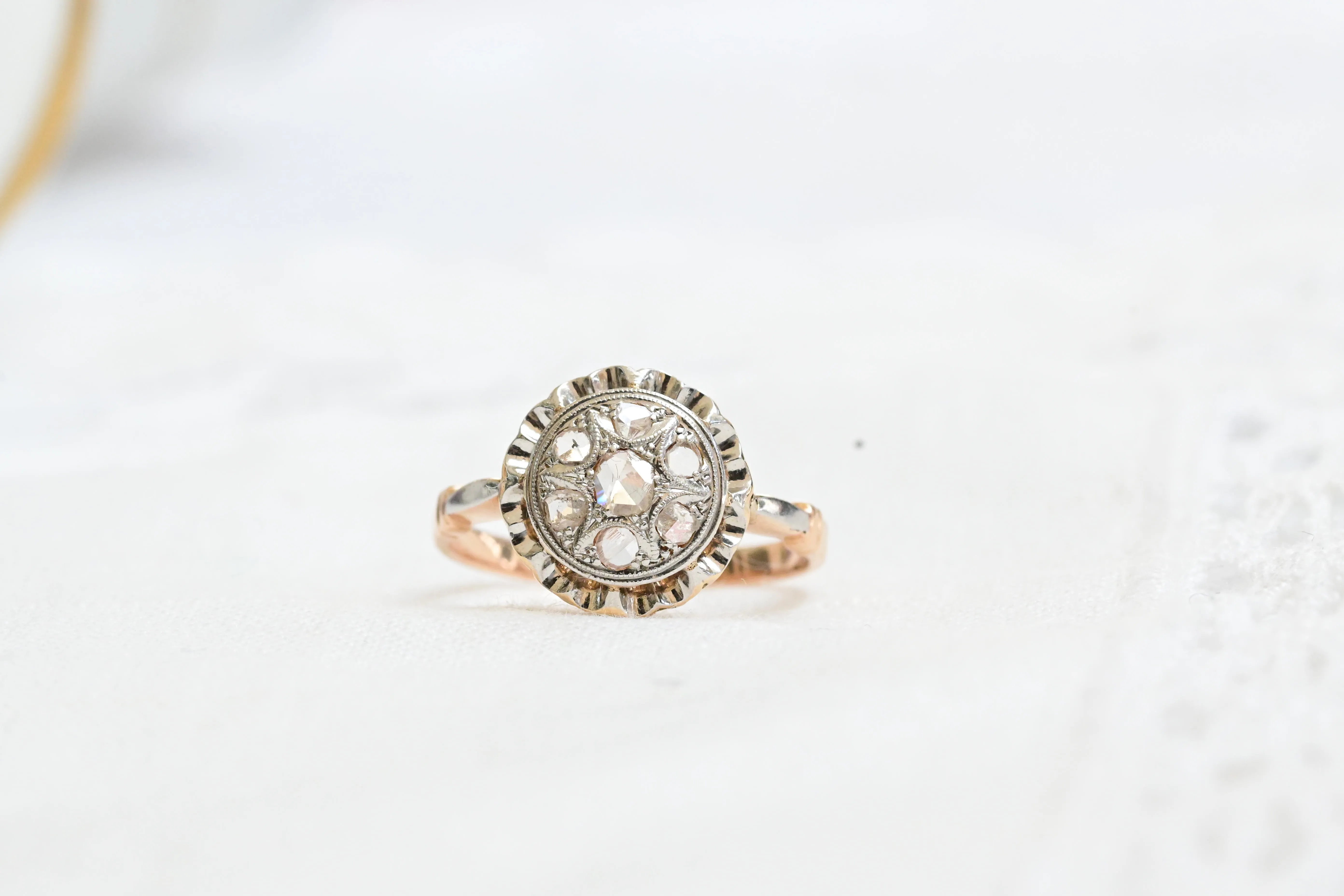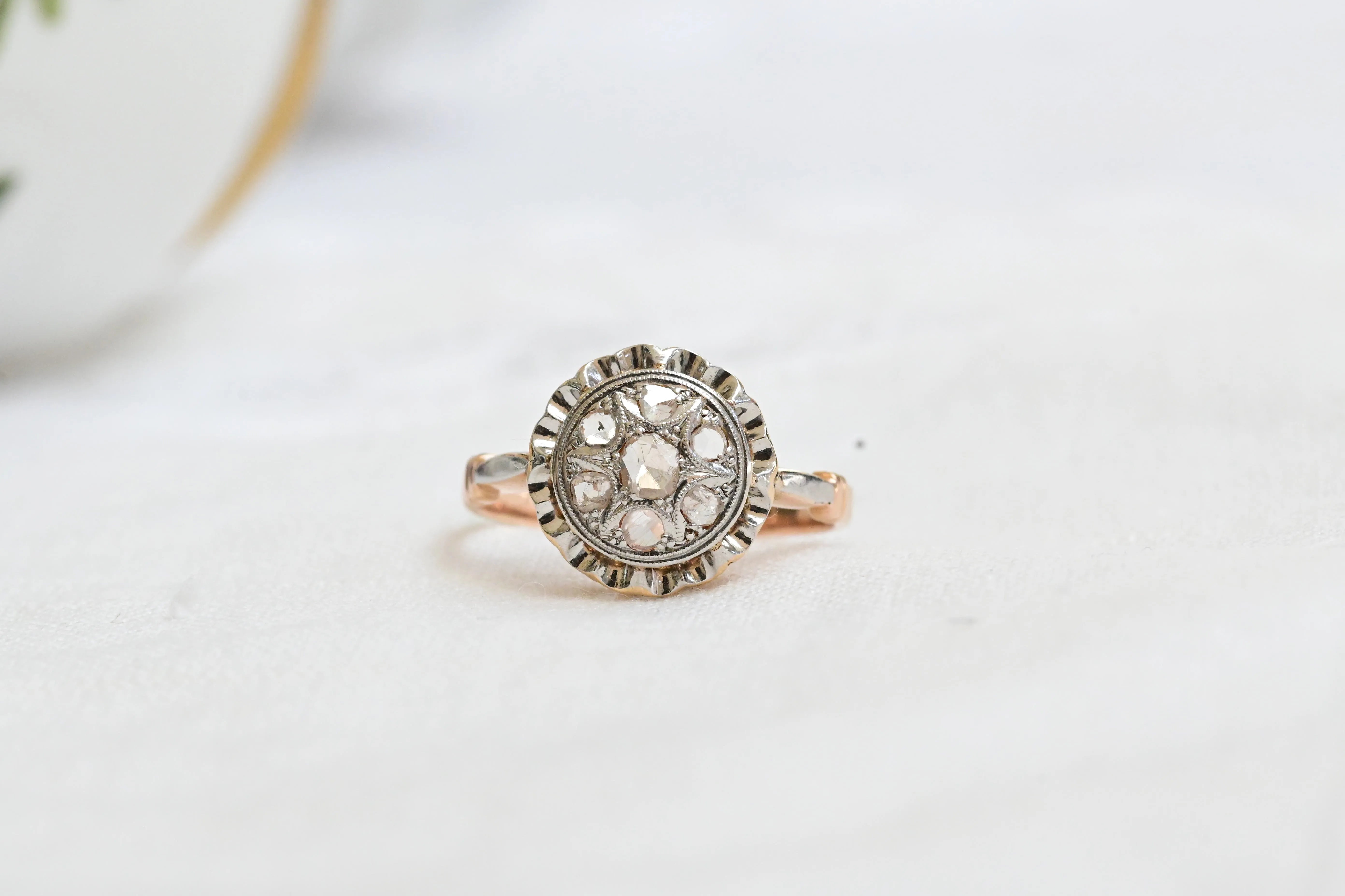 Art deco ring, from the first quarter of 20th century, in 14 K yellow gold, with a central motif with rose cut diamonds set in platinum