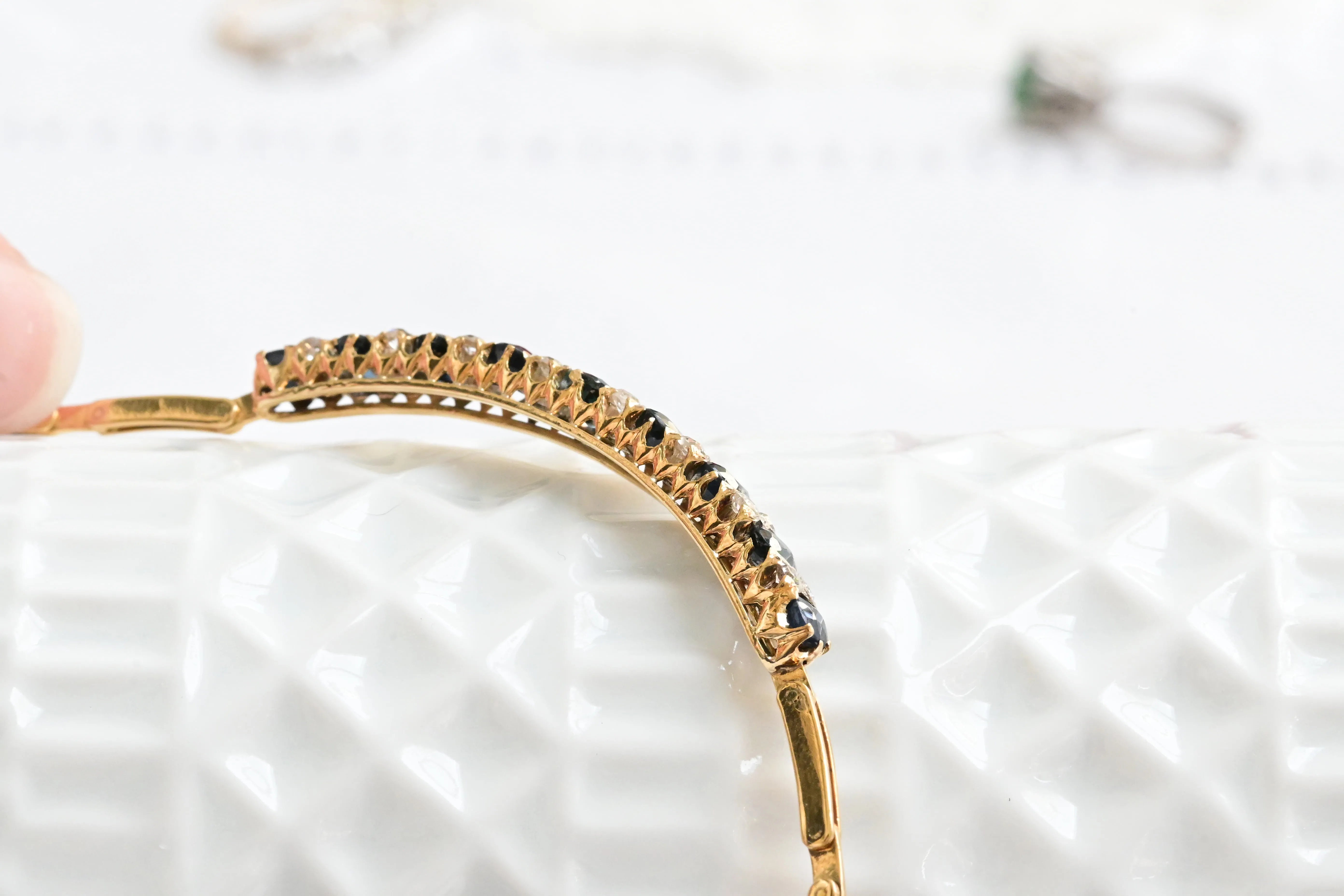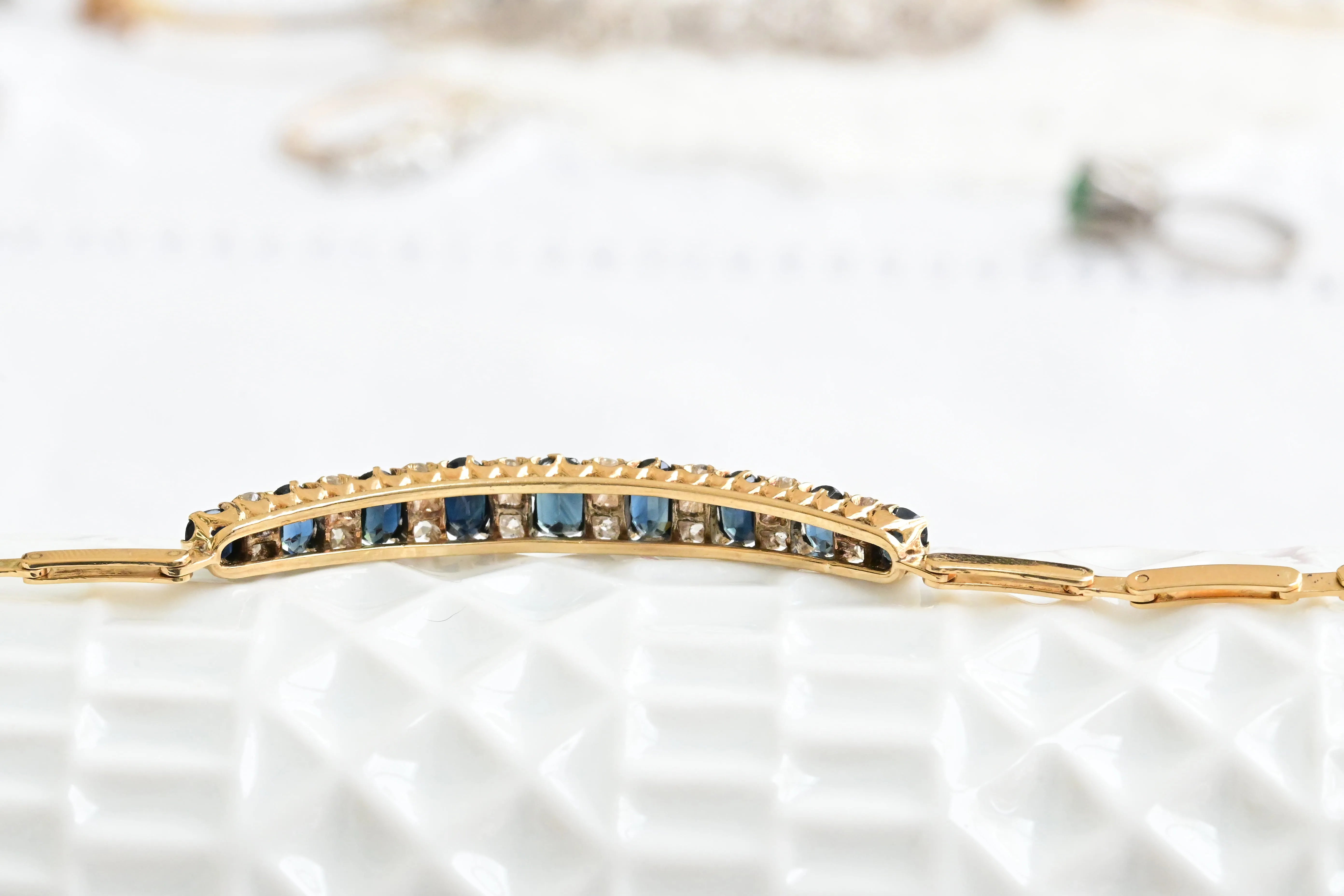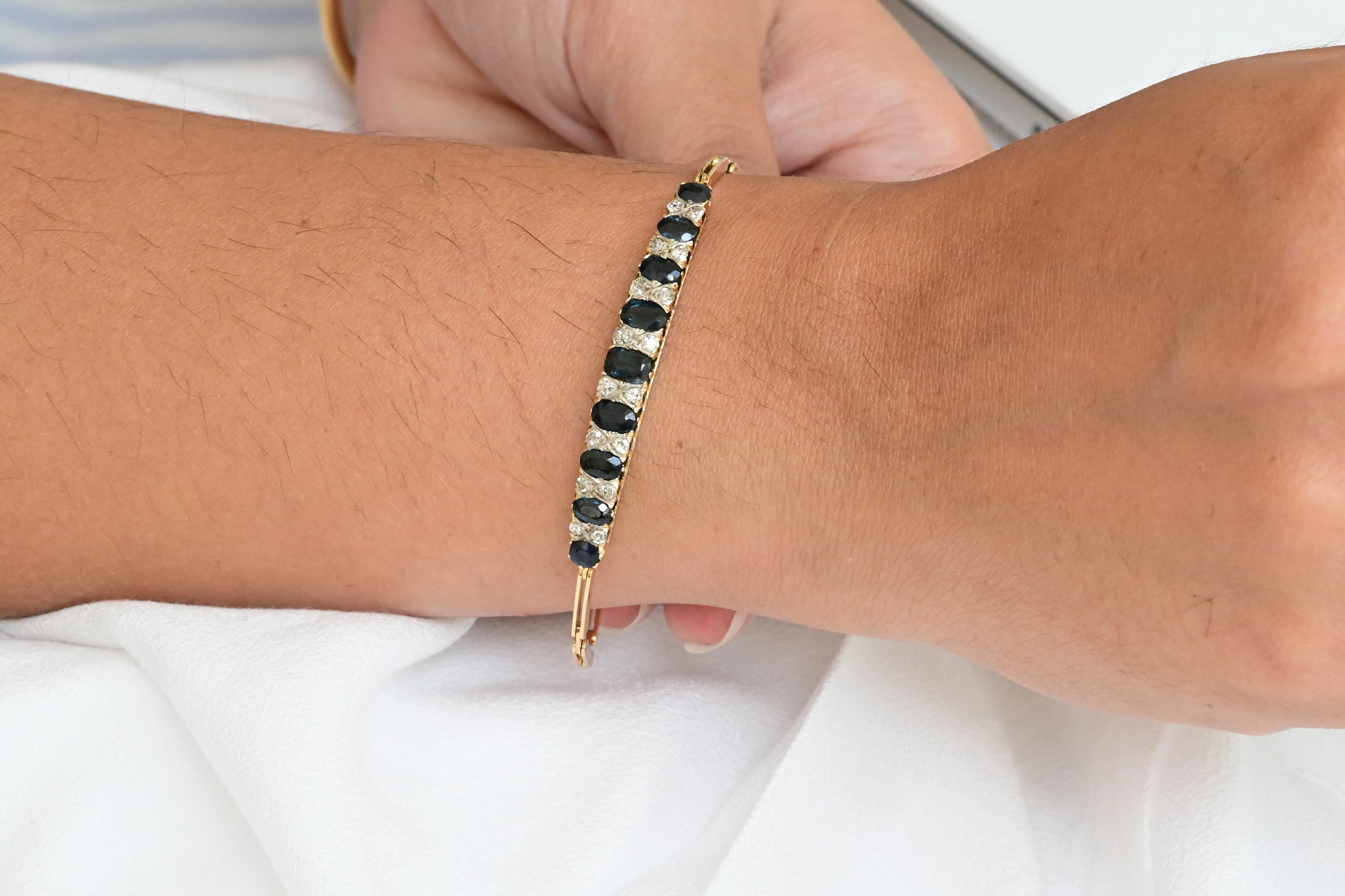Art deco bracelet, from the first third of the 20th century crafted in 18 K yellow gold with nine sapphires graduating in size and sixteen old cut diamonds.