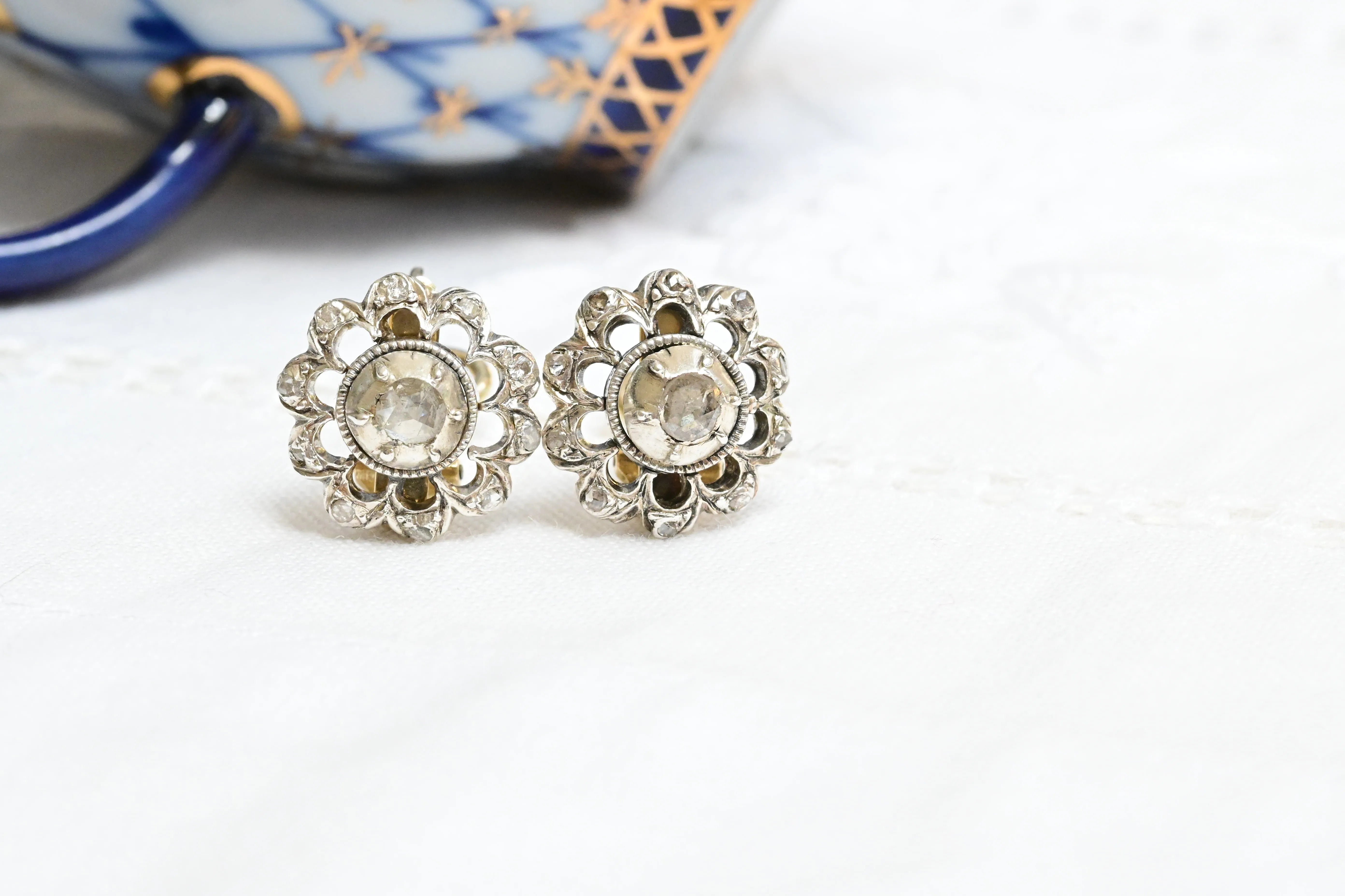 Art nouveau earrings, from early 20th century earrings, in 14 K bicolor gold, with a floral design decorated with diamonds