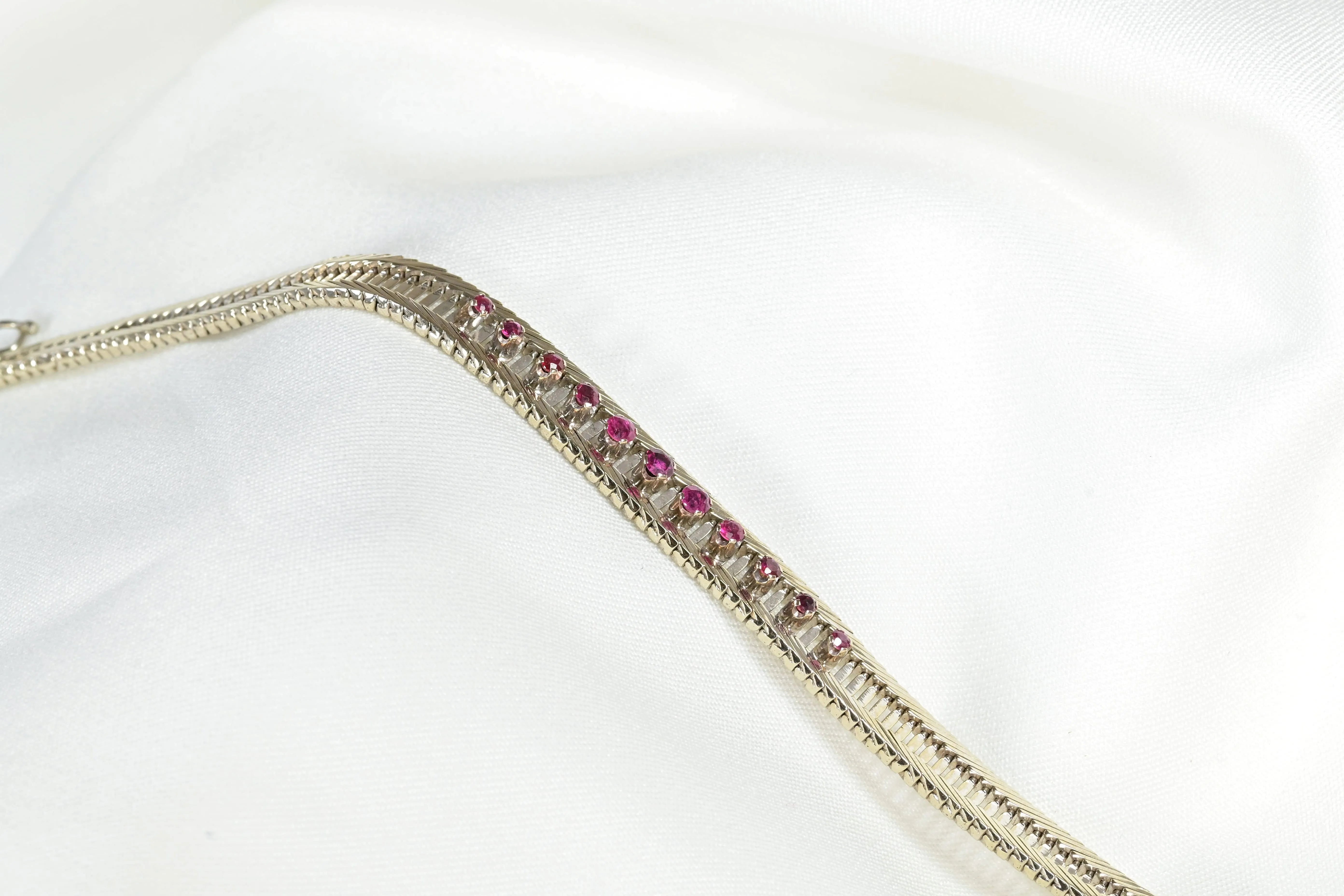 This stunning mid-century mesh bracelet showcases 11 exquisite prong-set rubies, totaling 0.70 carats, elegantly crafted in 14k white gold. The unique mesh design adds a touch of sophistication and flexibility, allowing for comfortable wear on any occasion.