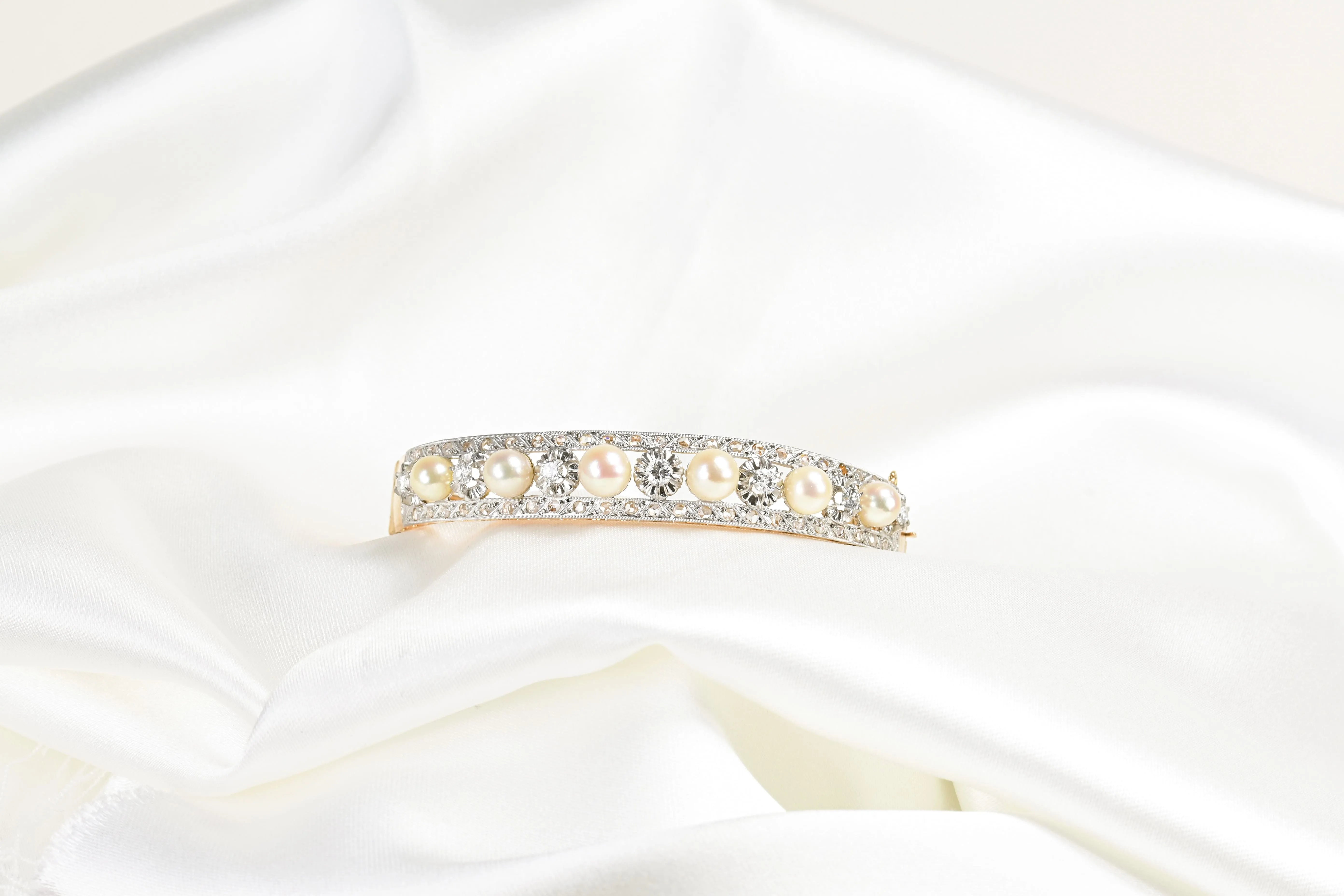 Rigid Bracelet in Yellow Gold and Platinum with Pearls and Diamonds