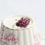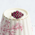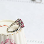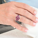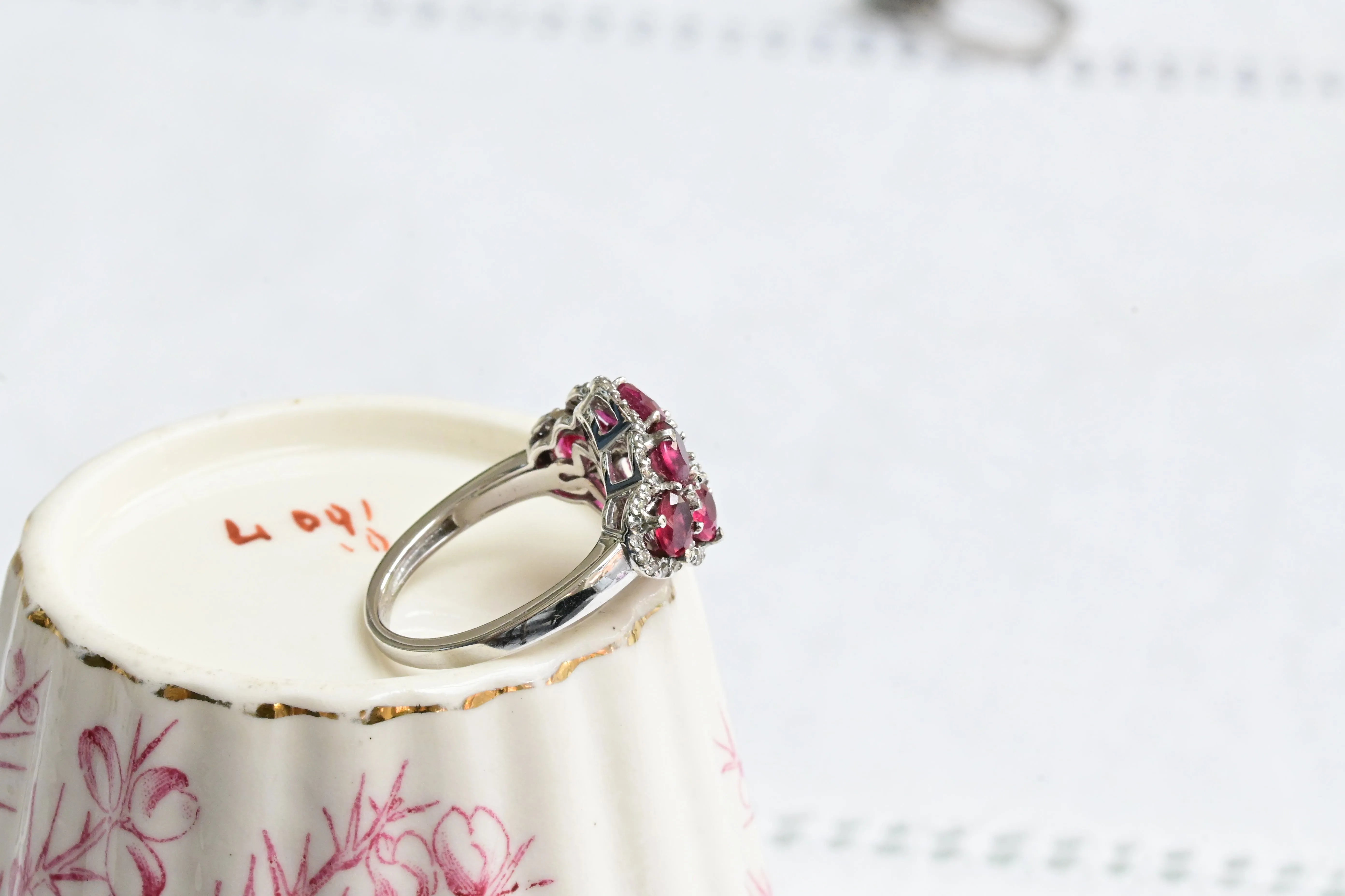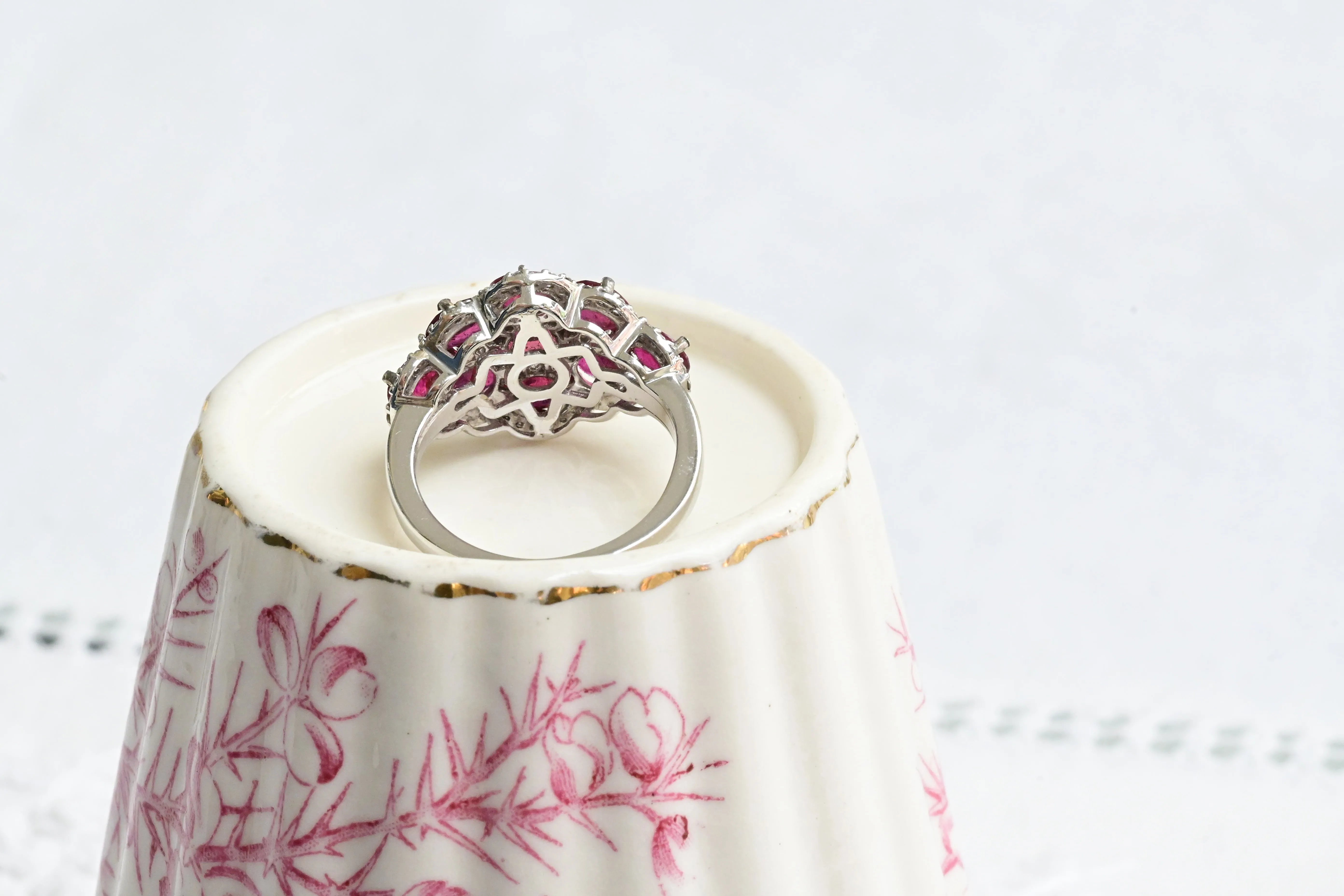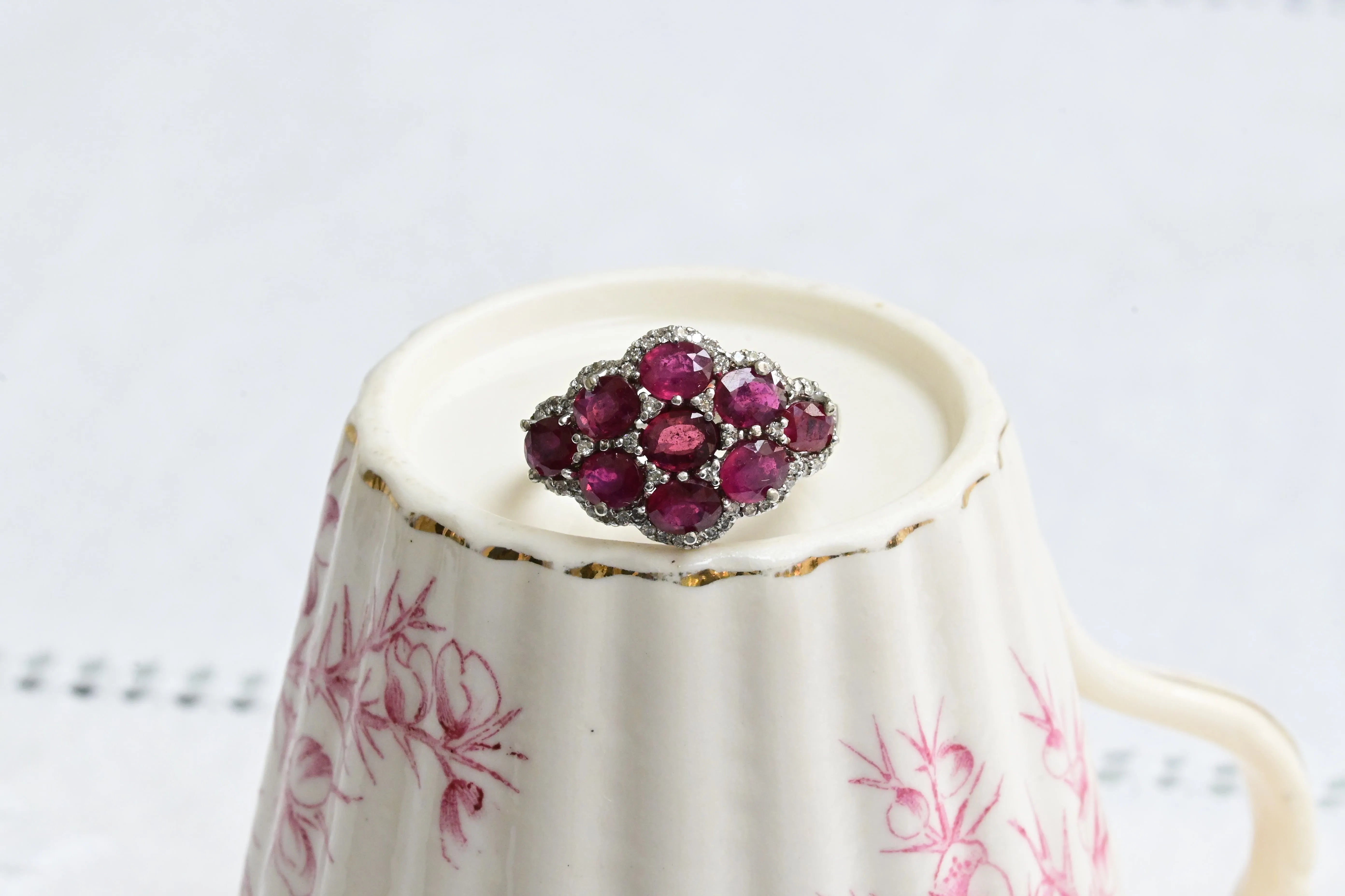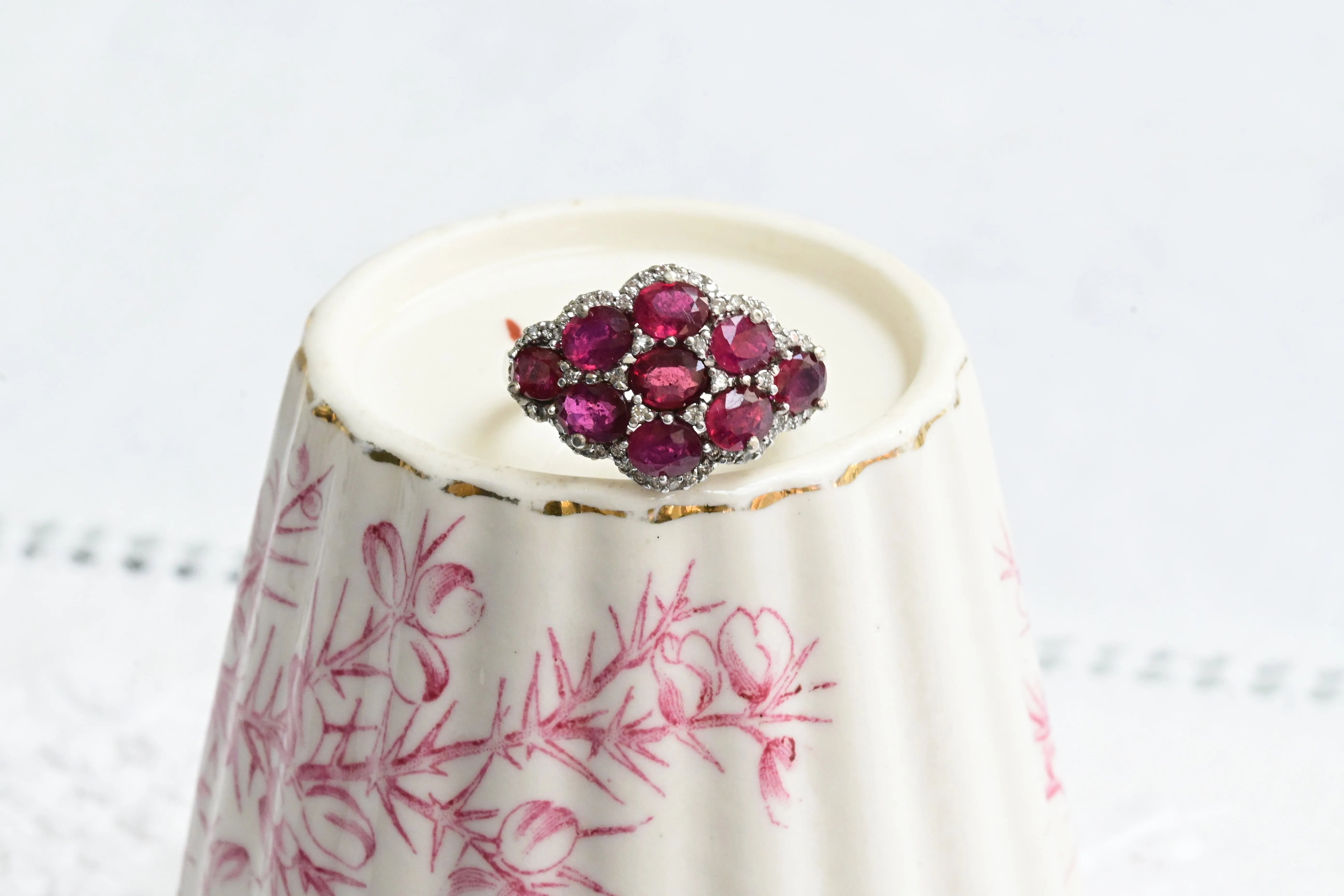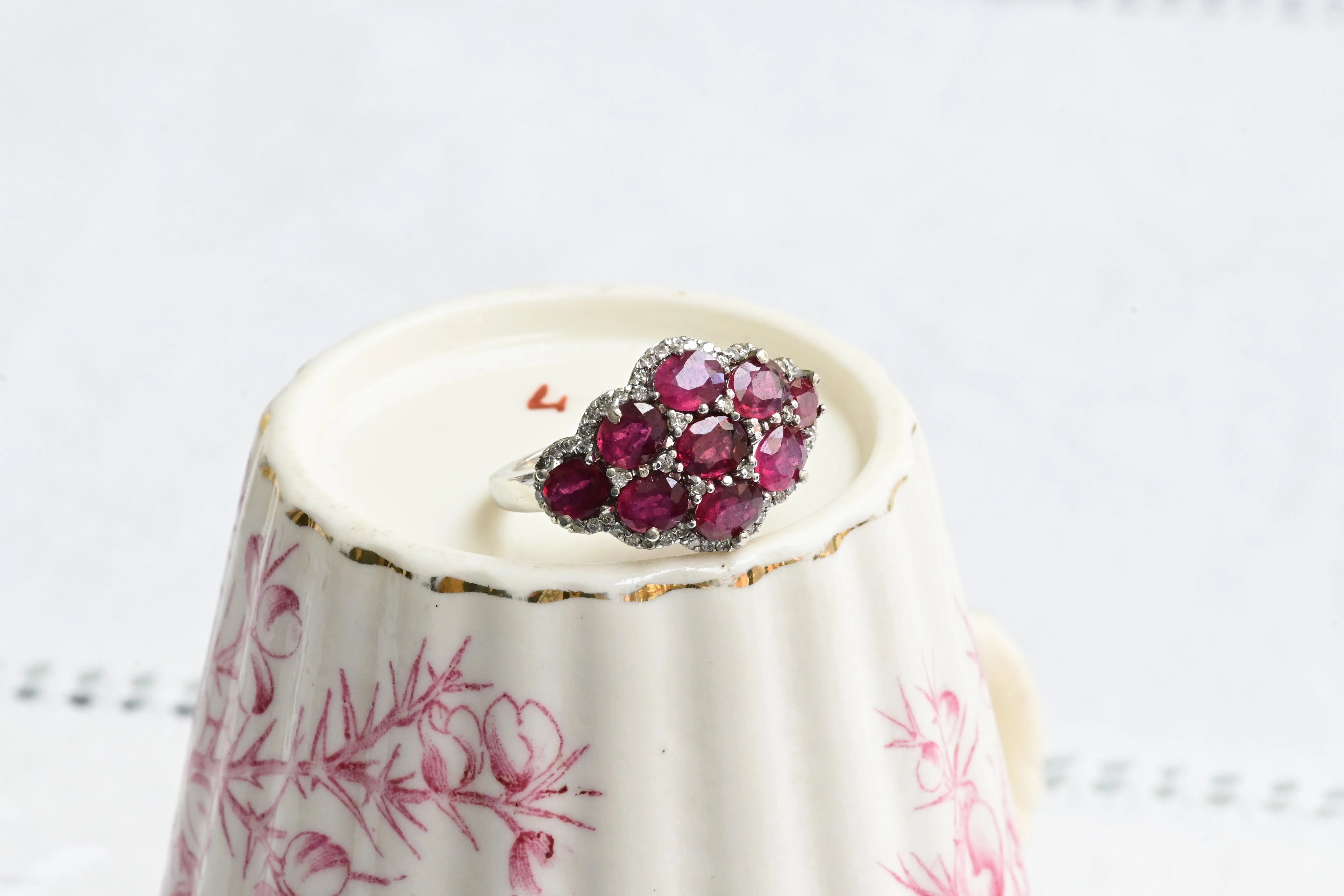 Vintage ring crafted in 18 K white gold set with a elegant cluster of nine oval cut rubies and sixty two round brilliant cut diamonds.