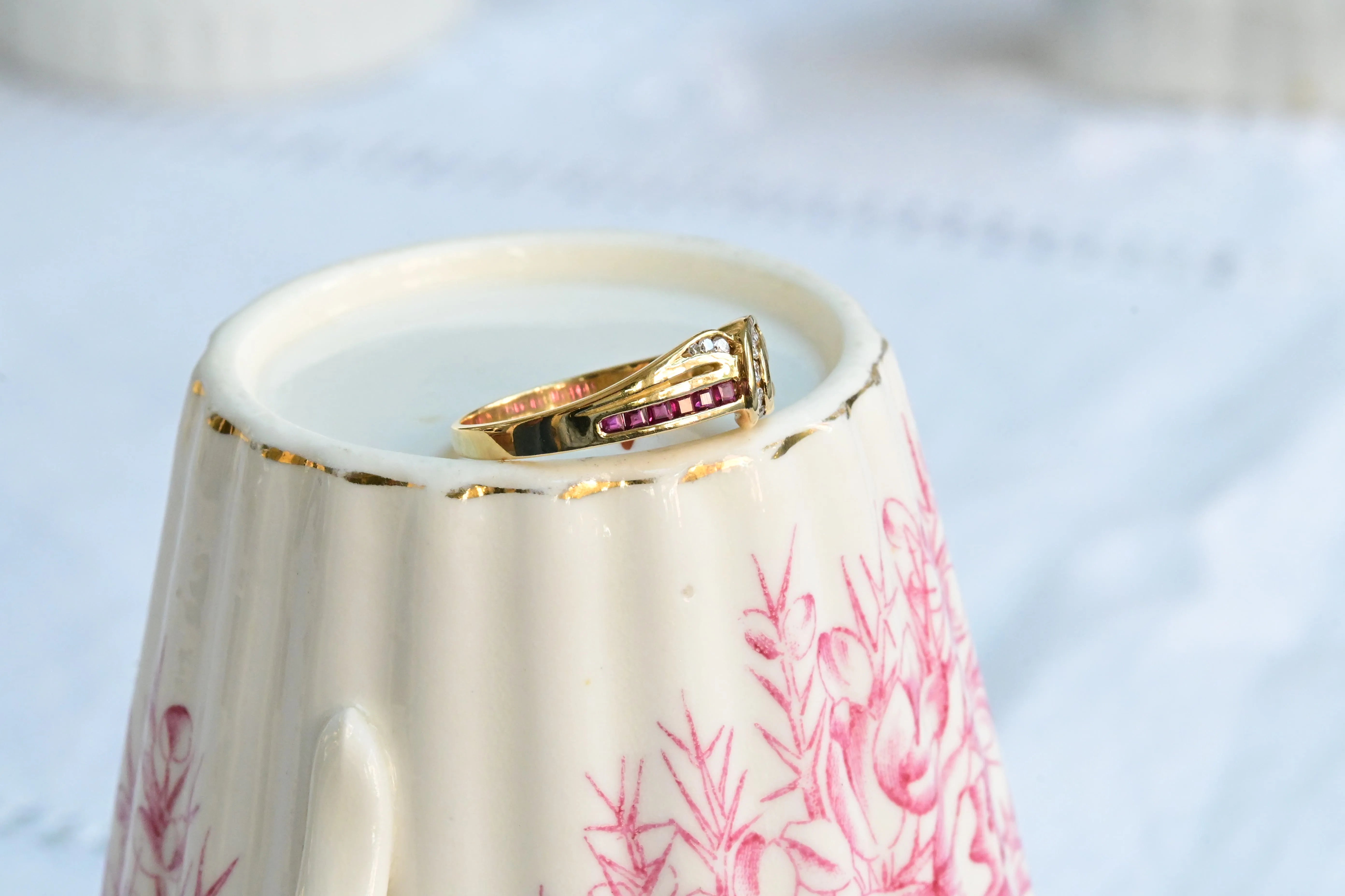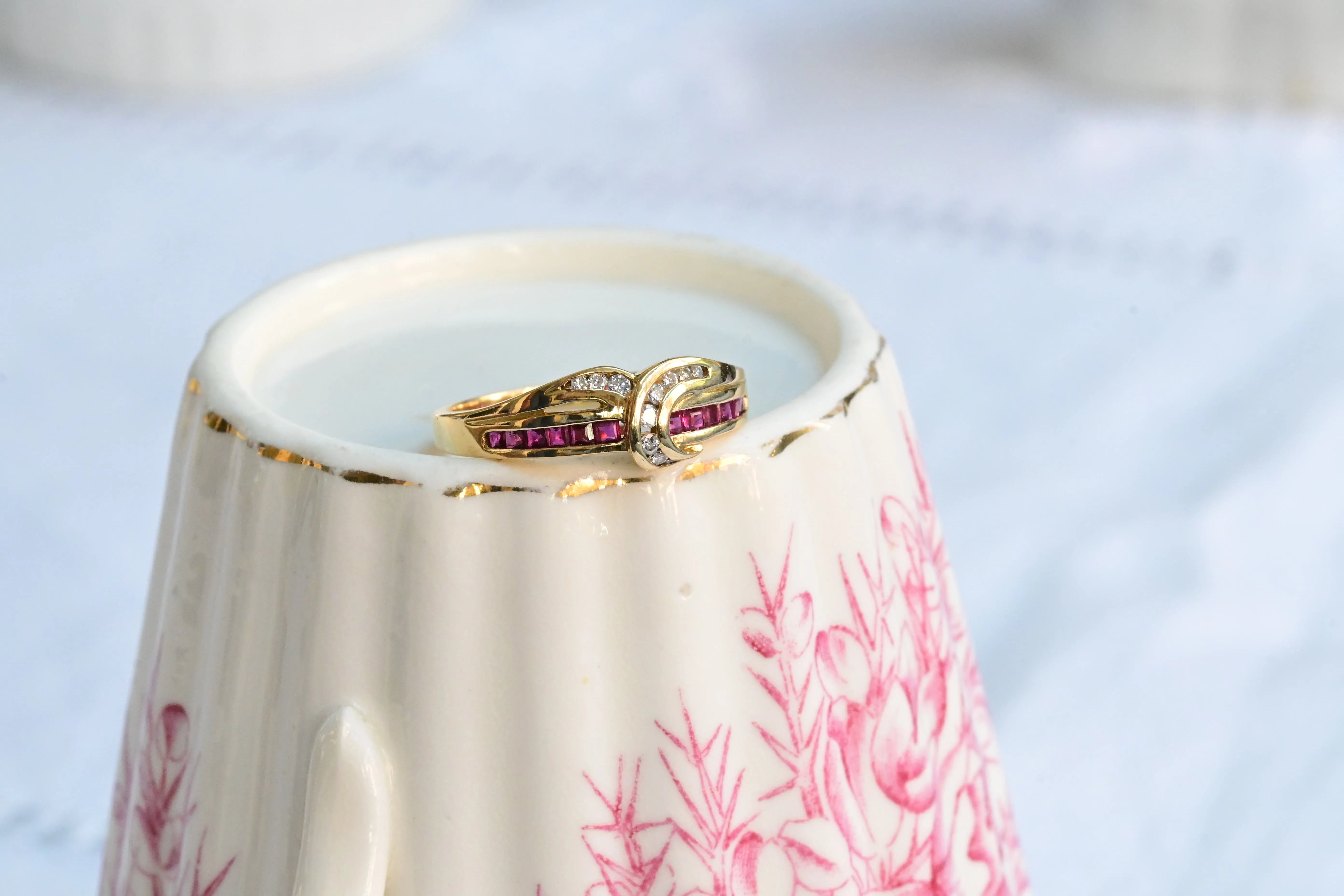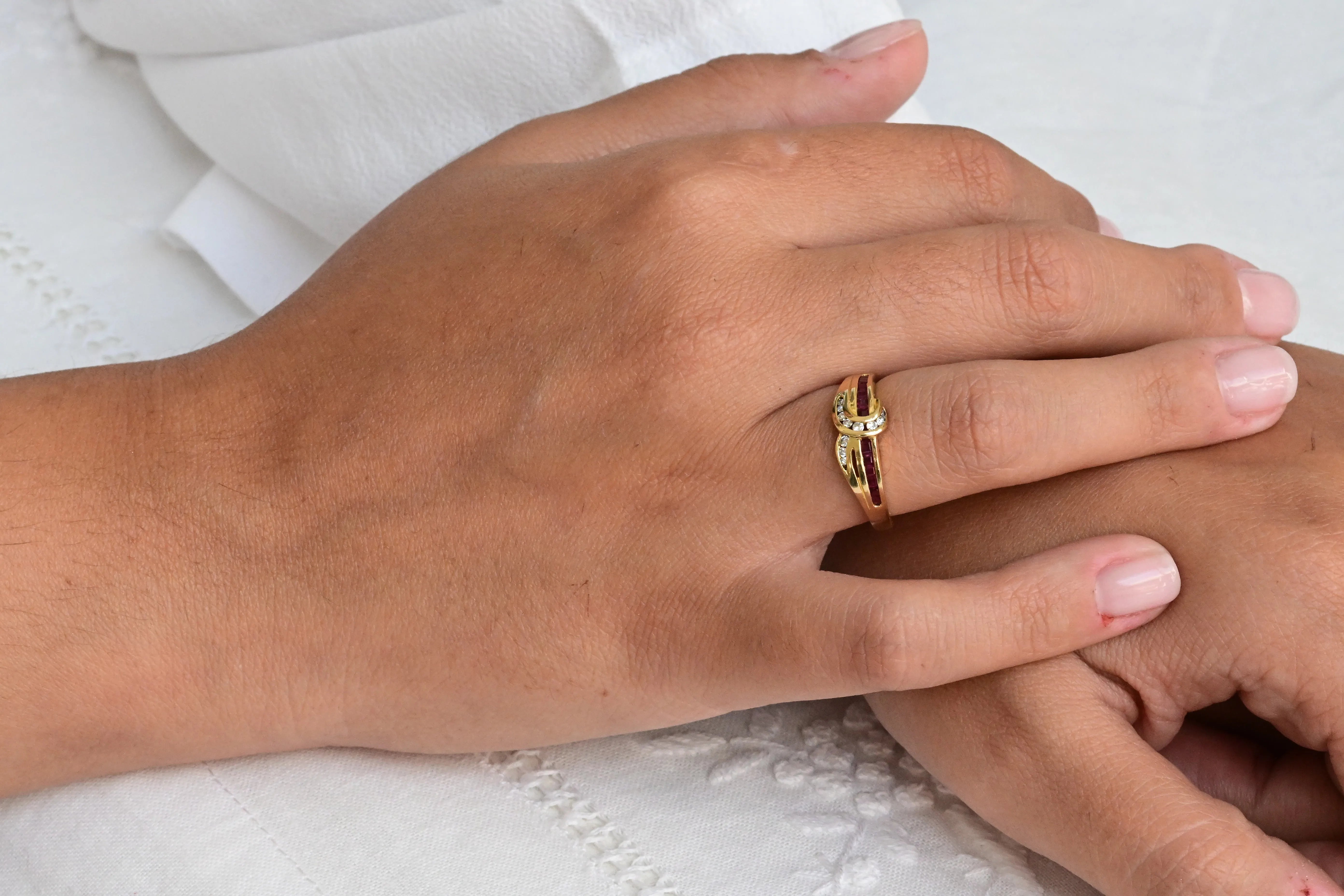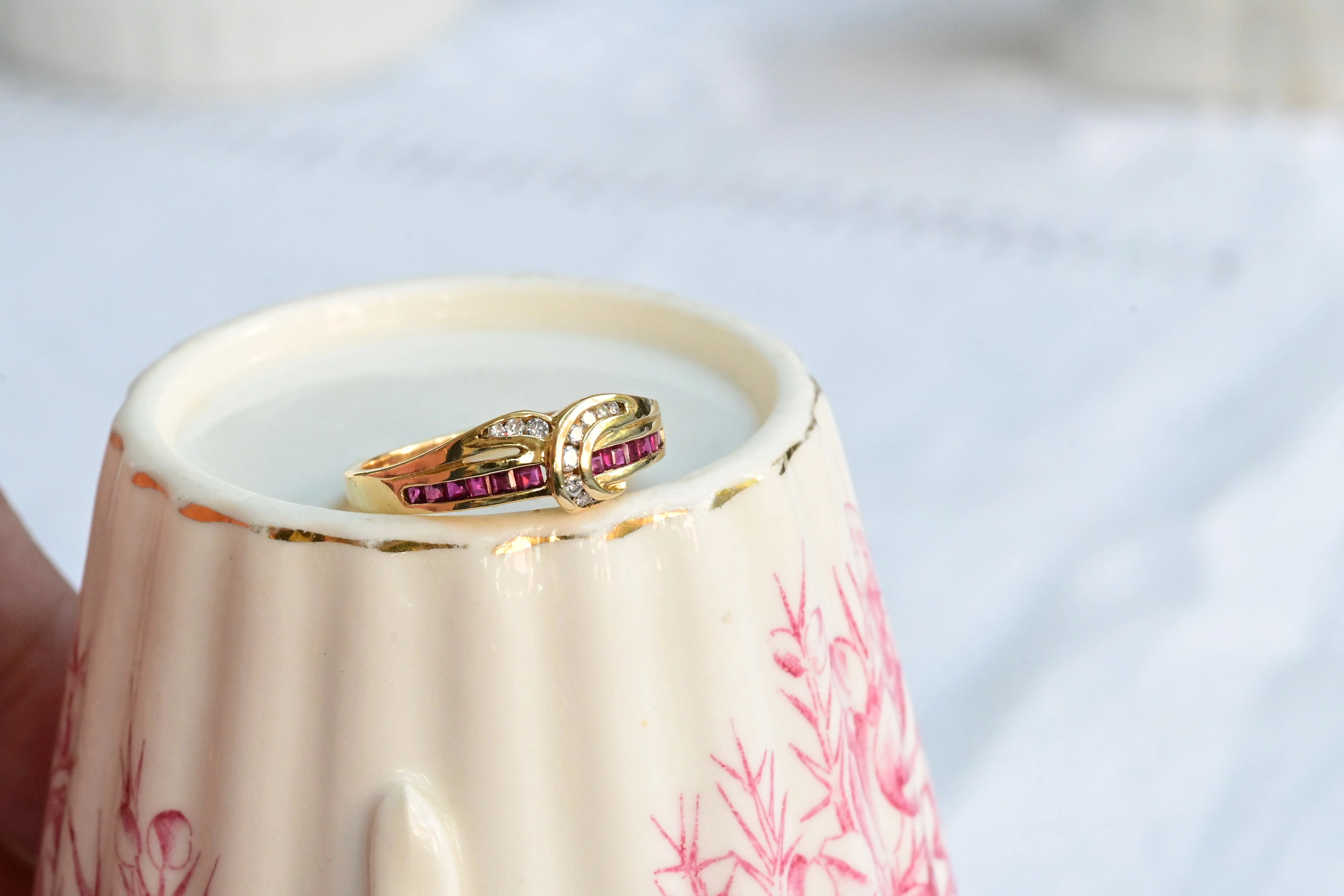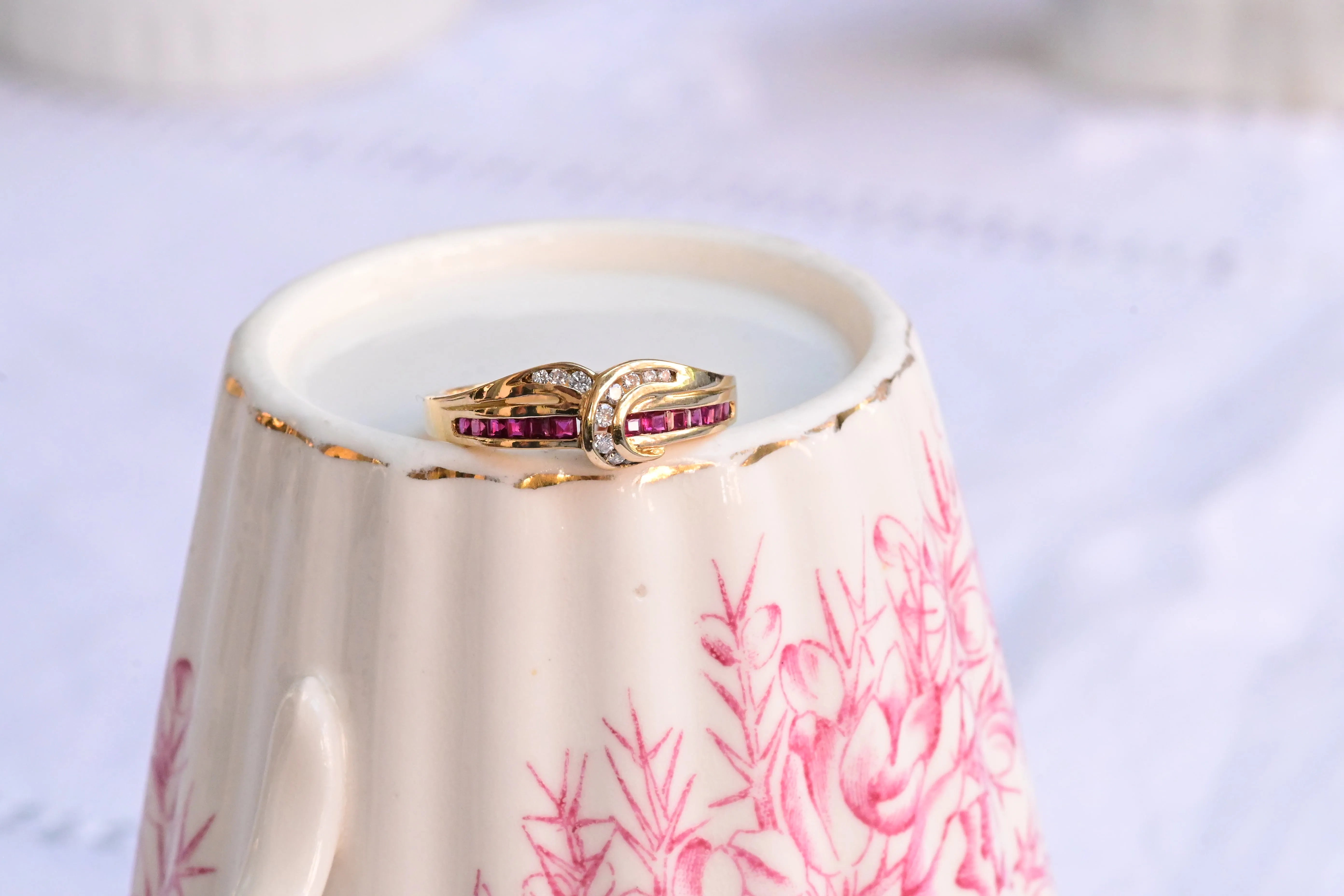 Vintage ring, from the 1950s decade crafted in 18 K yellow gold with a geometric design composed by eleven round brilliant cut diamonds and thirteen square cut rubies
