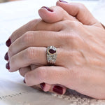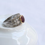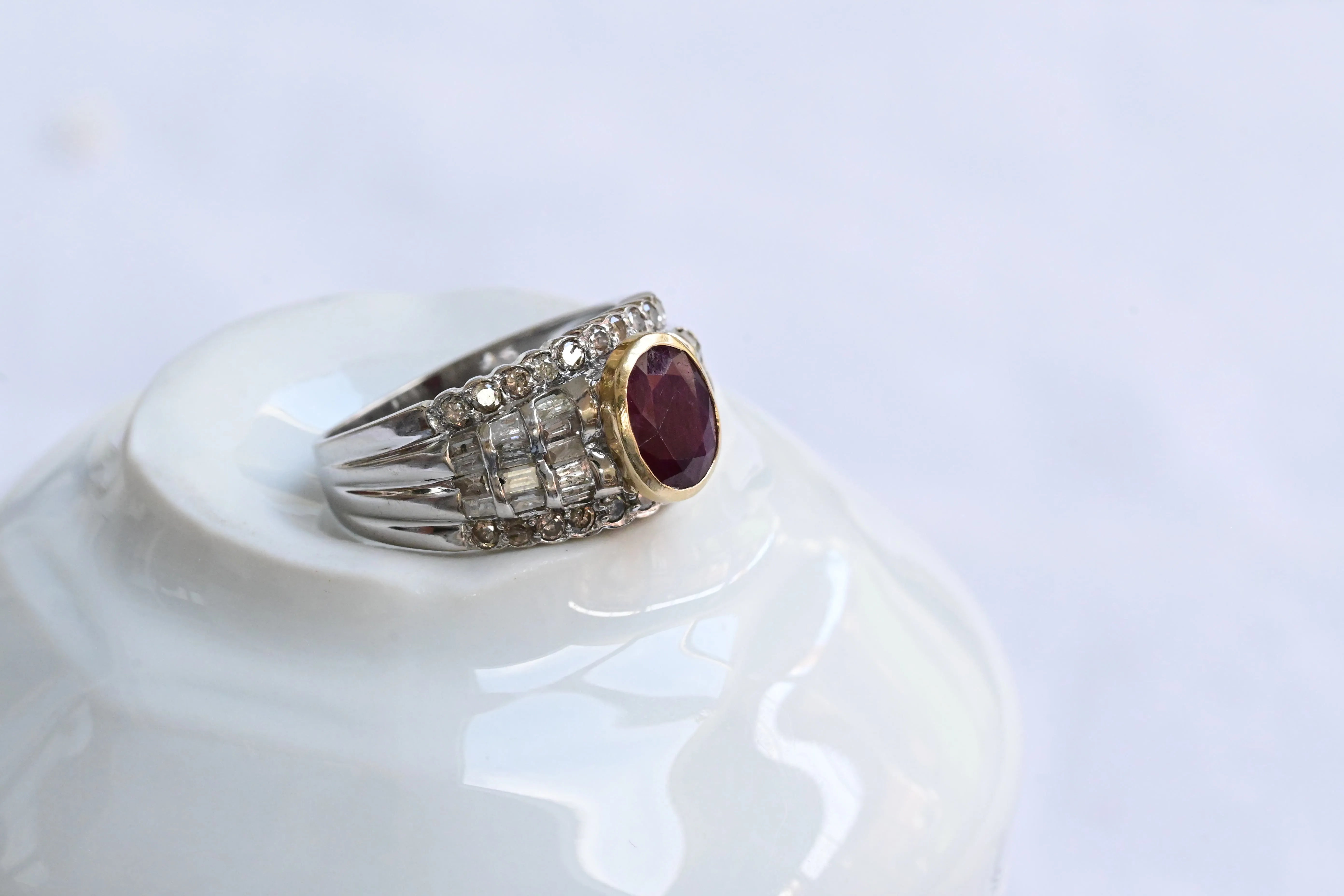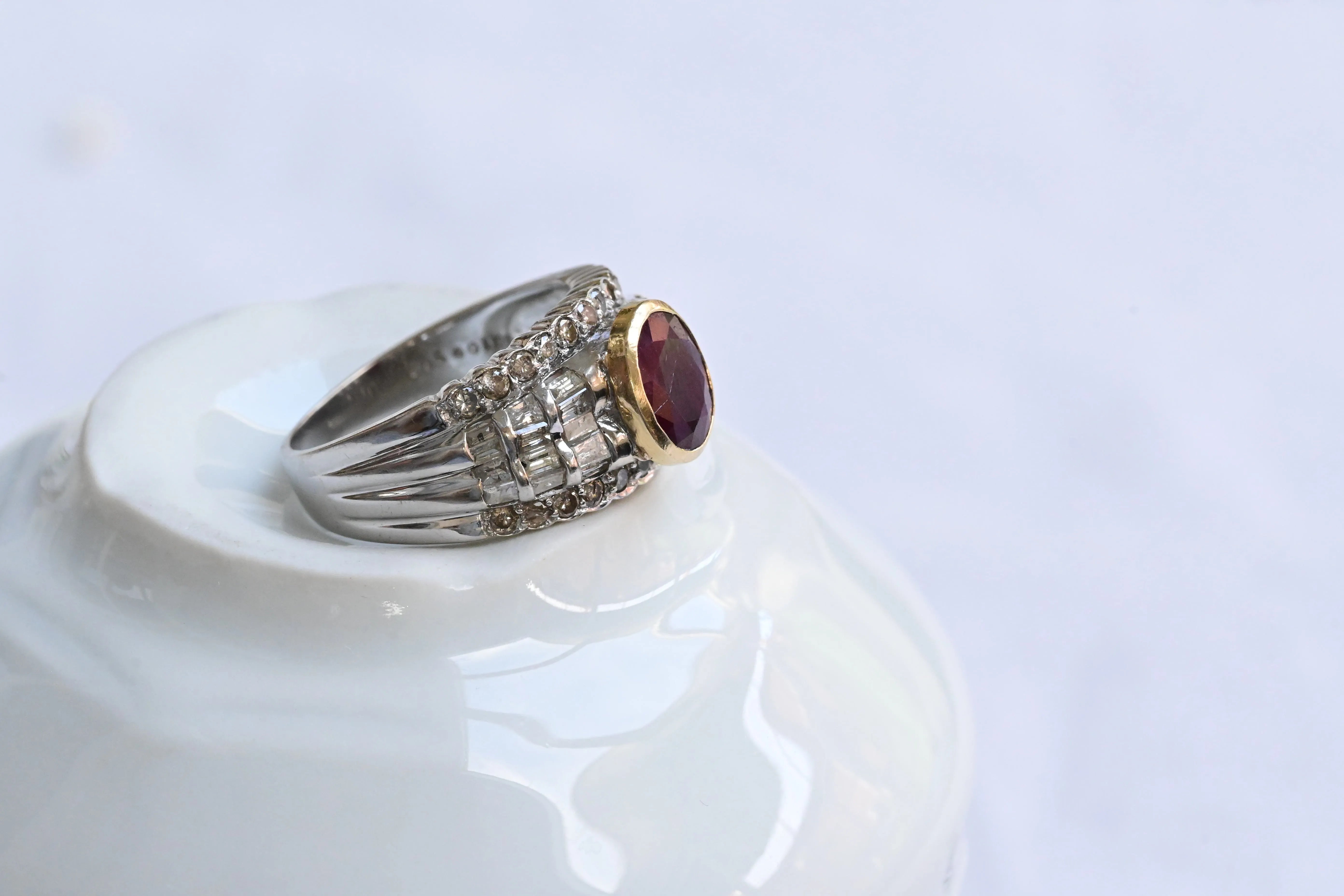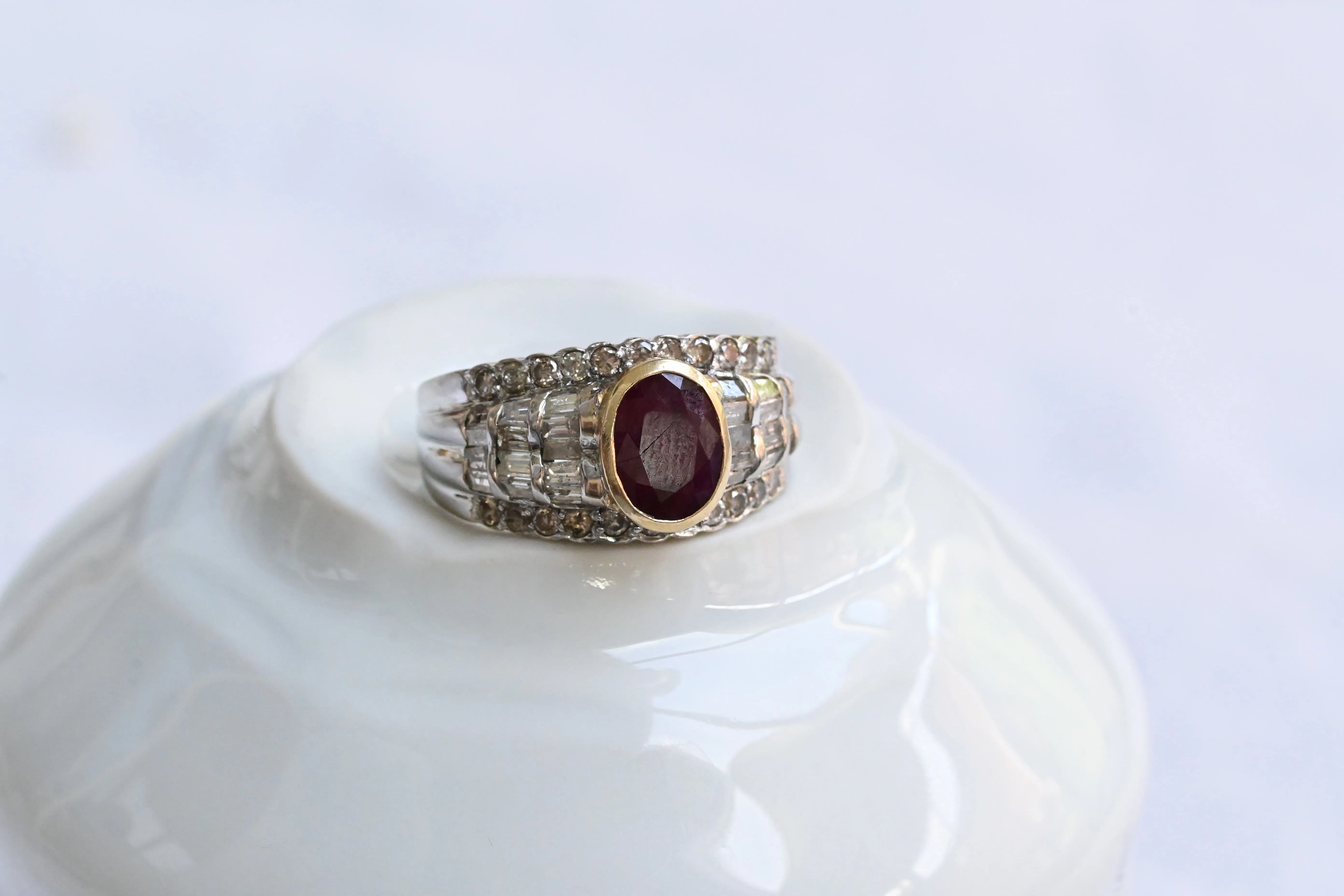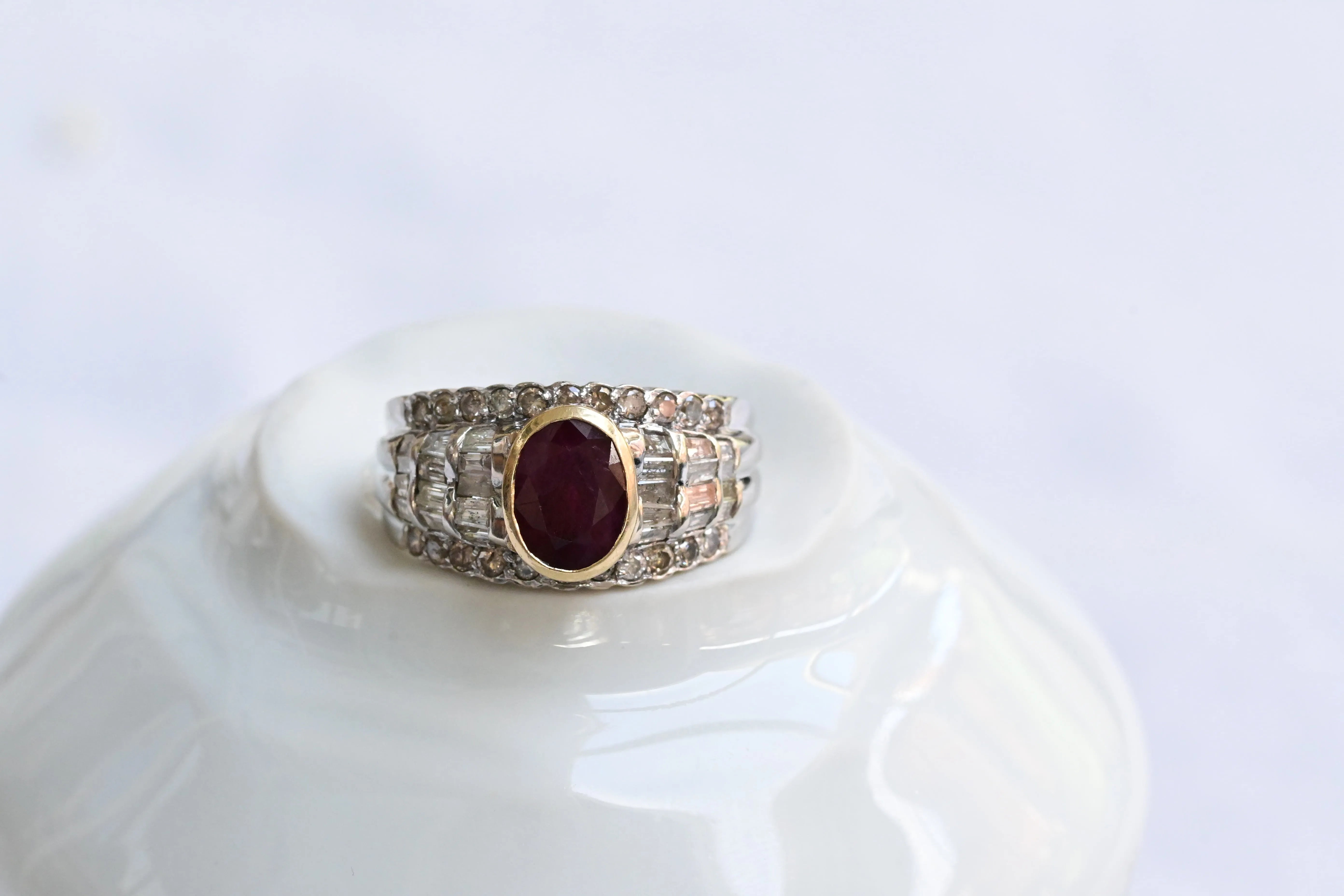 Vintage ring from the 1950s, crafted in 18K white gold, featuring a central oval cut ruby, accented by twenty six baguette cut diamonds and twenty two round brilliant cut diamonds, adding the perfect finishing touch