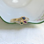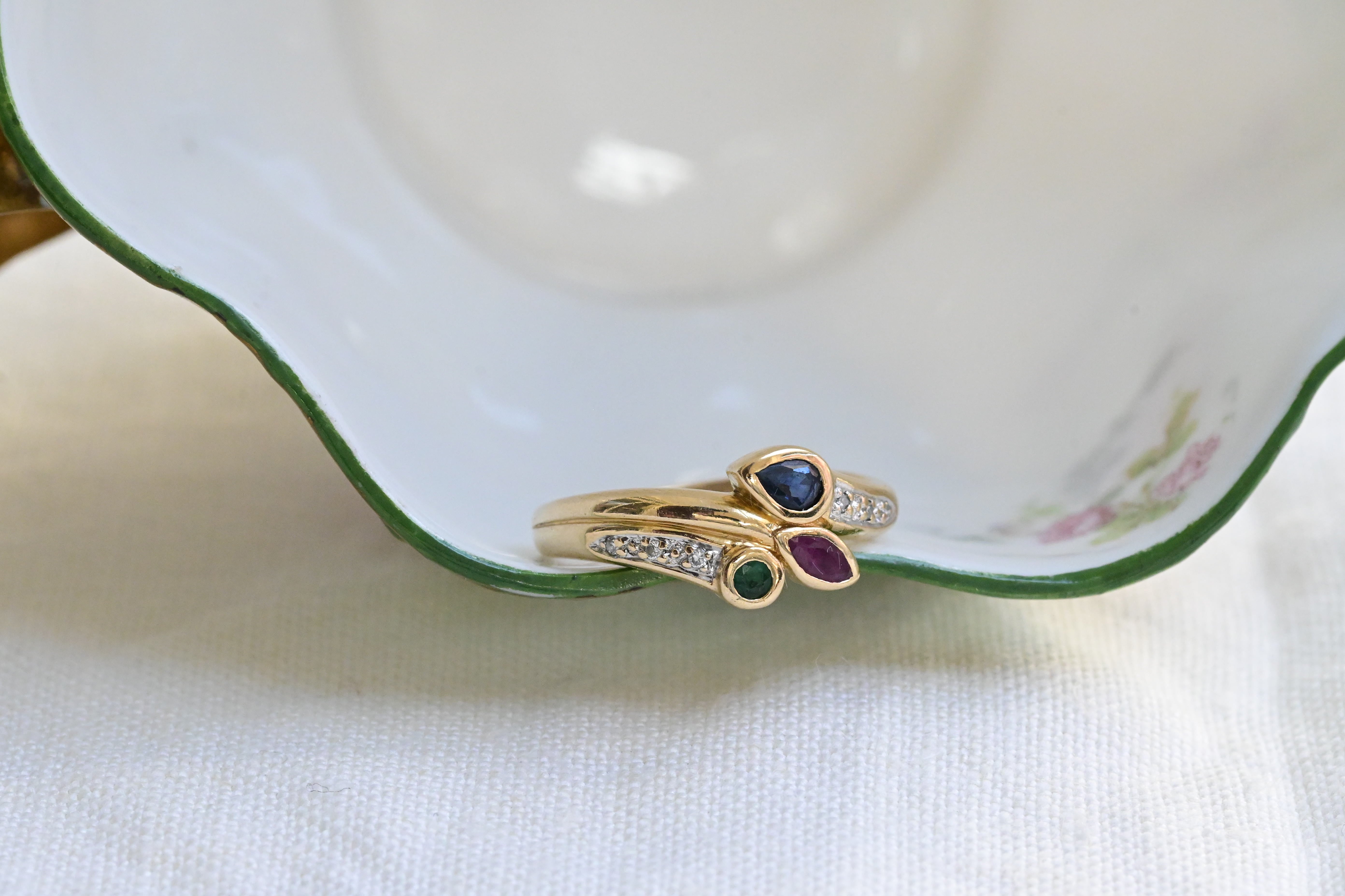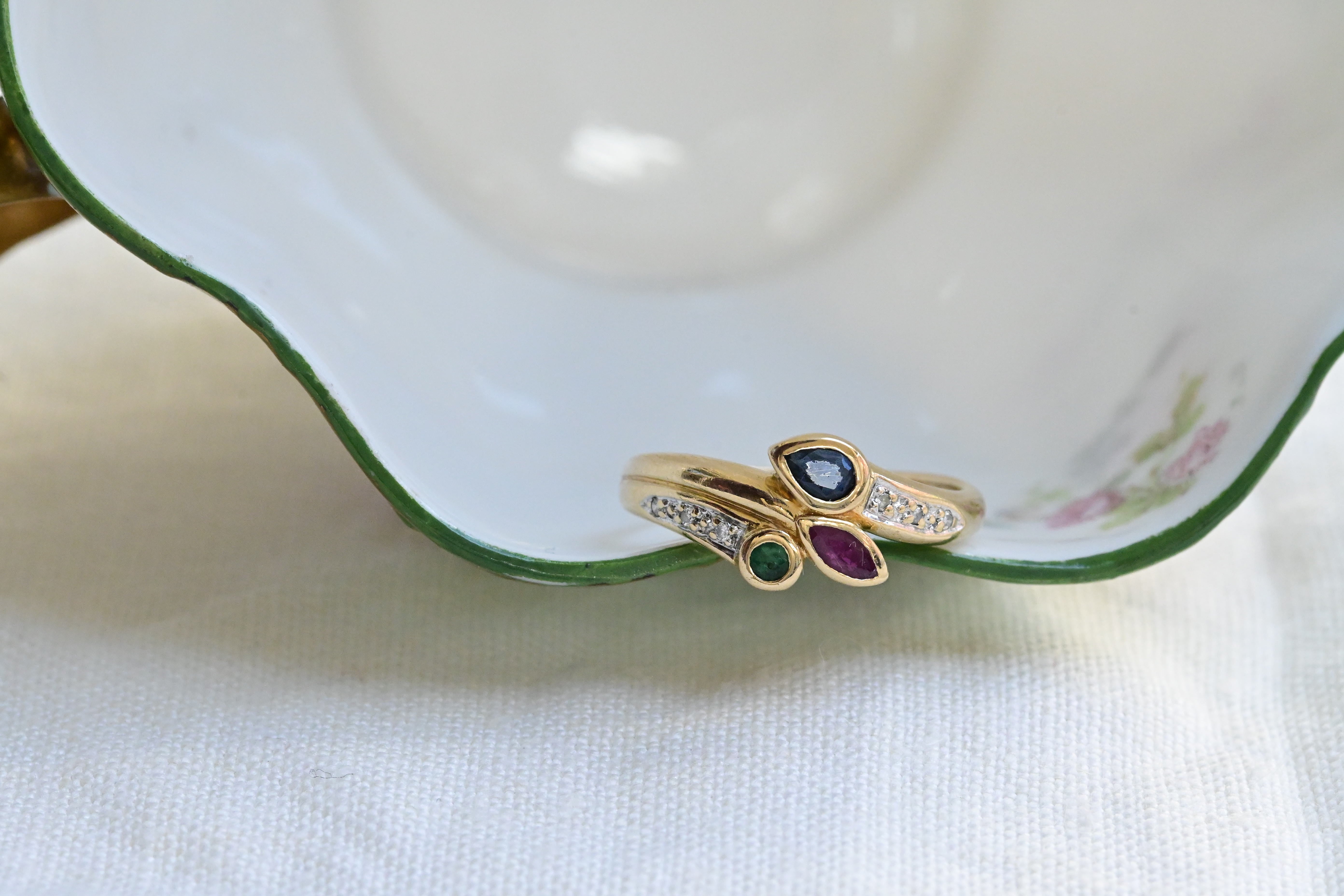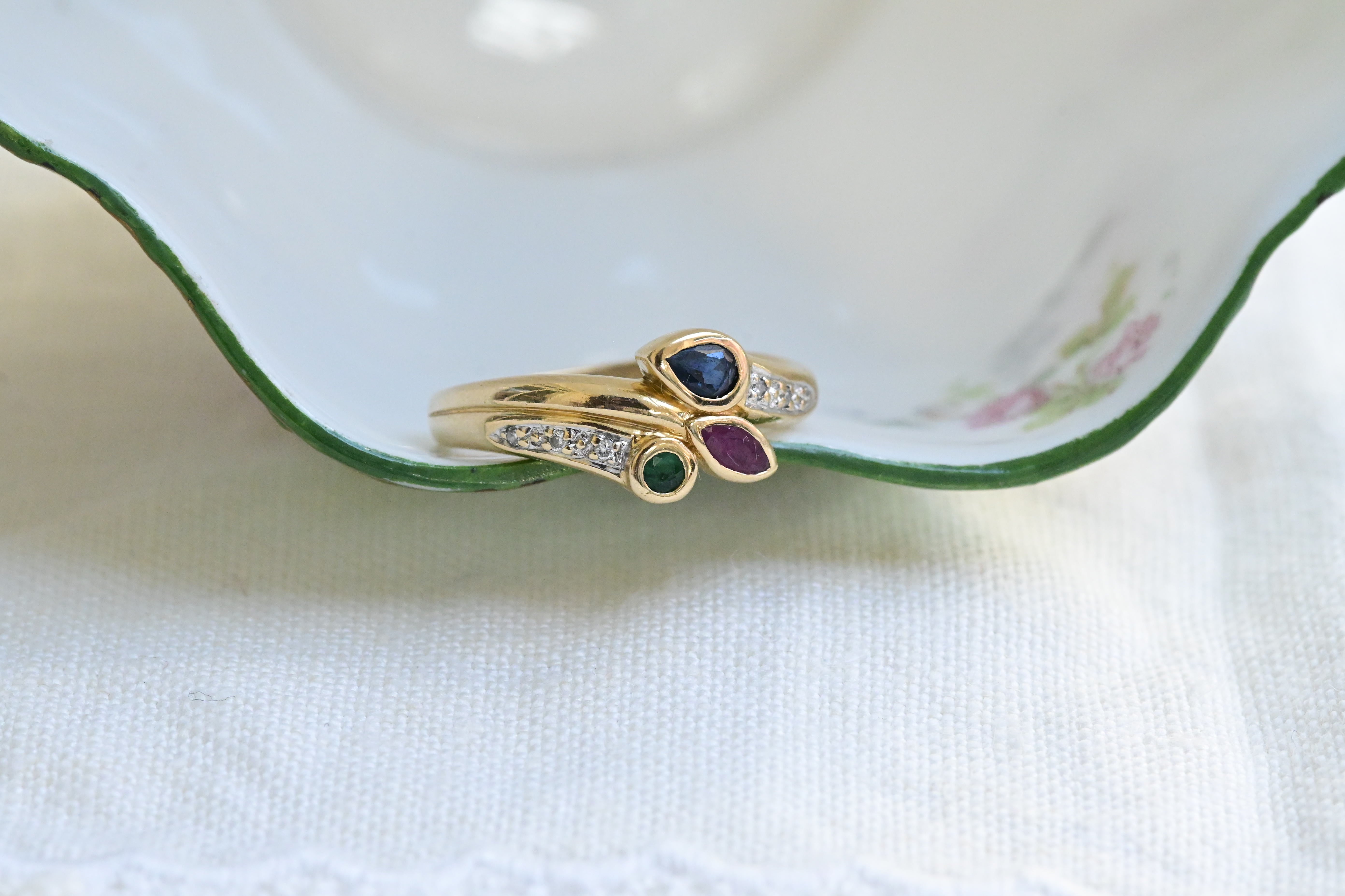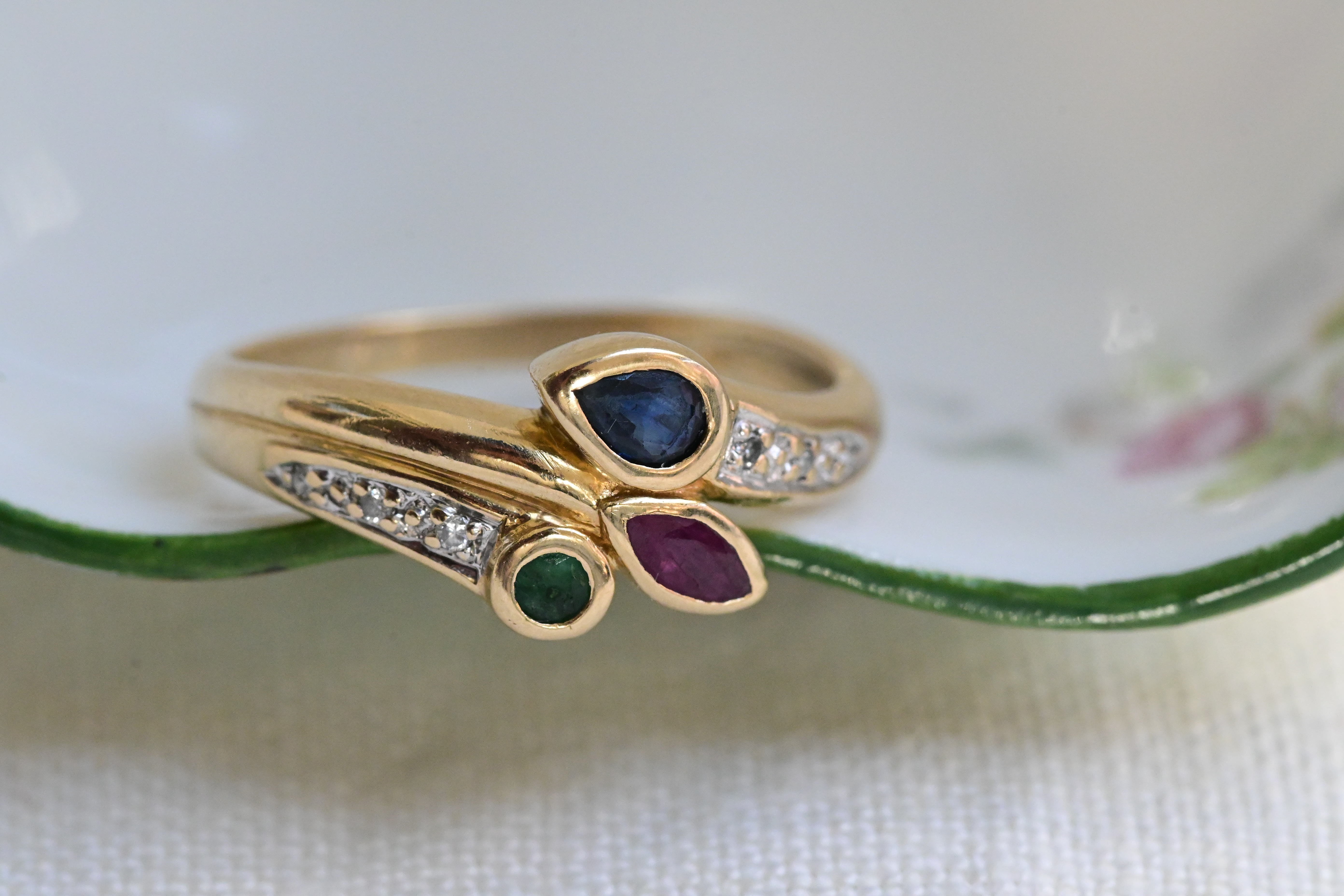 Vintage ring, from the 1980s cragted in 18 K yellow gold with a central set of three stones, one round cut emerald, one marquise cut ruby and one pear cut sapphire, decorated with six round brilliant cut diamonds in the sides.