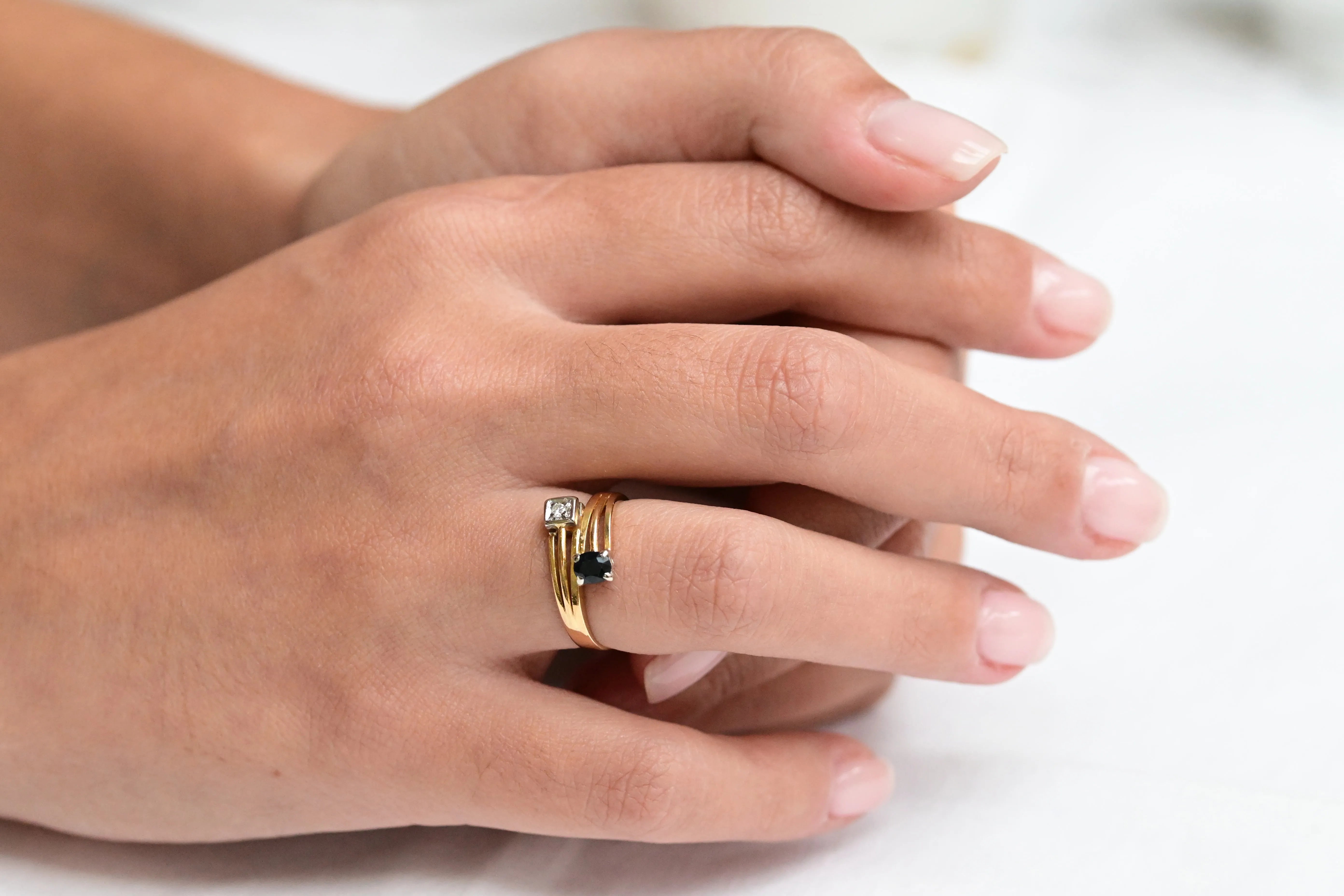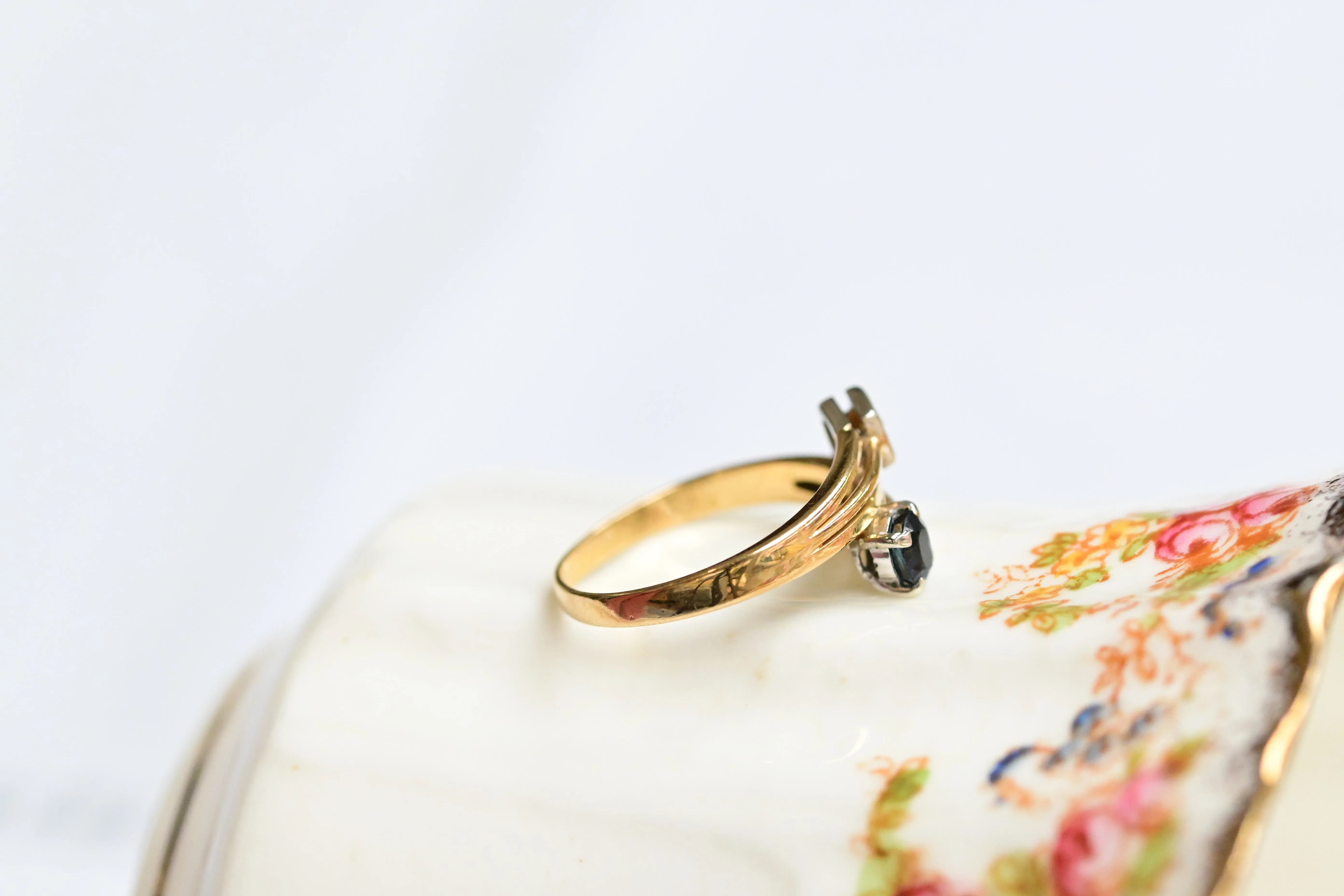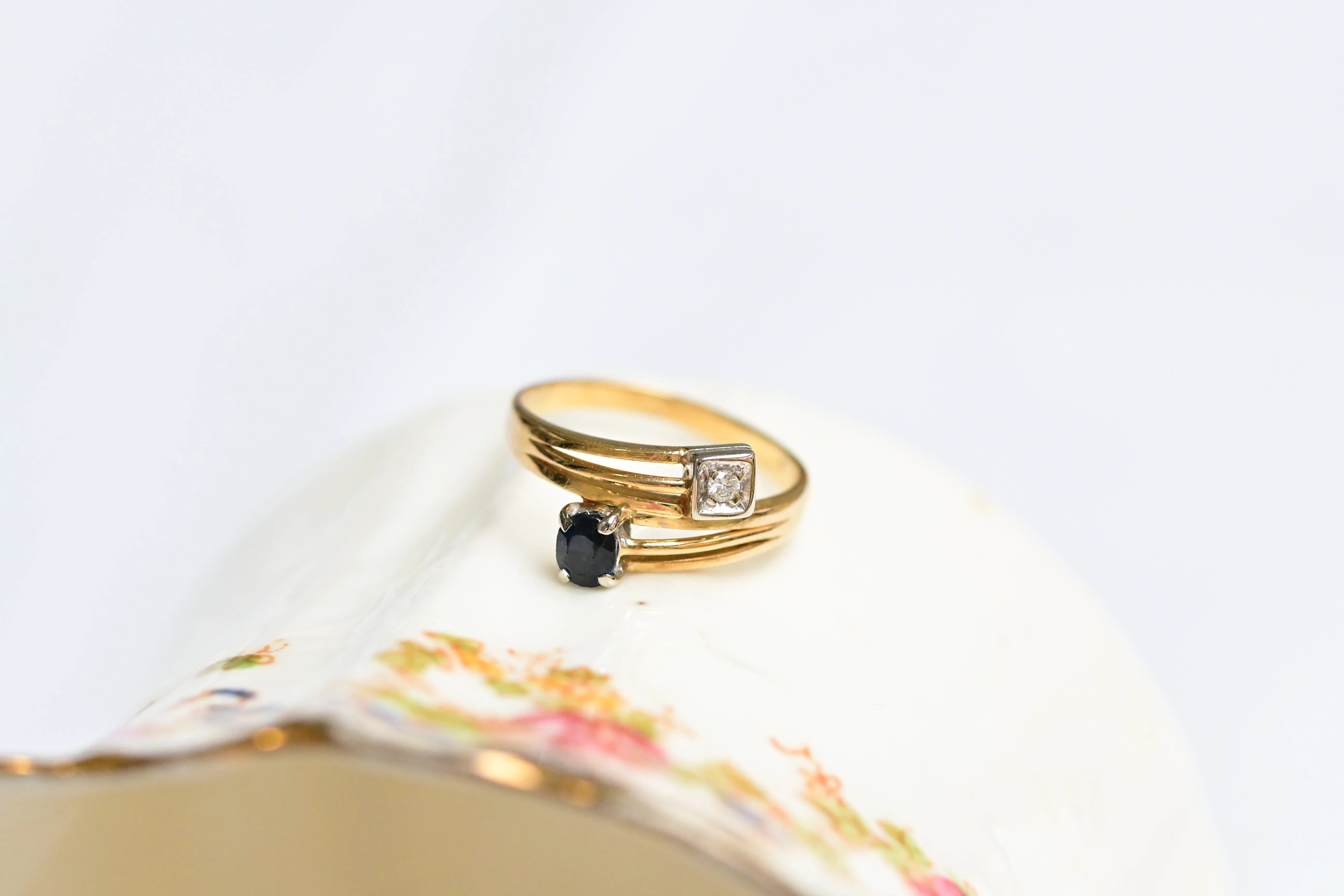 Vintage ring, from 1980s, made of 18 K yellow gold, with a brilliant cut diamond and round oval cut sapphire.