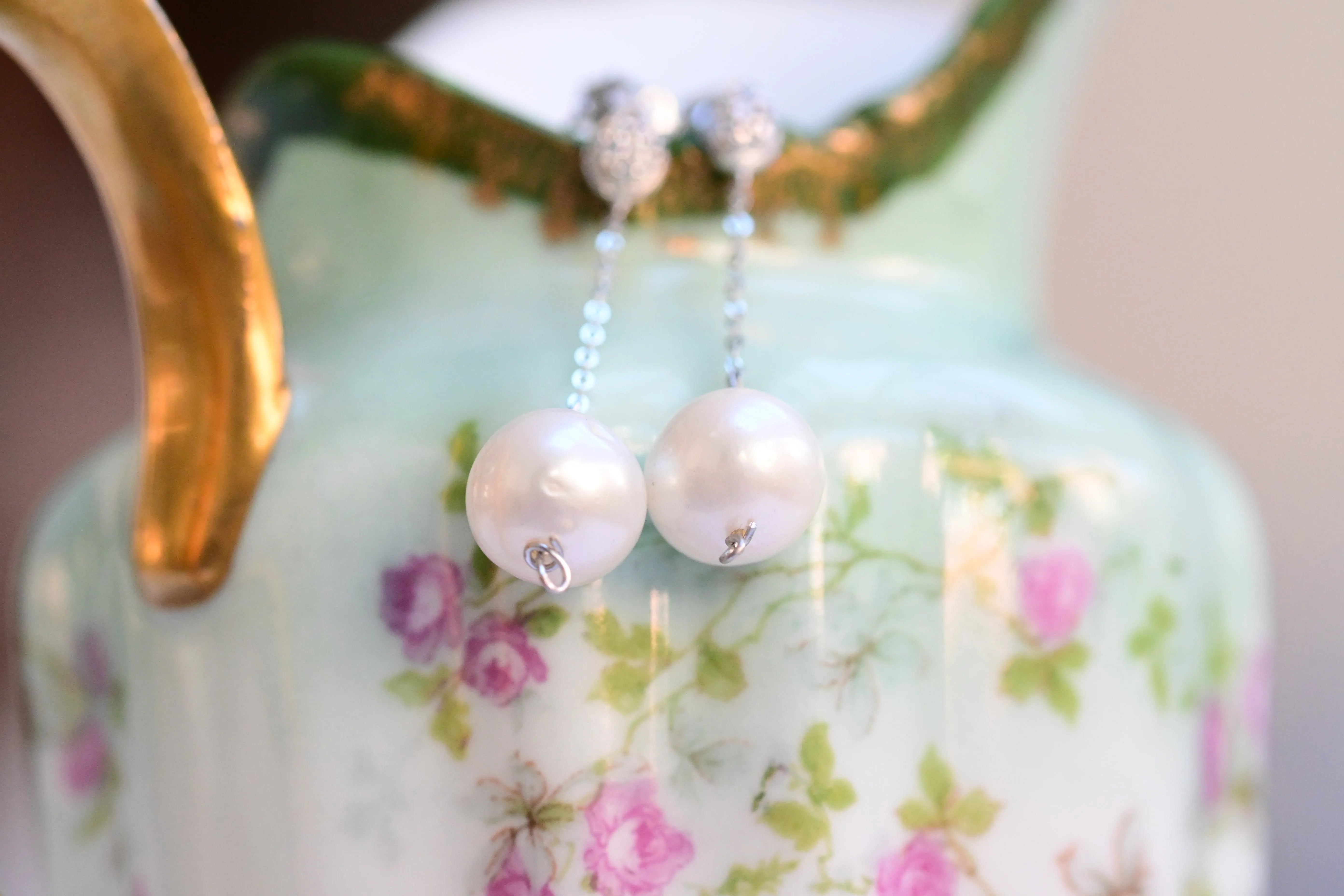 The earrings are adorned with 16 brilliant-cut diamonds, adding a touch of sparkle that perfectly complements the radiant Akoya pearls.