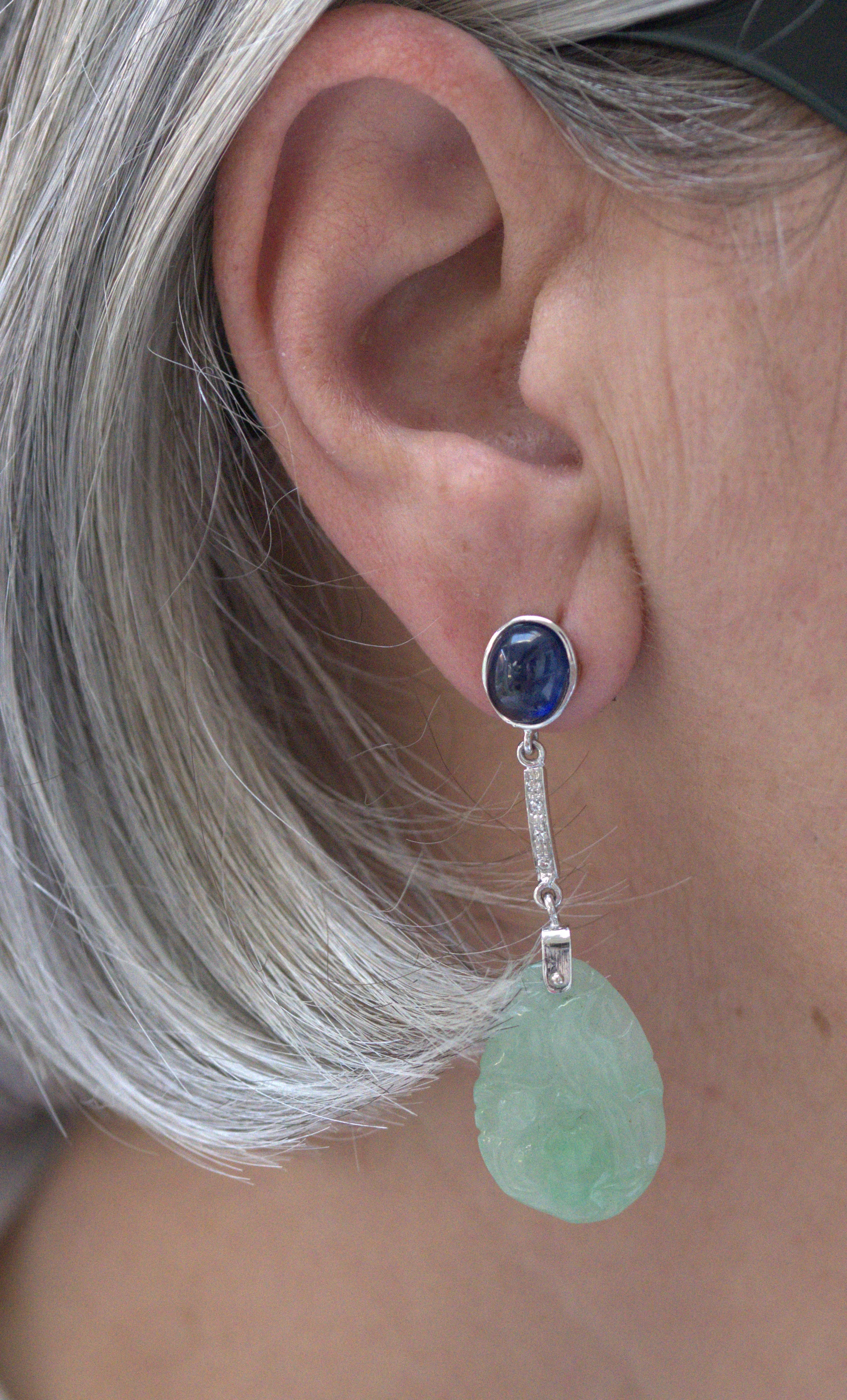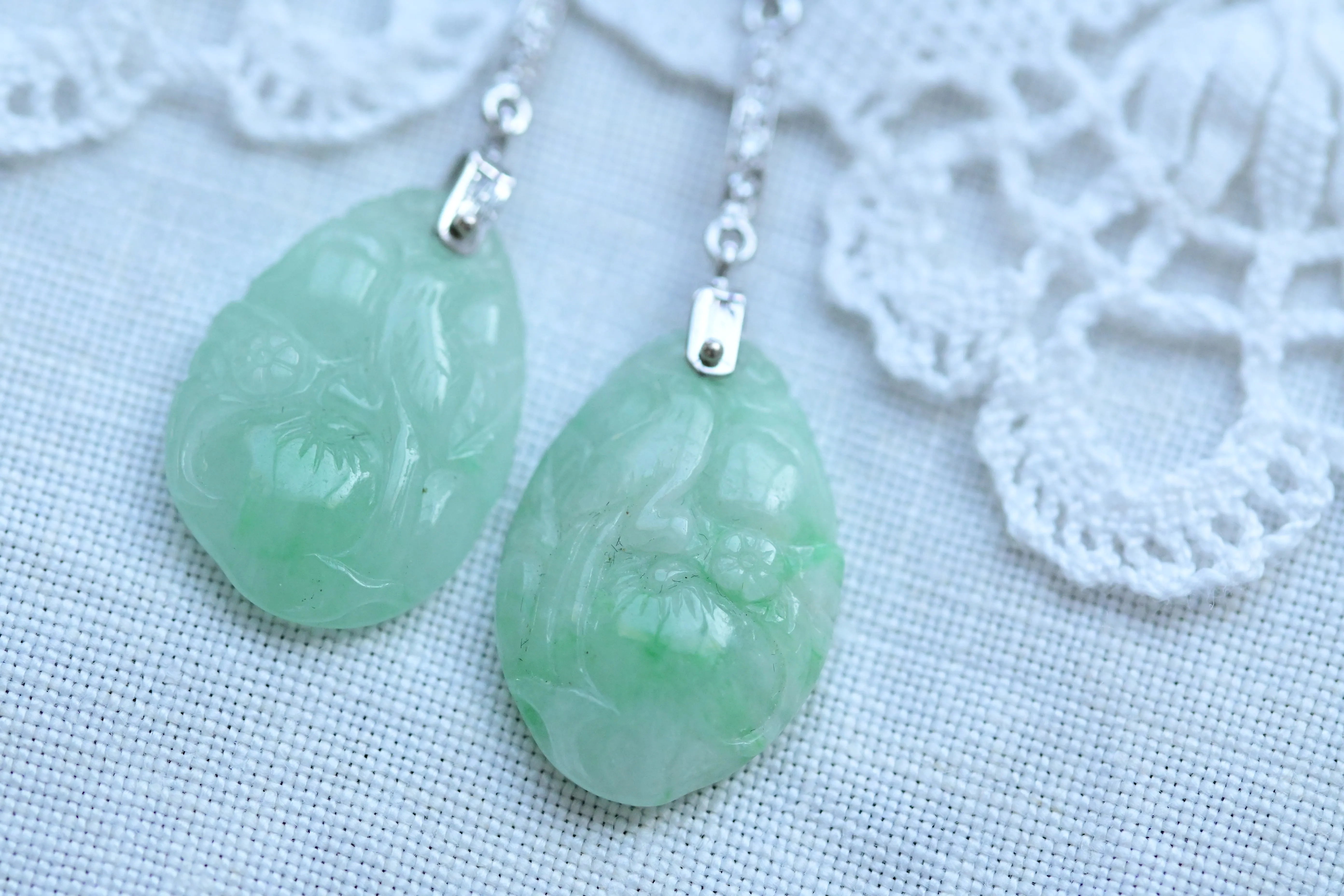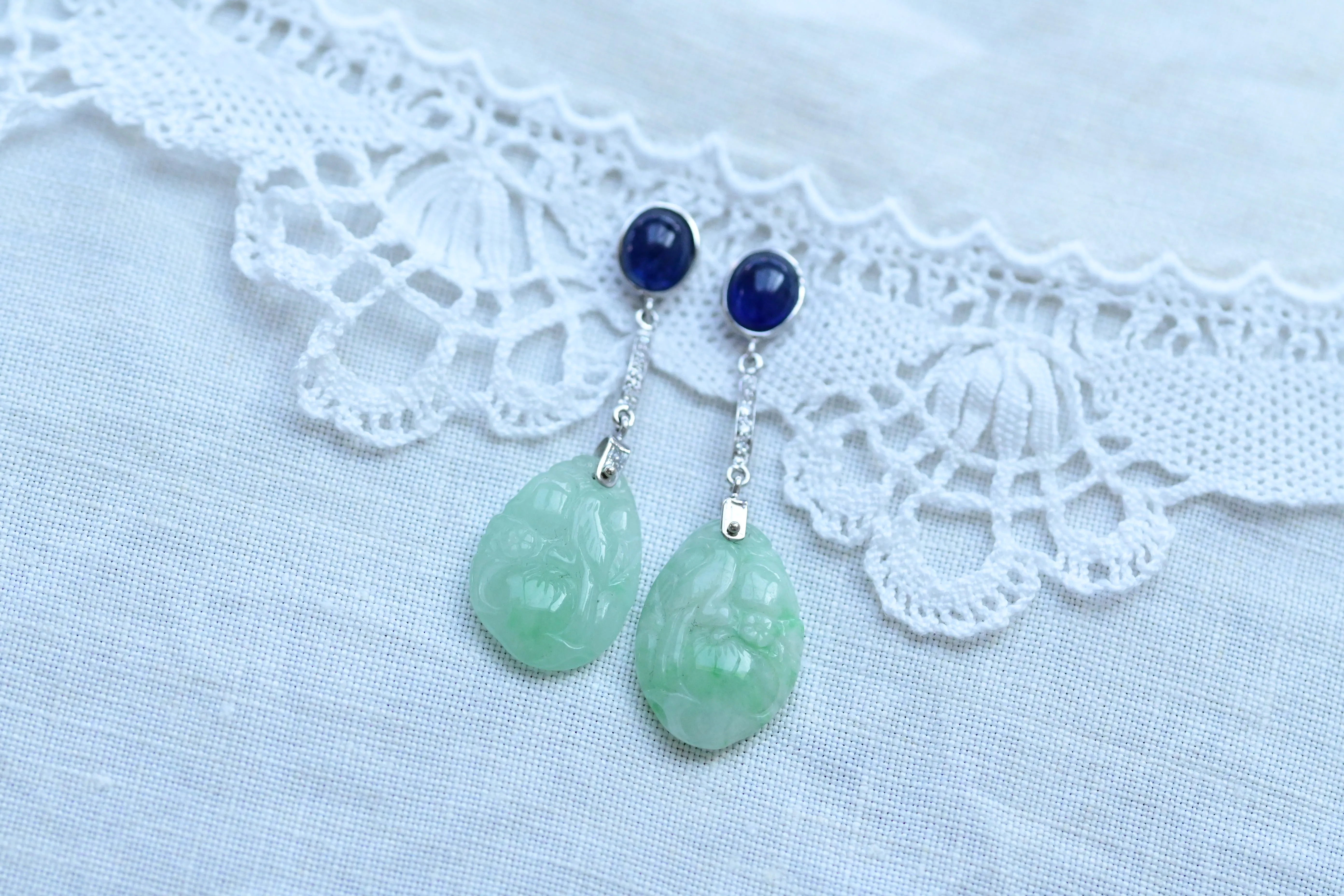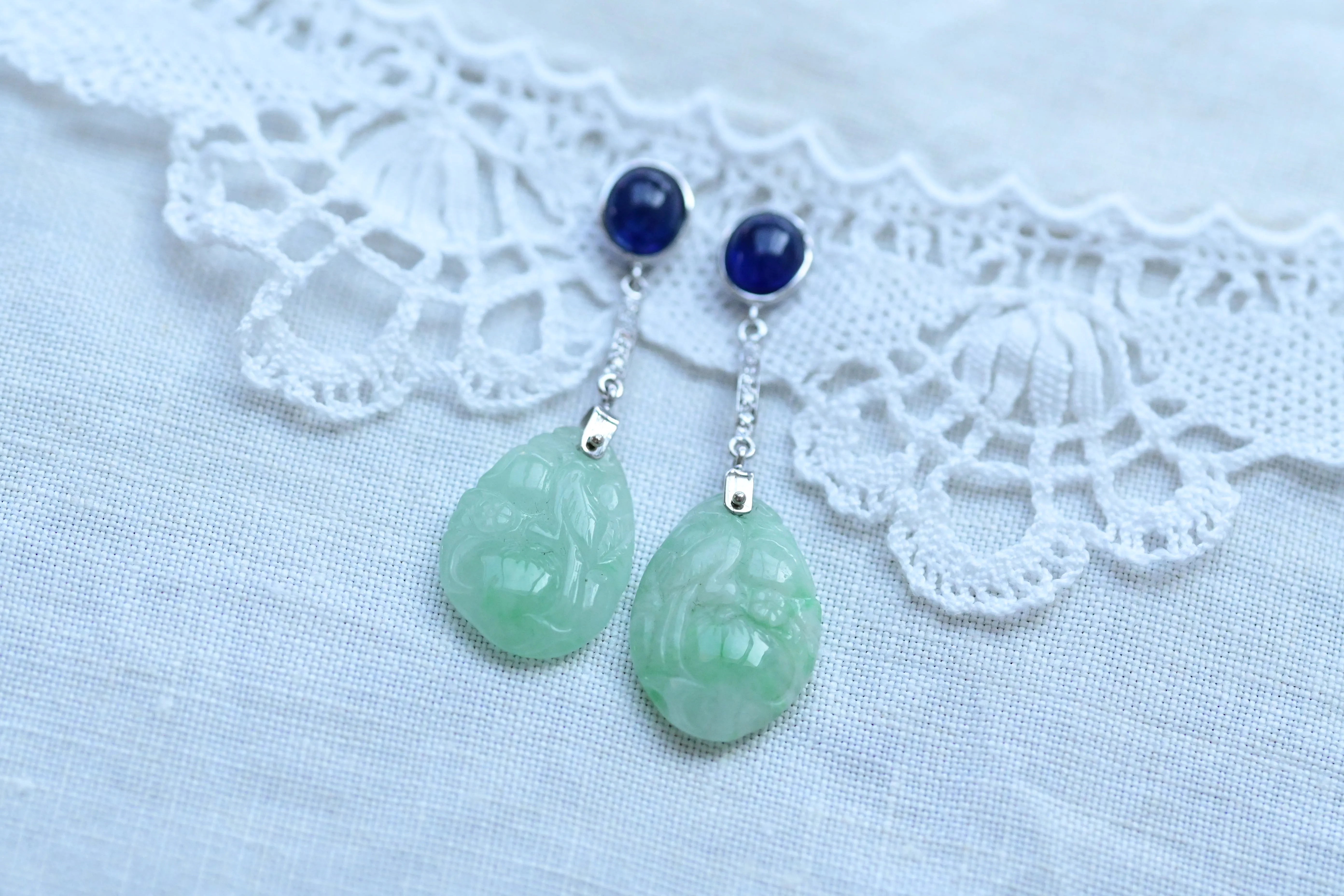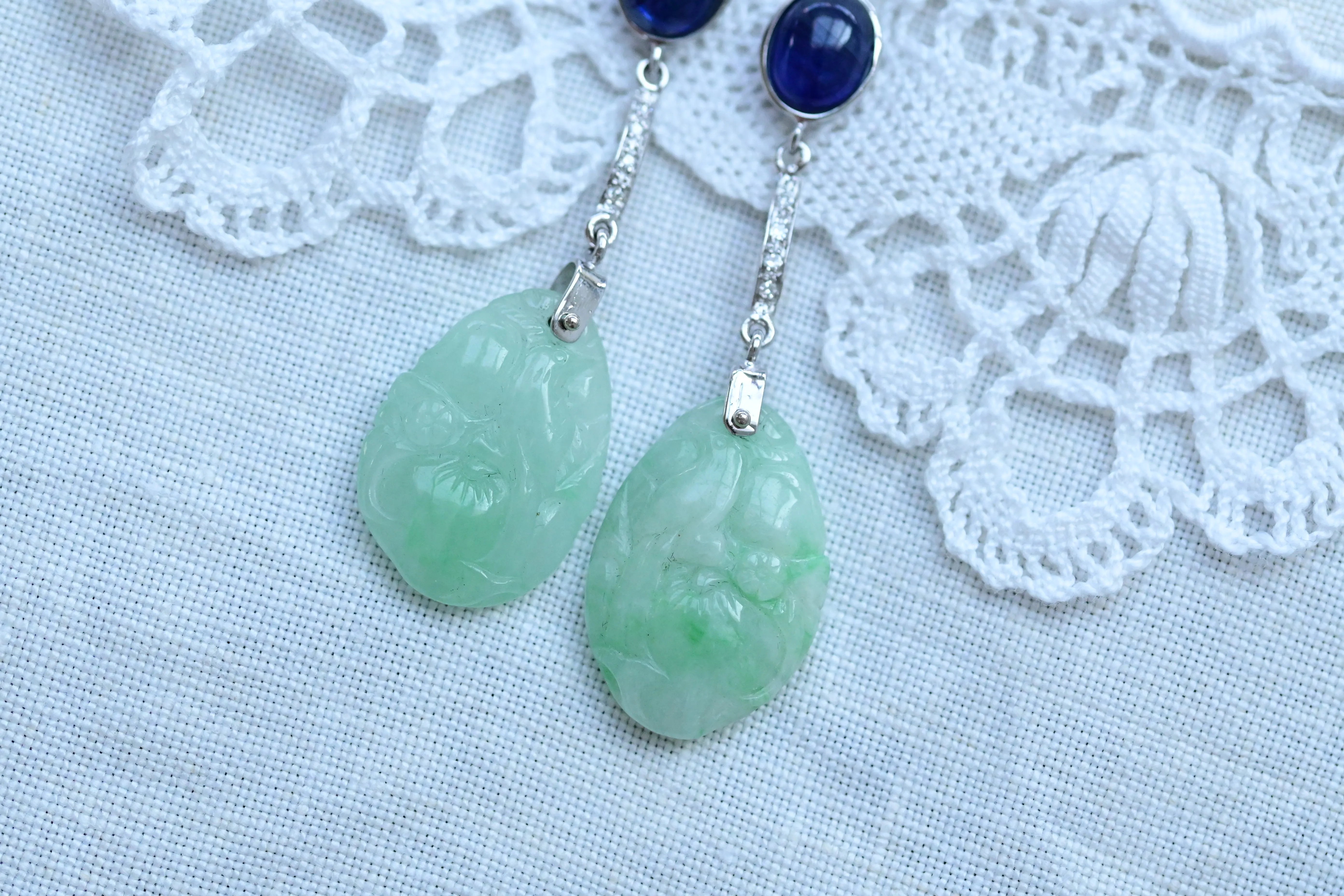 Vintage earrings, in 14K white gold, featuring two drop-shaped carved jade pieces with a beautiful floral engraving and raised leaf motifs. The structure is adorned with 8 diamonds, leading up to two deep dark blue round cut sapphires.