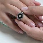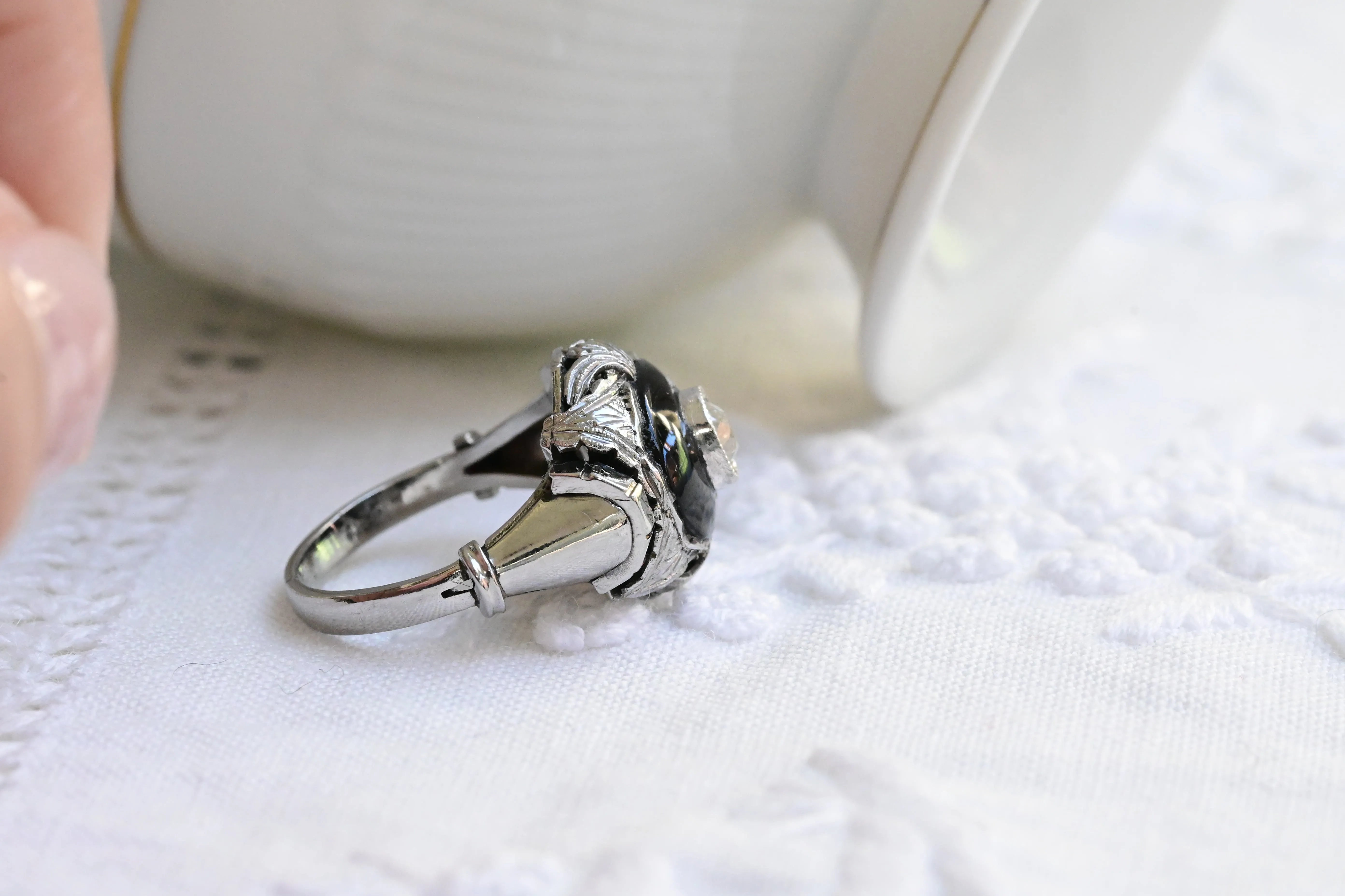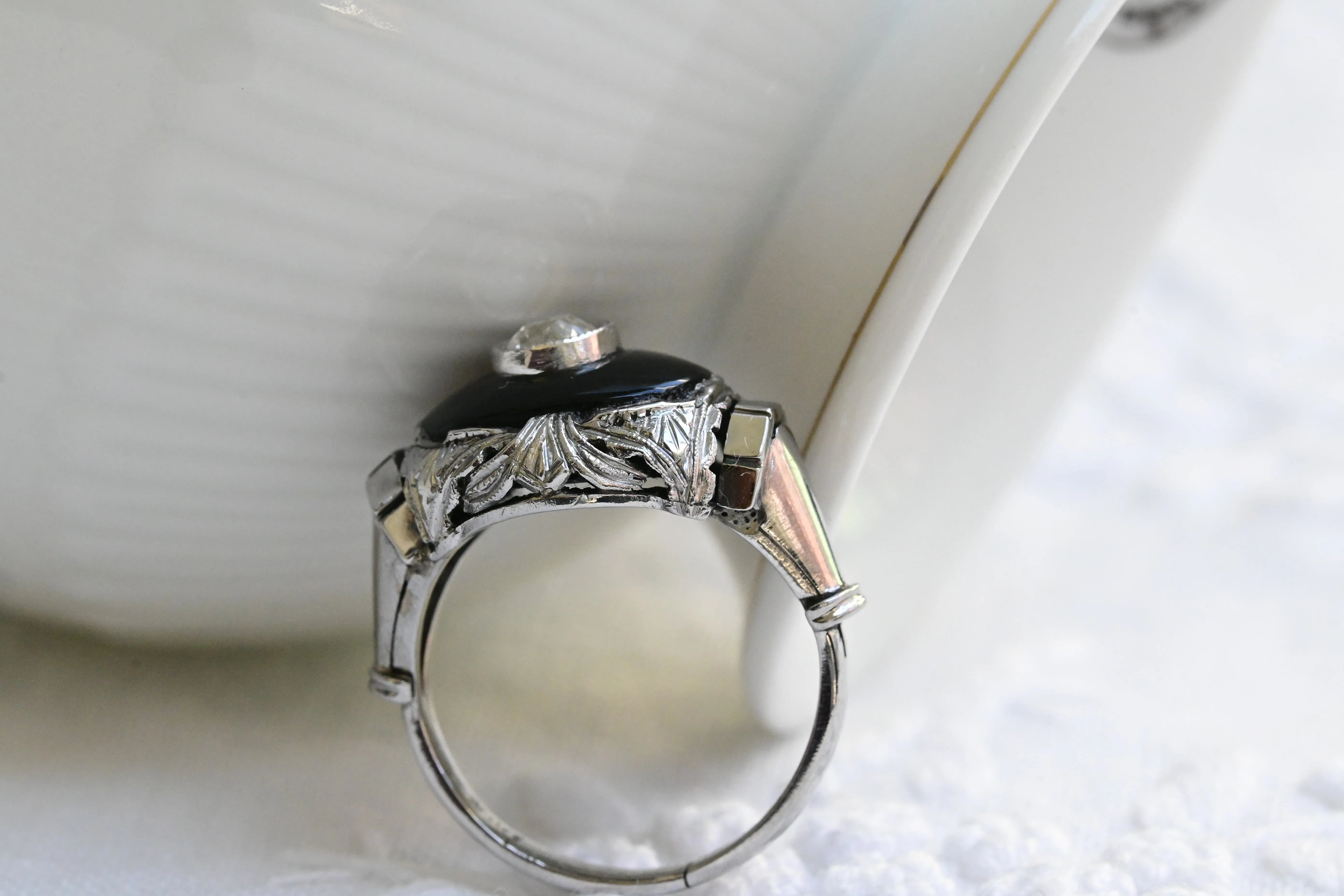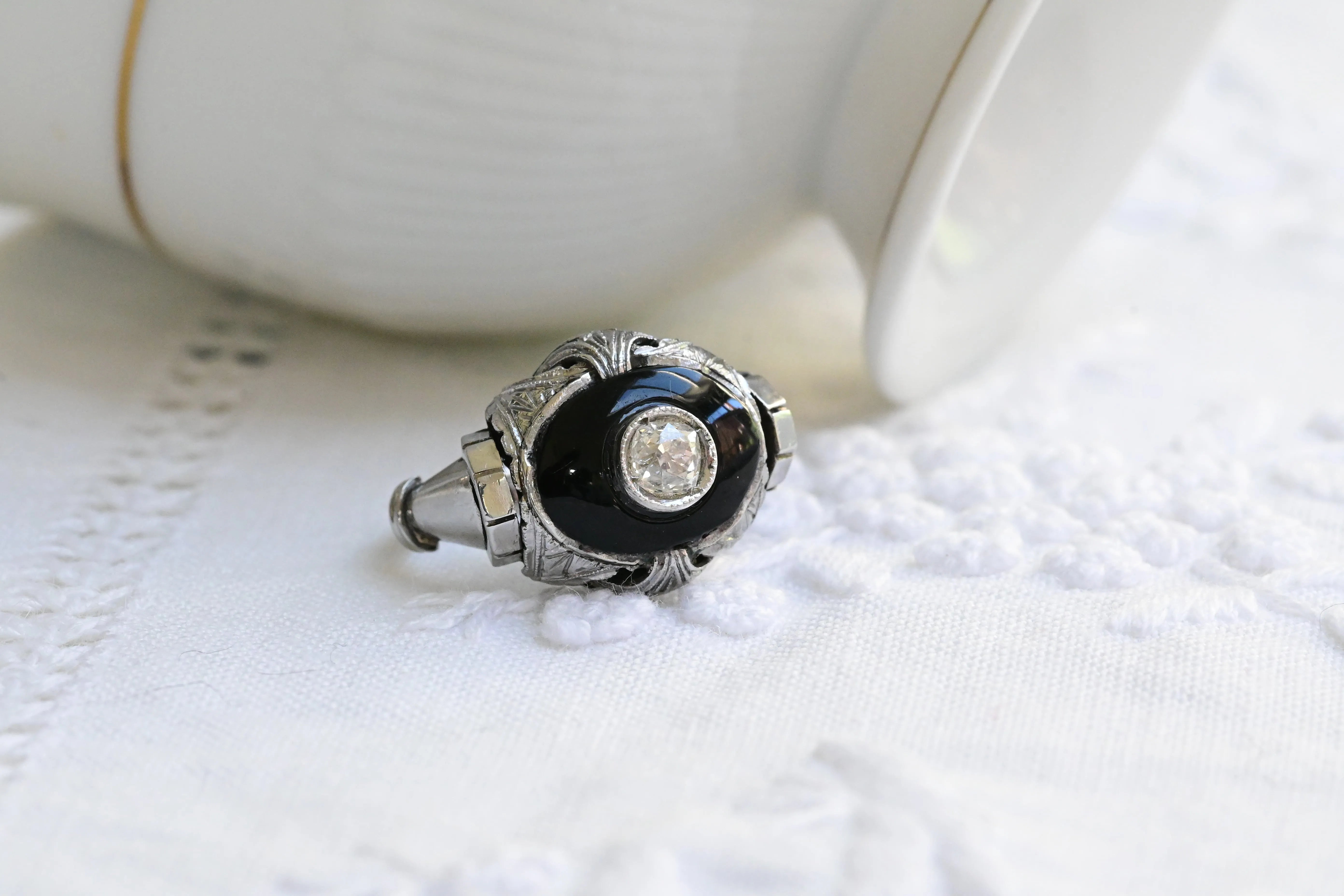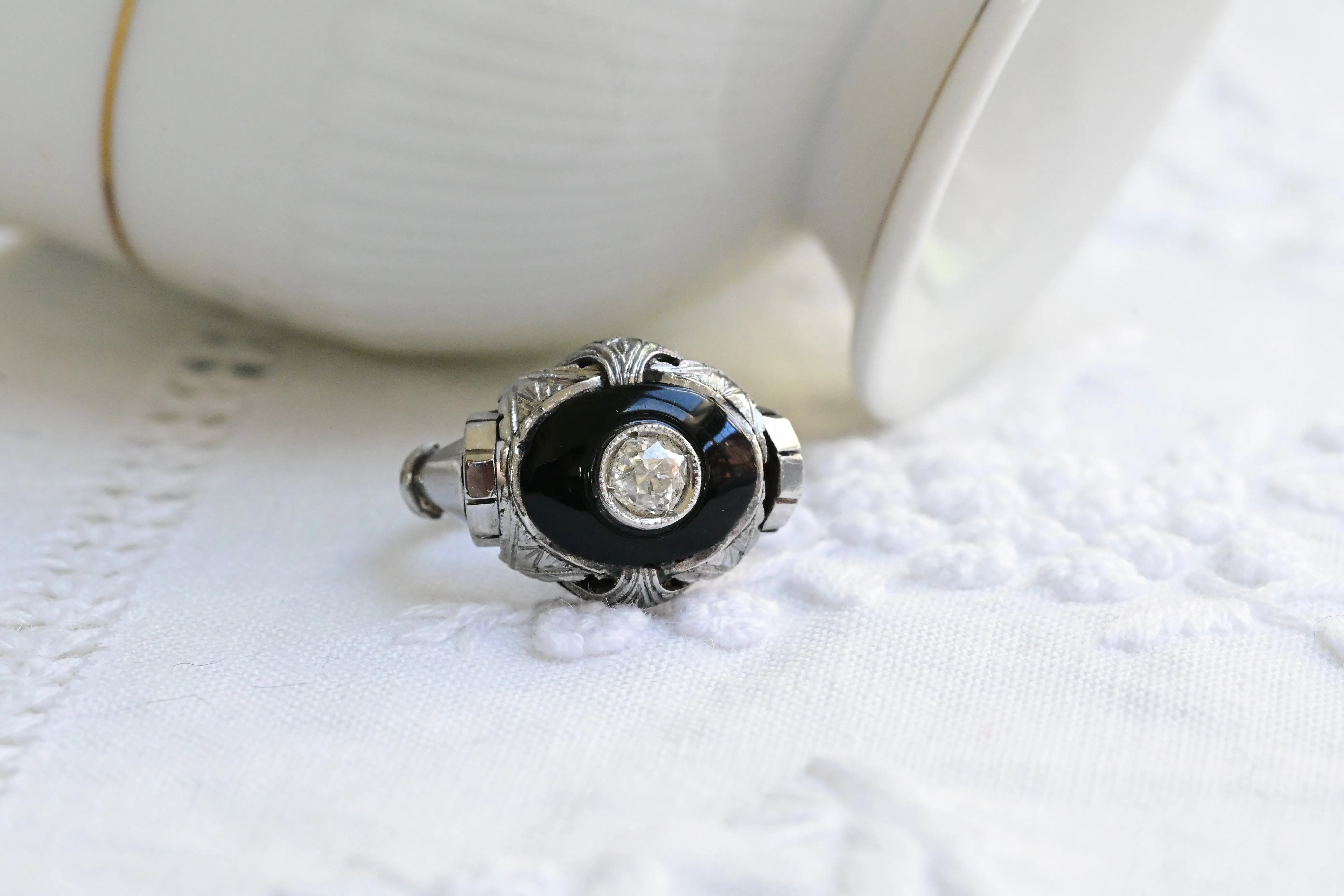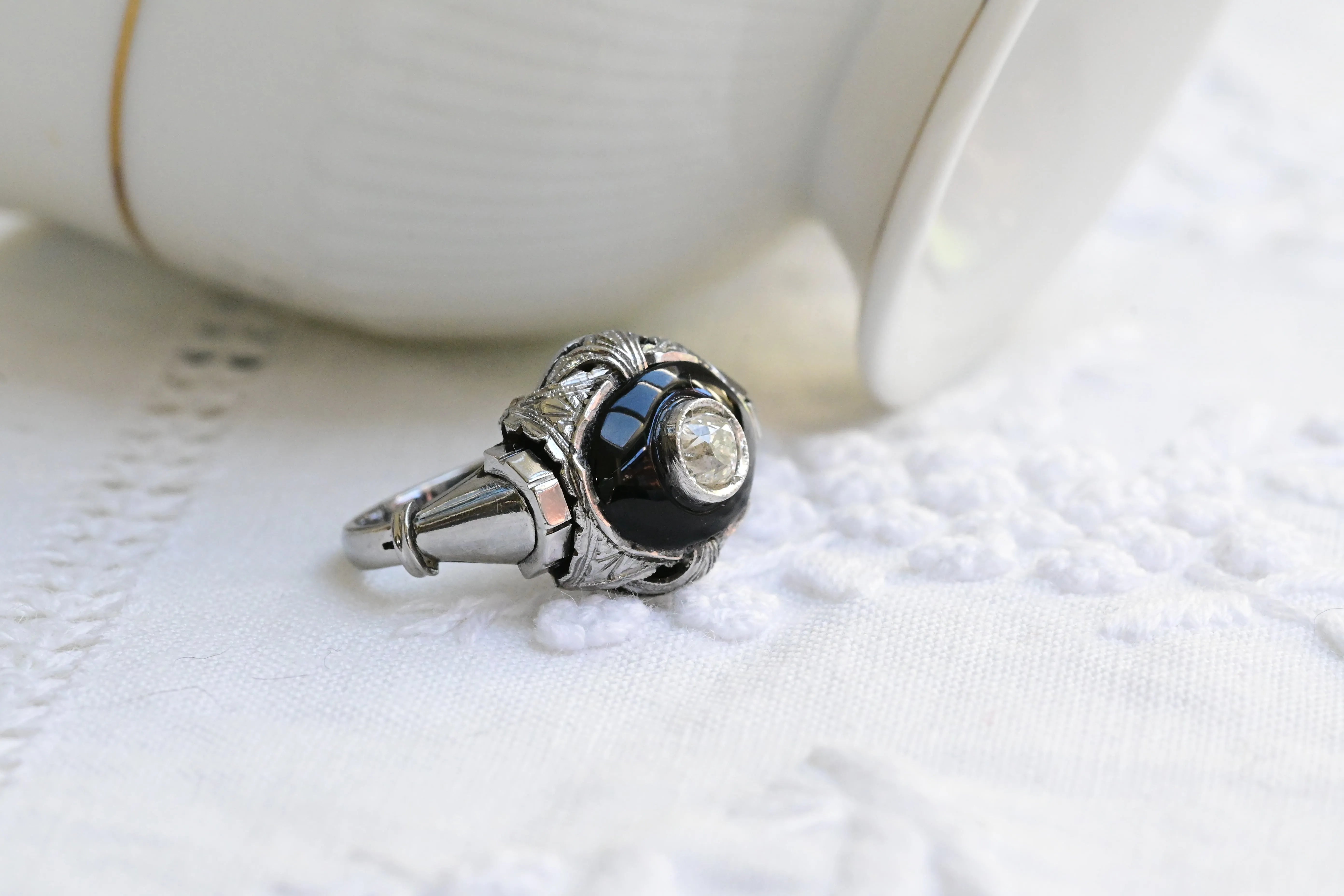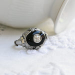 Vintage ring in 18 K white gold featuring a central old european cut diamond set on a polished black onyx and embellished with delicate geometric detailing on the shoulders