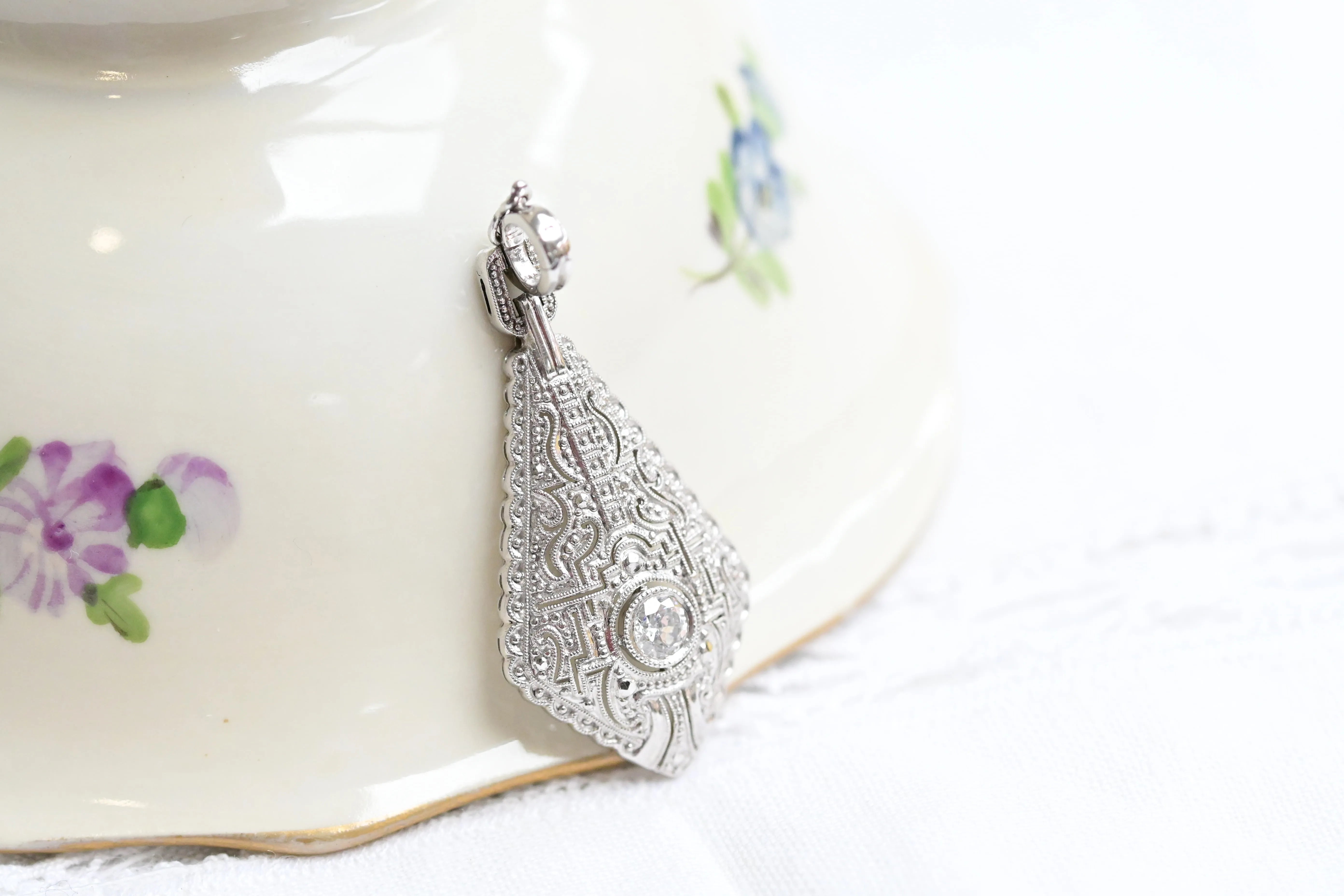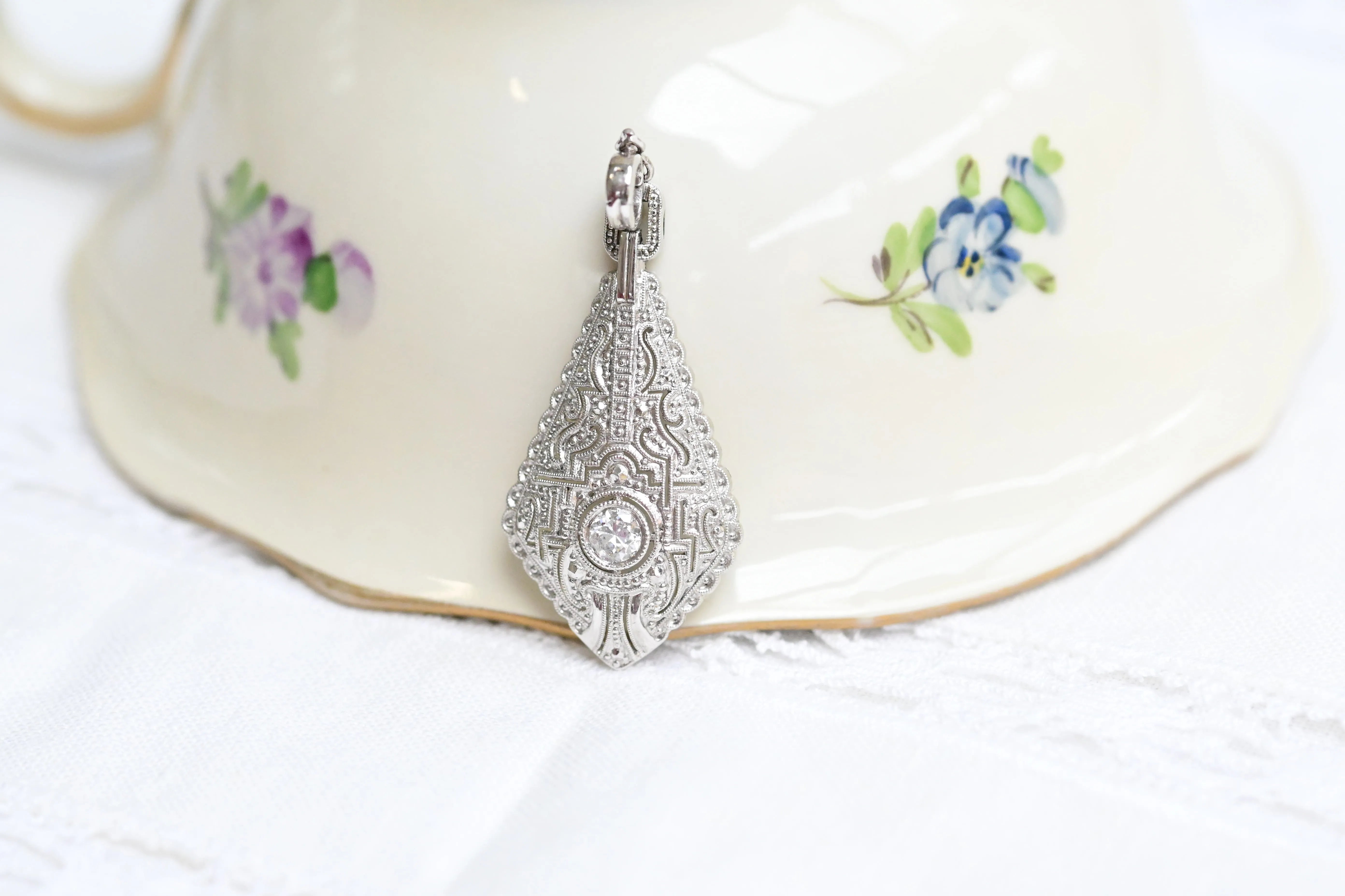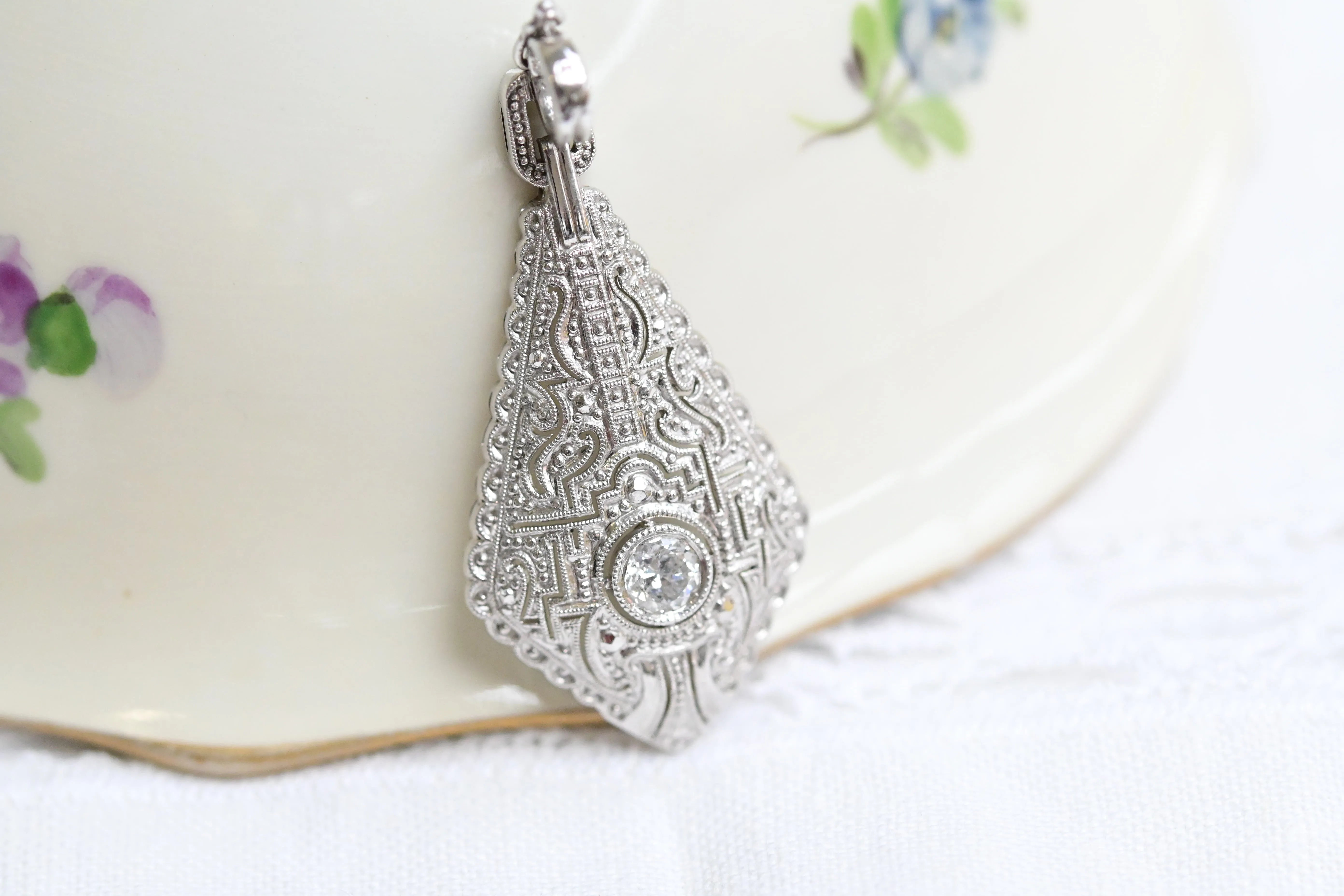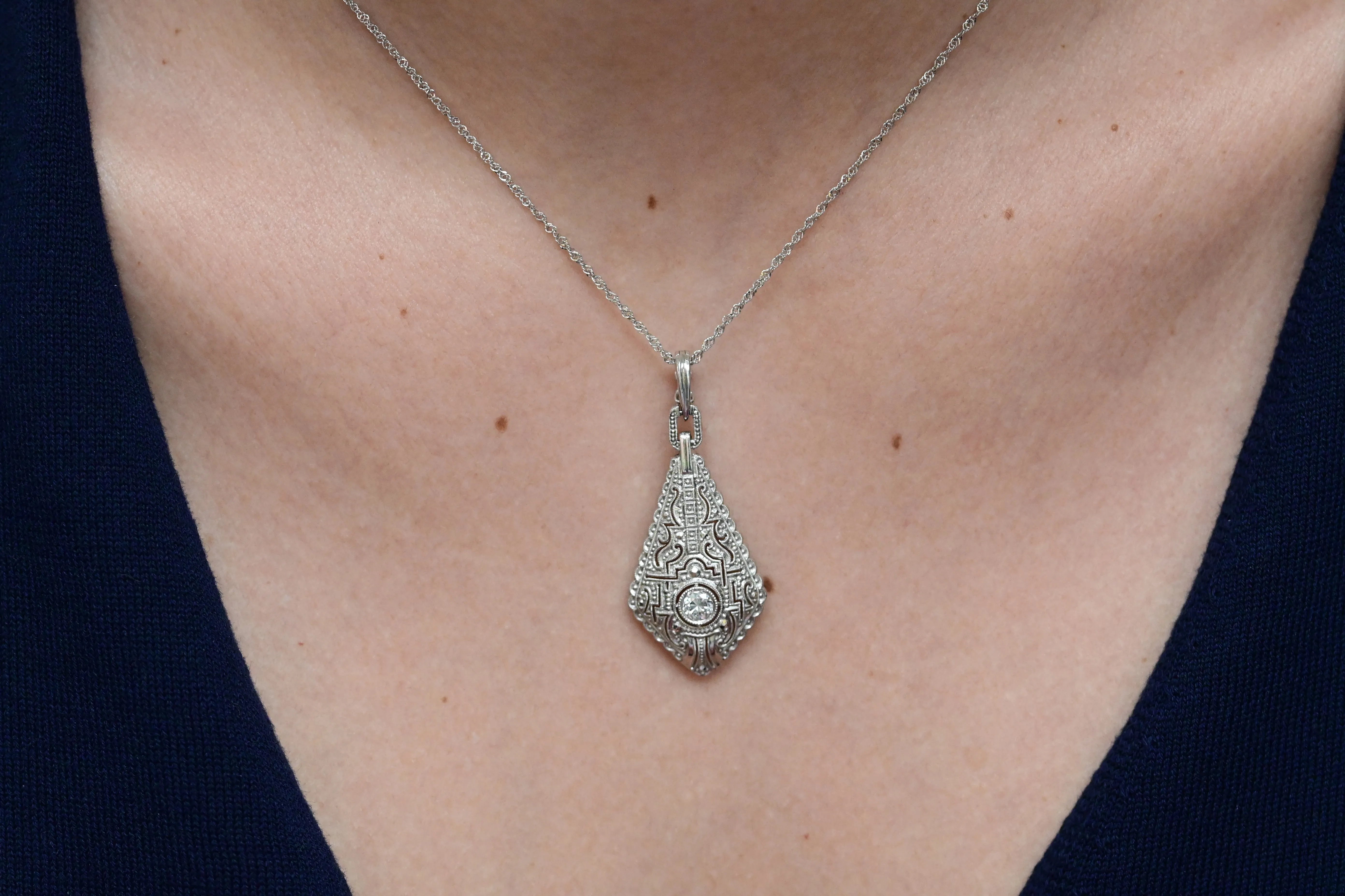 Vintage necklace, made of white gold, with a intricate geometric filigree patterns with a central brilliant cut diamond.