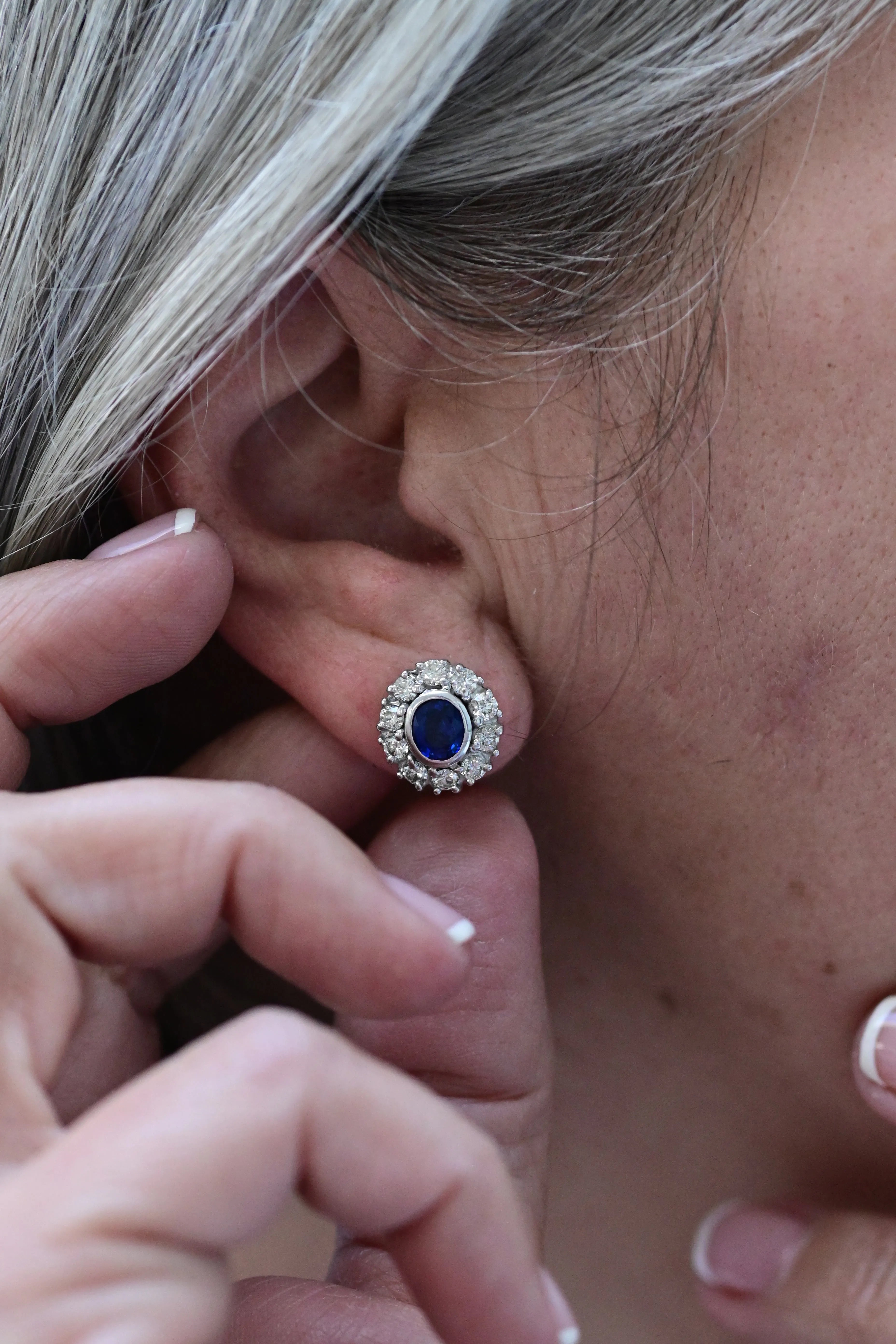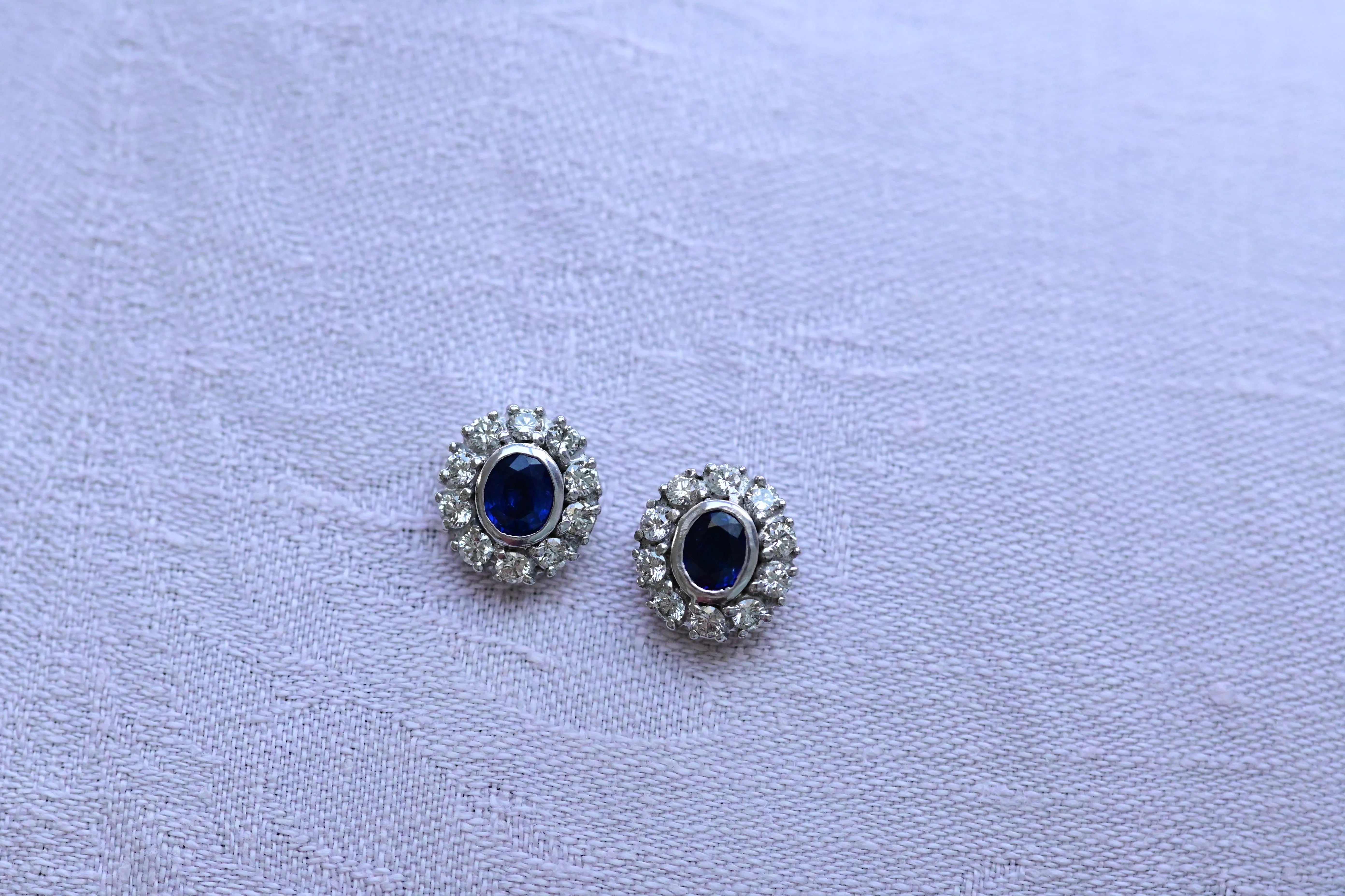 Vintage rosette earrings, from the mid 20th century, in 18 K white gold, with central oval cut sapphire and surrounded by 10 brilliant cut diamonds, each earring. Pressure closure.