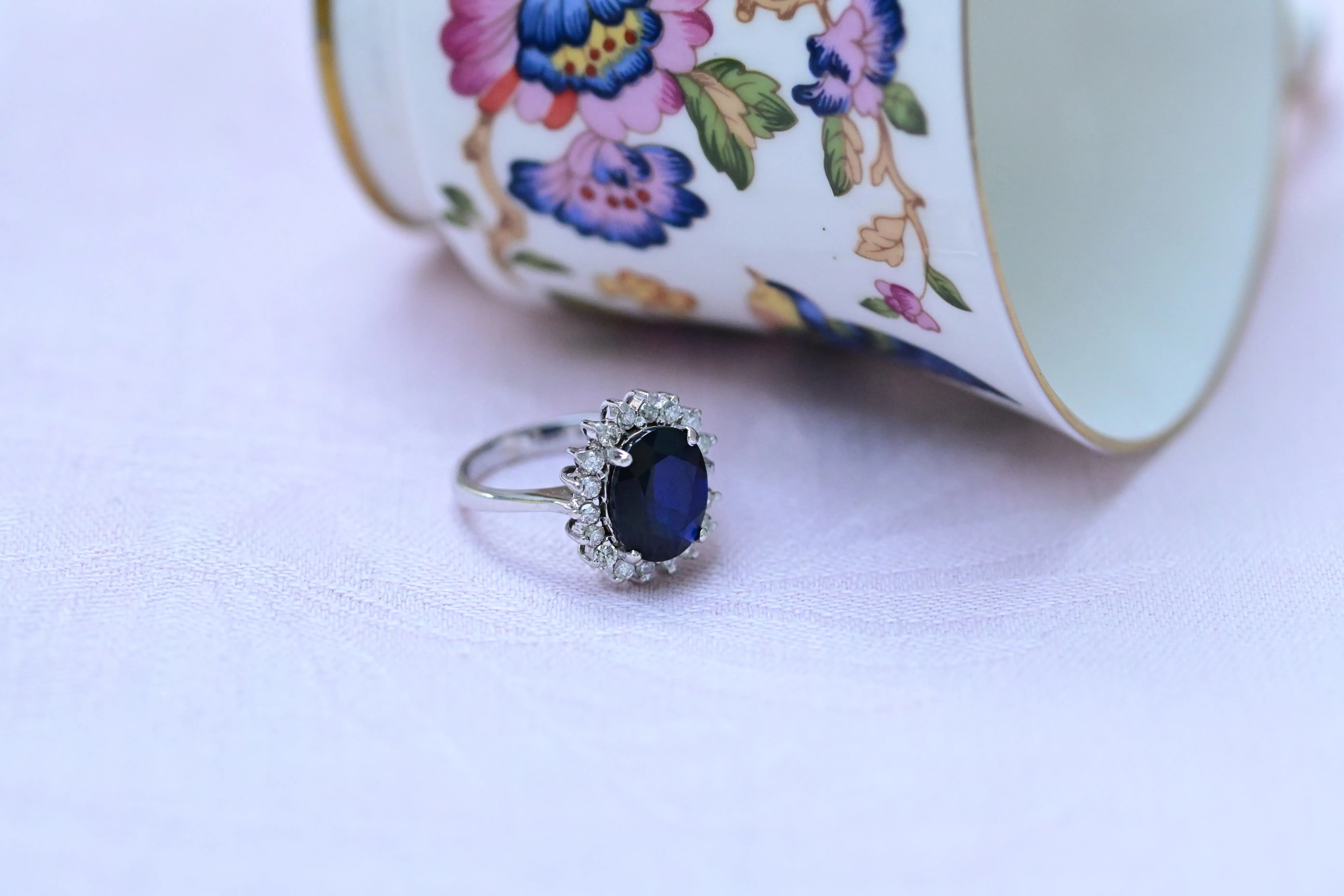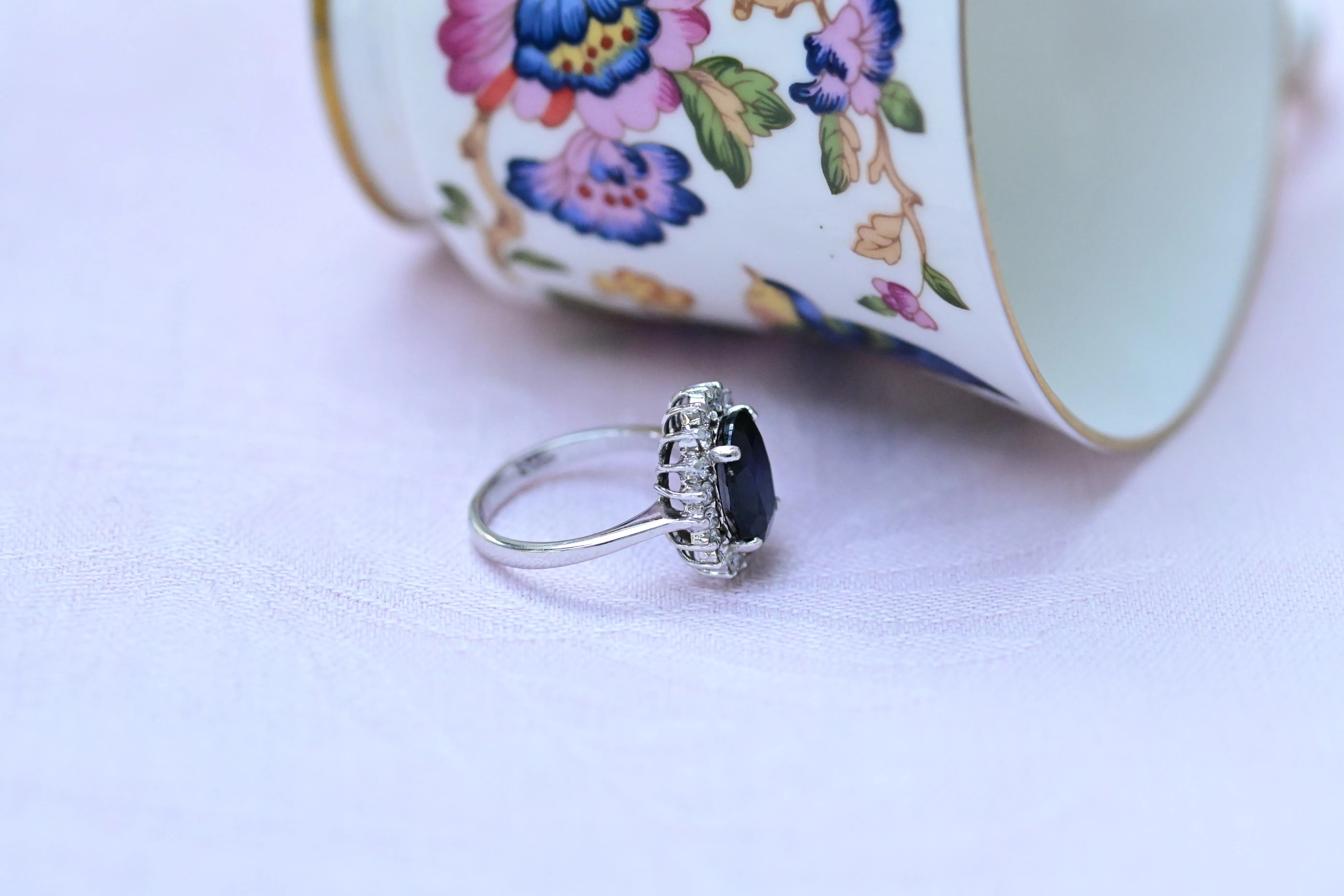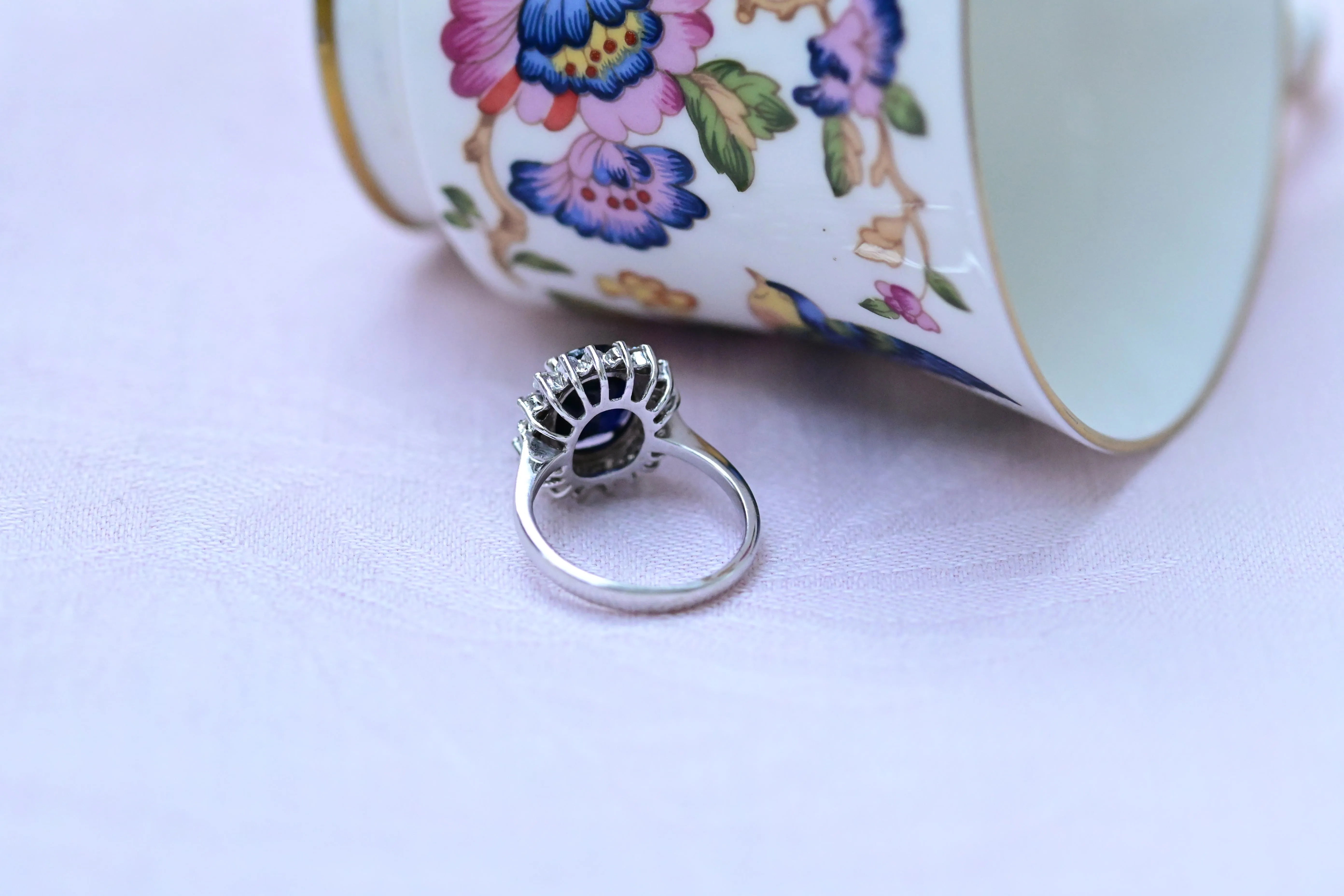 Vintage ring, made of 18 K white gold, with a central oval cut sapphire and a halo of 18 diamonds.