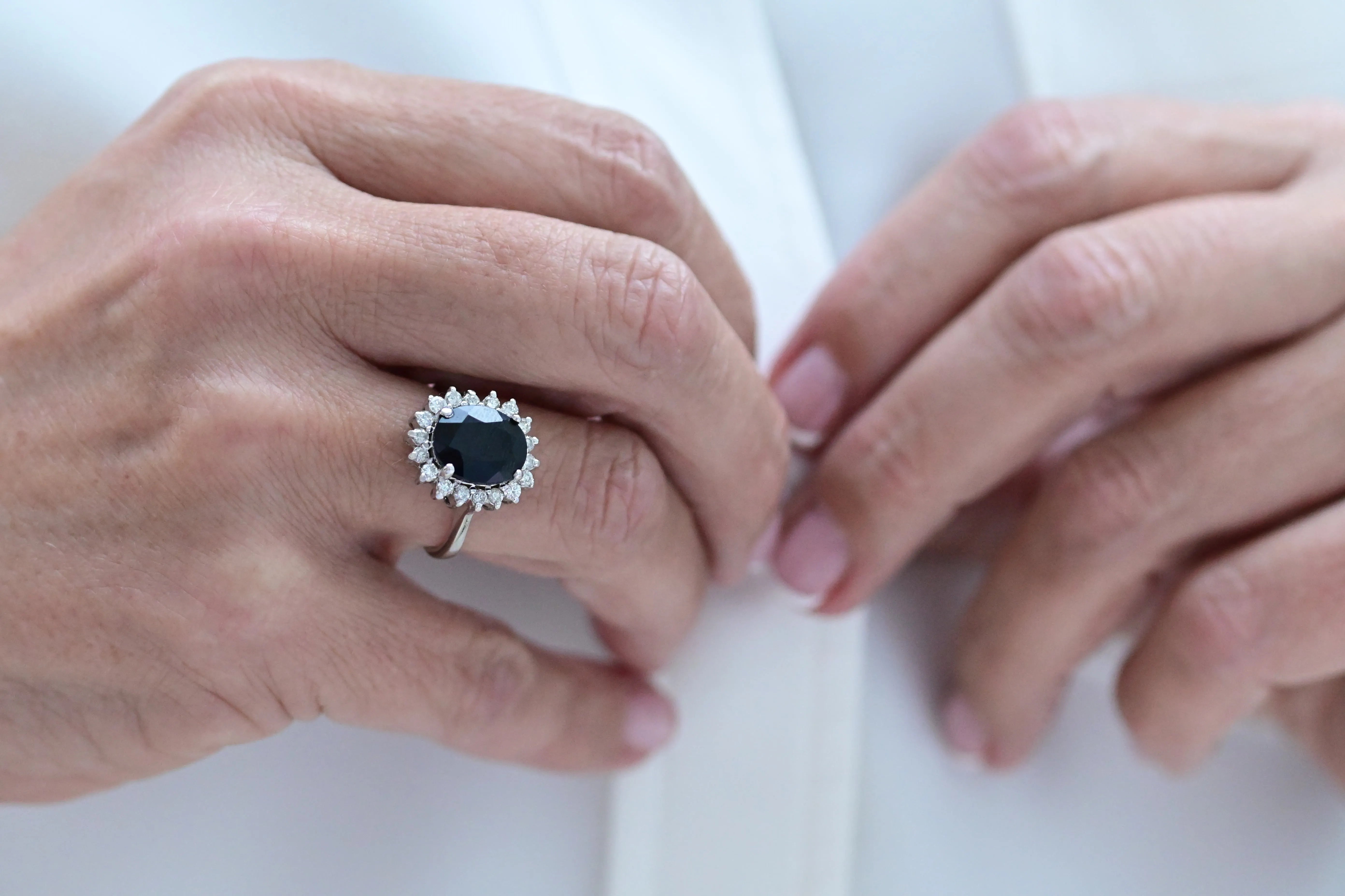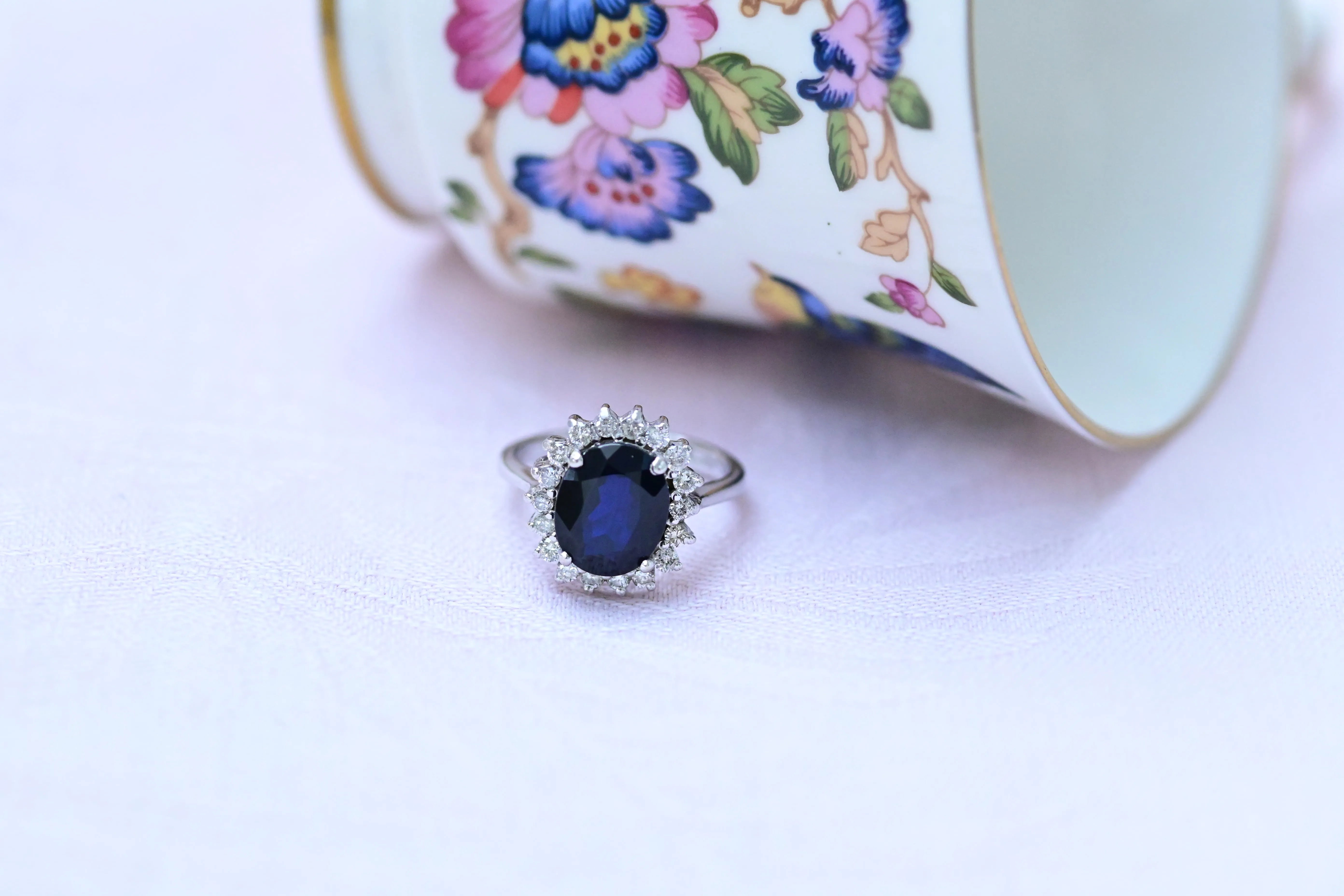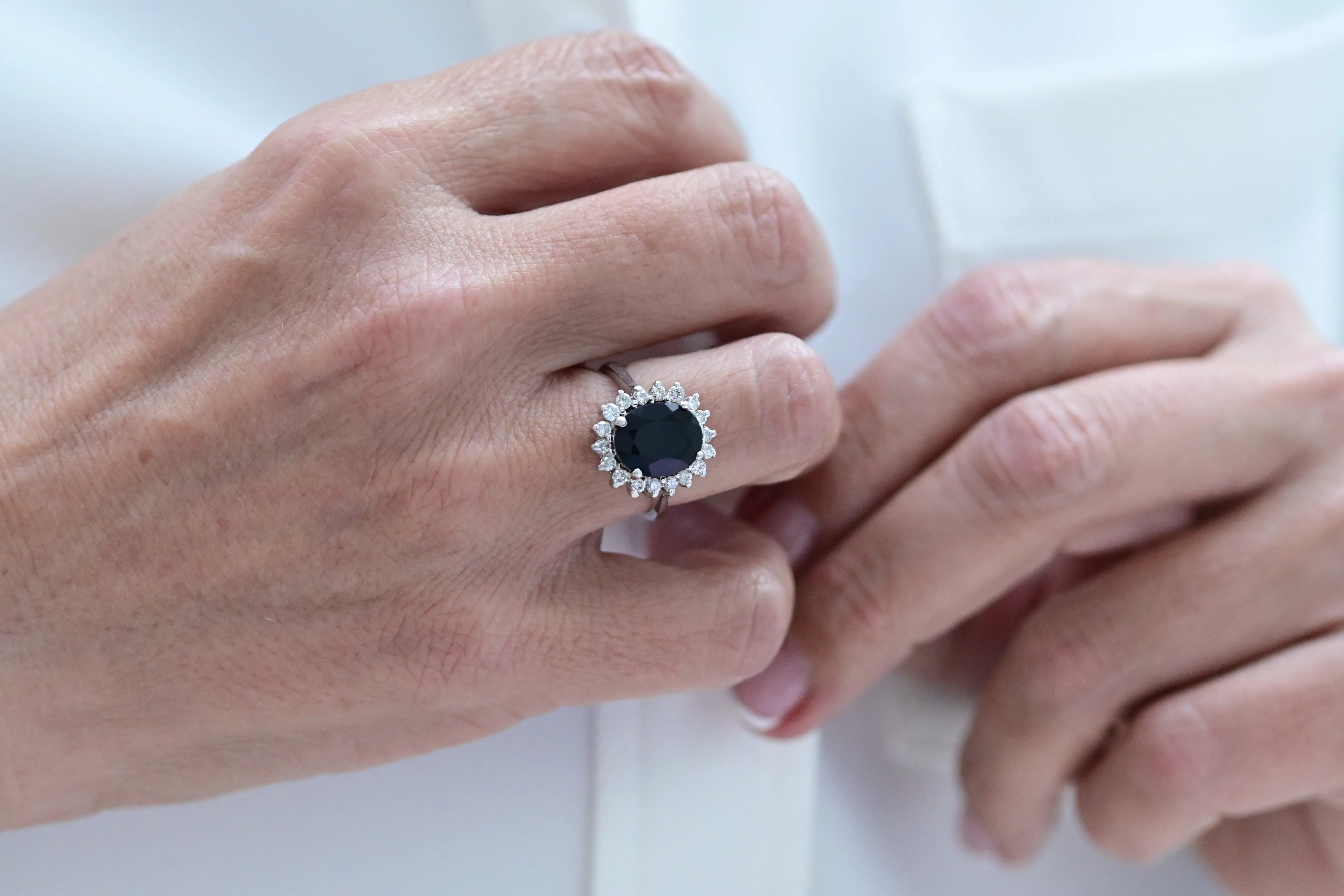 Vintage ring, made of 18 K white gold, with a central oval cut sapphire and a halo of 18 diamonds.