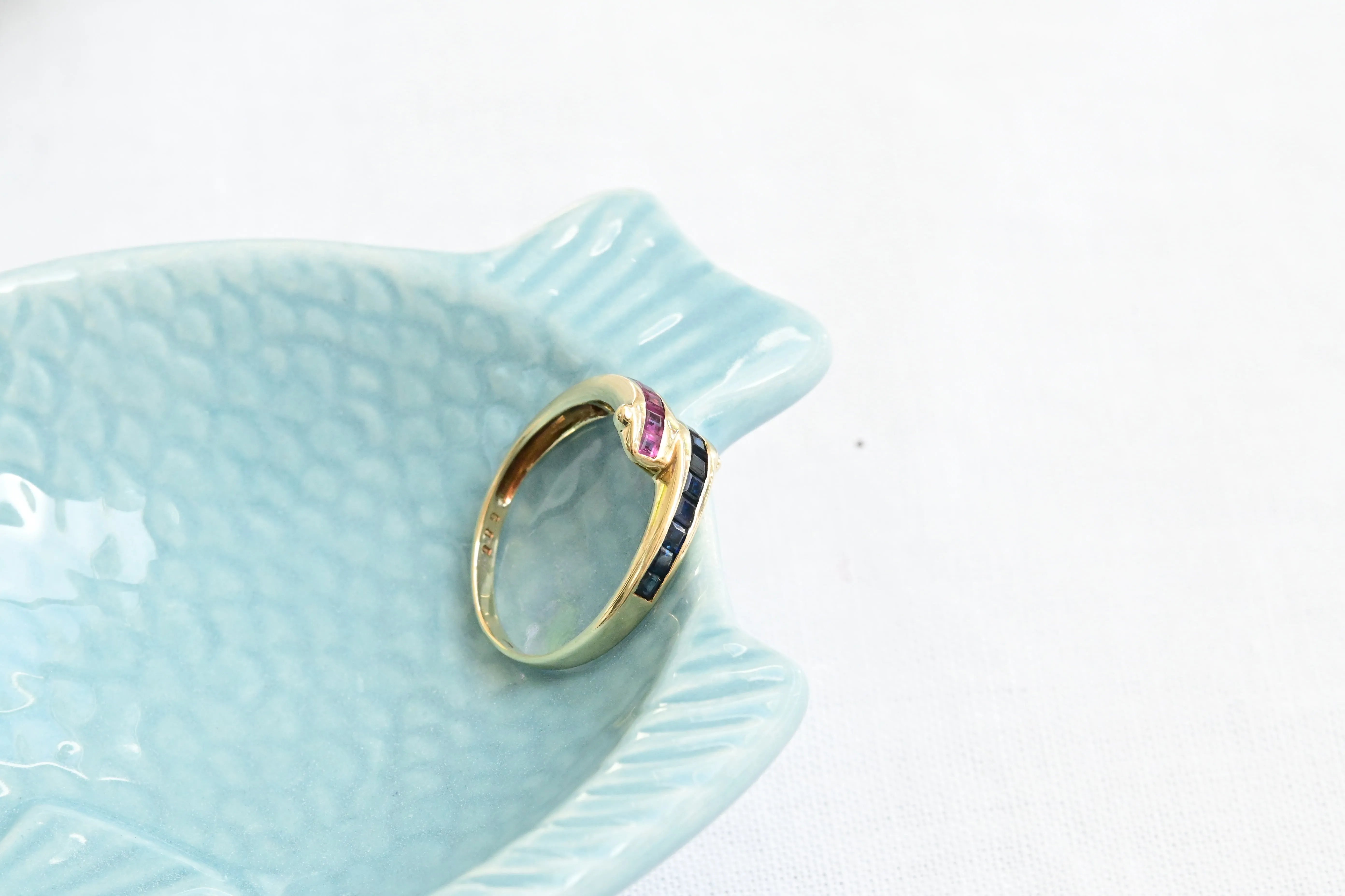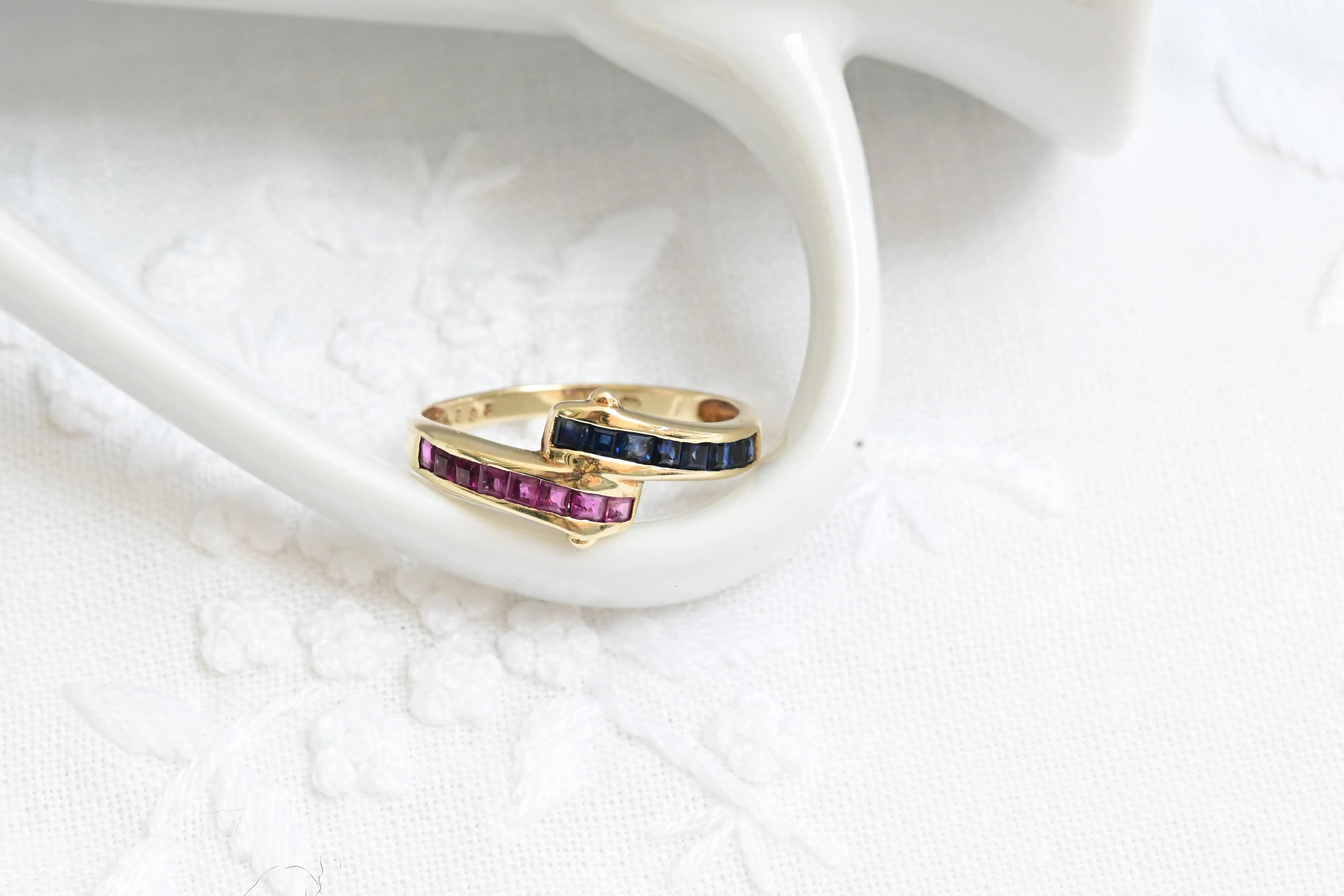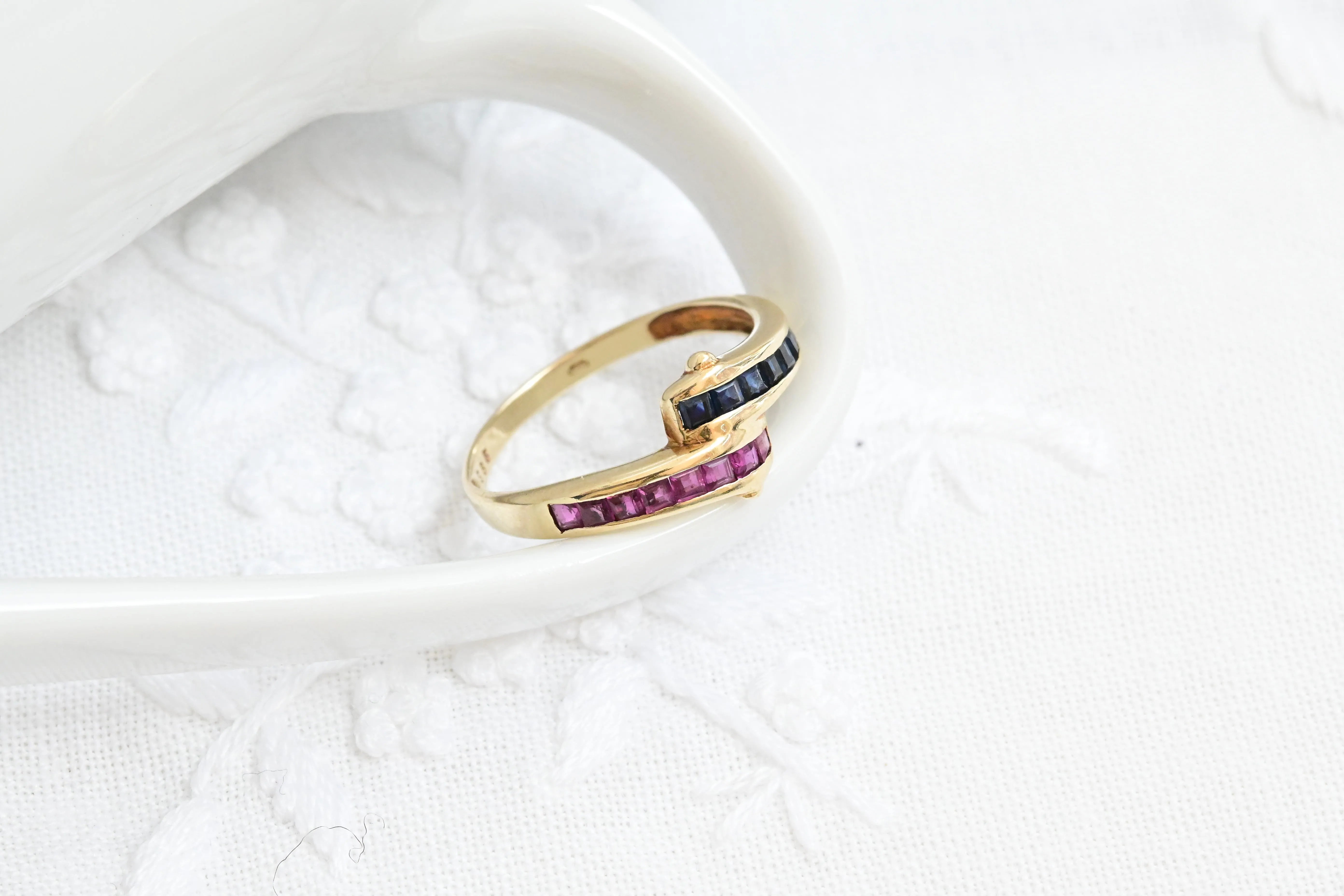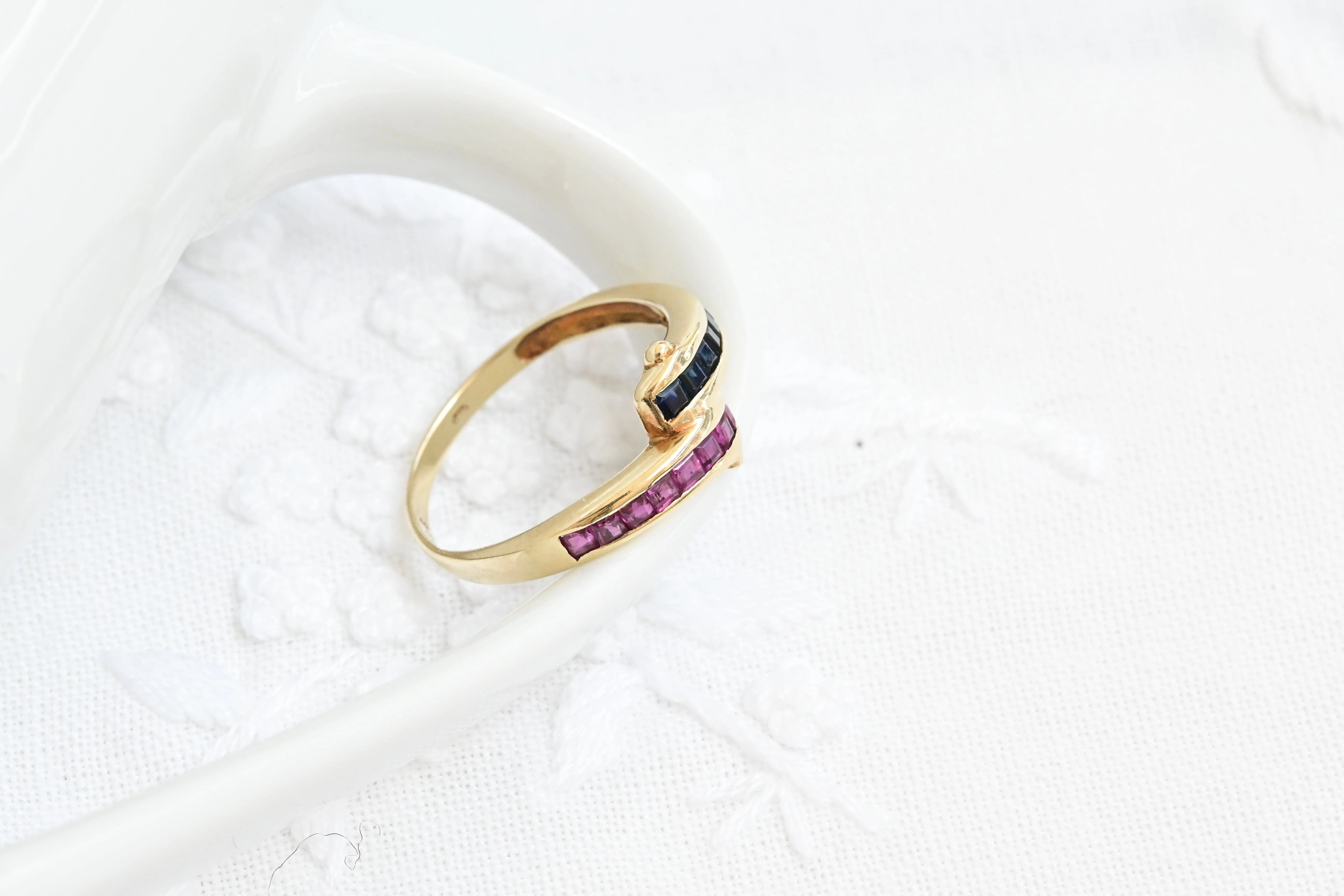 Vintage ring, from the late 20th century, made of 14 K yellow gold, with two diagonally interlocking arms, each with eight carre cut sapphires and rubies.