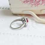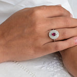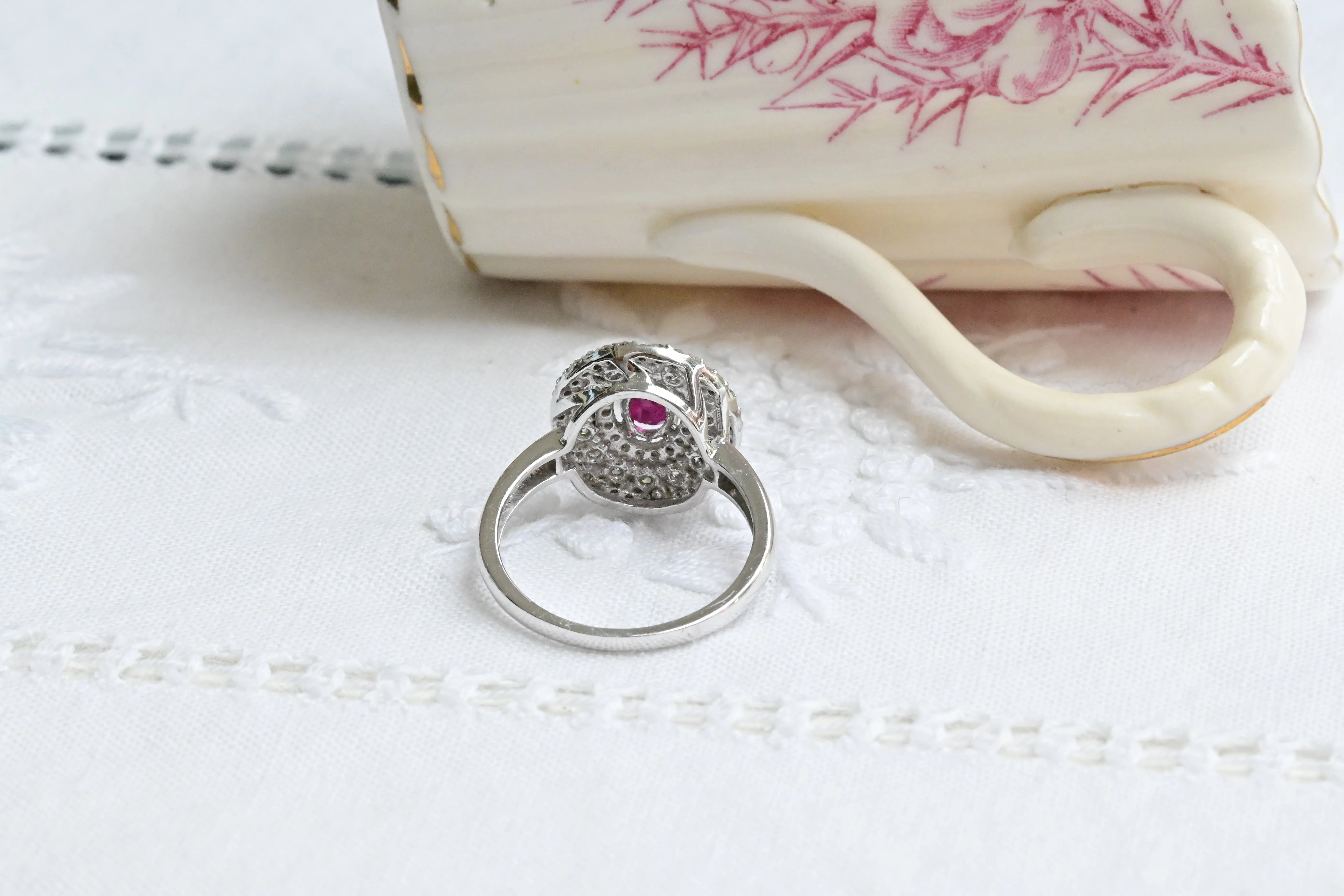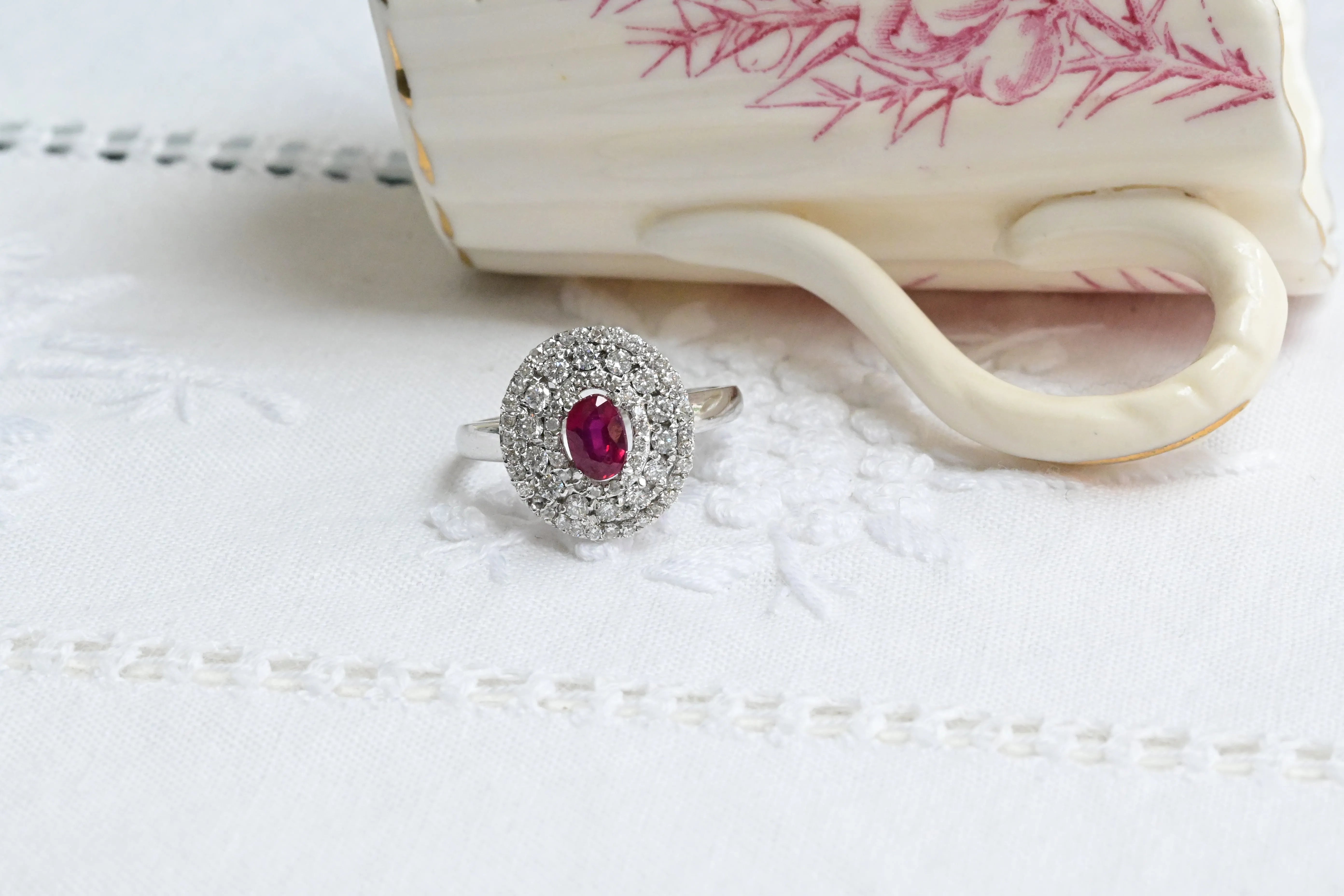Vintage ring crafted in 18K white gold, featuring a central oval cut ruby surrounded by three halos of diamonds with a total of 18, 14, and 34 round brilliant cut diamonds, forming a beautiful and elegant oval design