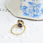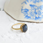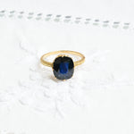 Vintage ring crafted in 18K yellow gold featuring a central oval cut sapphire set in an elegant openwork gallery and a delicately engraved shank