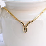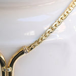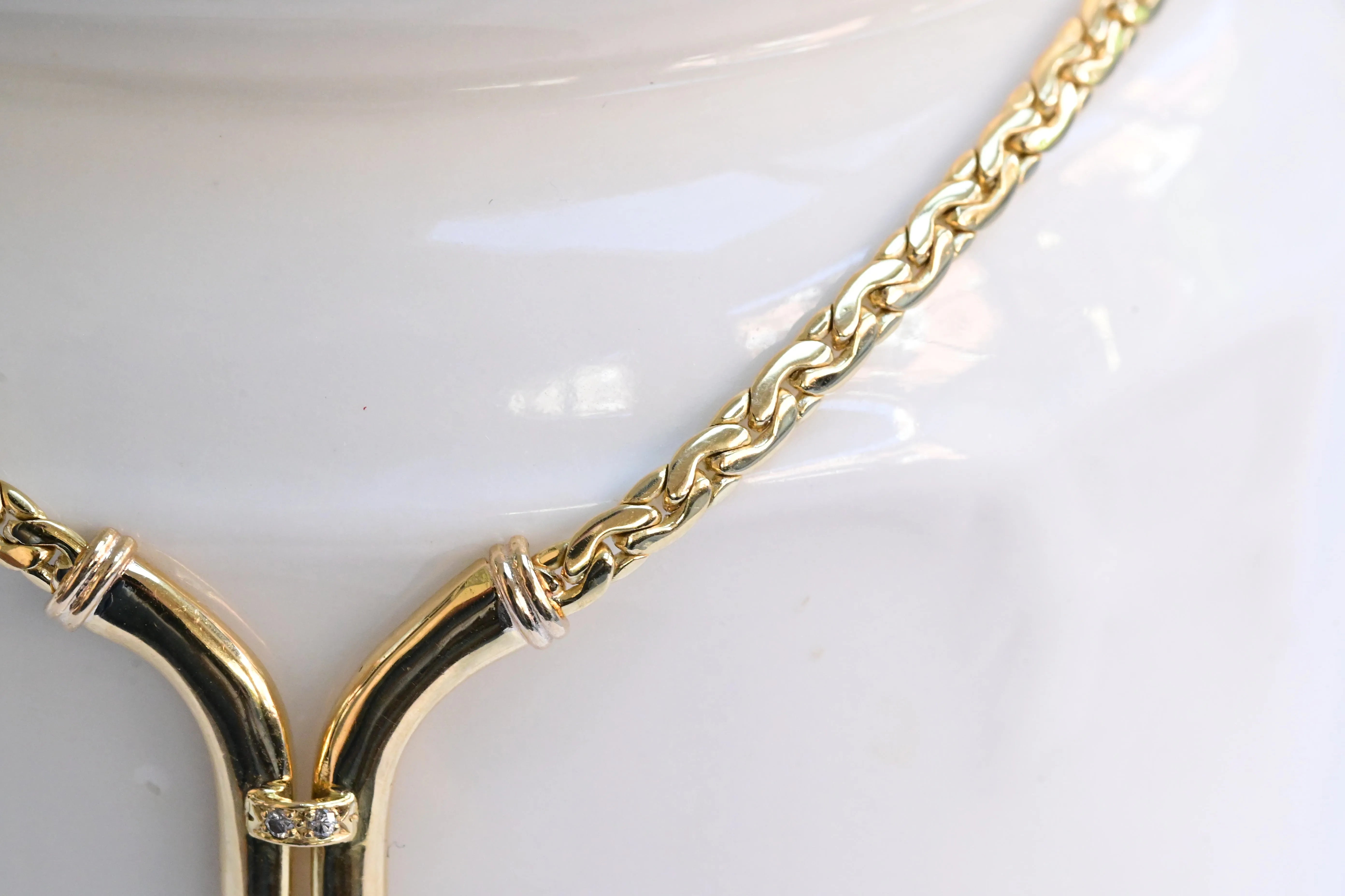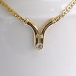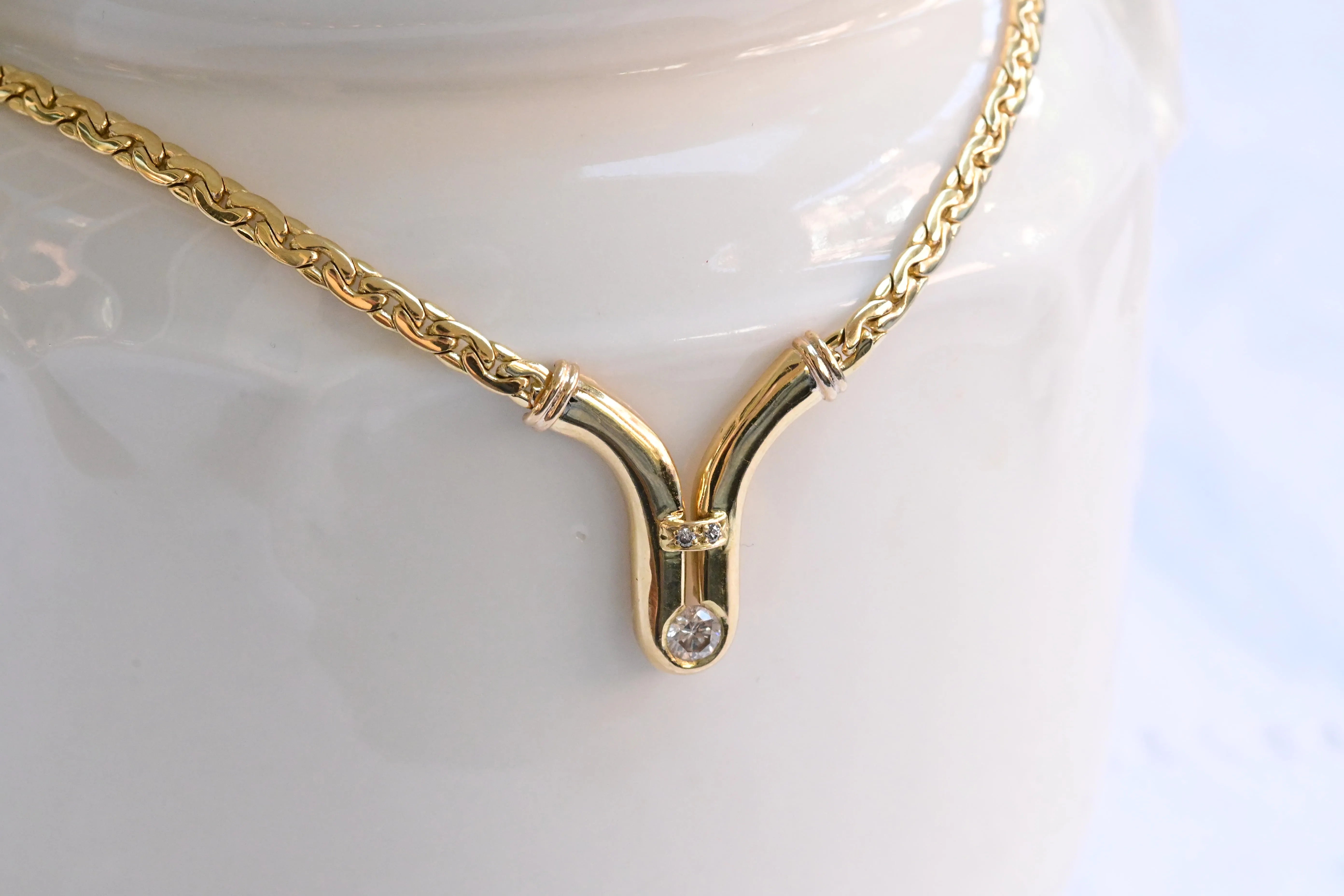 Vintage necklace crafted in 18 K yellow gold featuring a woven chain design with a centerpiece adorned with a central round brilliant cut diamond and other two smaller diamonds.
