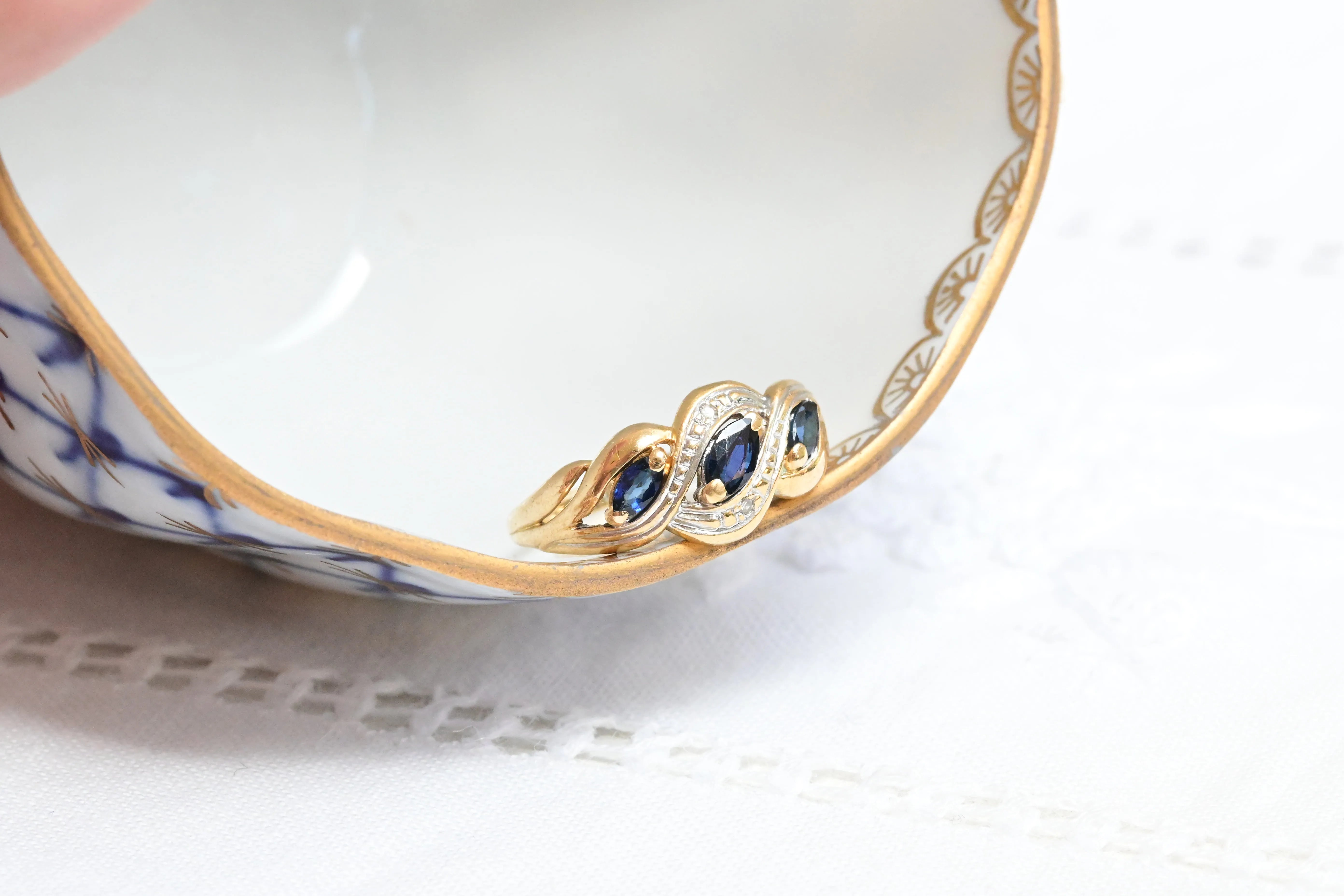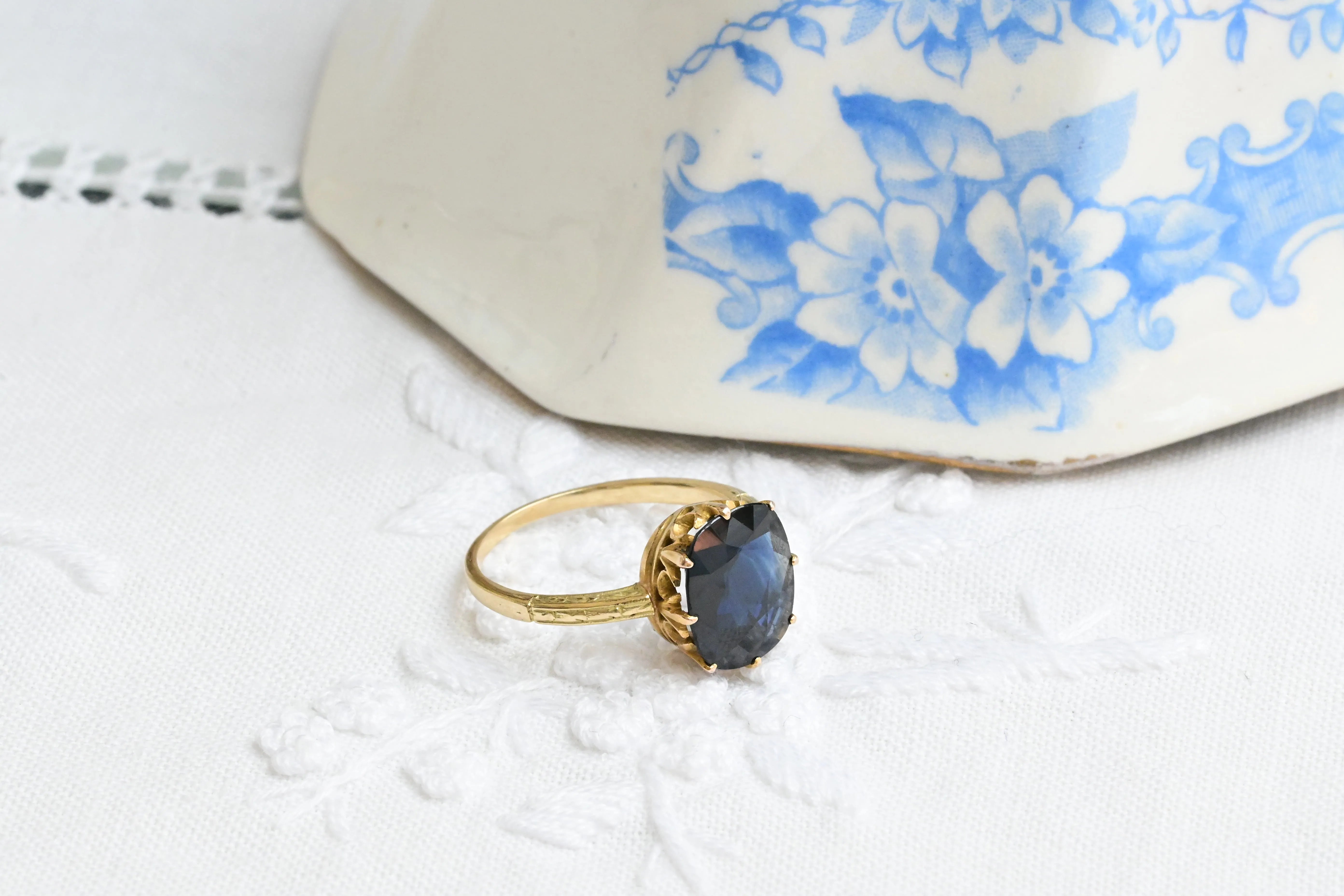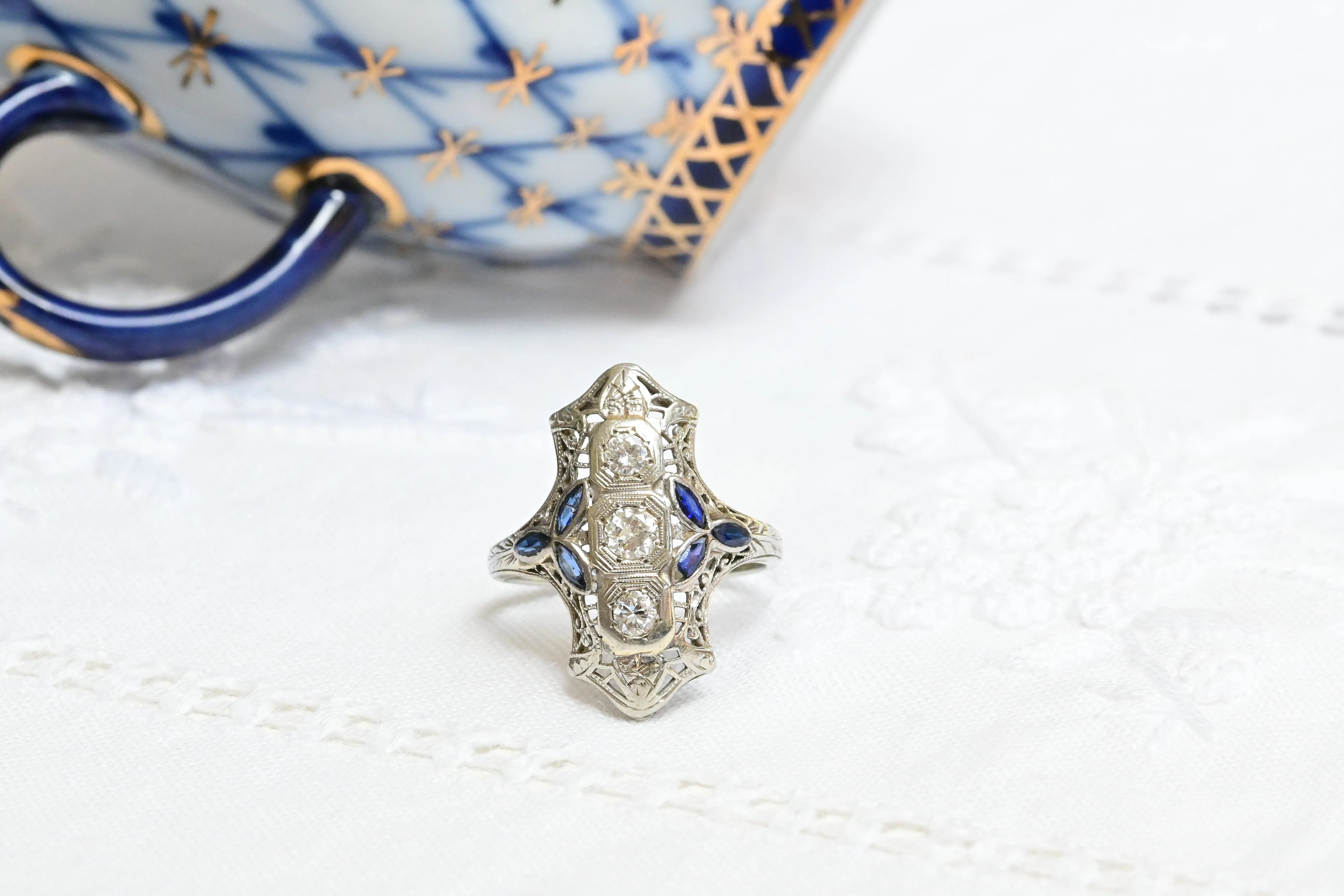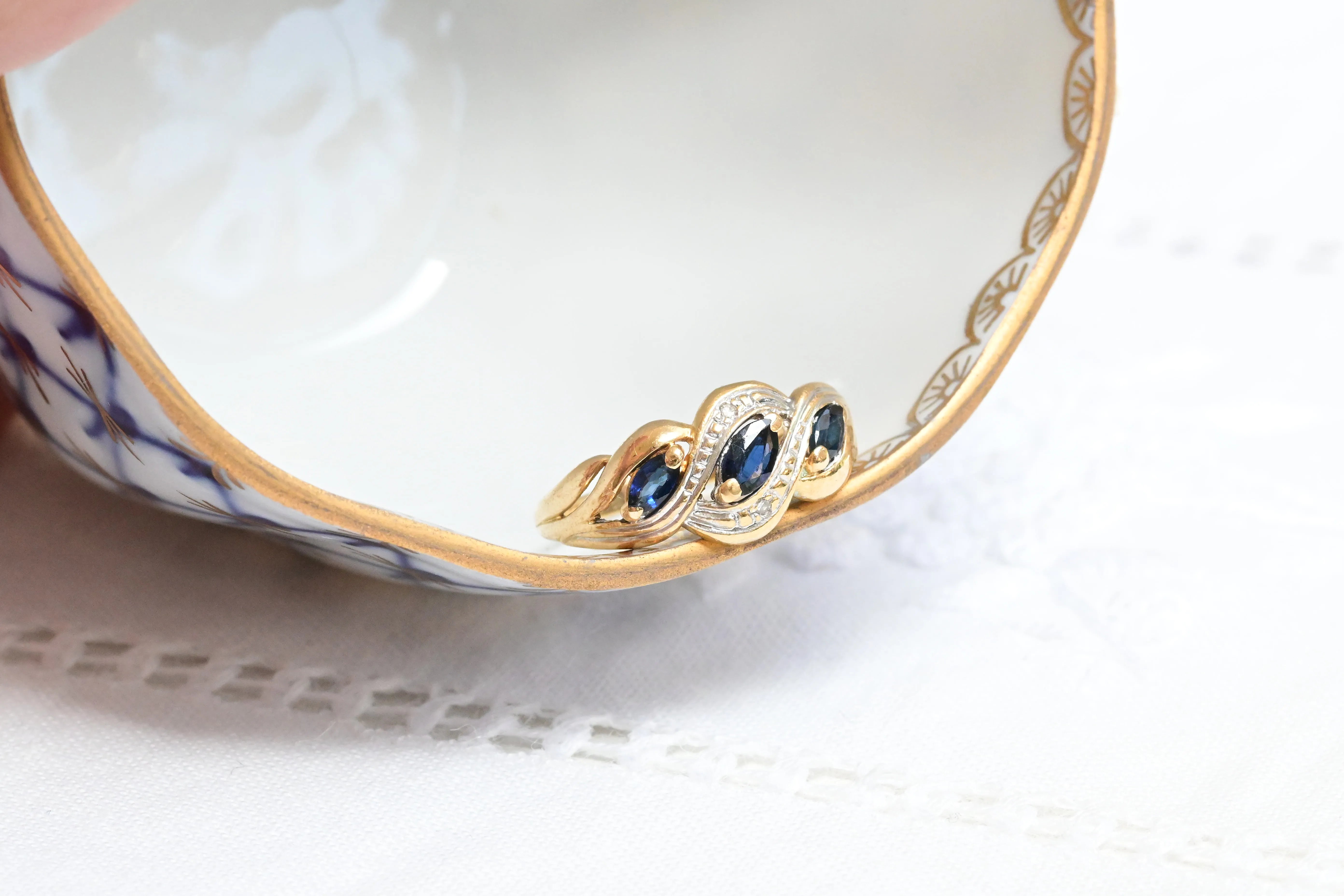 Art Deco Saphir- und Diamantring aus 9K Gold