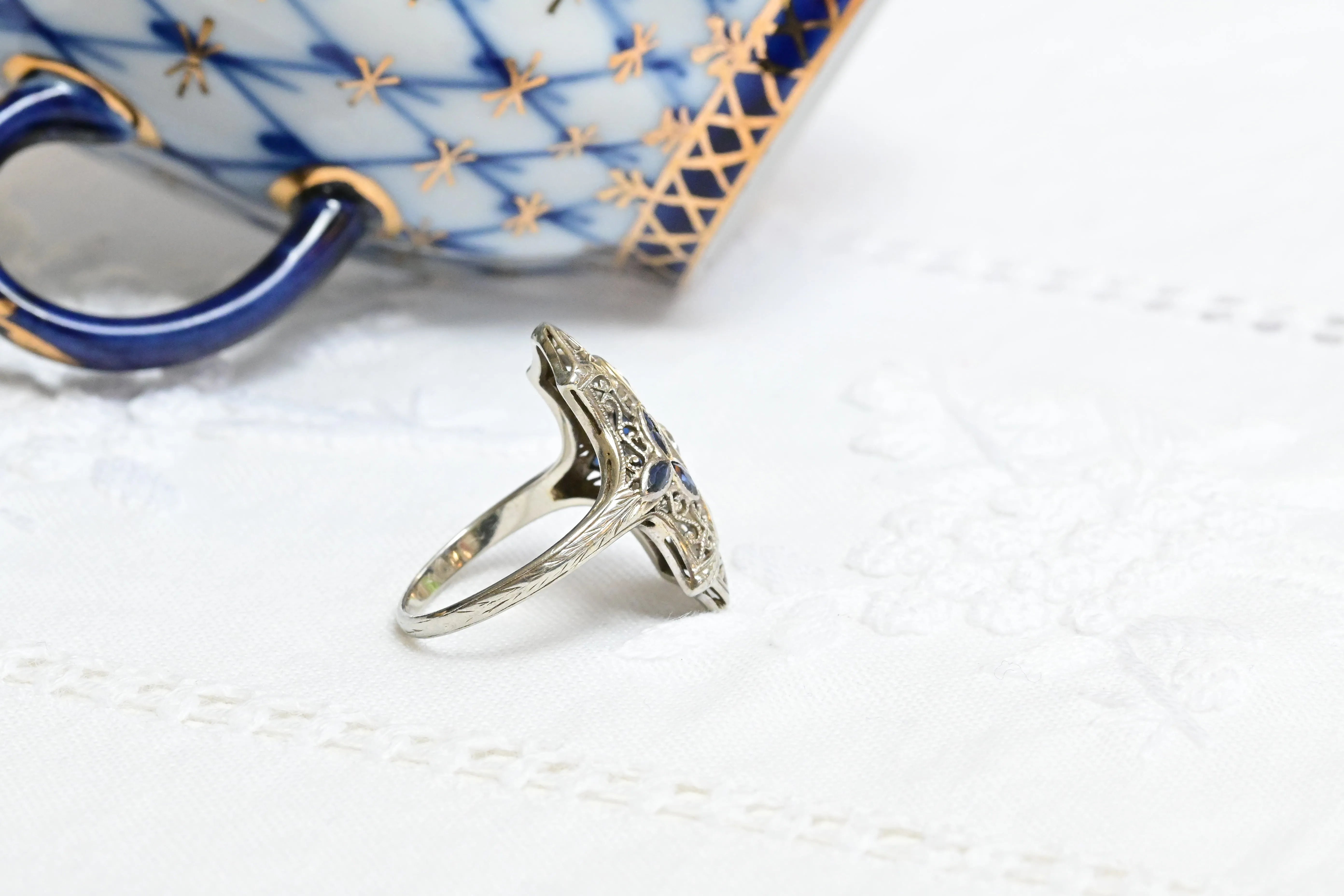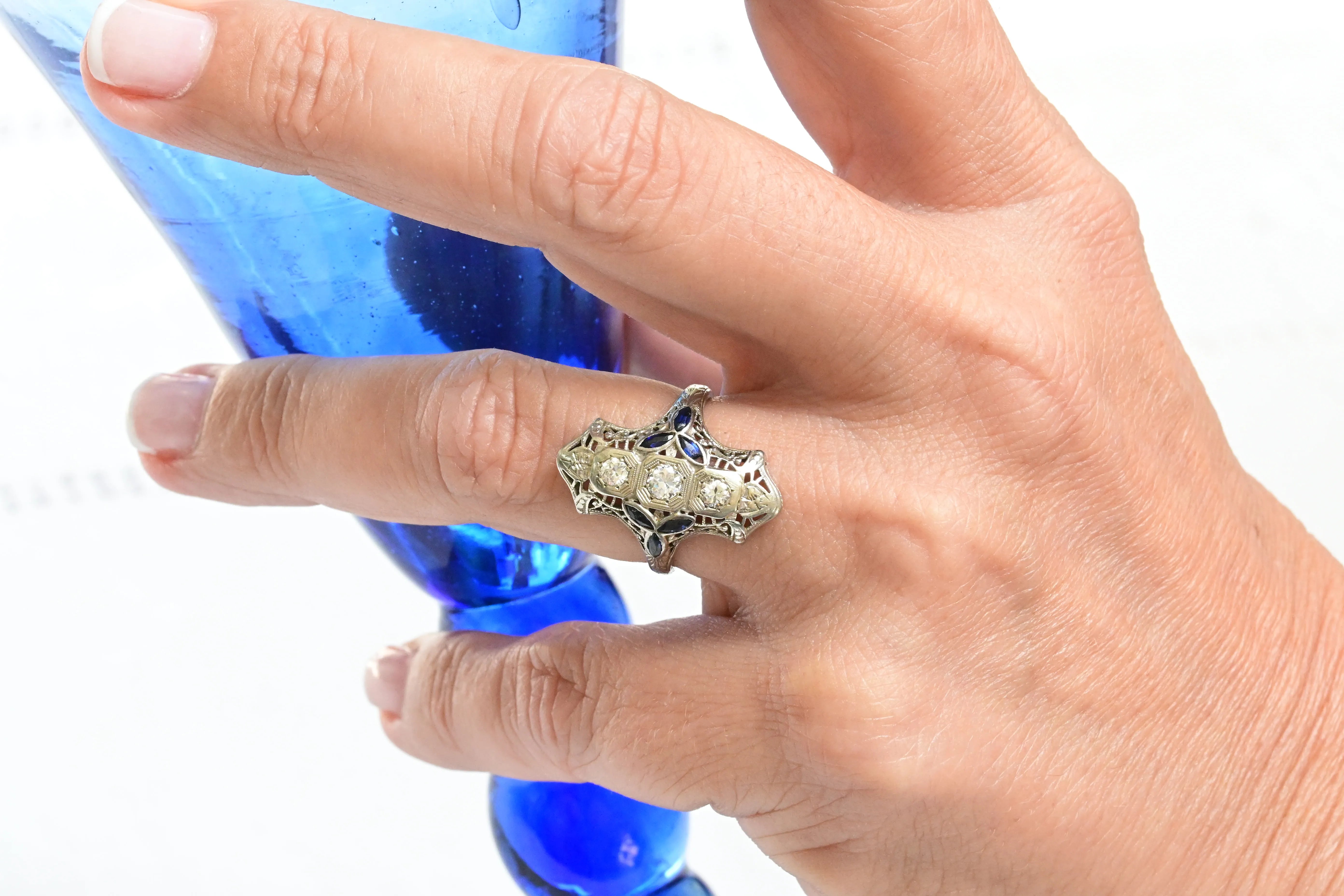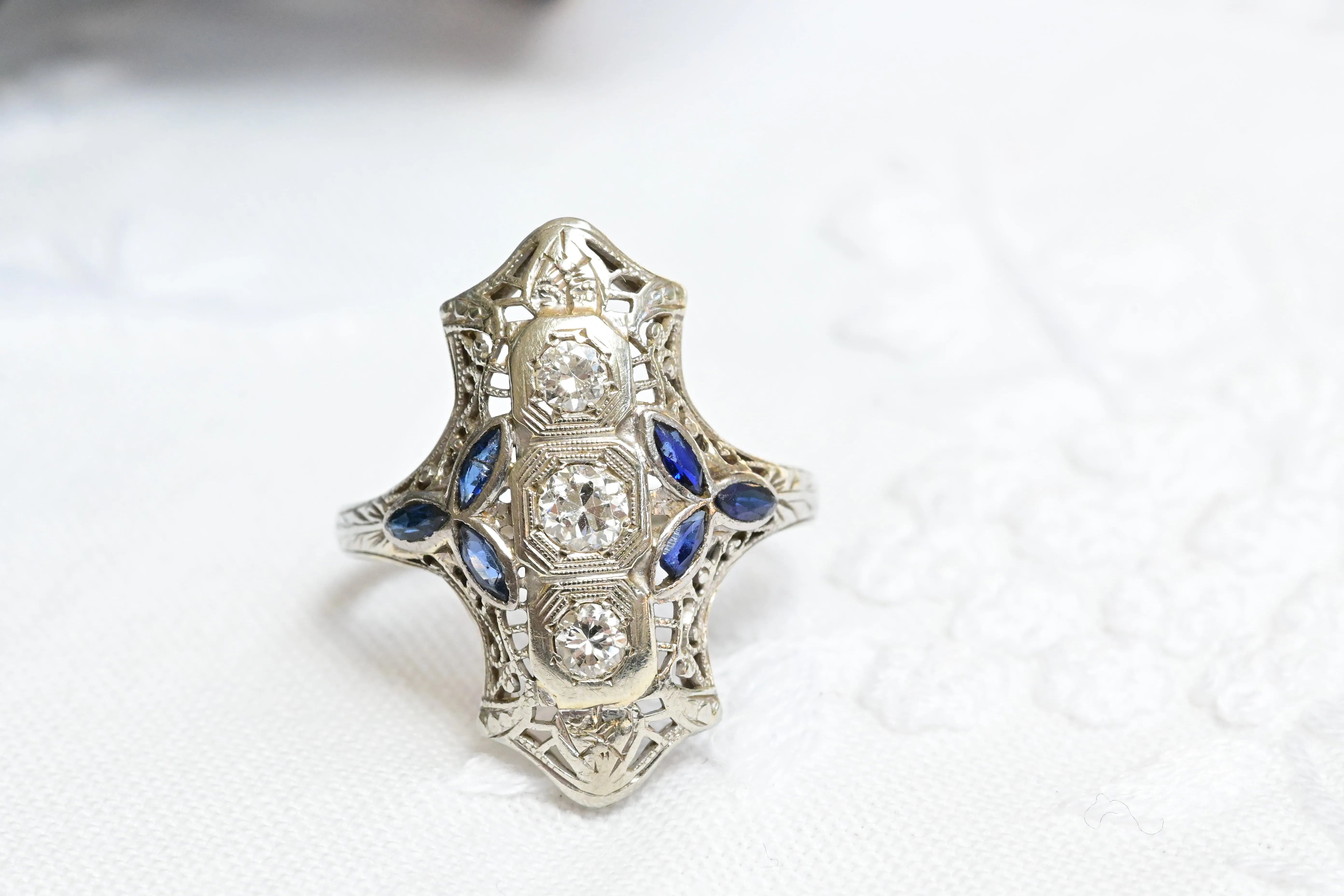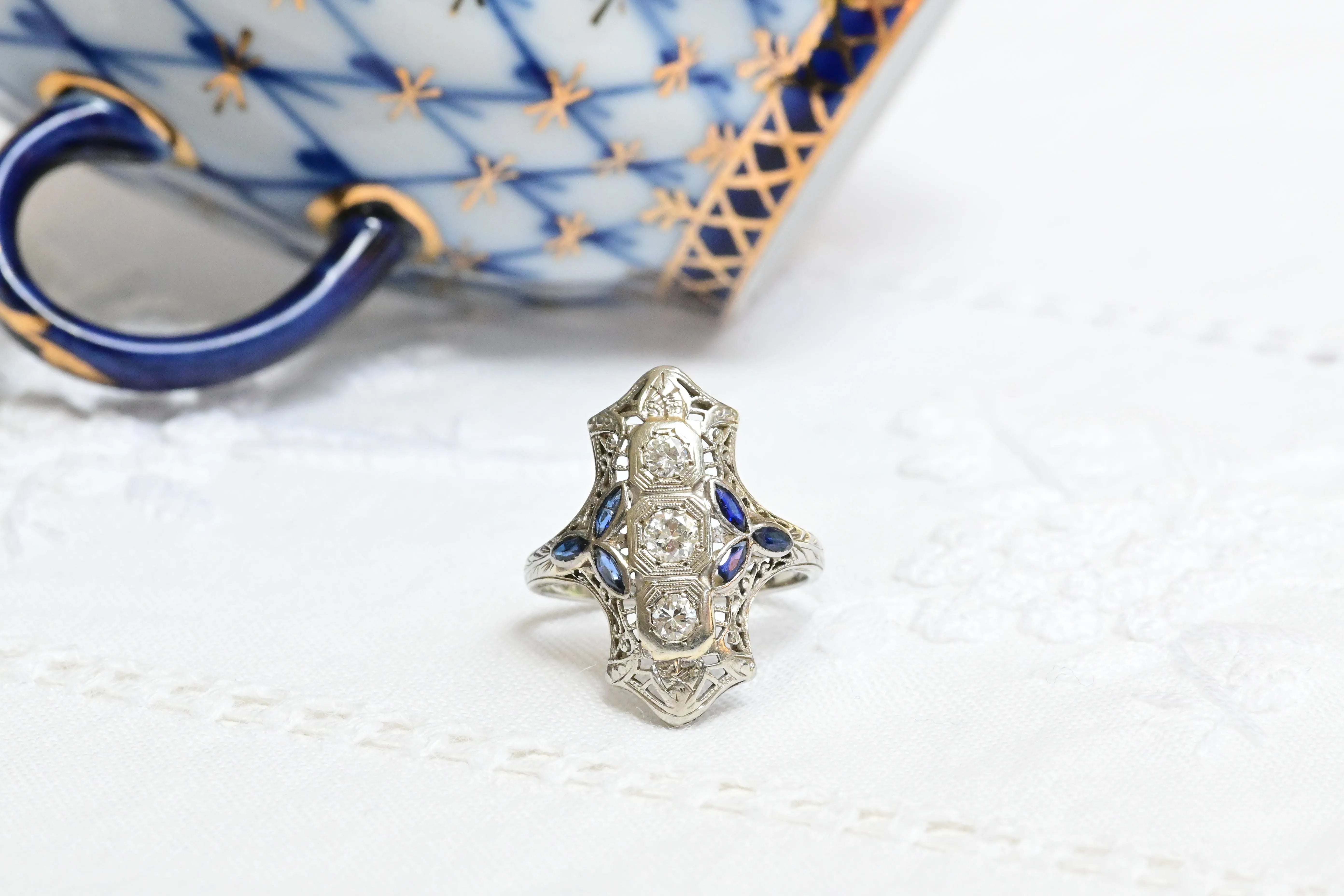 Art Deco prstan iz prve tretjine 20. stoletja, izdelan iz belega zlata 18 K, s tremi briljantno brušenimi diamanti okrogle oblike, nameščenimi navpično, obdanimi z dovršenim filigranskim dizajnom in modrimi safirji markiznega brusa.