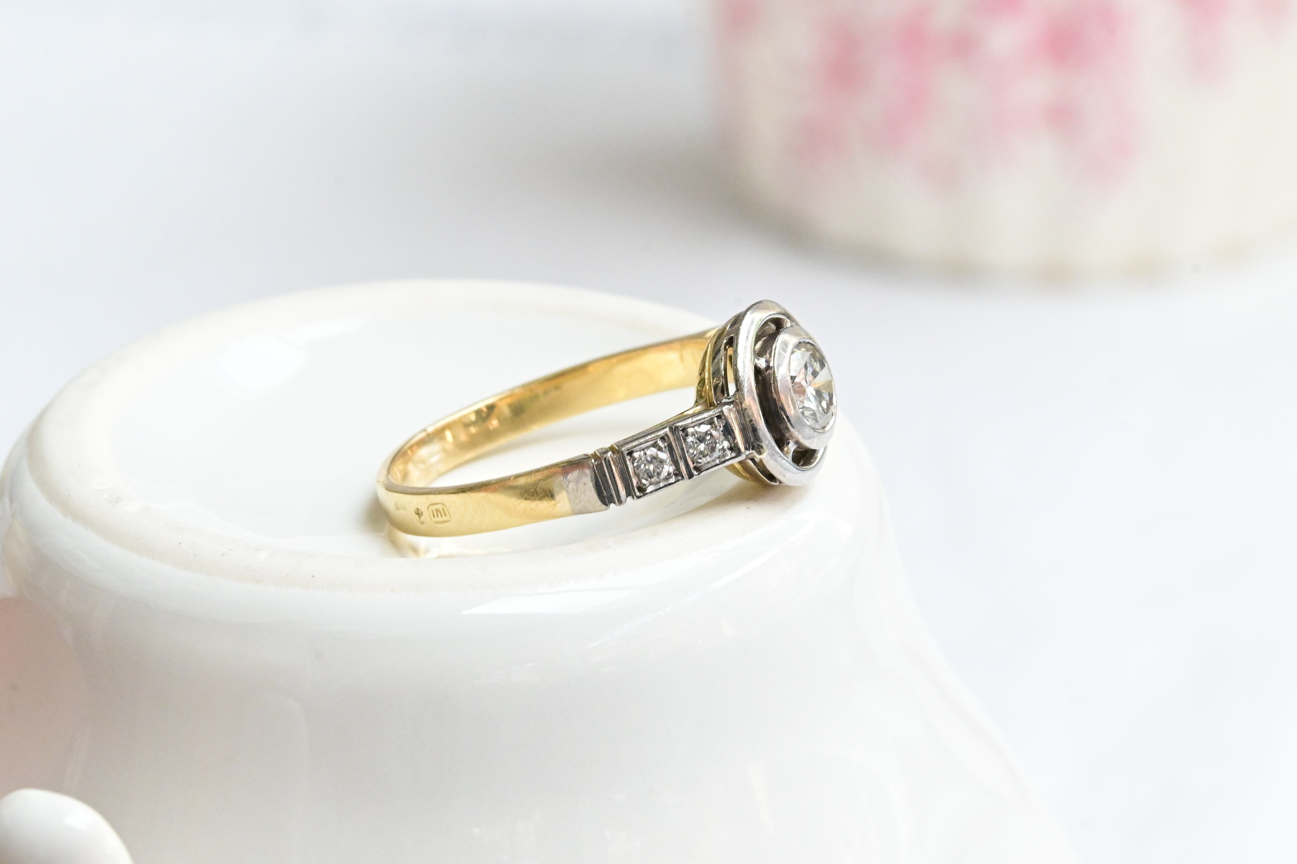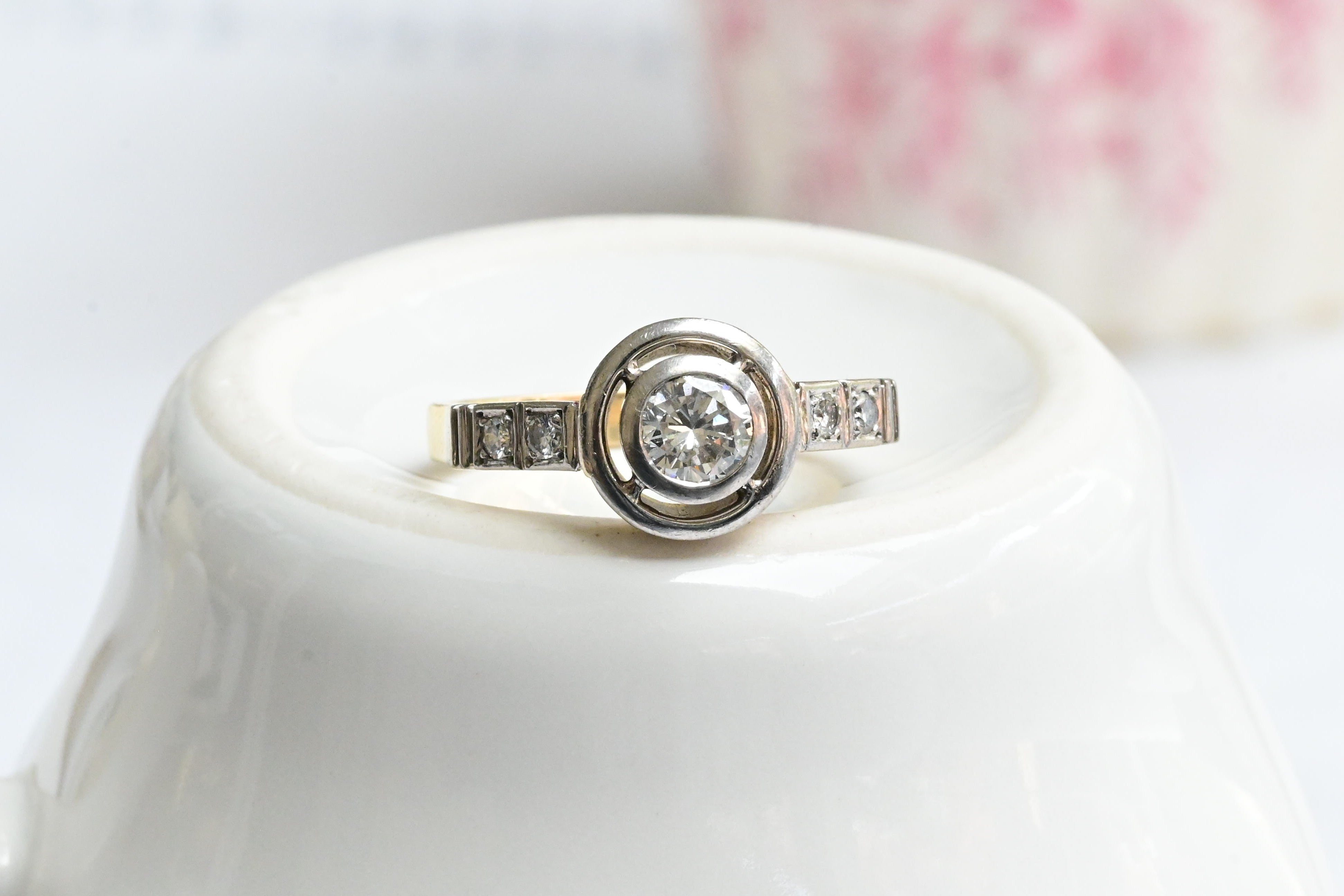 Art deco ring crafted in 18 K bicolor gold with a central round brilliant cut diamonds and decorated with other four round brilliant cut diamonds in the arms of the ring.