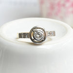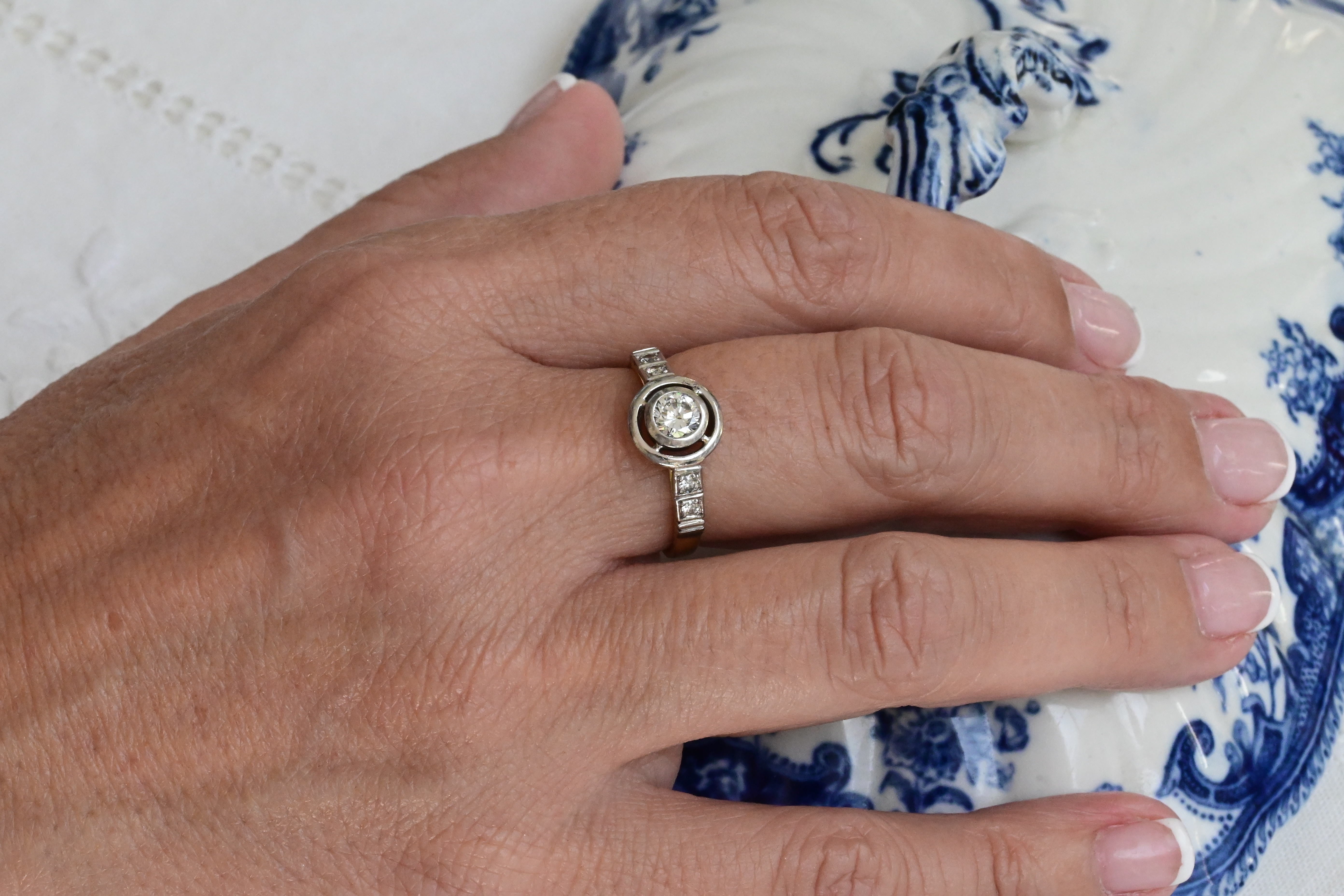 Il mio ragazzo mi ha sorpreso e mi ha chiesto di sposarlo con l'anello Art Deco più bello di Moira Antique Jewellery. Dovevamo cambiarne le dimensioni, ma lo abbiamo fatto presso una gioielleria nelle vicinanze, anche se ci è stato offerto di farlo lì. Non potrei amare di più questo anello anche se ci provassi!