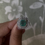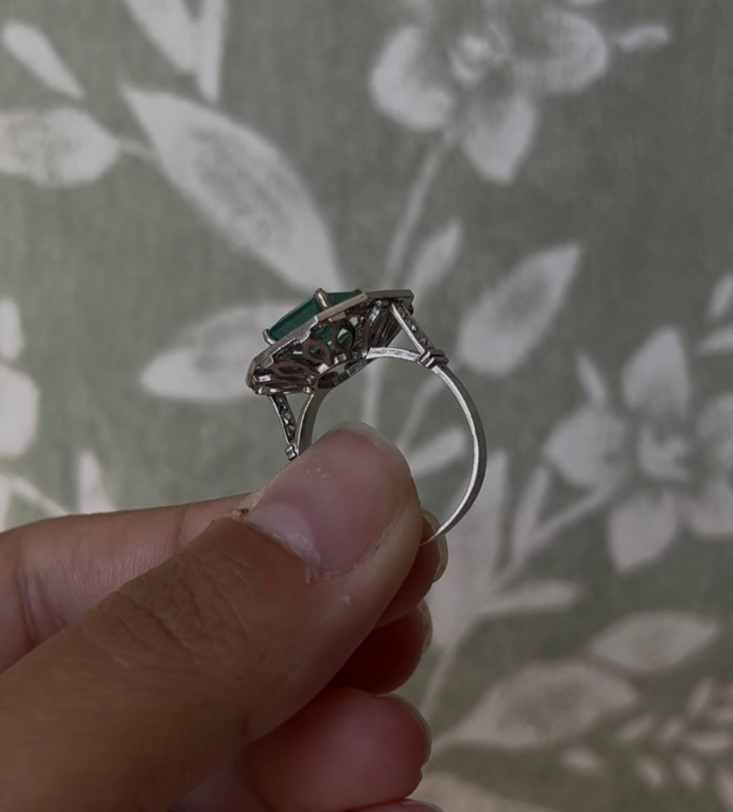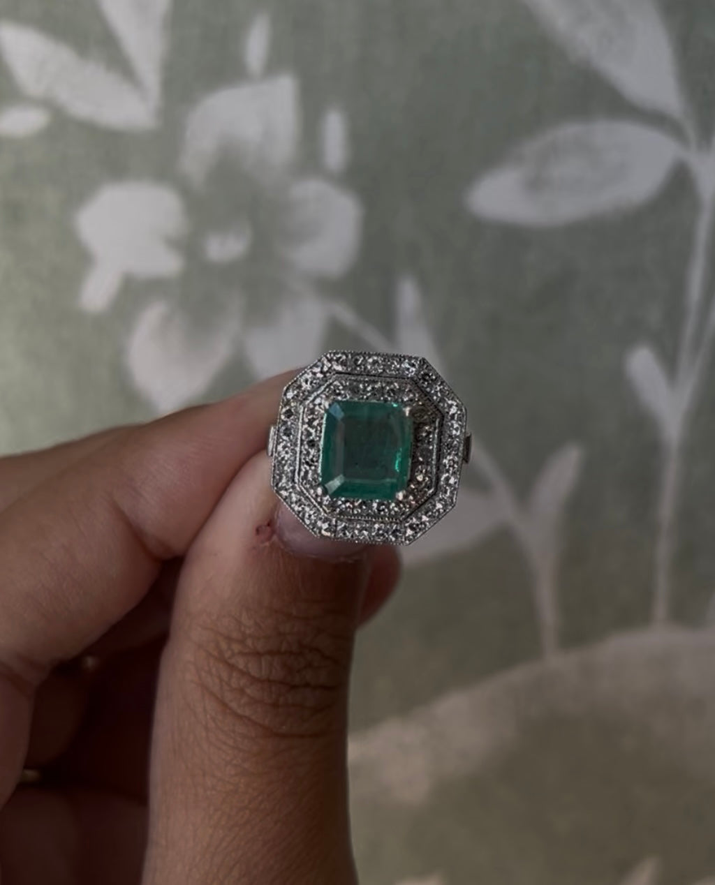 Vintage ring crafted in 18 K white gold with a central emerald cut emerald and surrounded by 56 round brilliant cut diamonds.