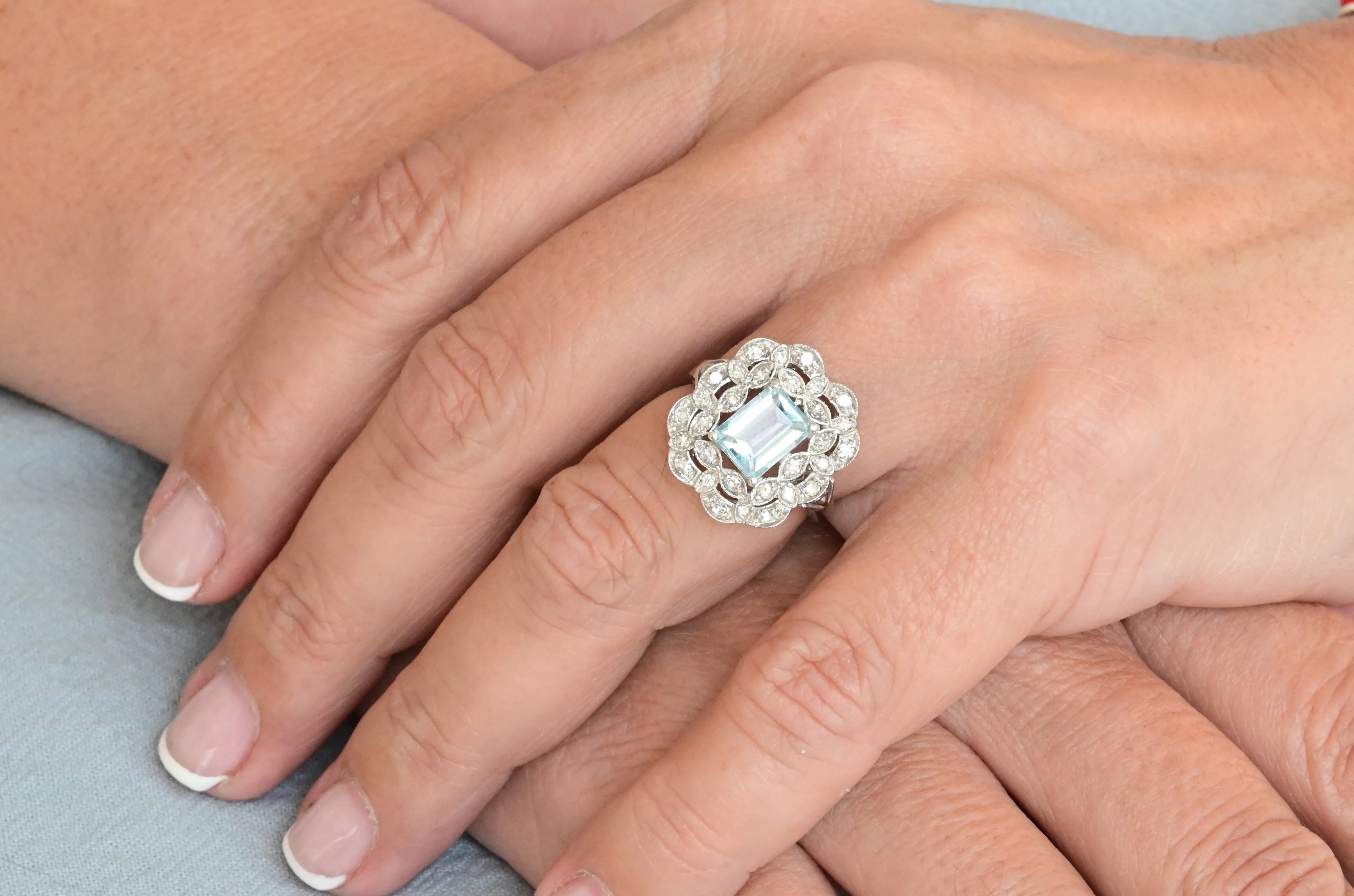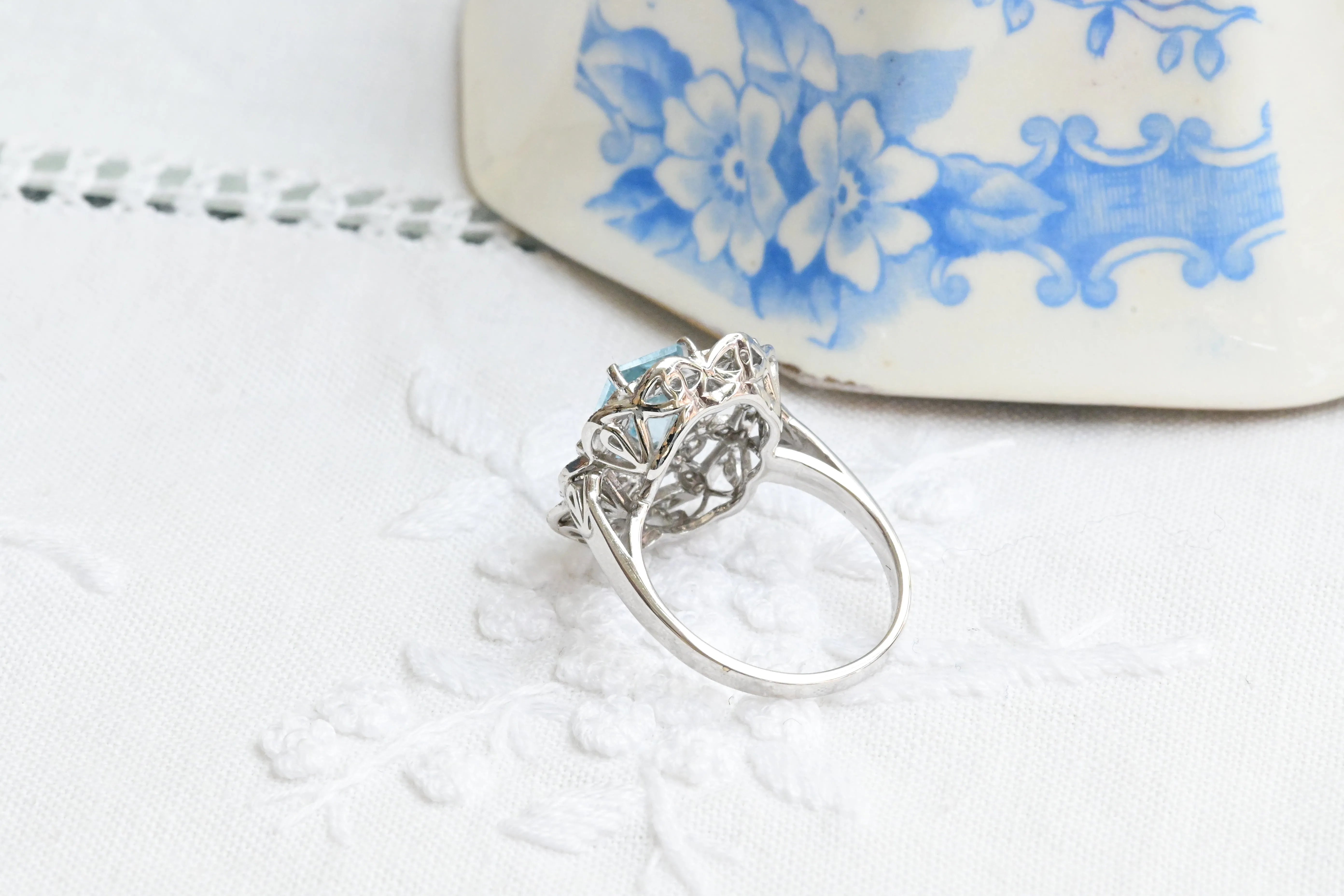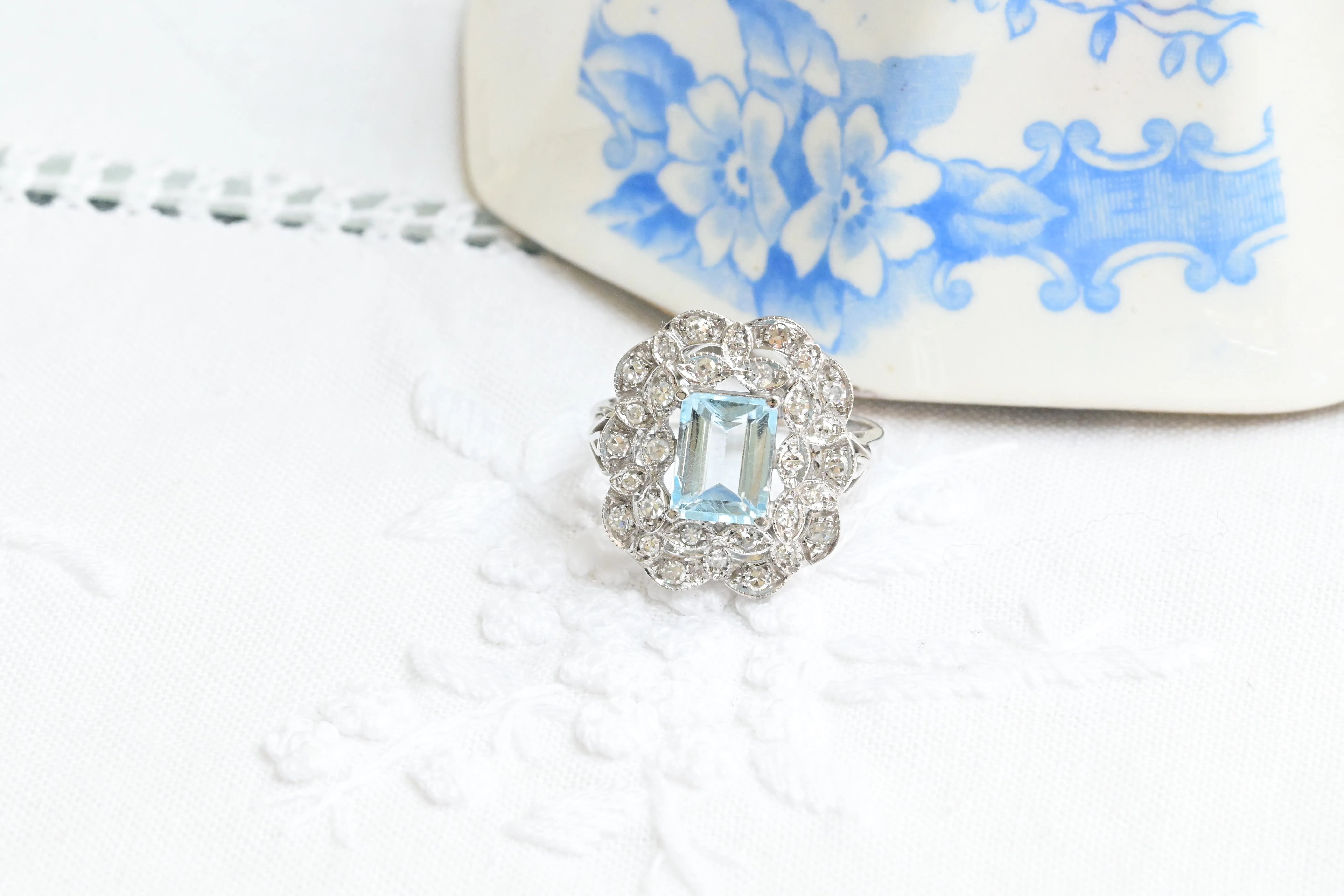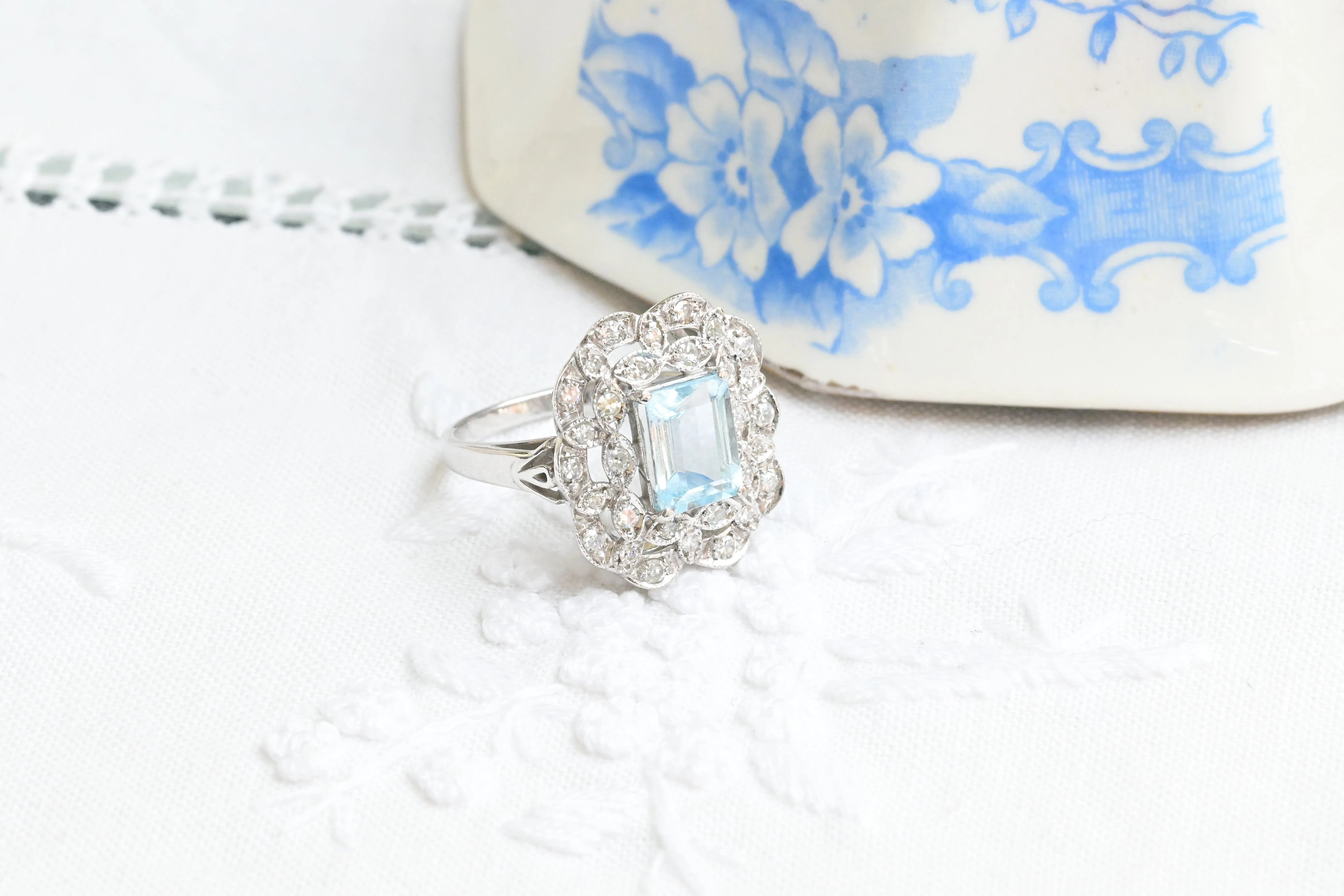 Vintage prstan iz belega zlata 18 K, z osrednjo akvamarino smaragdnega reza, obdano z okrašenim halojem geometrijskih motivov, posutih z diamanti, ki ustvarjajo eleganten in brezčasen dizajn.